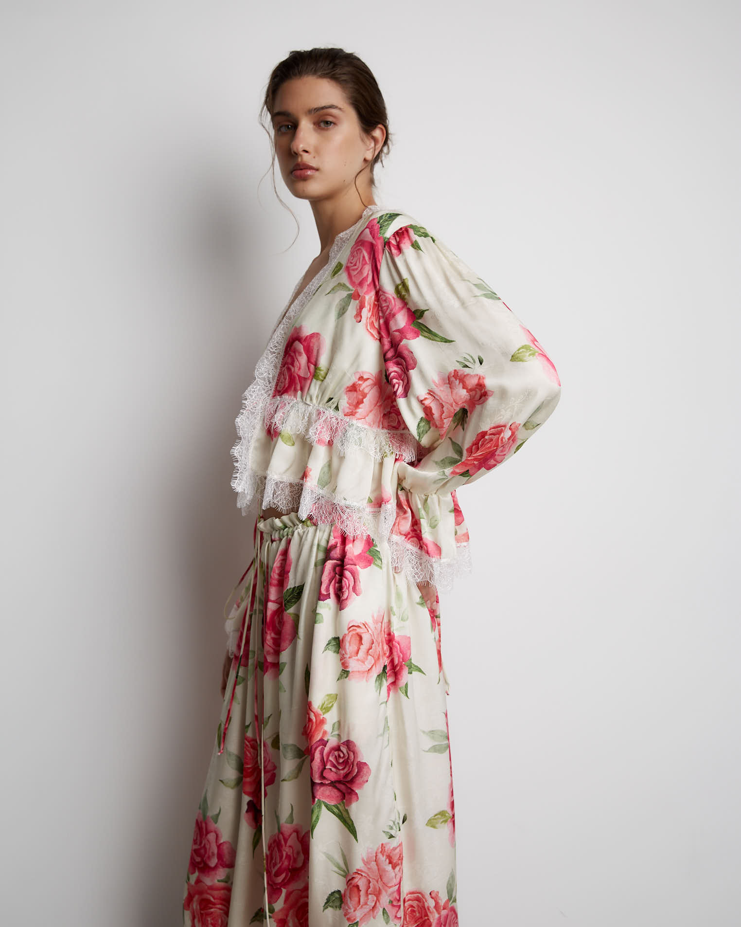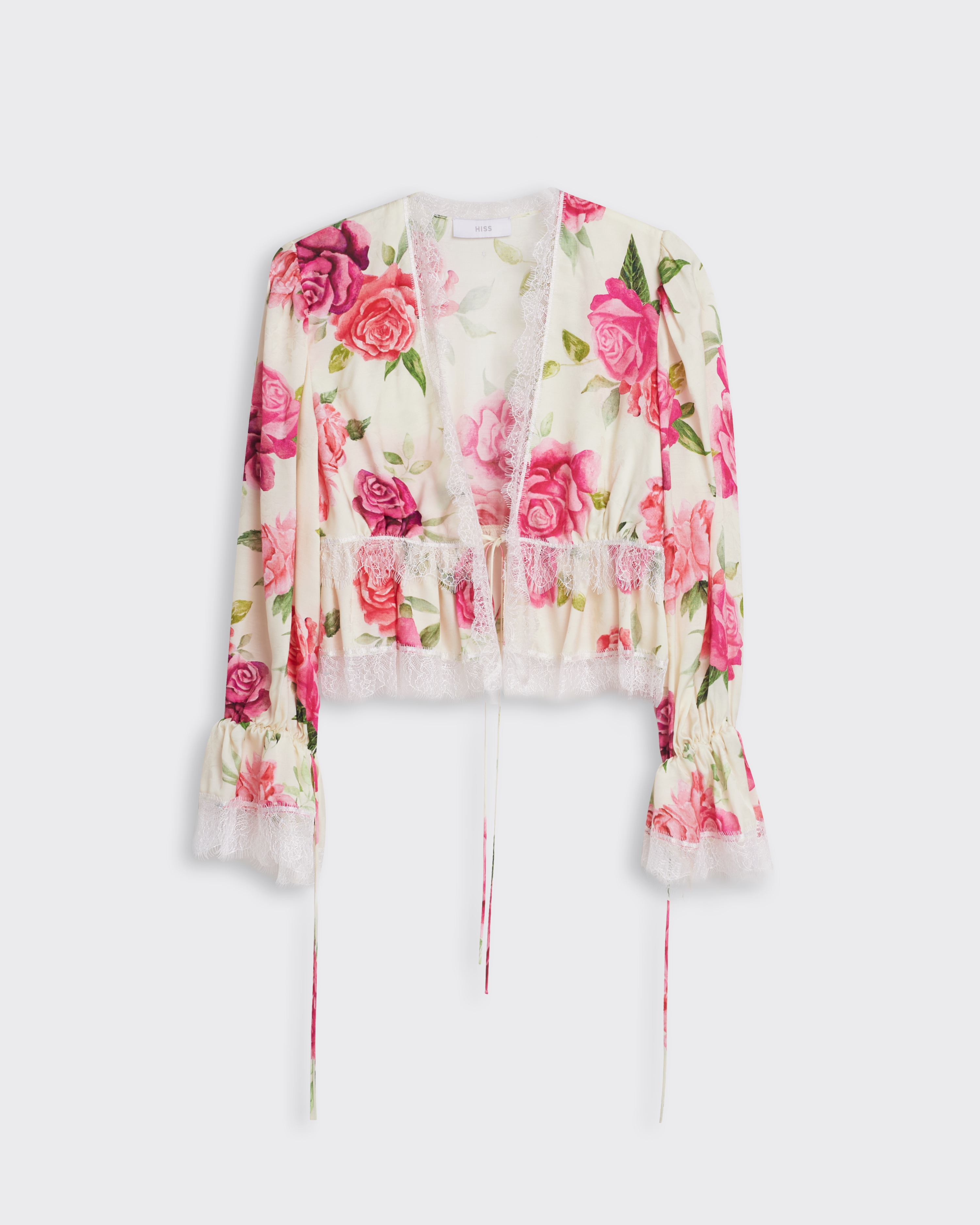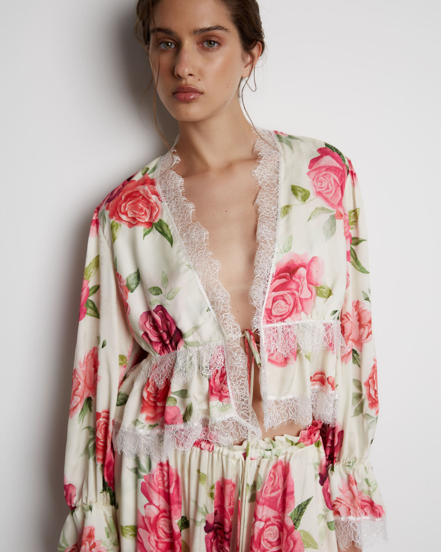 Укороченная блуза прилегающего силуэта, который заканчивается на линии груди. Кокетка со сборкой, что придает блузе еще больше шарма. Шов соединения лифа и кокетки закрыт кружевной лентой, которой также обработаны низ рукавов и горловина, верхняя часть рукава на сборке. Застежкой служит узкая завязка, с помощью тонких шнуров, расположенных на рукавах и под грудью, можно видоизменять изделие, к примеру, завязывая в бант или оставляя распущенными.