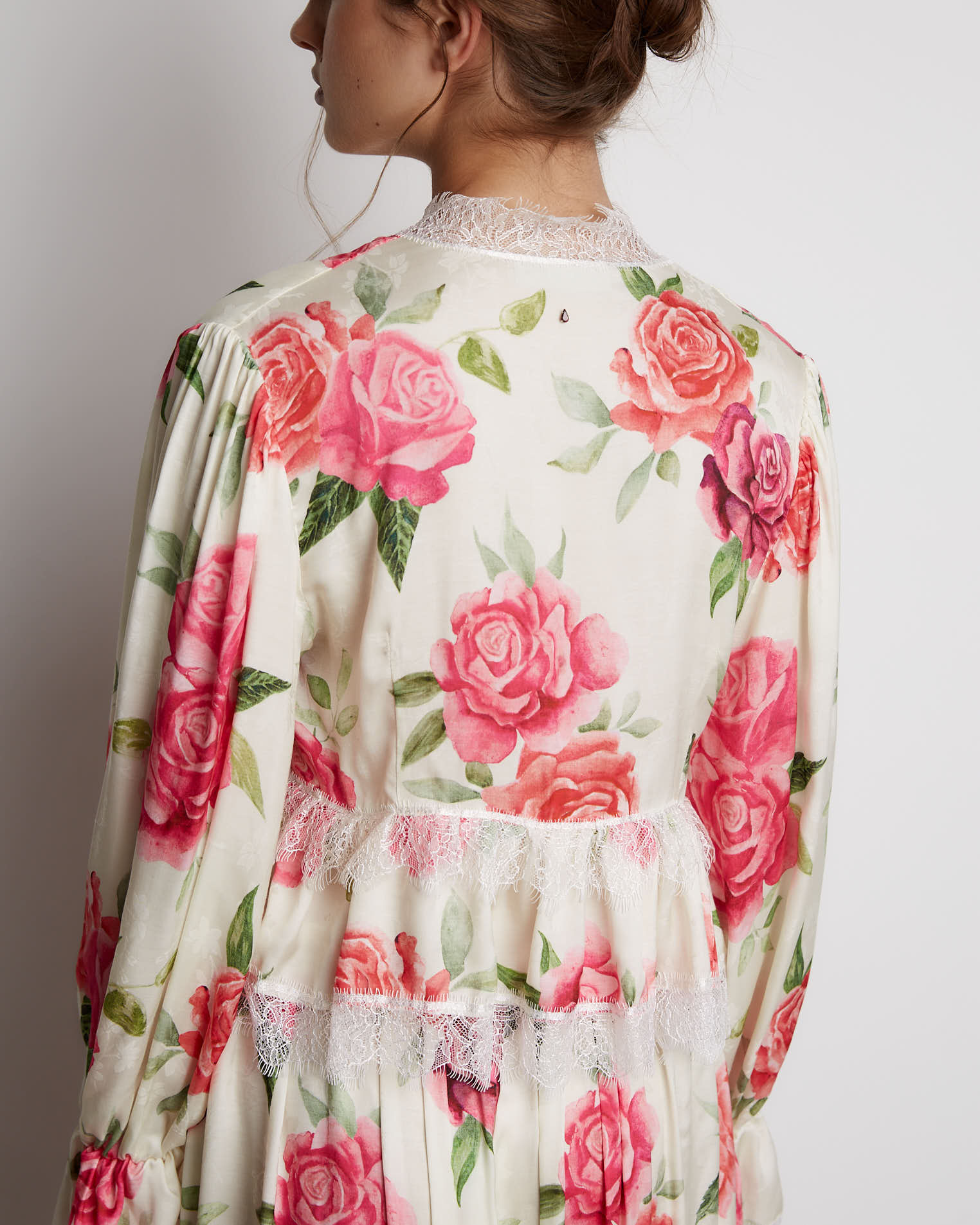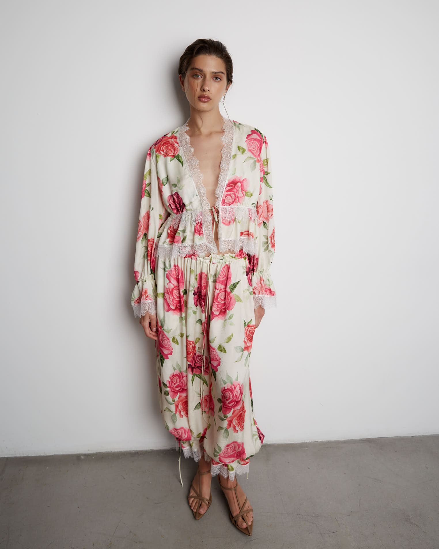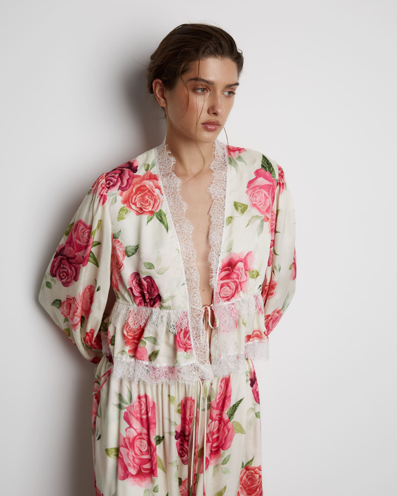 Укороченная блуза прилегающего силуэта, который заканчивается на линии груди. Кокетка со сборкой, что придает блузе еще больше шарма. Шов соединения лифа и кокетки закрыт кружевной лентой, которой также обработаны низ рукавов и горловина, верхняя часть рукава на сборке. Застежкой служит узкая завязка, с помощью тонких шнуров, расположенных на рукавах и под грудью, можно видоизменять изделие, к примеру, завязывая в бант или оставляя распущенными.