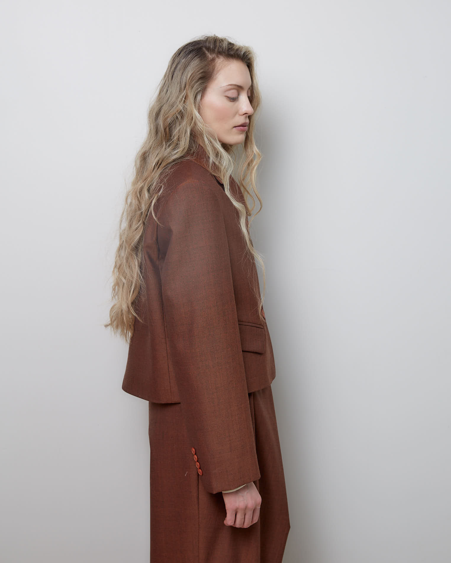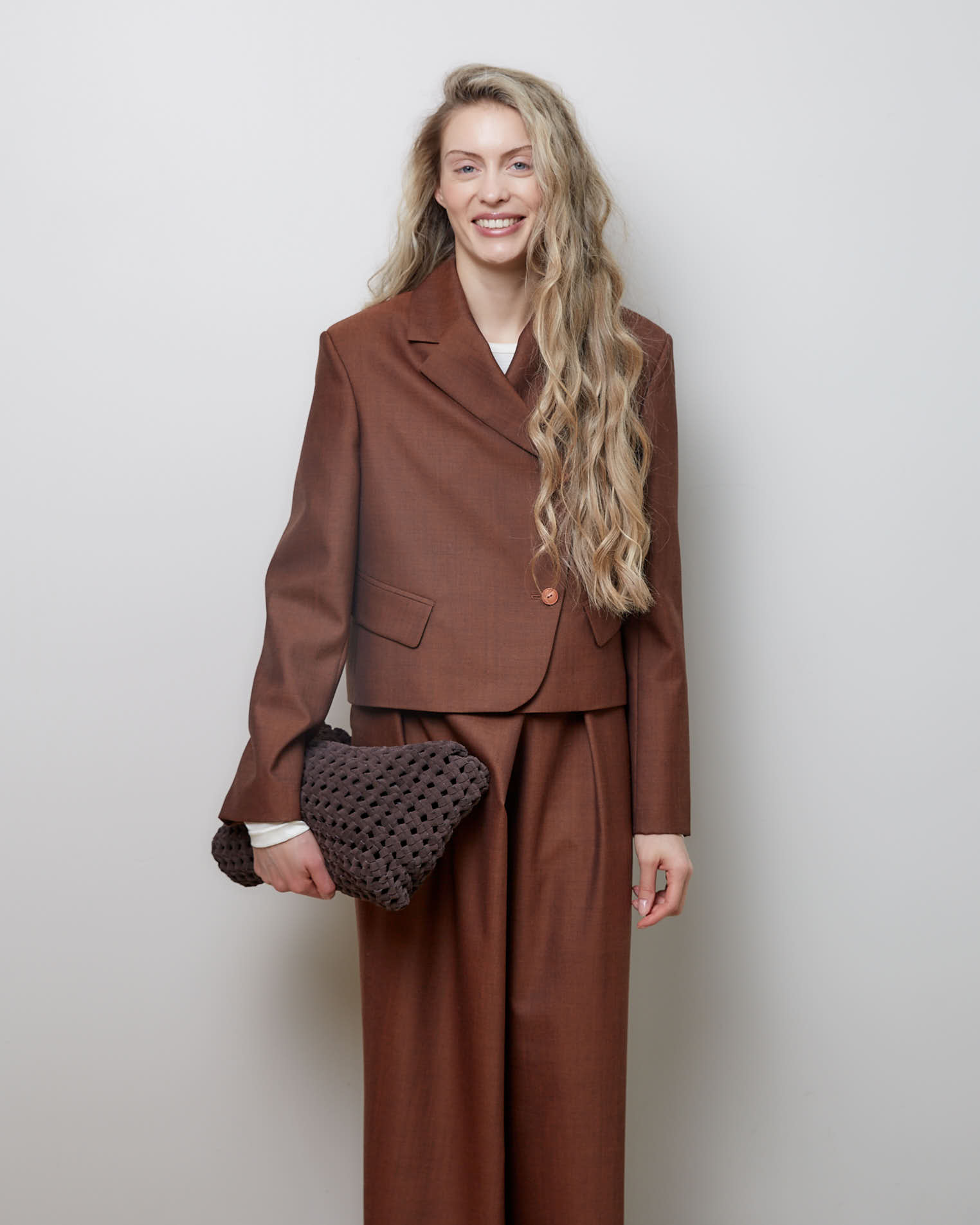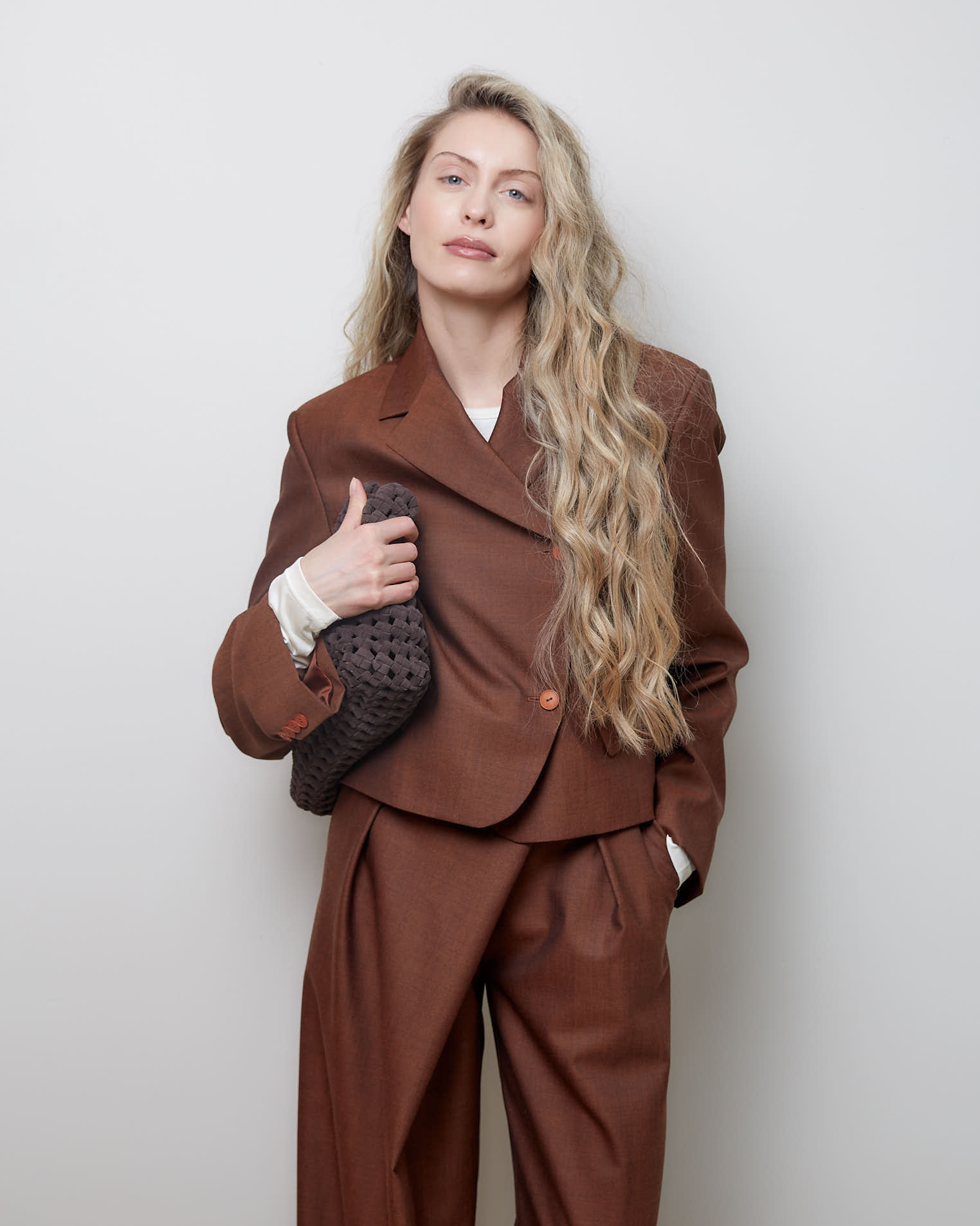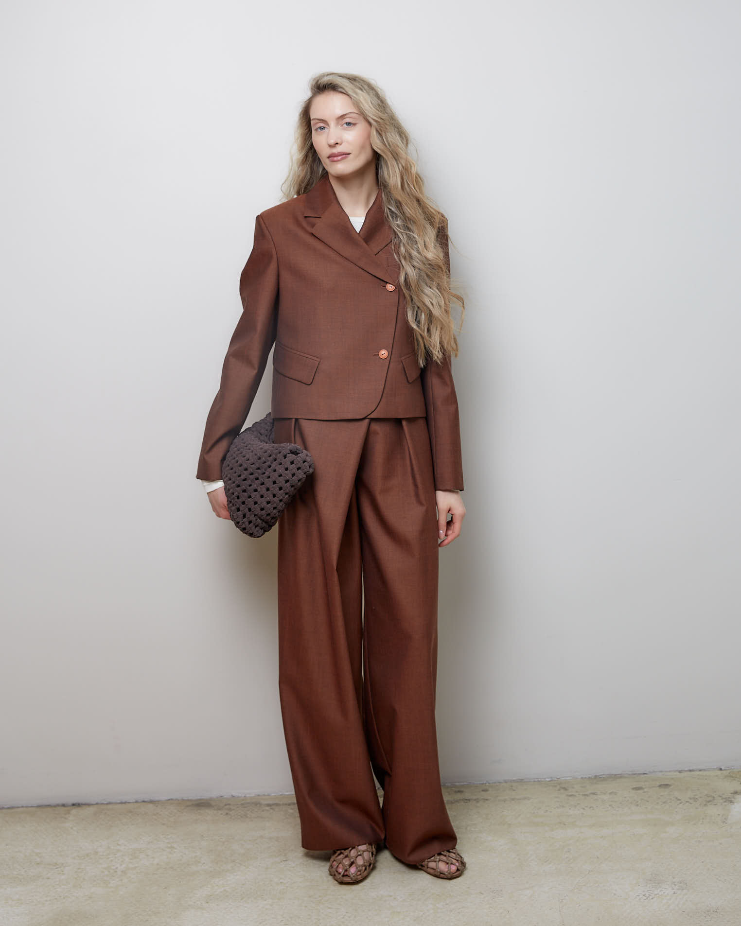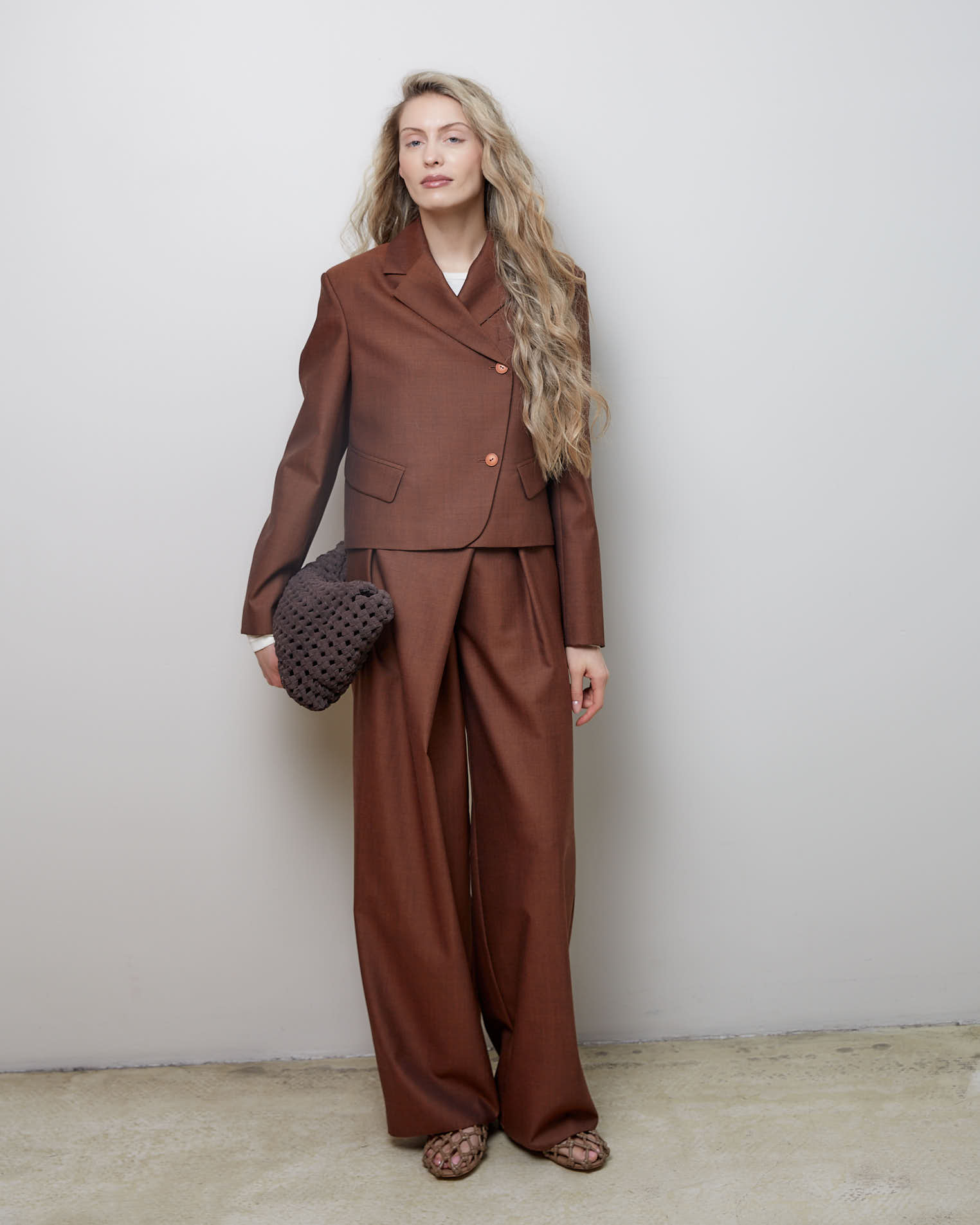 Завершите образ с помощью двубортного жакета в цвете корица. Столь элегантный комплект подойдет для любого случая.