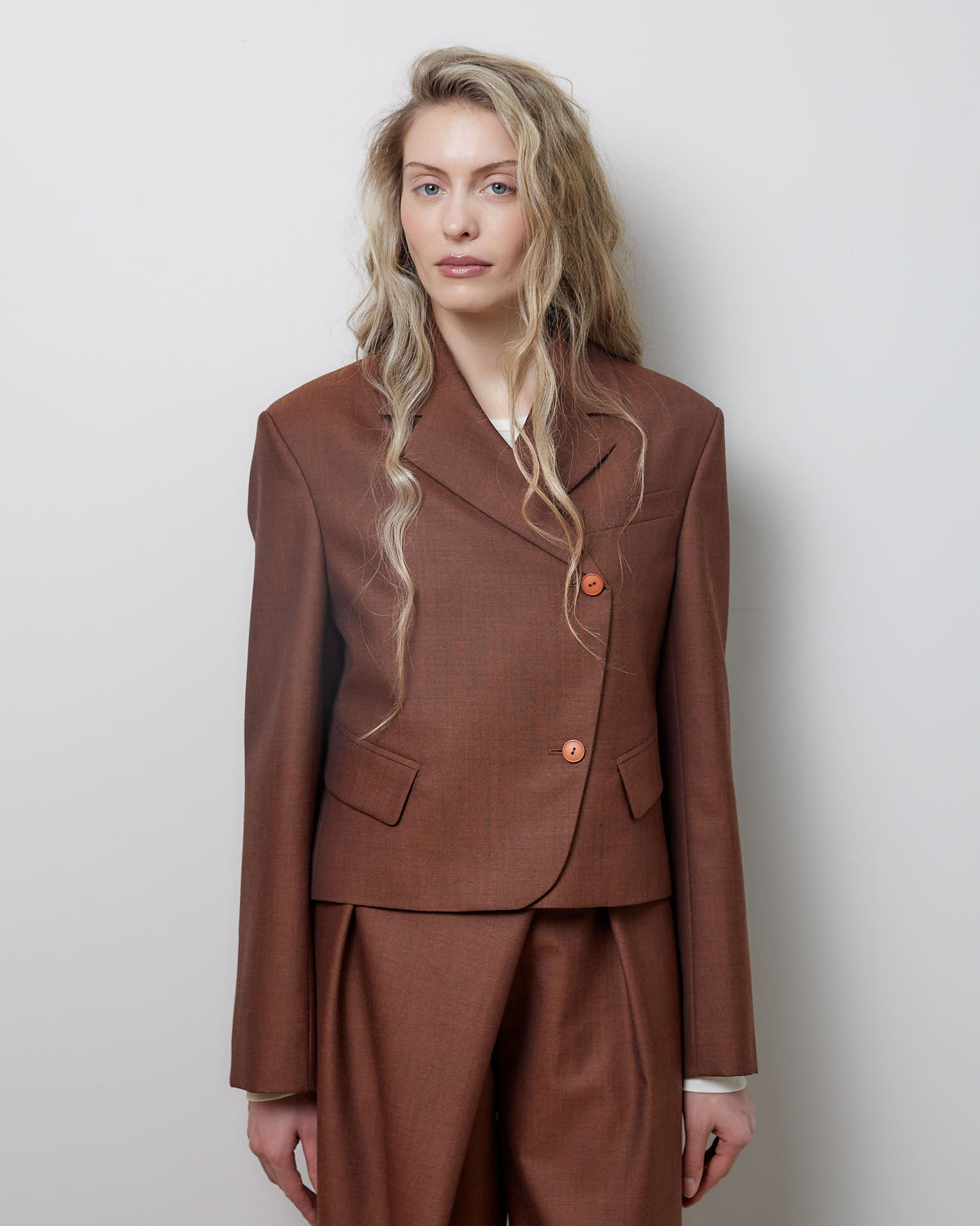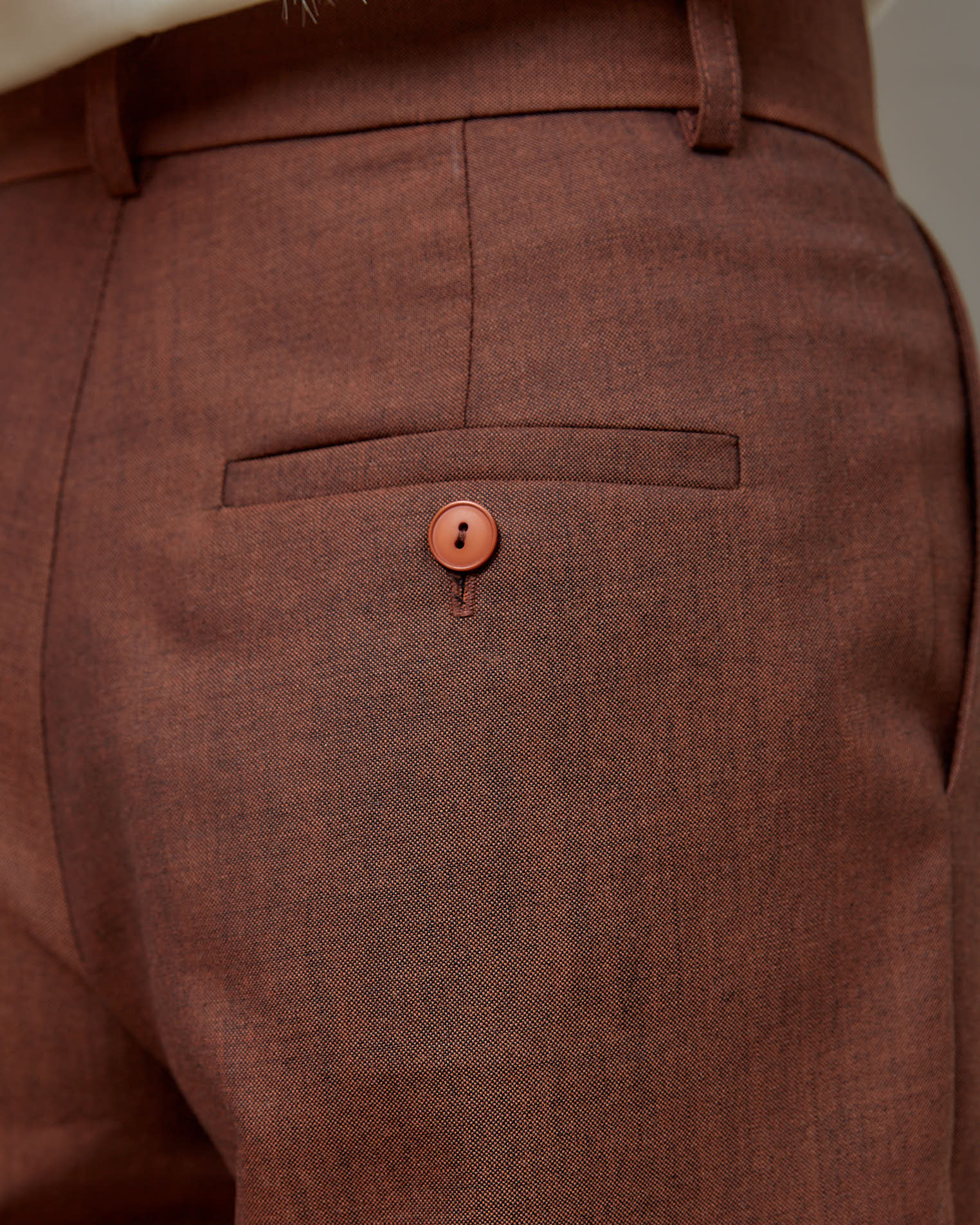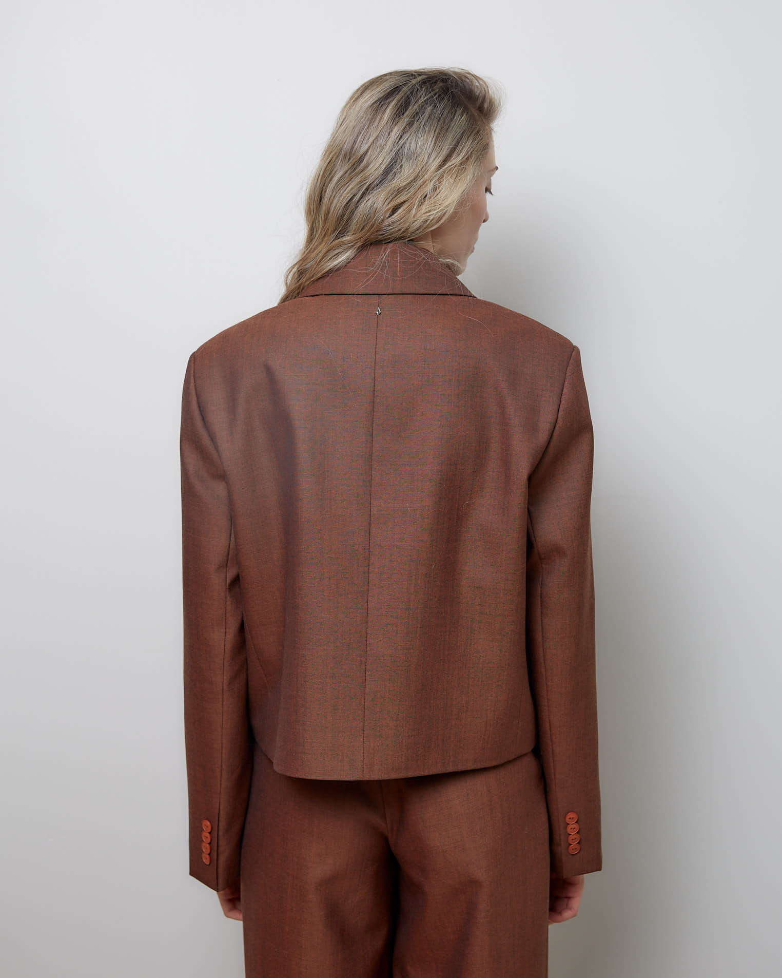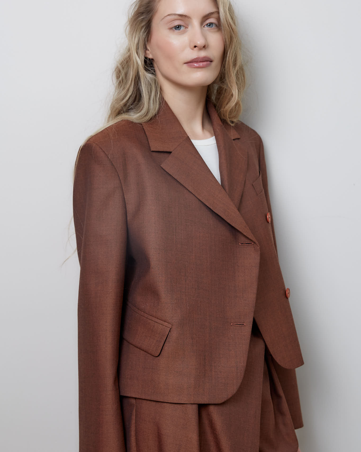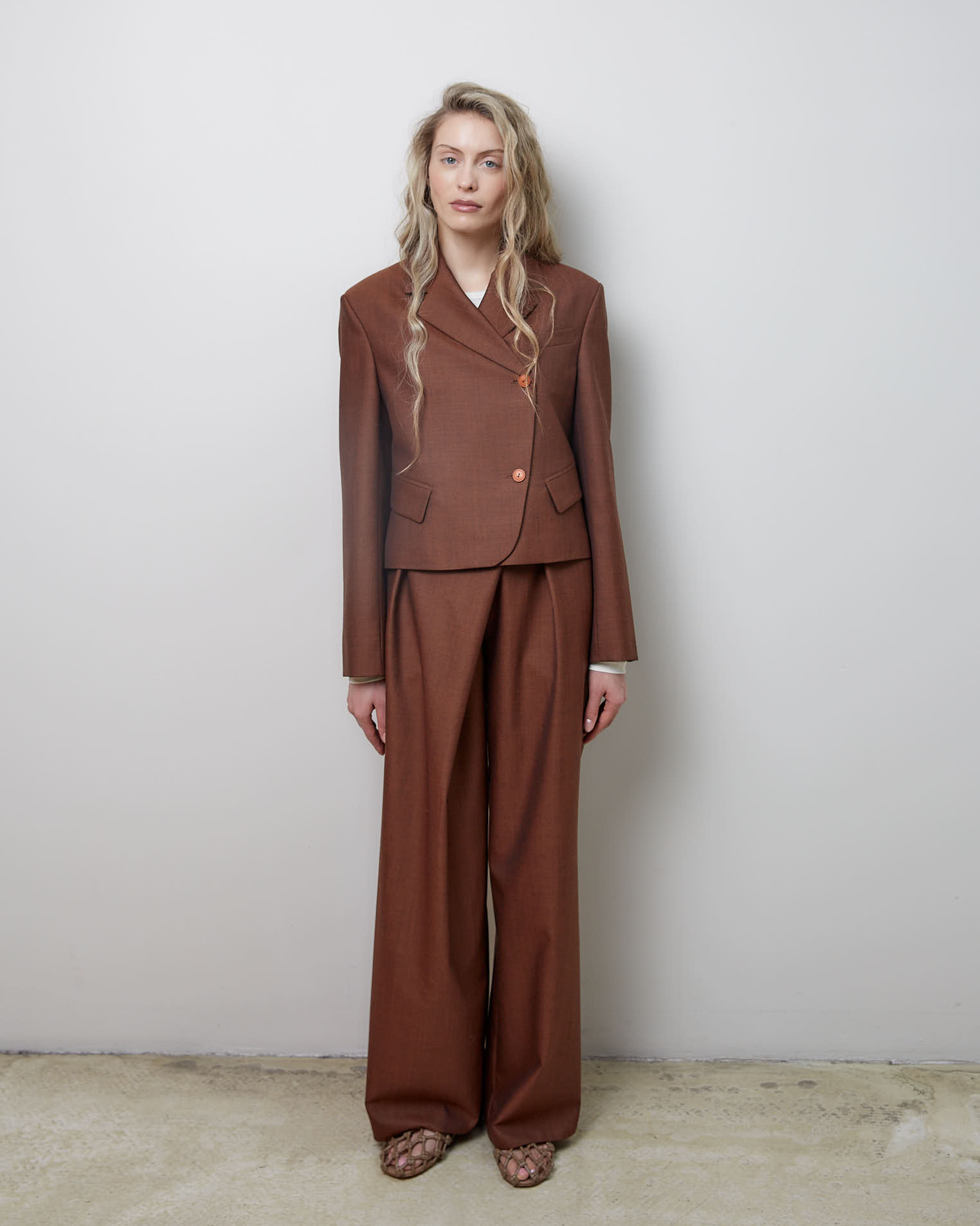 Завершите образ с помощью двубортного жакета в цвете корица. Столь элегантный комплект подойдет для любого случая.