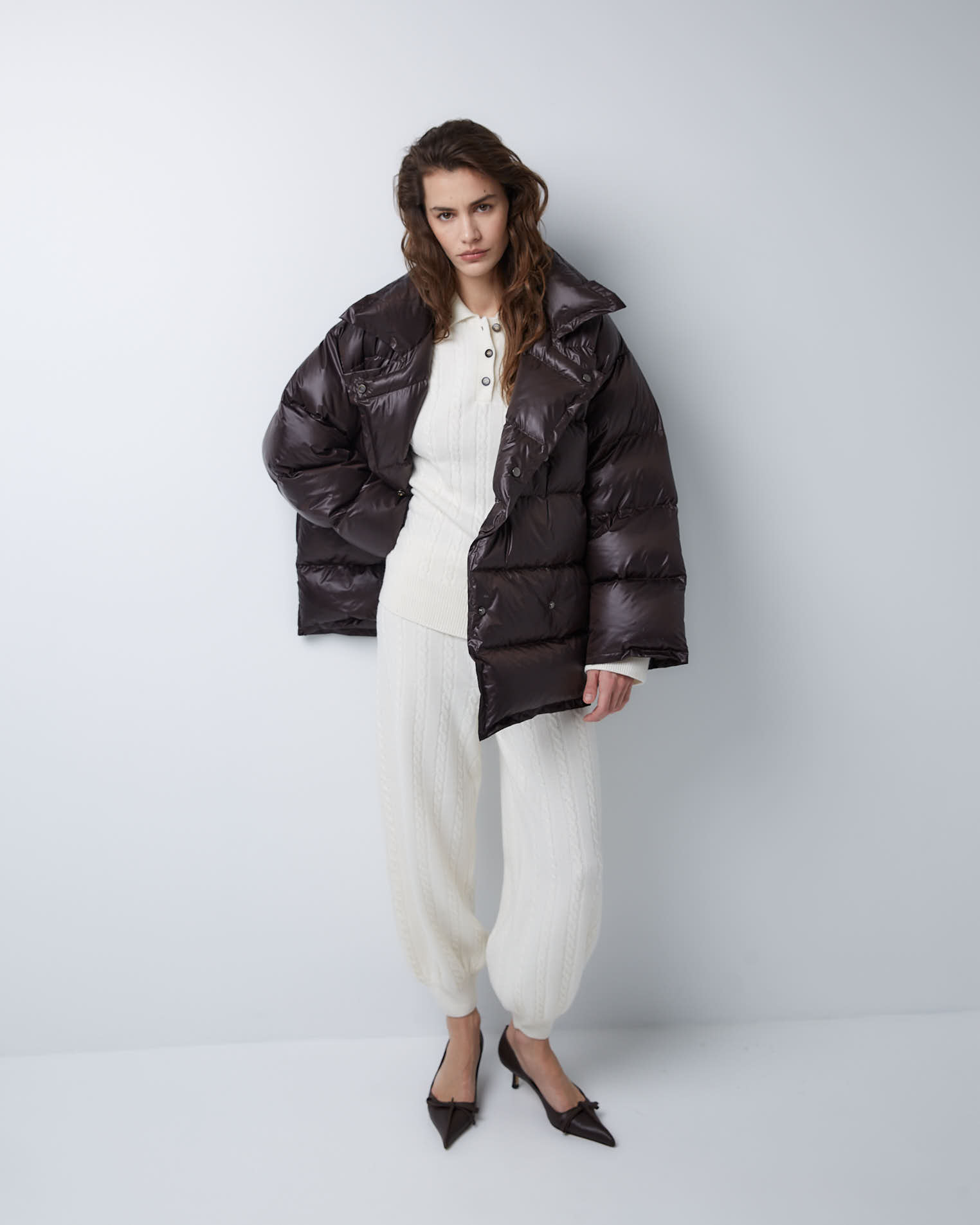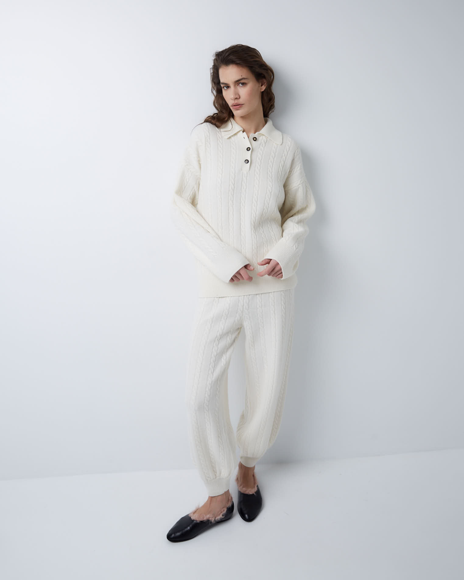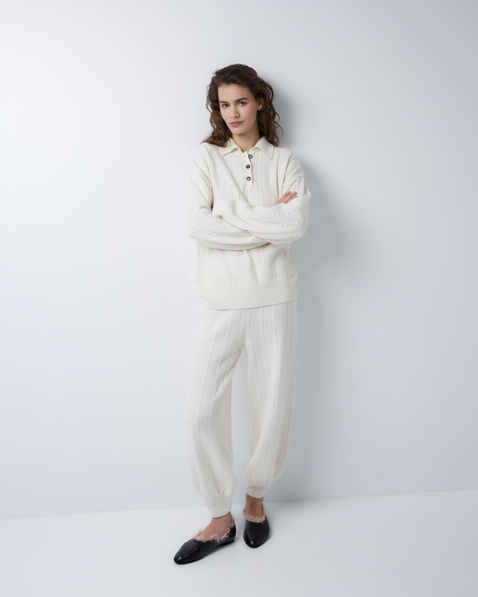 Завершите образ с помощью поло объемного кроя аналогичного оттенка. Столь элегантный комплект подойдет для любого случая.