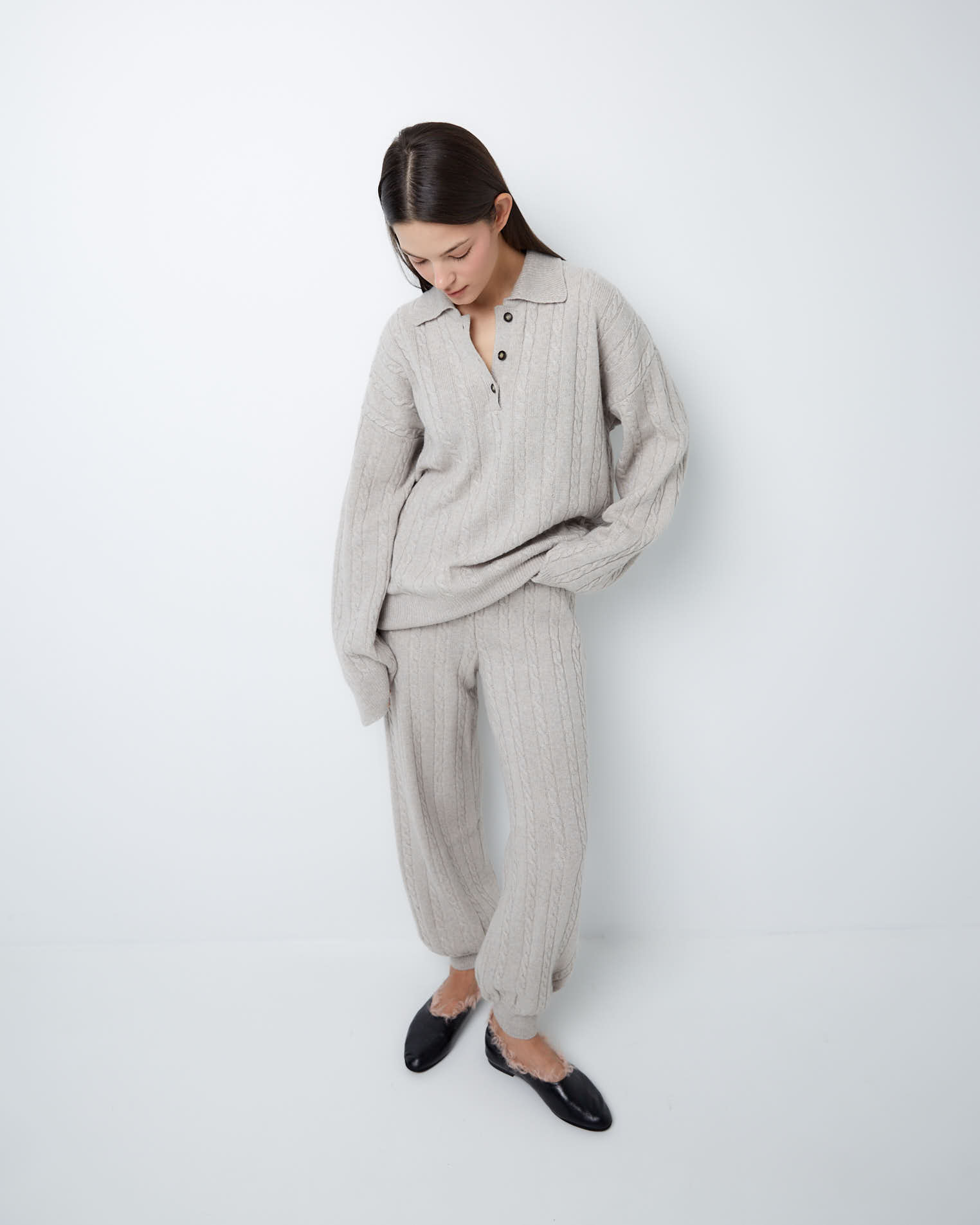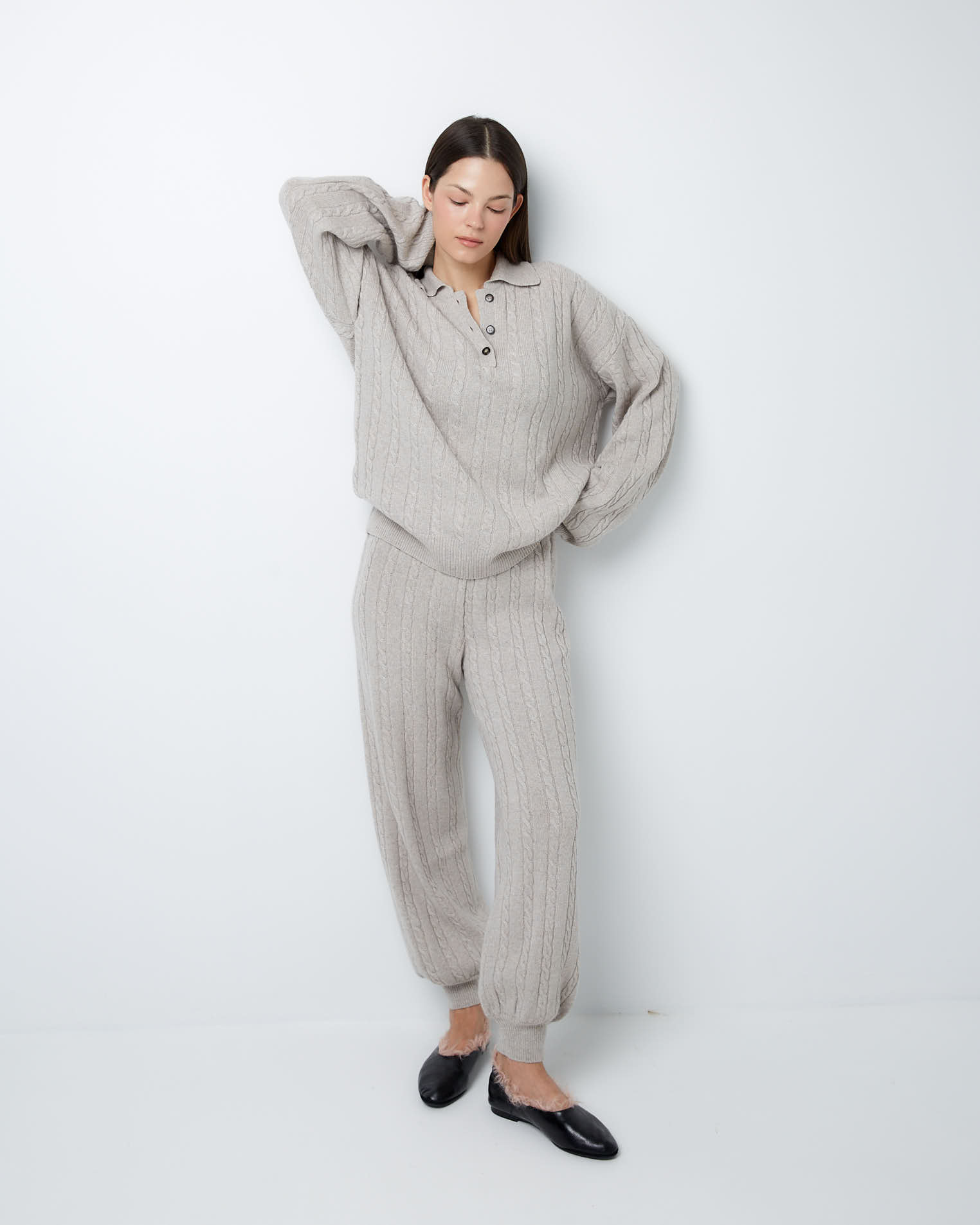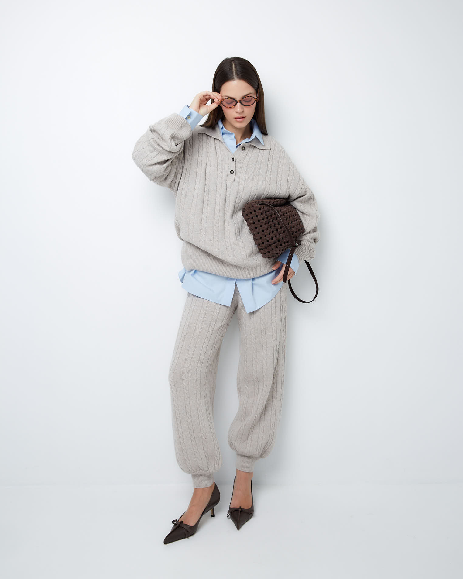 Завершите образ с помощью поло объемного кроя аналогичного оттенка. Столь элегантный комплект подойдет для любого случая.