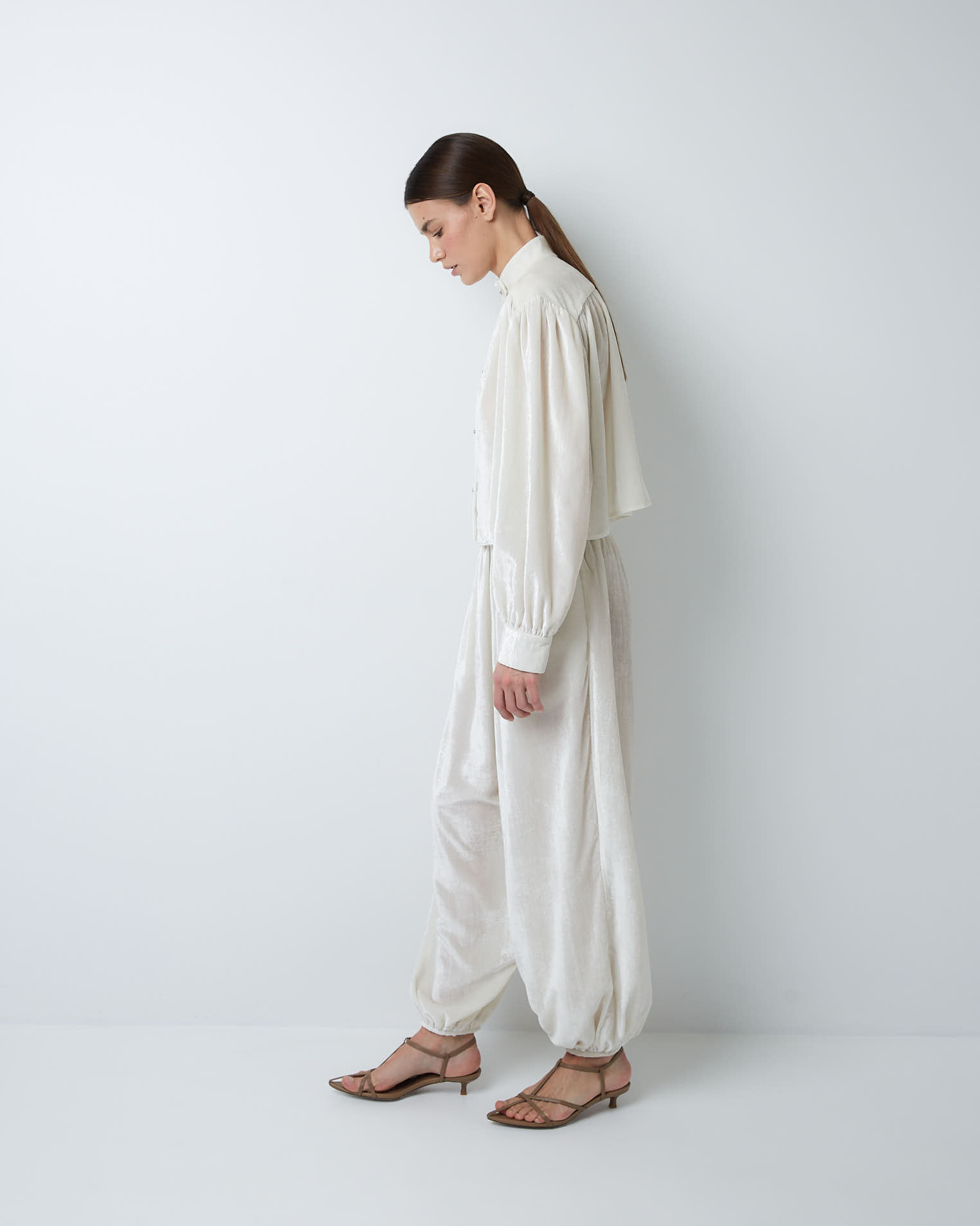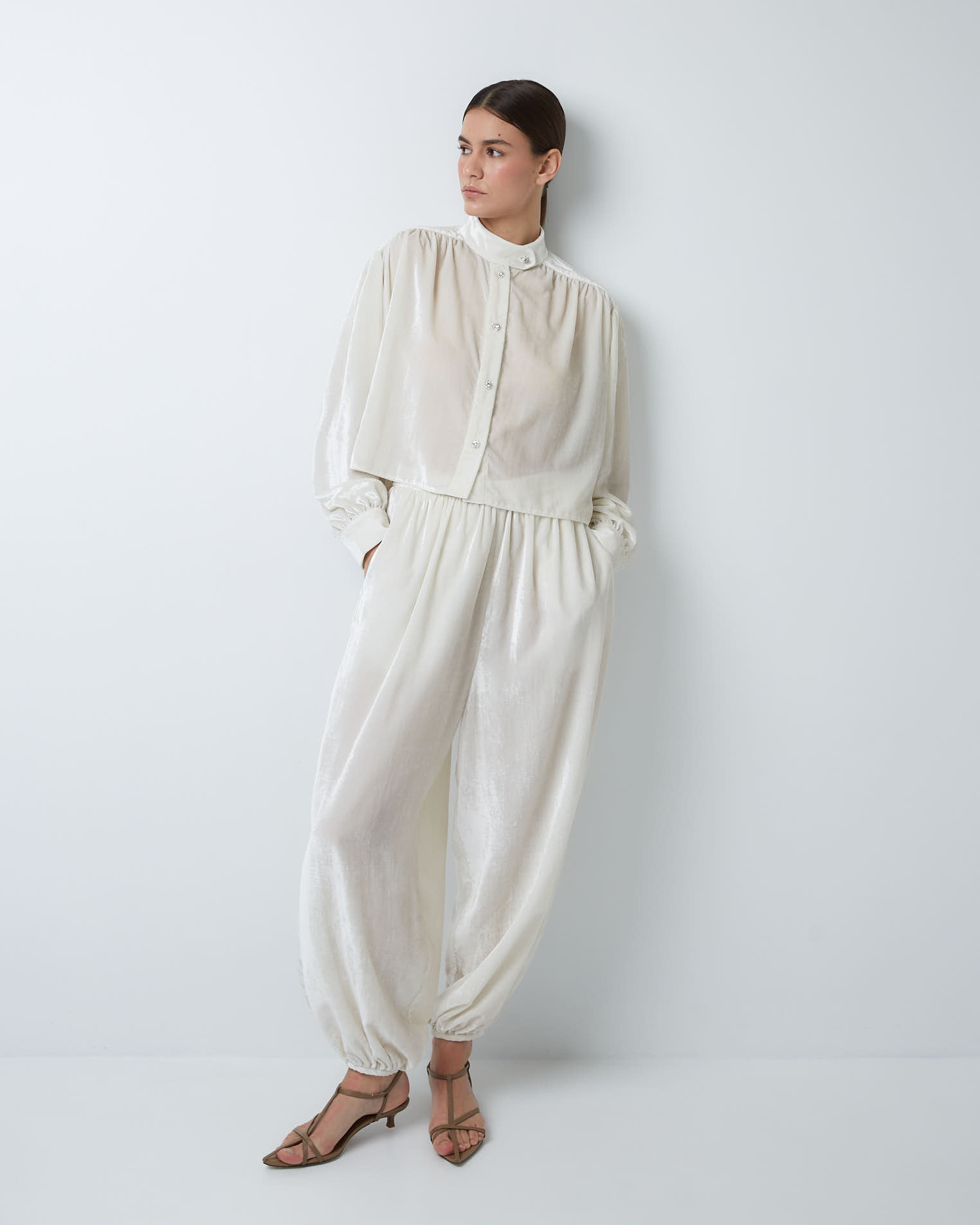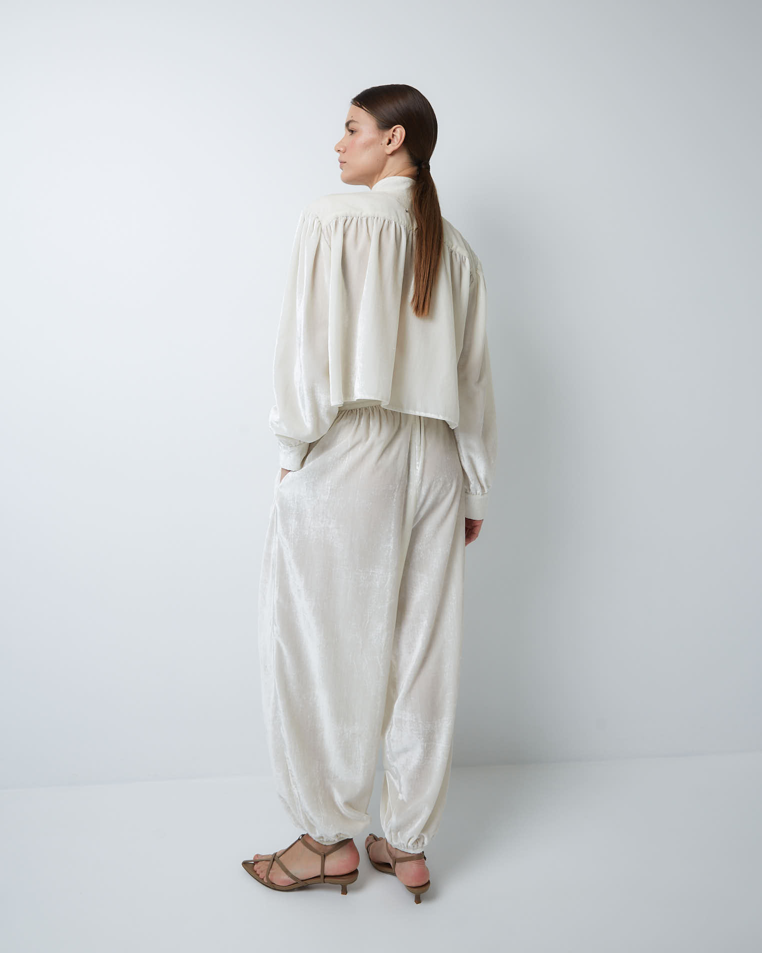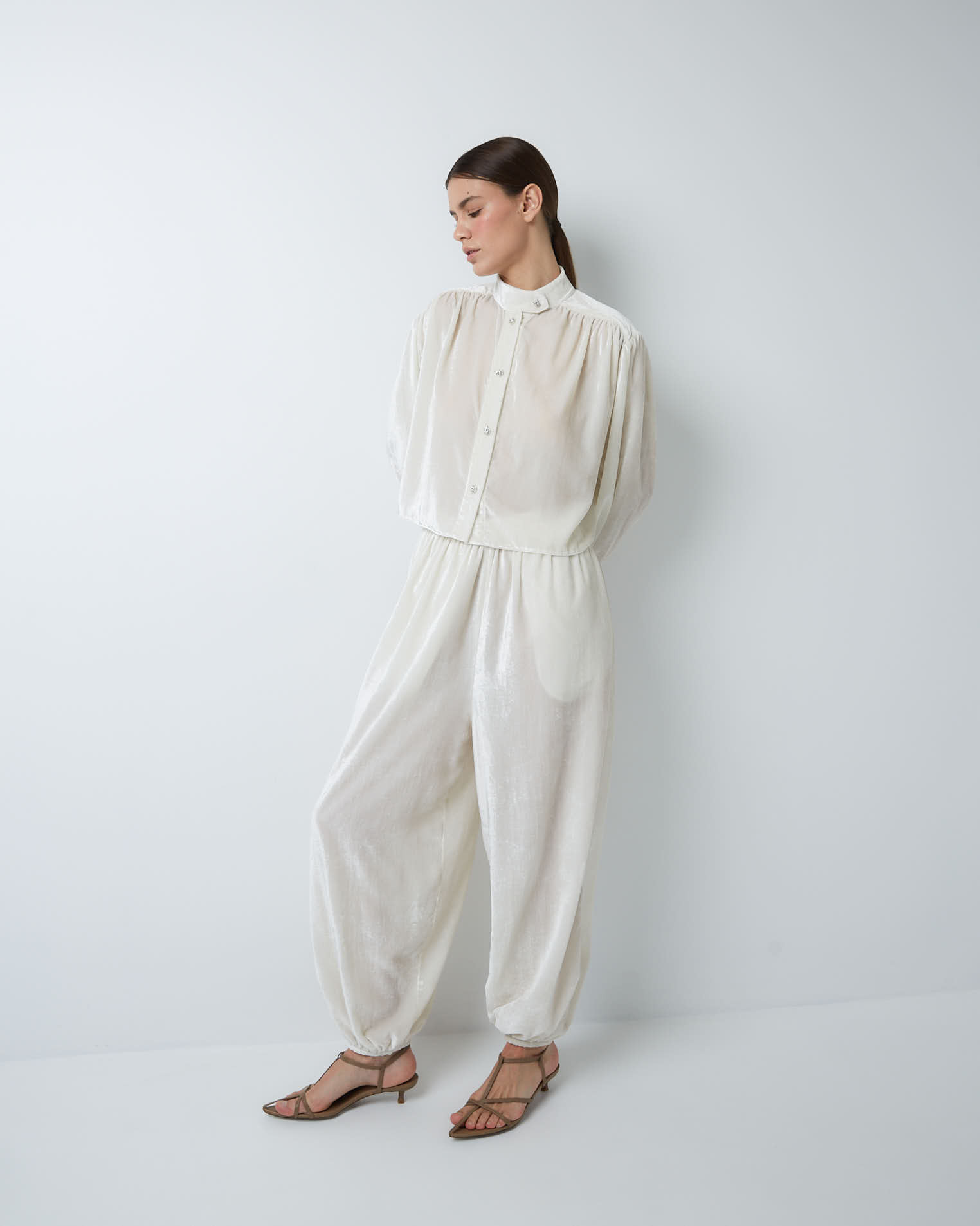 Блуза укороченная, на кокетке, со сборкой, застежка на пуговицы, неширокий воротник-стойка, свободные рукава со сборкой в верхней и нижней частях. Брюки широкие, со сборкой внизу, пояс по талии, в боковых швах карманы, сзади застежка-молния сзади.