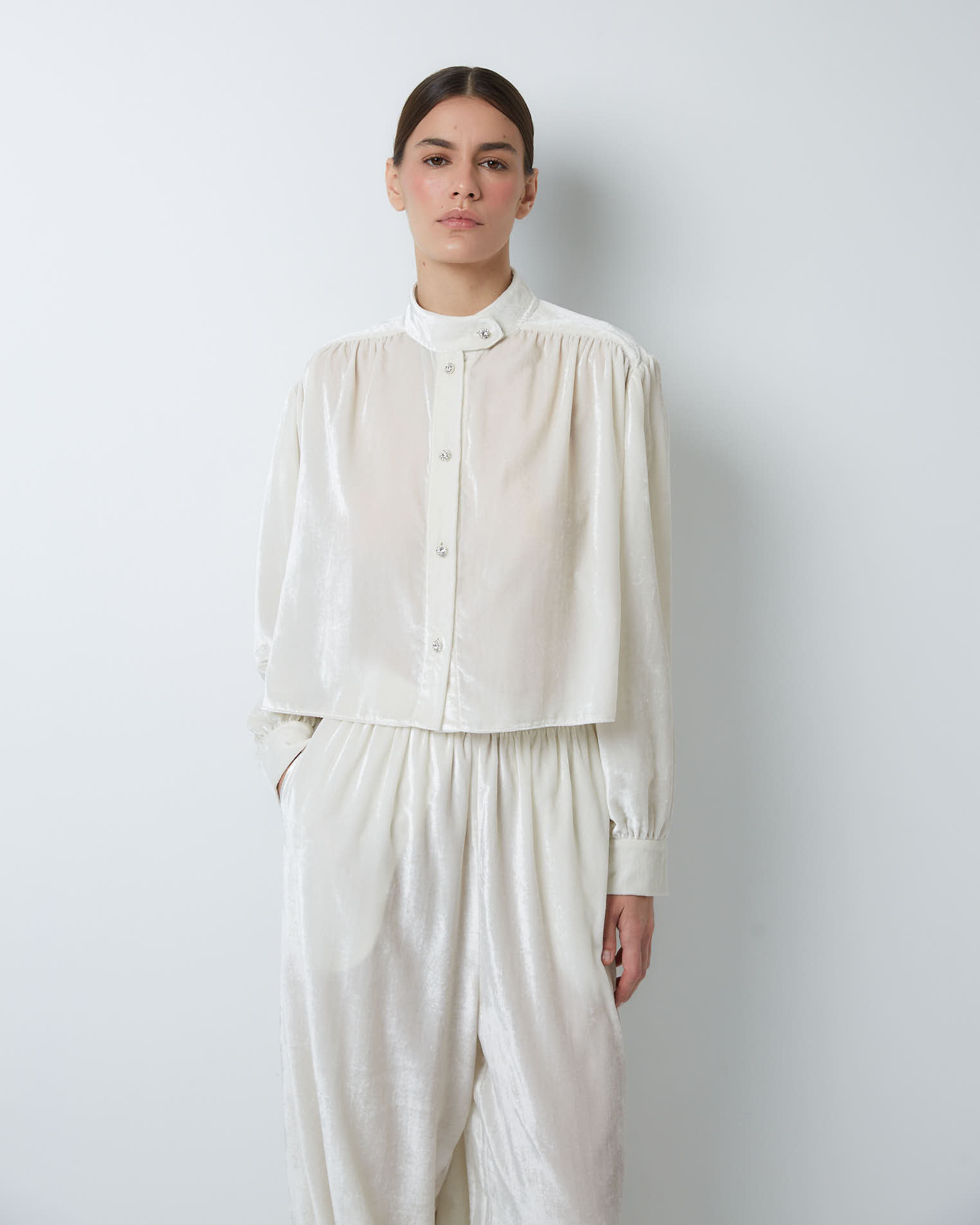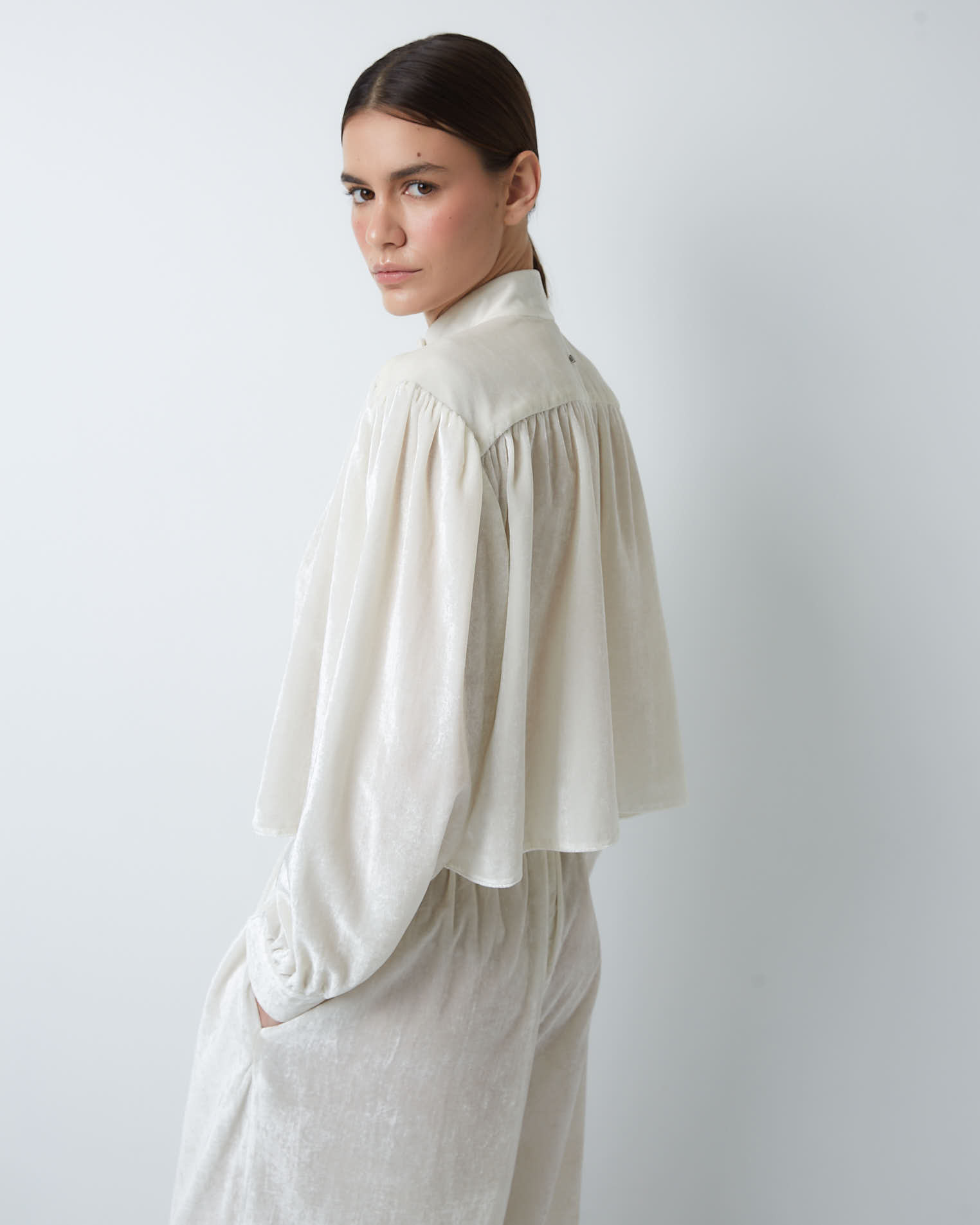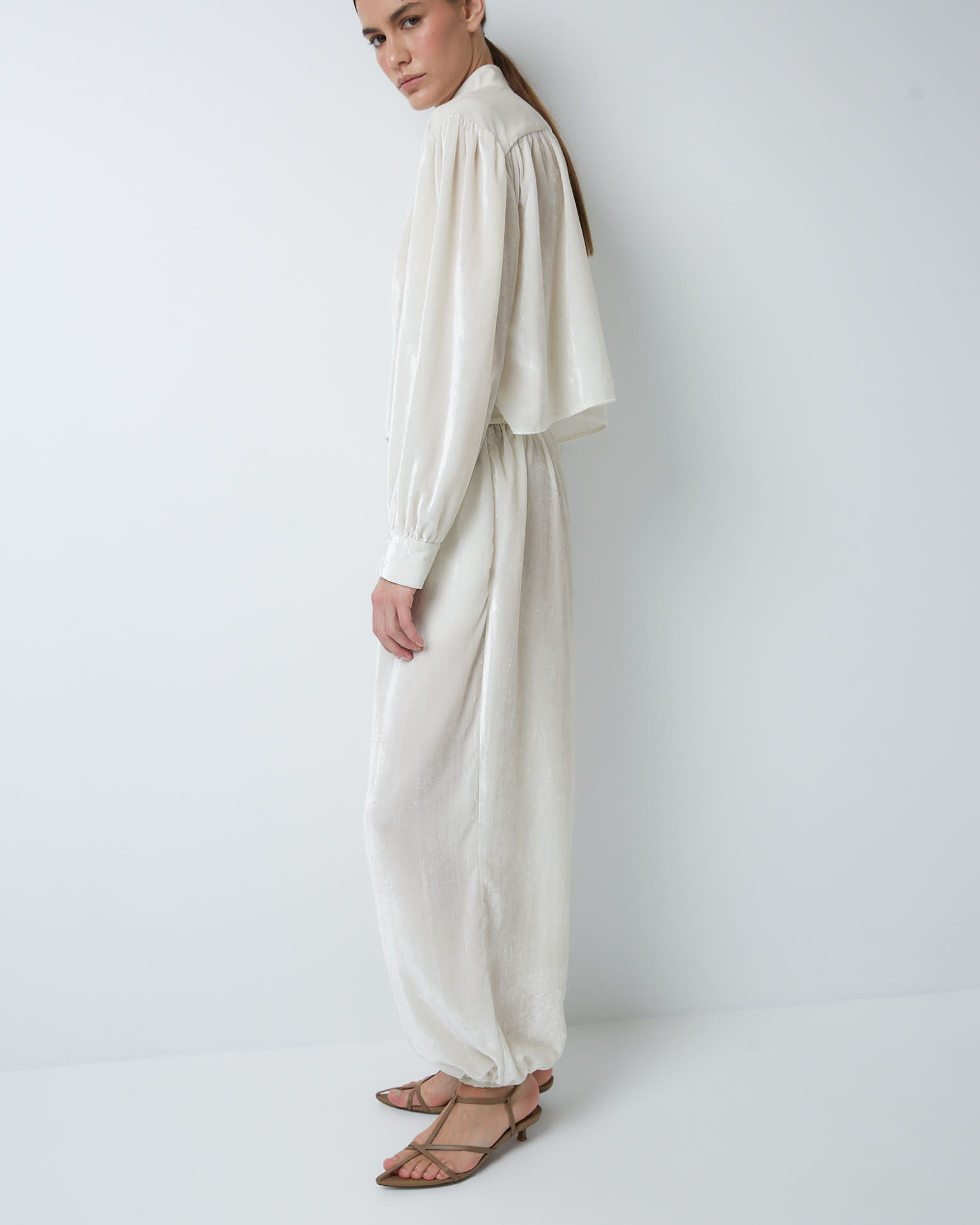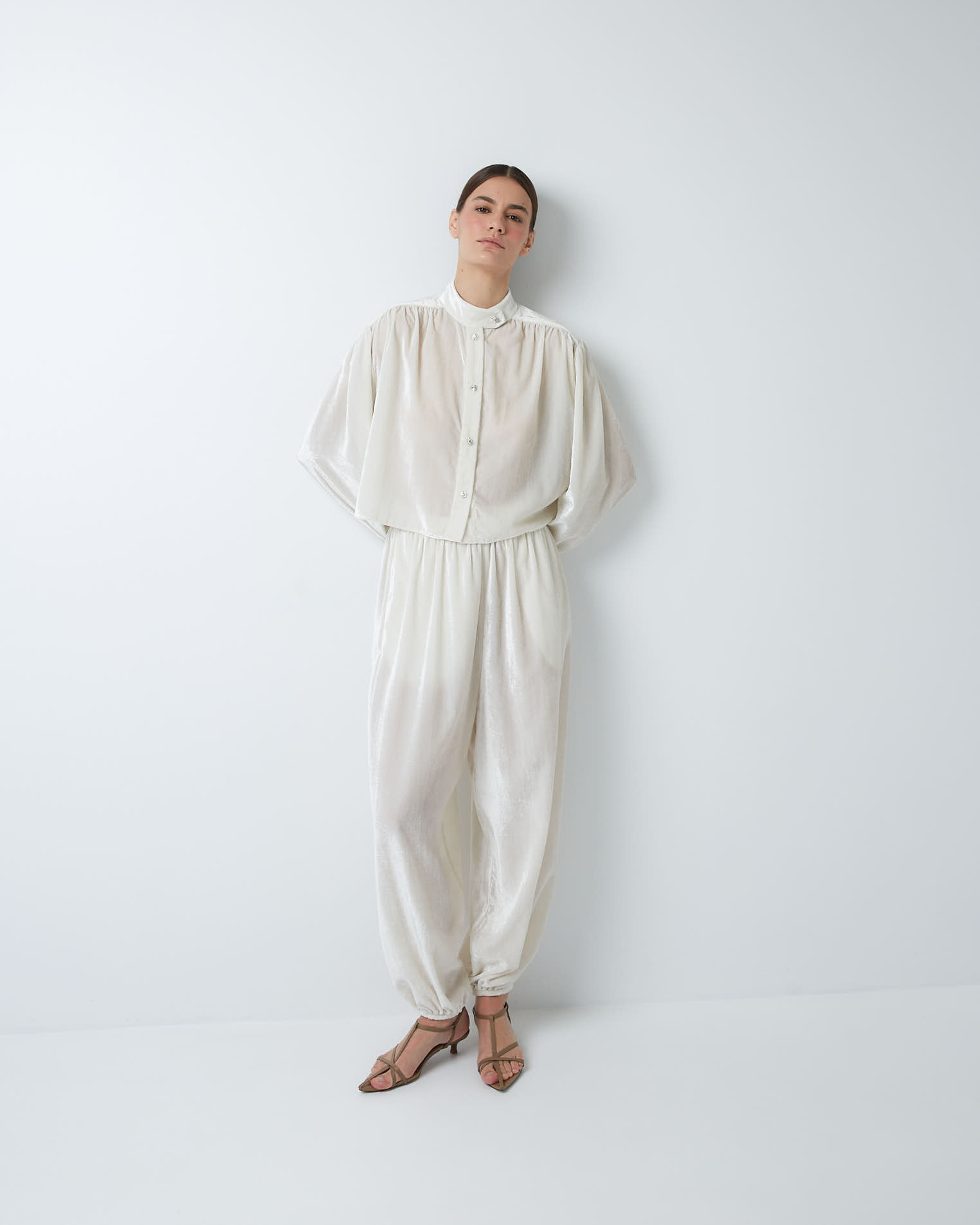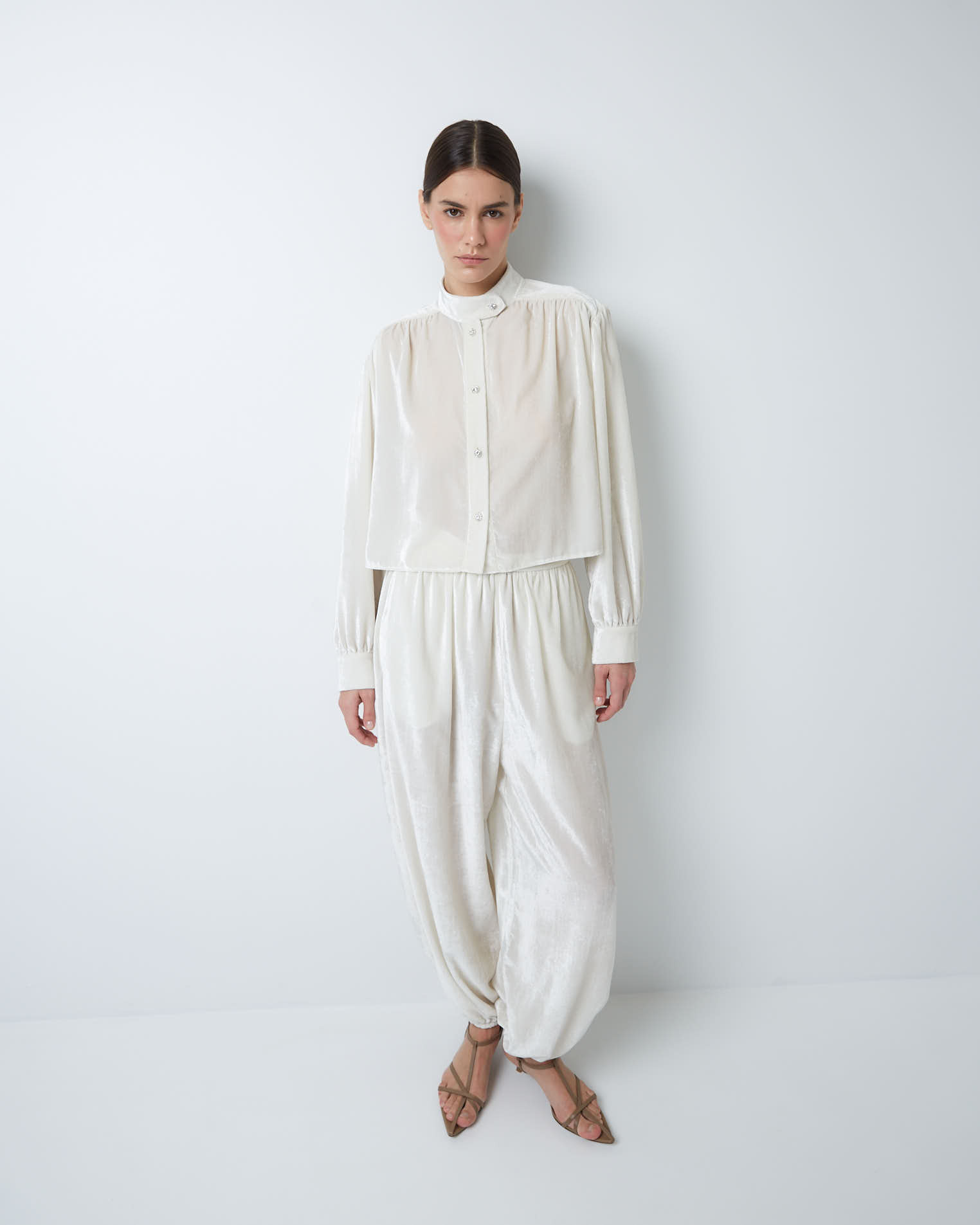 Блуза укороченная, на кокетке, со сборкой, застежка на пуговицы, неширокий воротник-стойка, свободные рукава со сборкой в верхней и нижней частях. Брюки широкие, со сборкой внизу, пояс по талии, в боковых швах карманы, сзади застежка-молния сзади.