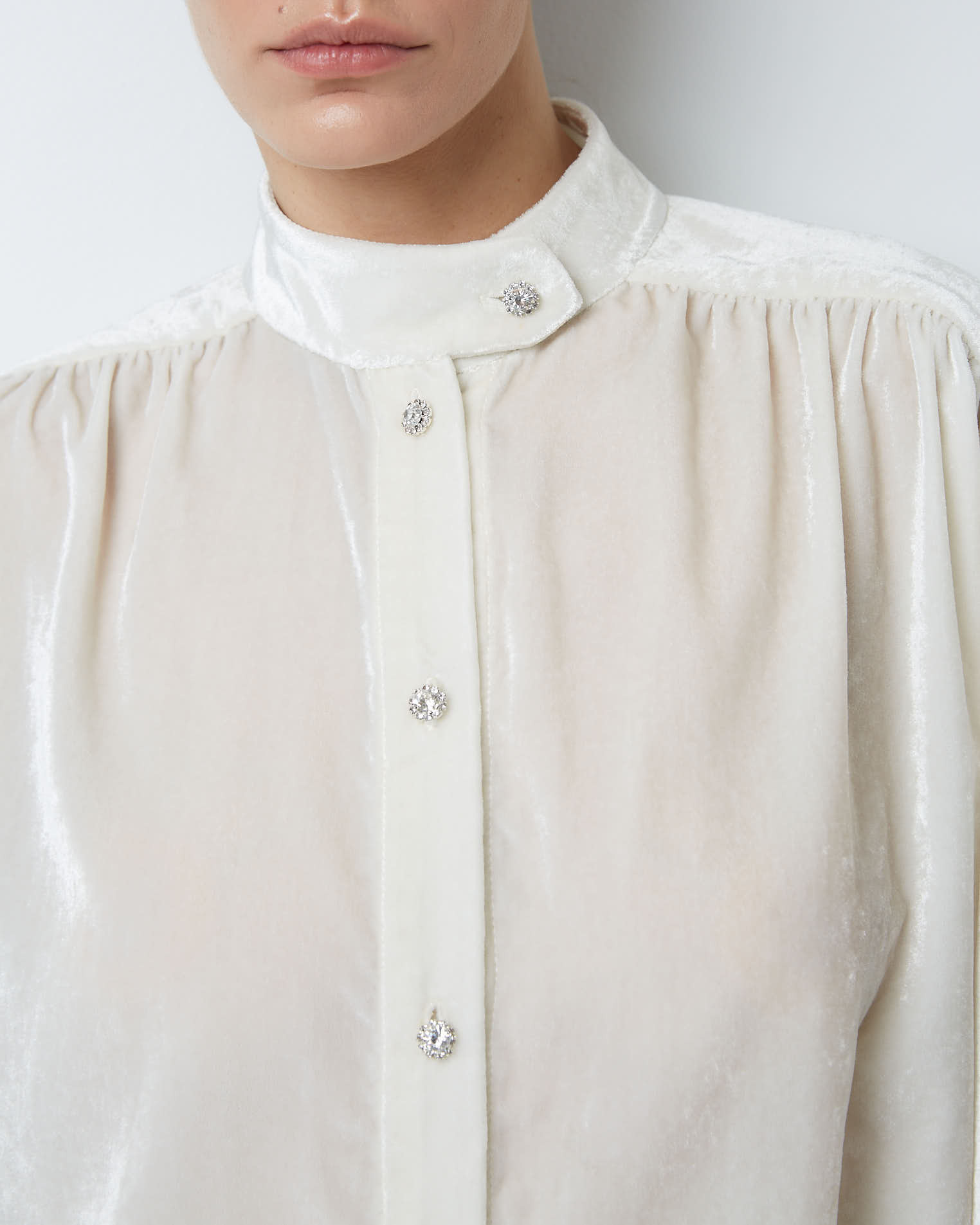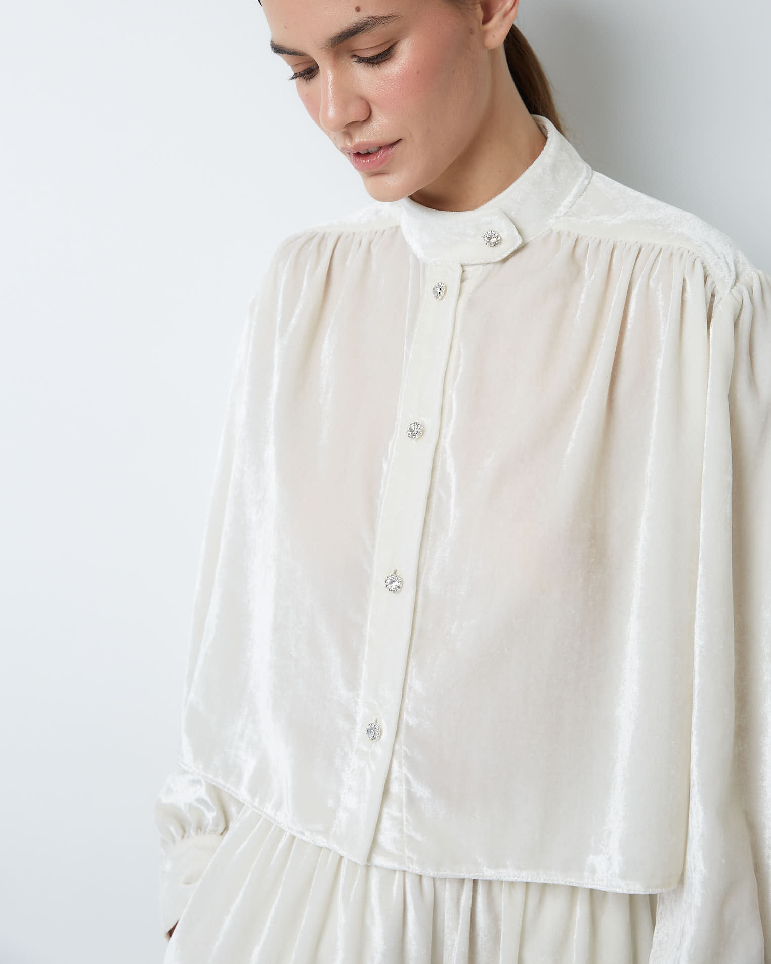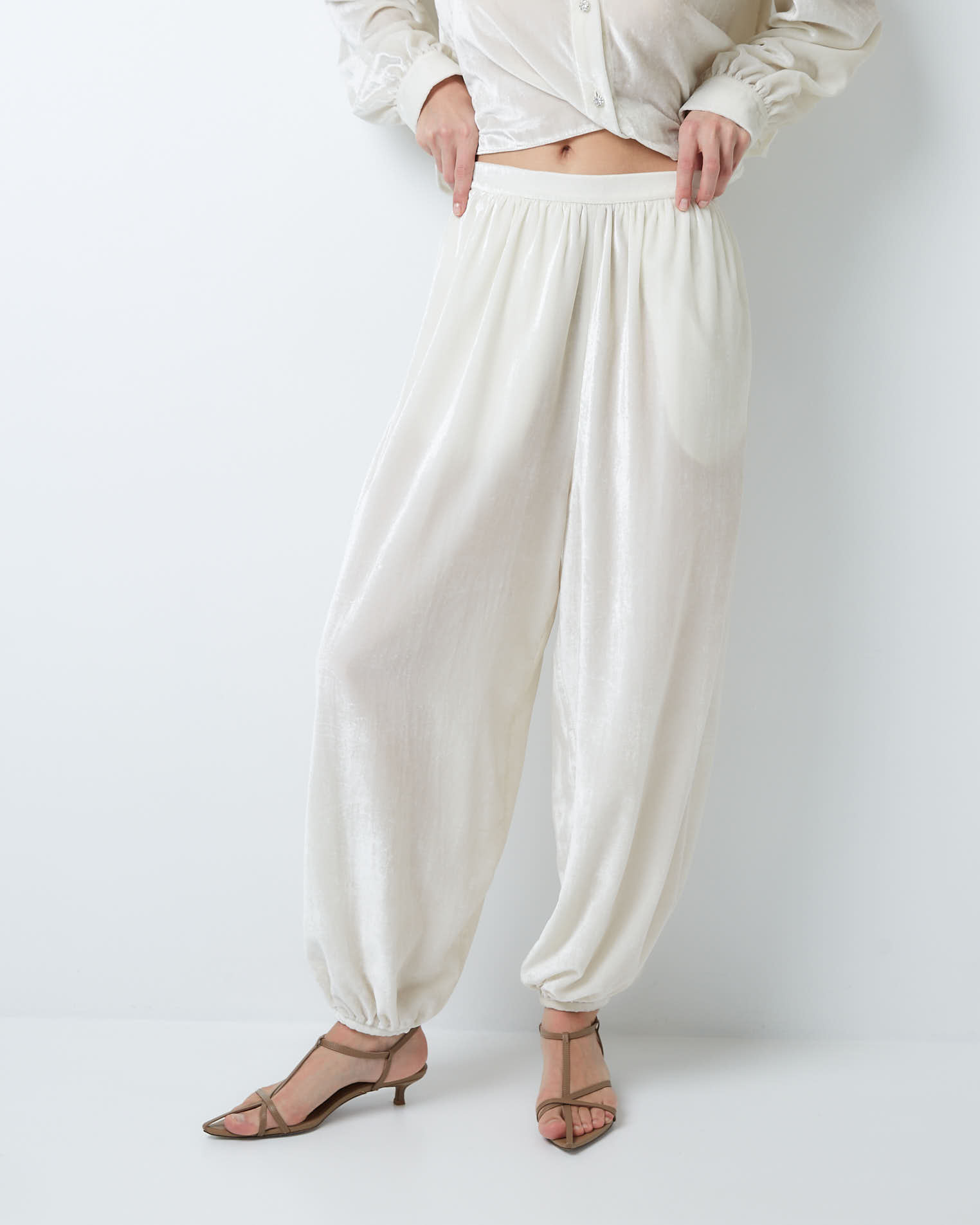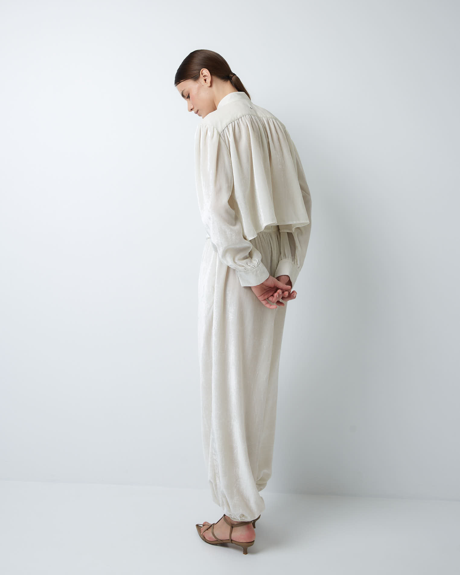 Блуза укороченная, на кокетке, со сборкой, застежка на пуговицы, неширокий воротник-стойка, свободные рукава со сборкой в верхней и нижней частях. Брюки широкие, со сборкой внизу, пояс по талии, в боковых швах карманы, сзади застежка-молния сзади.