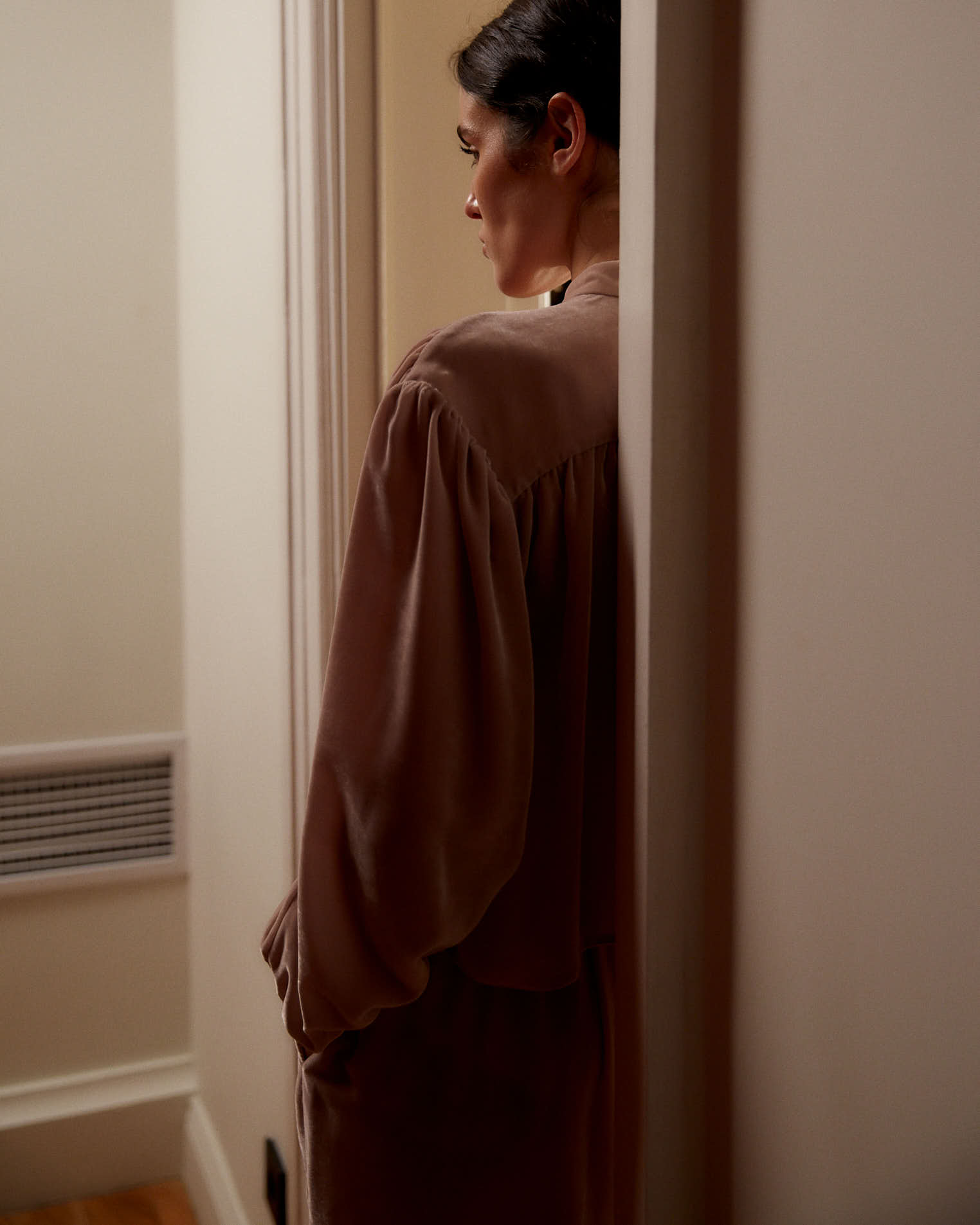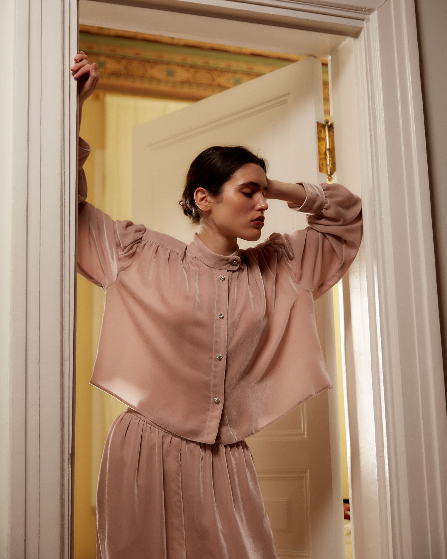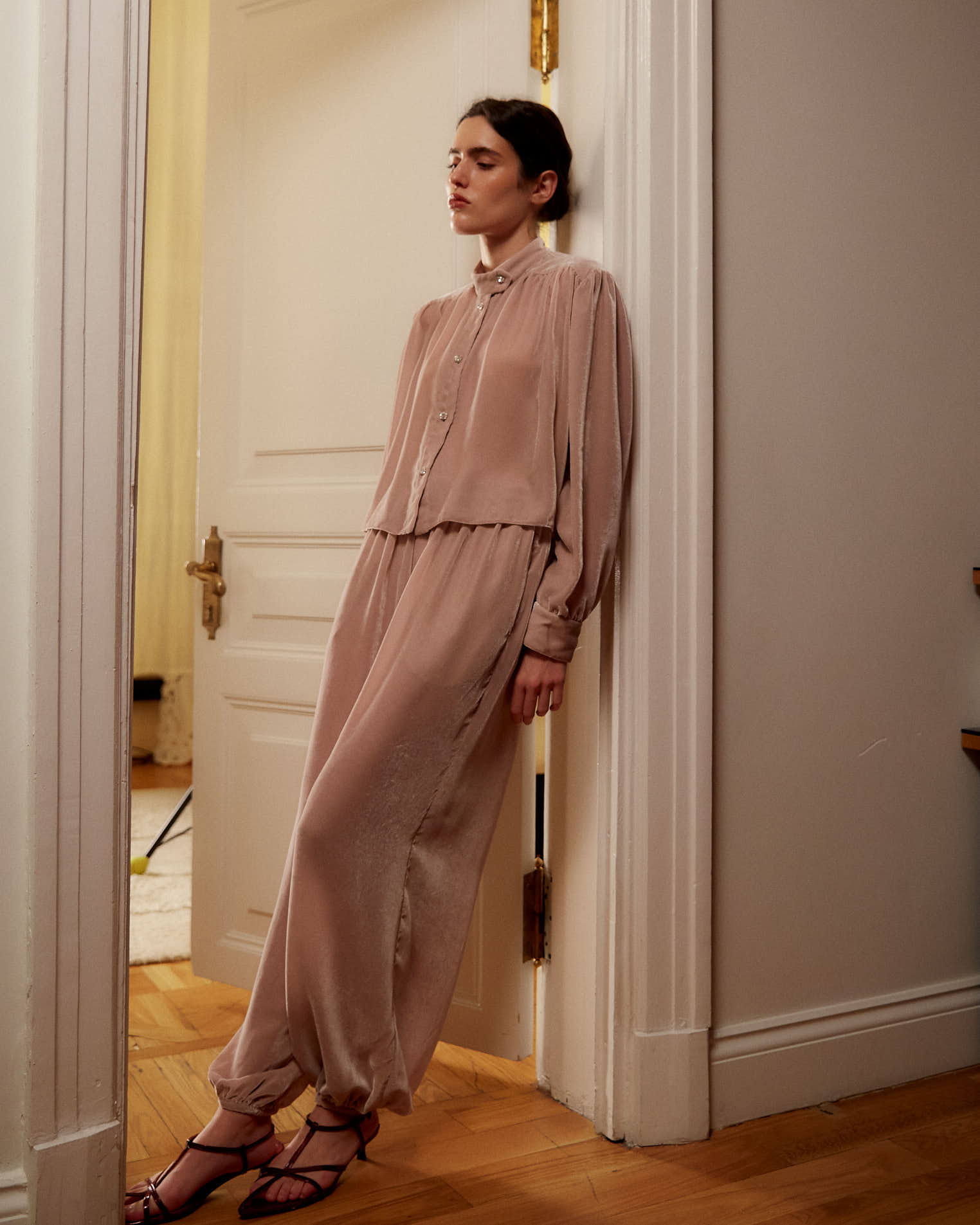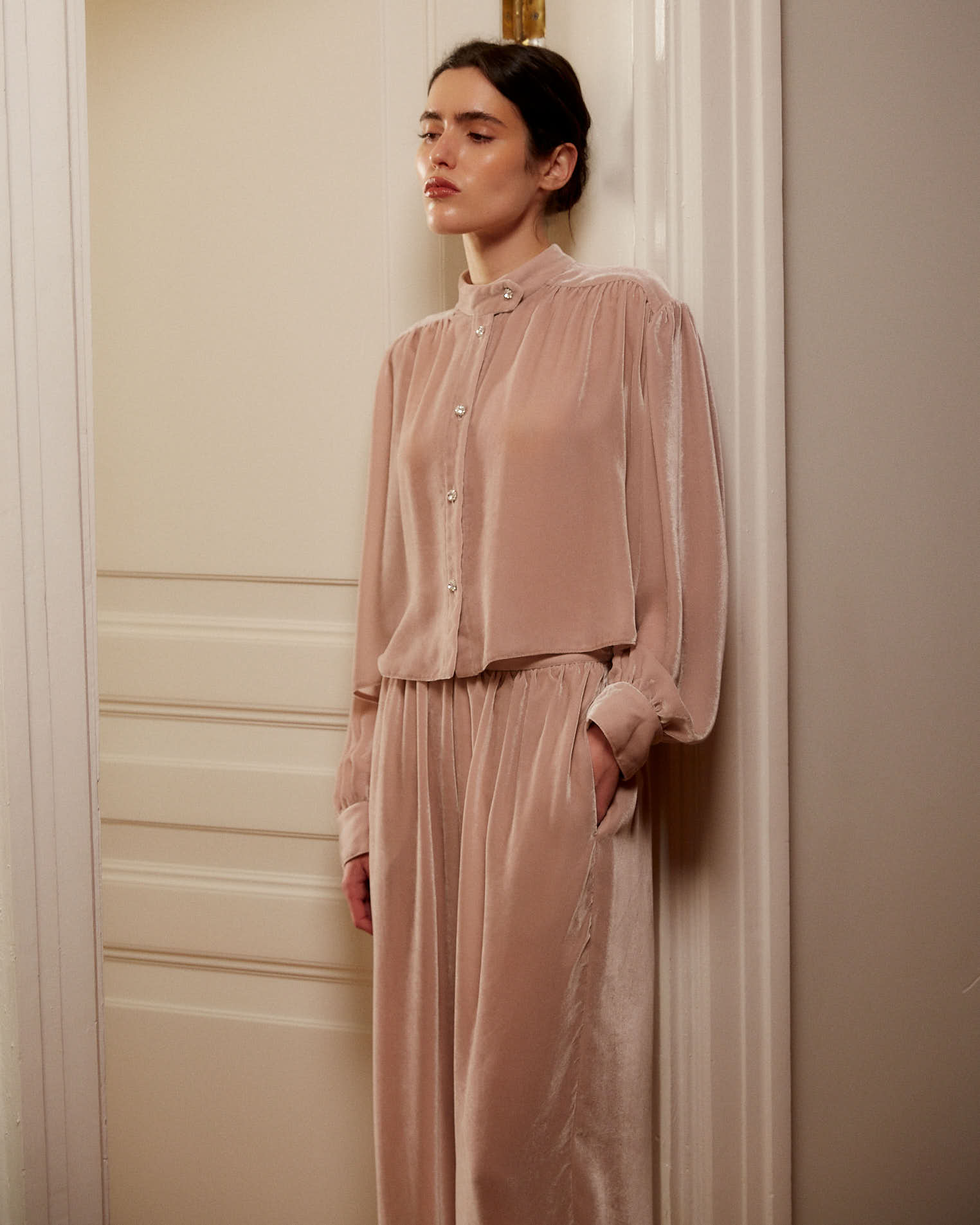 Комплект: блуза и брюки из шелкового бархата в розовом цвете