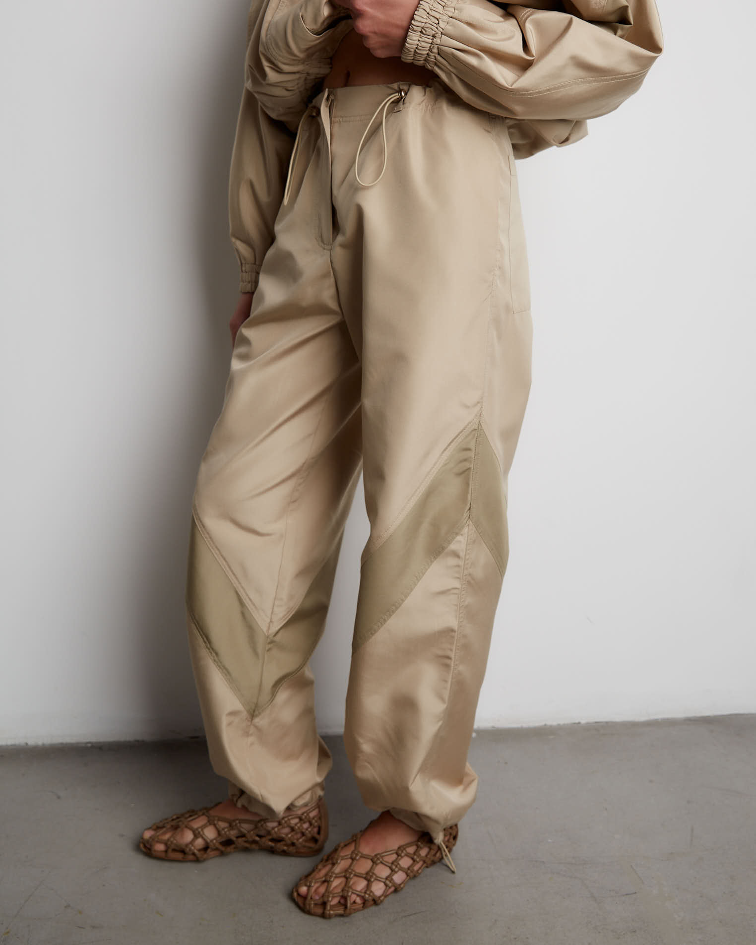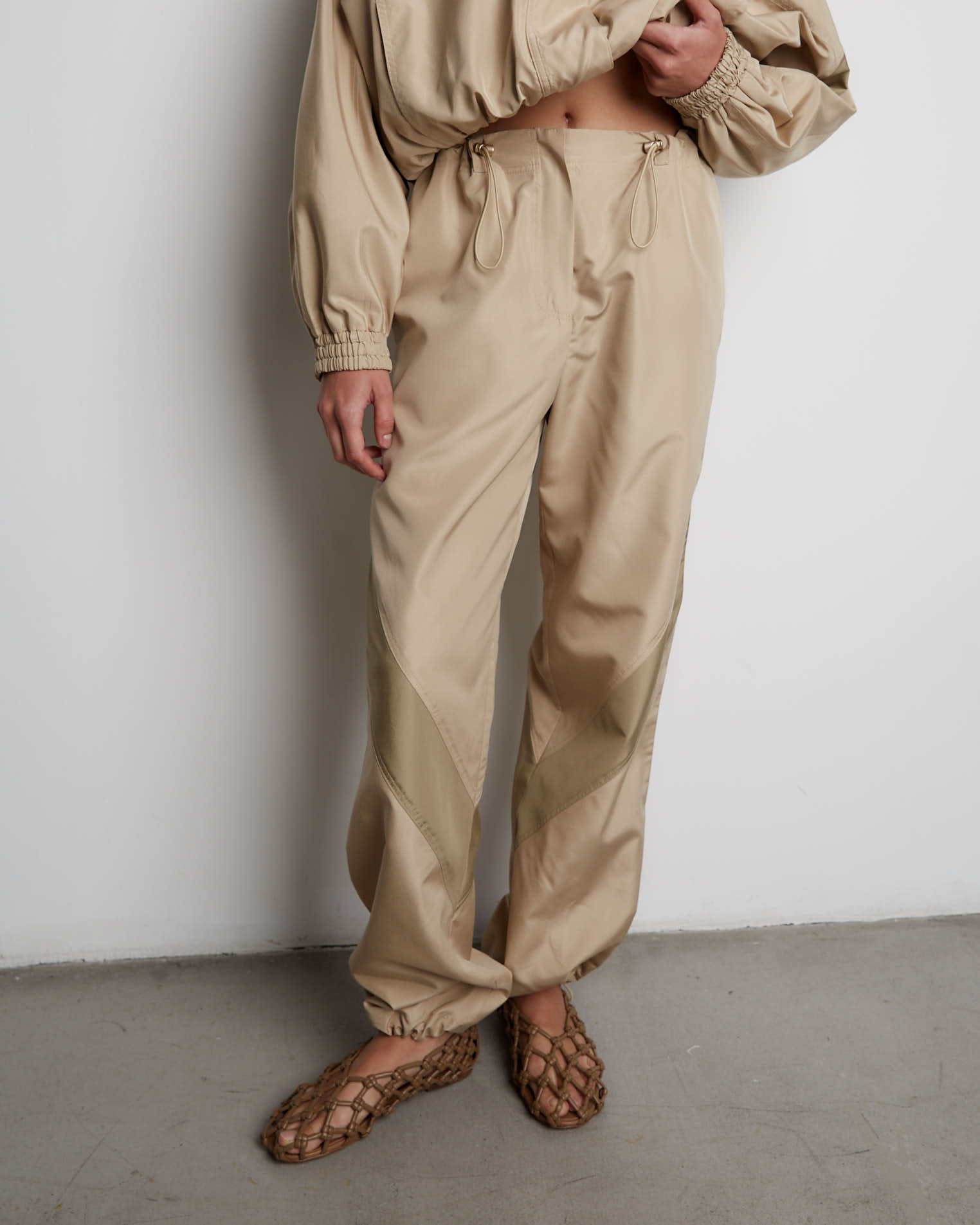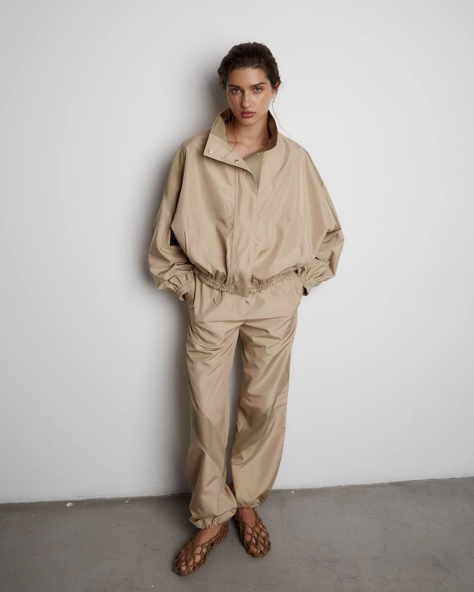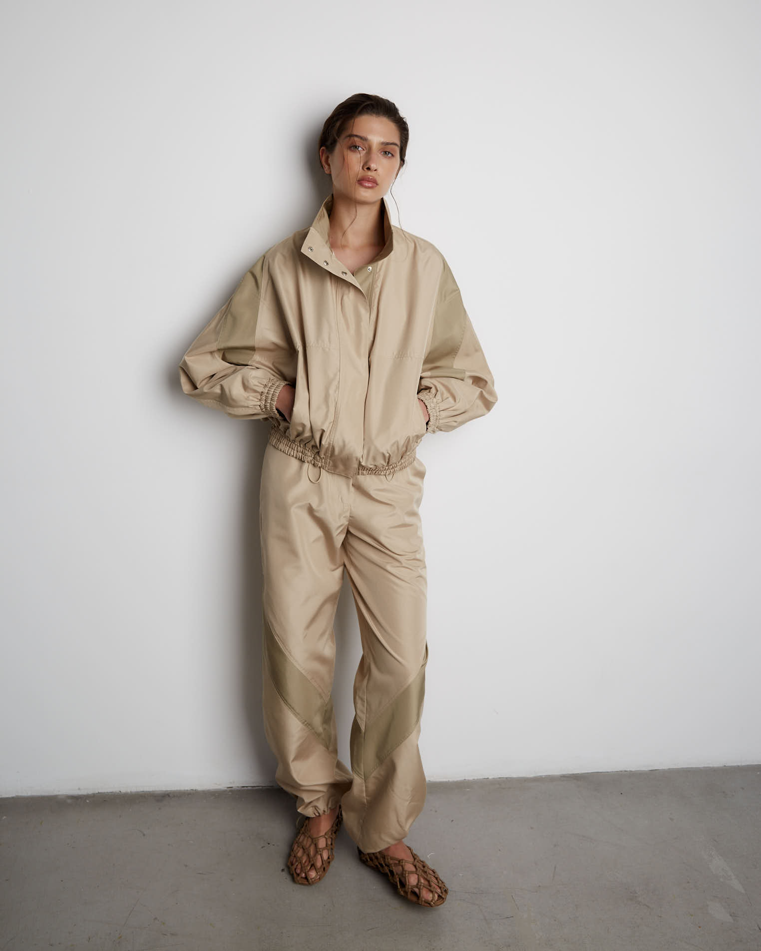 Модель объемного кроя, с цельнокроеным рукавом, который заканчивается манжетом на резинке, воротник-стойка, спереди две планки, на которых расположены потайные кнопки для застегивания. Также спереди мы предусмотрели два кармана в шве, а низ изделия обработан поясом на резинке.