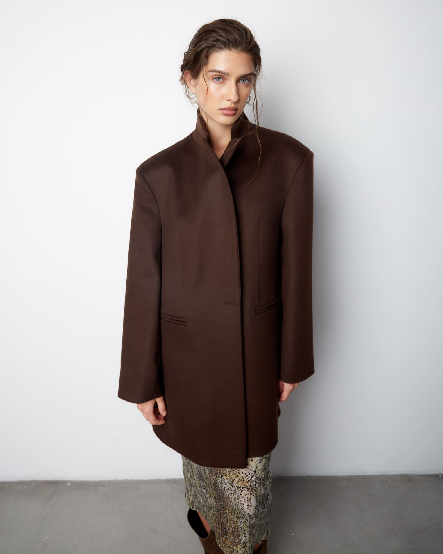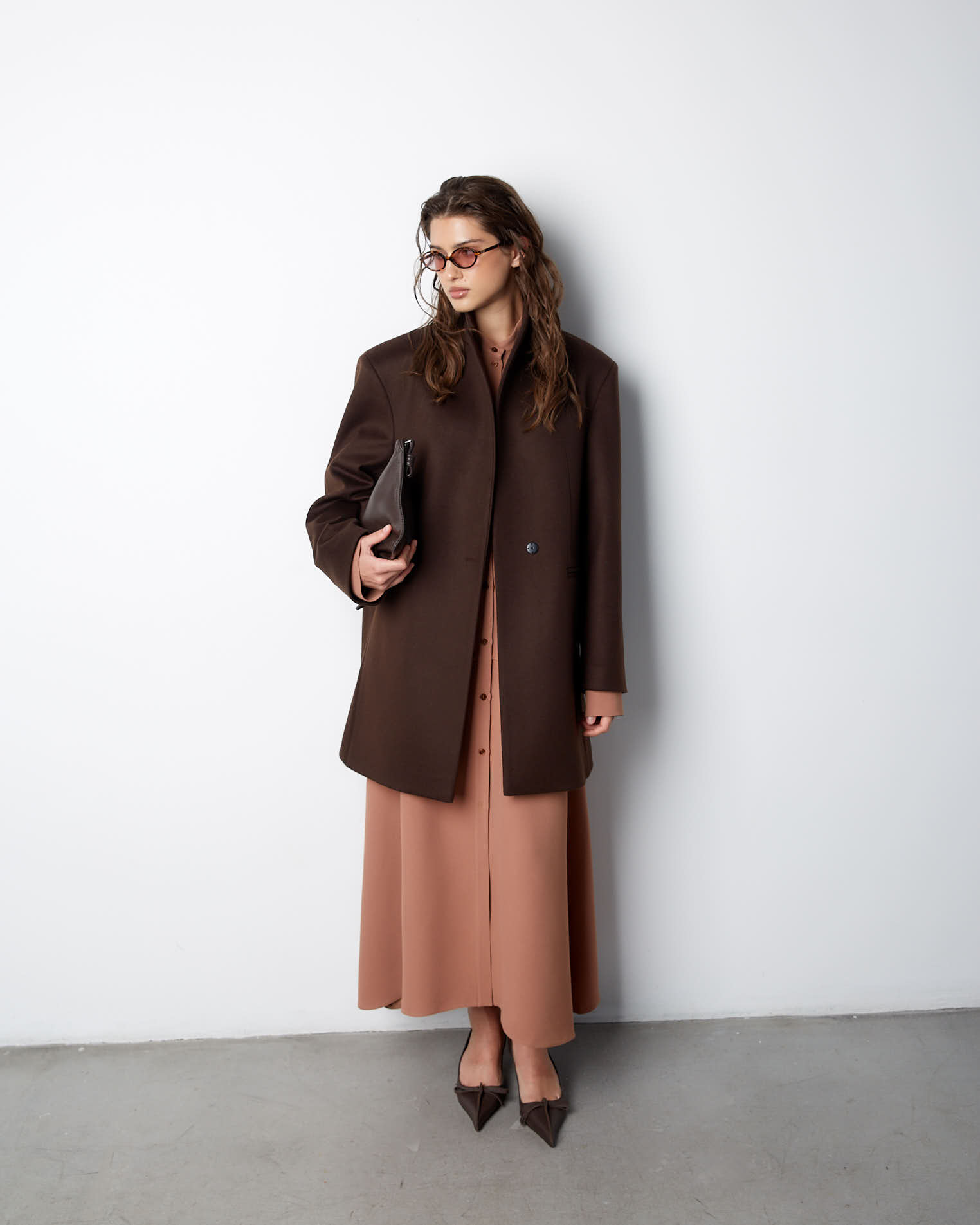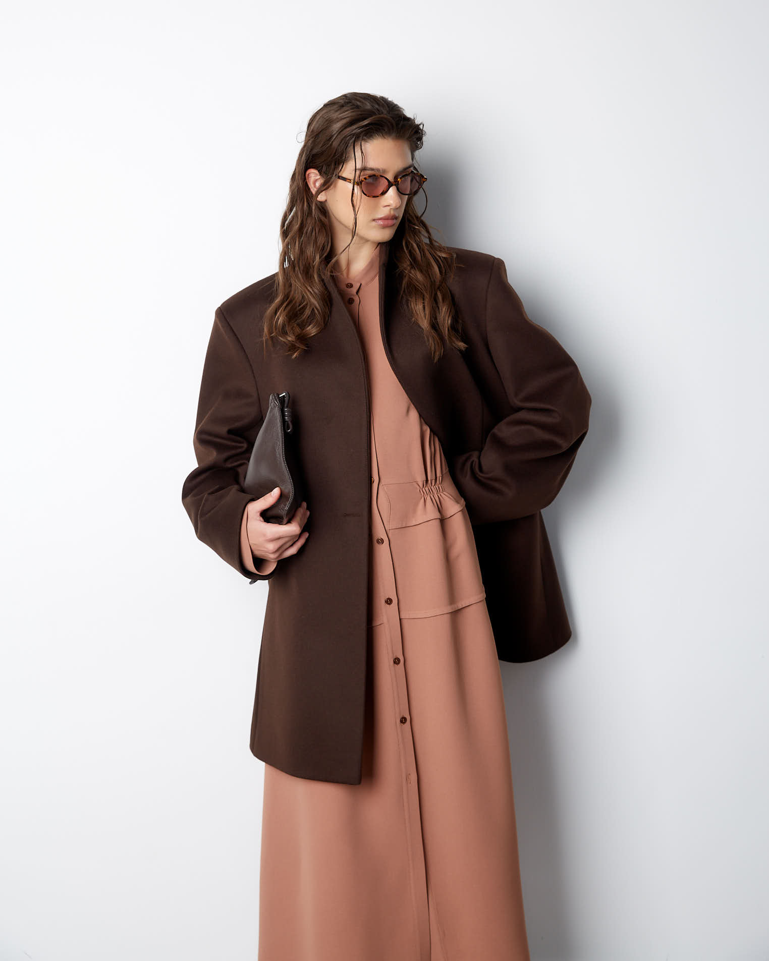Модель с фигурным низом, передняя часть длиннее спинки на 10 см. Полочки созданы по принципу классического жакета, а спинка имеет большое расширение и закладывается фалдами. Рукав двухшовный, воротник-стойка, застежка на одну пришивную кнопку. Выметанная петля на передней полочке создает имитацию застежки.