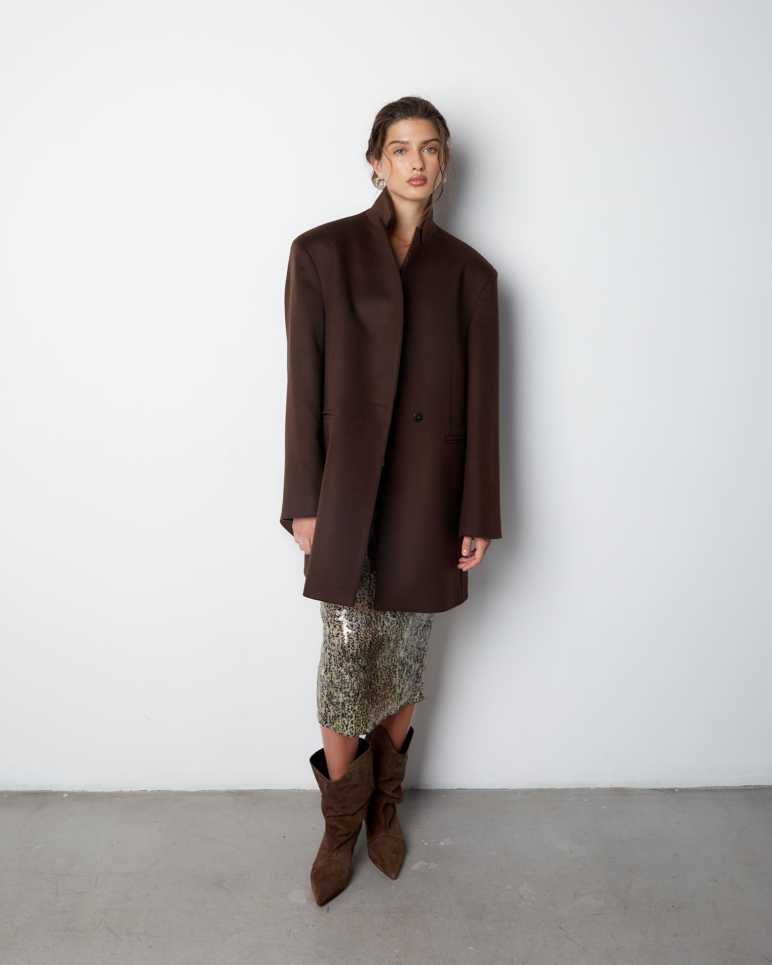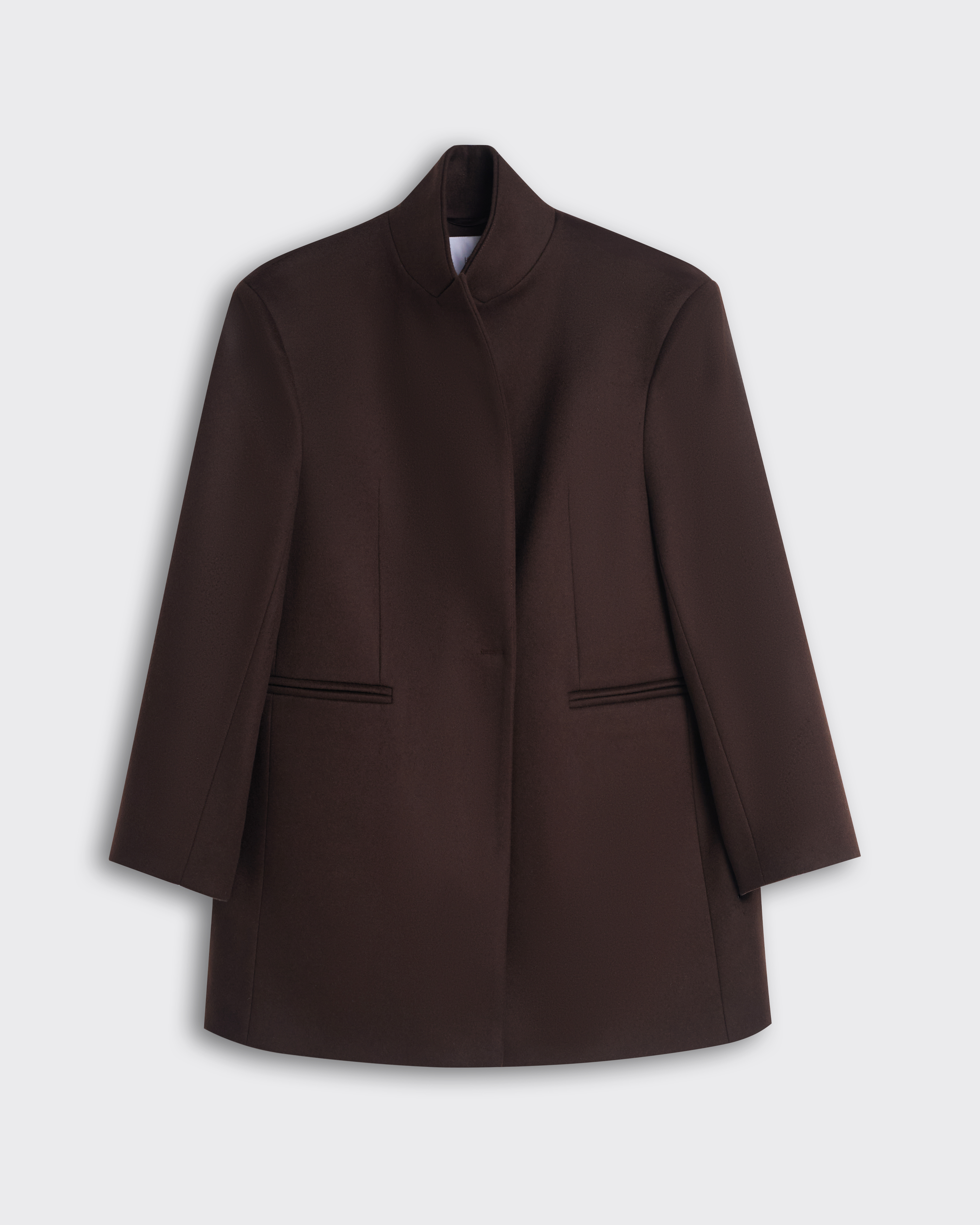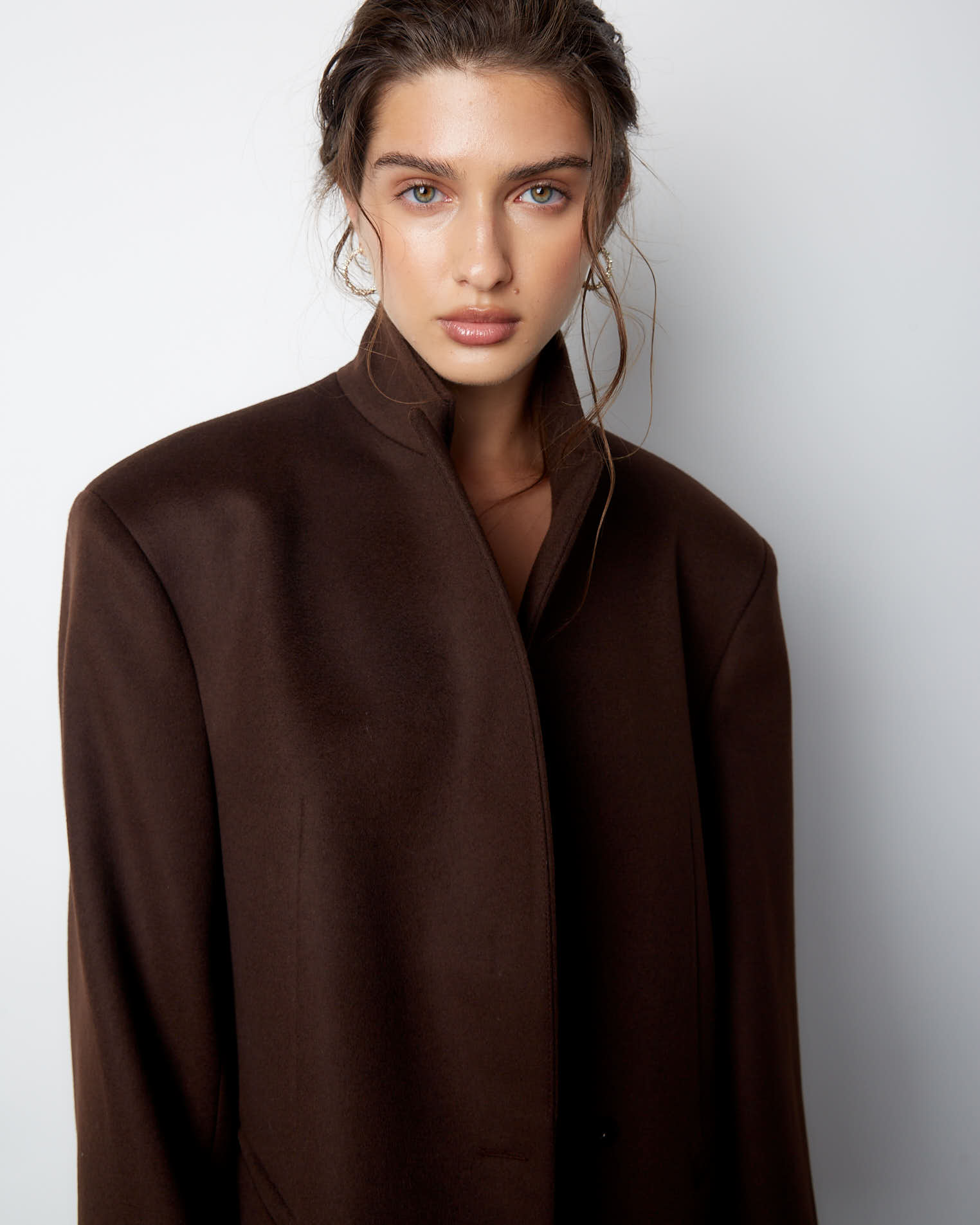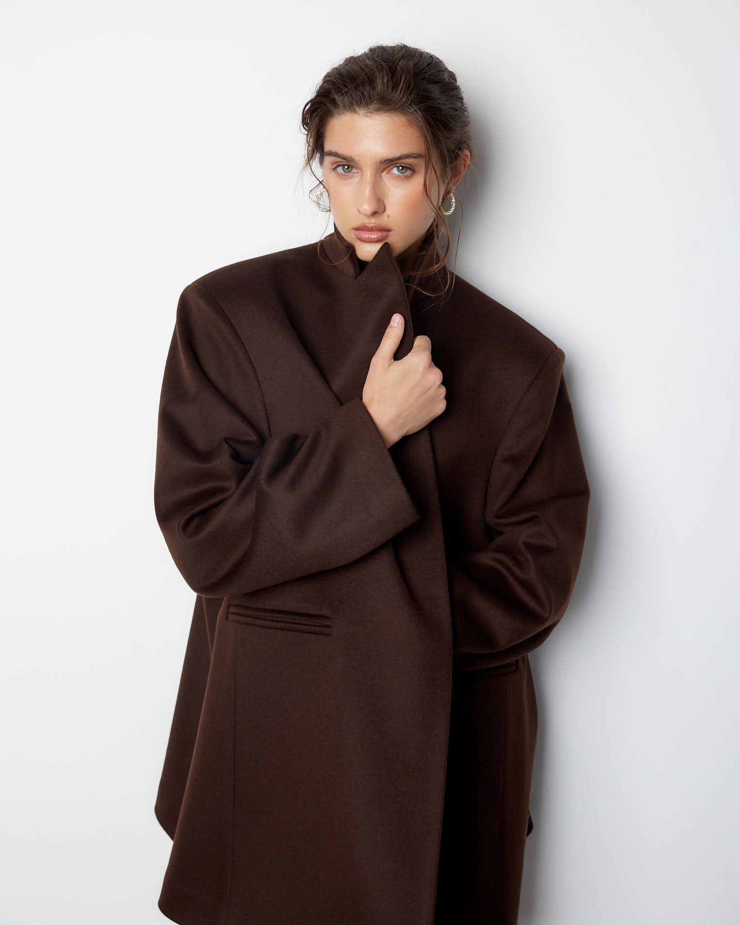 Модель с фигурным низом, передняя часть длиннее спинки на 10 см. Полочки созданы по принципу классического жакета, а спинка имеет большое расширение и закладывается фалдами. Рукав двухшовный, воротник-стойка, застежка на одну пришивную кнопку. Выметанная петля на передней полочке создает имитацию застежки.