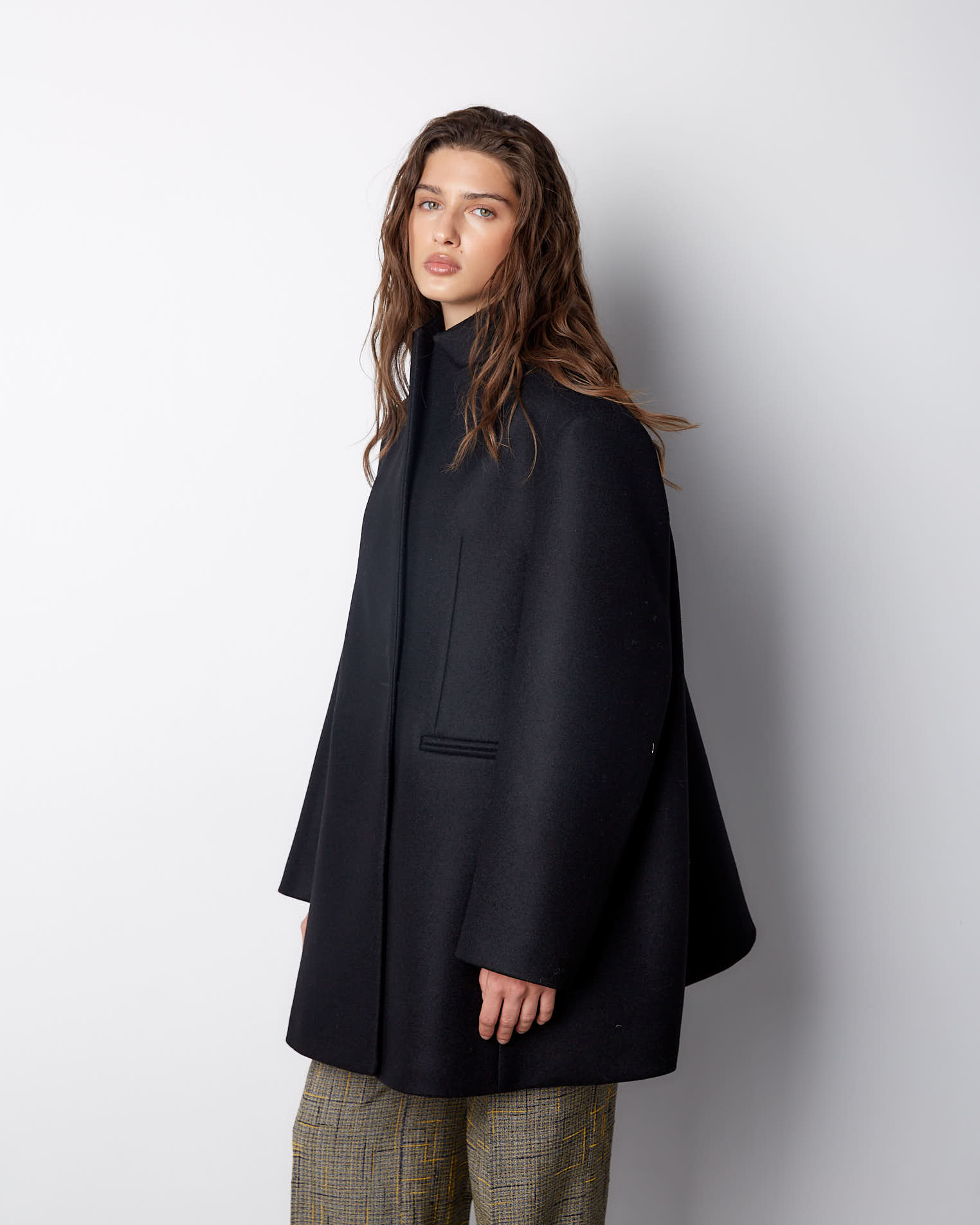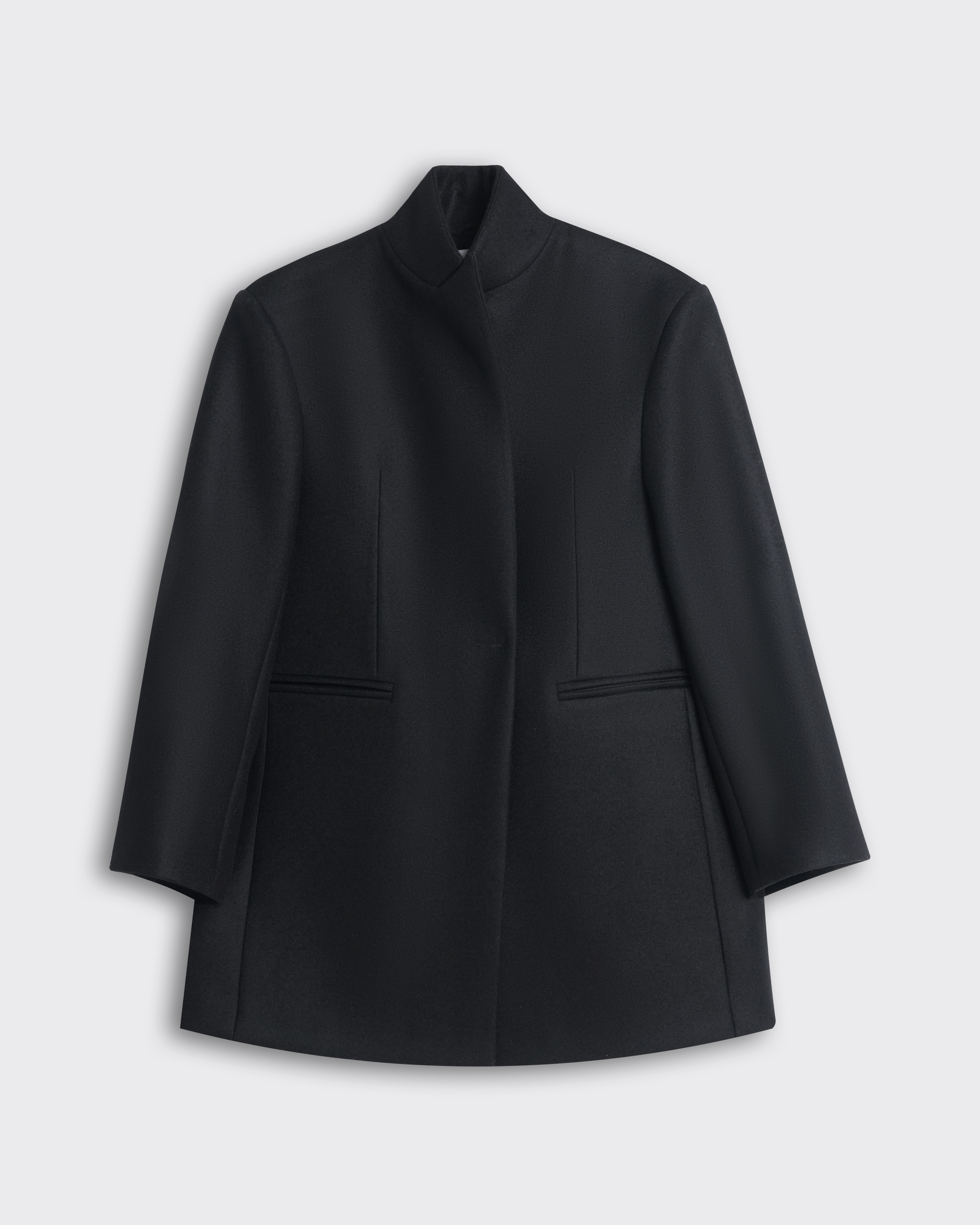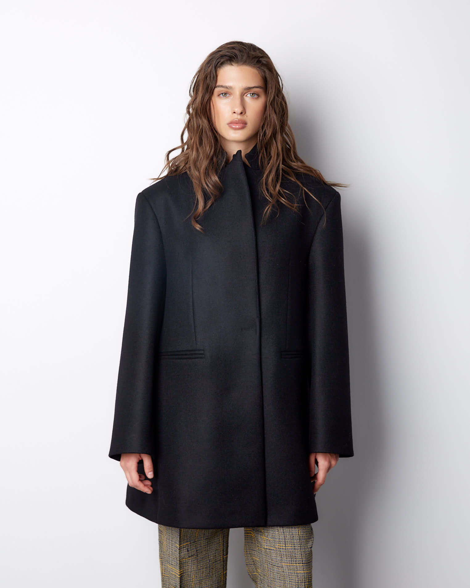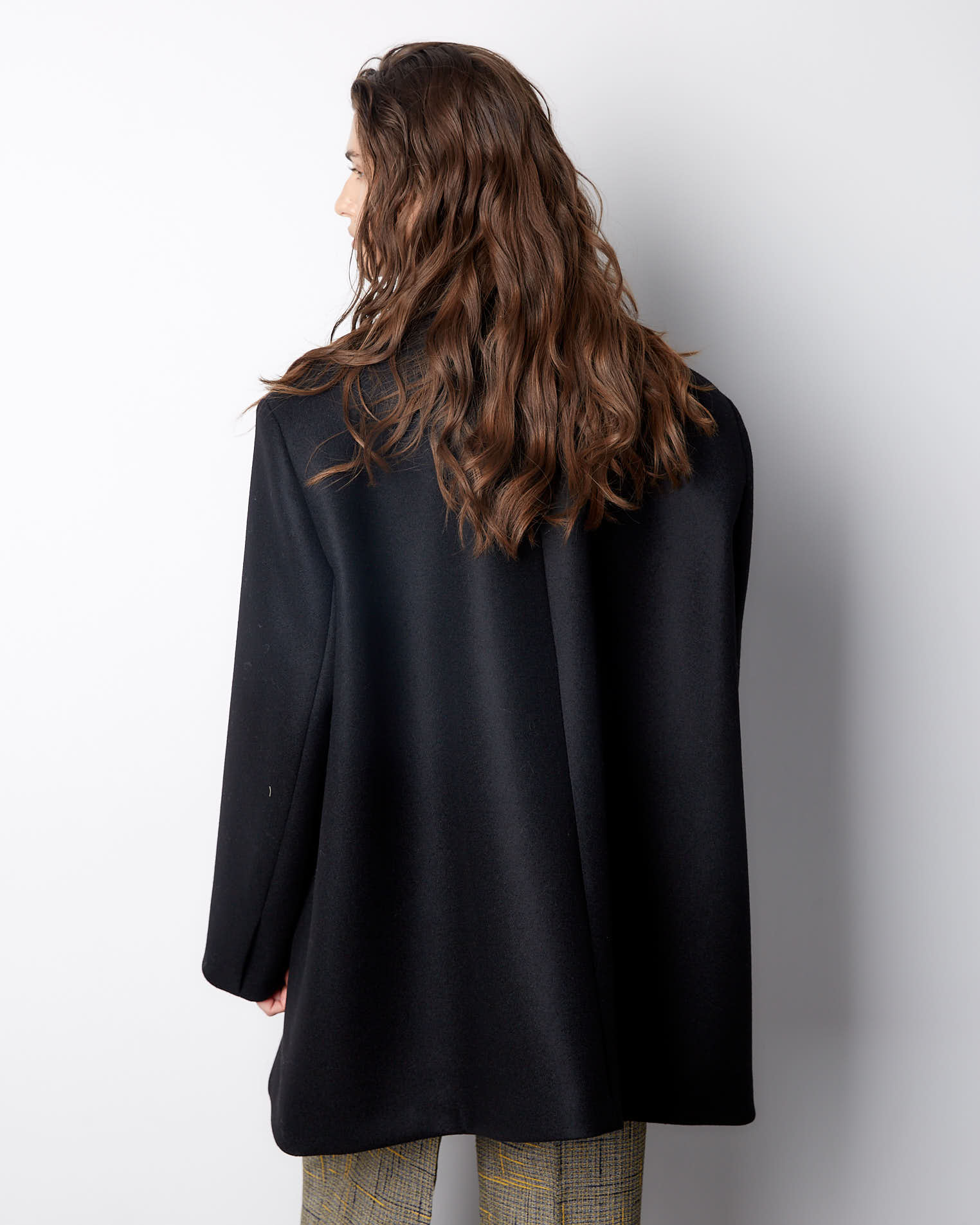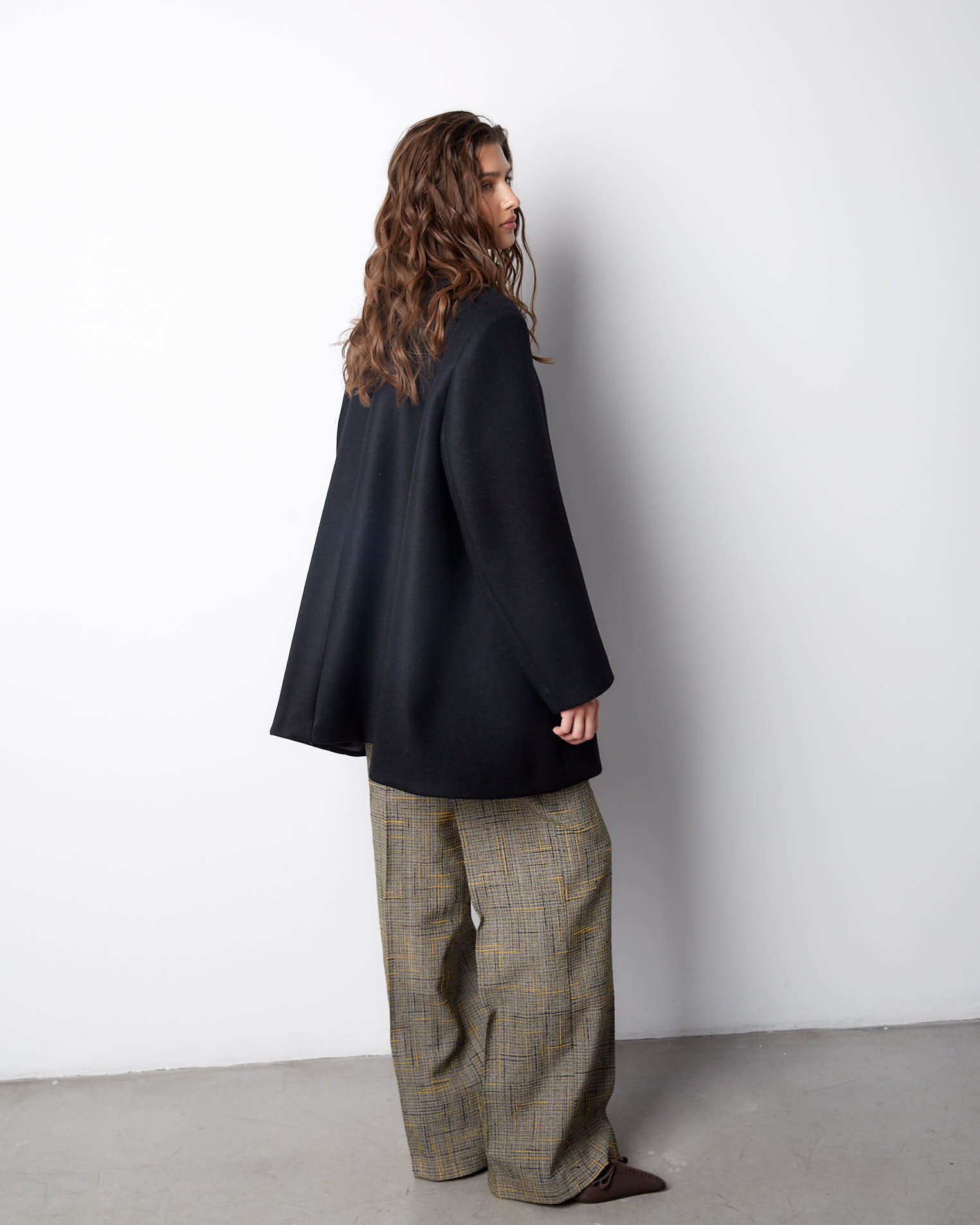 Модель с фигурным низом, передняя часть длиннее спинки на 10 см. Полочки созданы по принципу классического жакета, а спинка имеет большое расширение и закладывается фалдами. Рукав двухшовный, воротник-стойка, застежка на одну пришивную кнопку. Выметанная петля на передней полочке создает имитацию застежки.