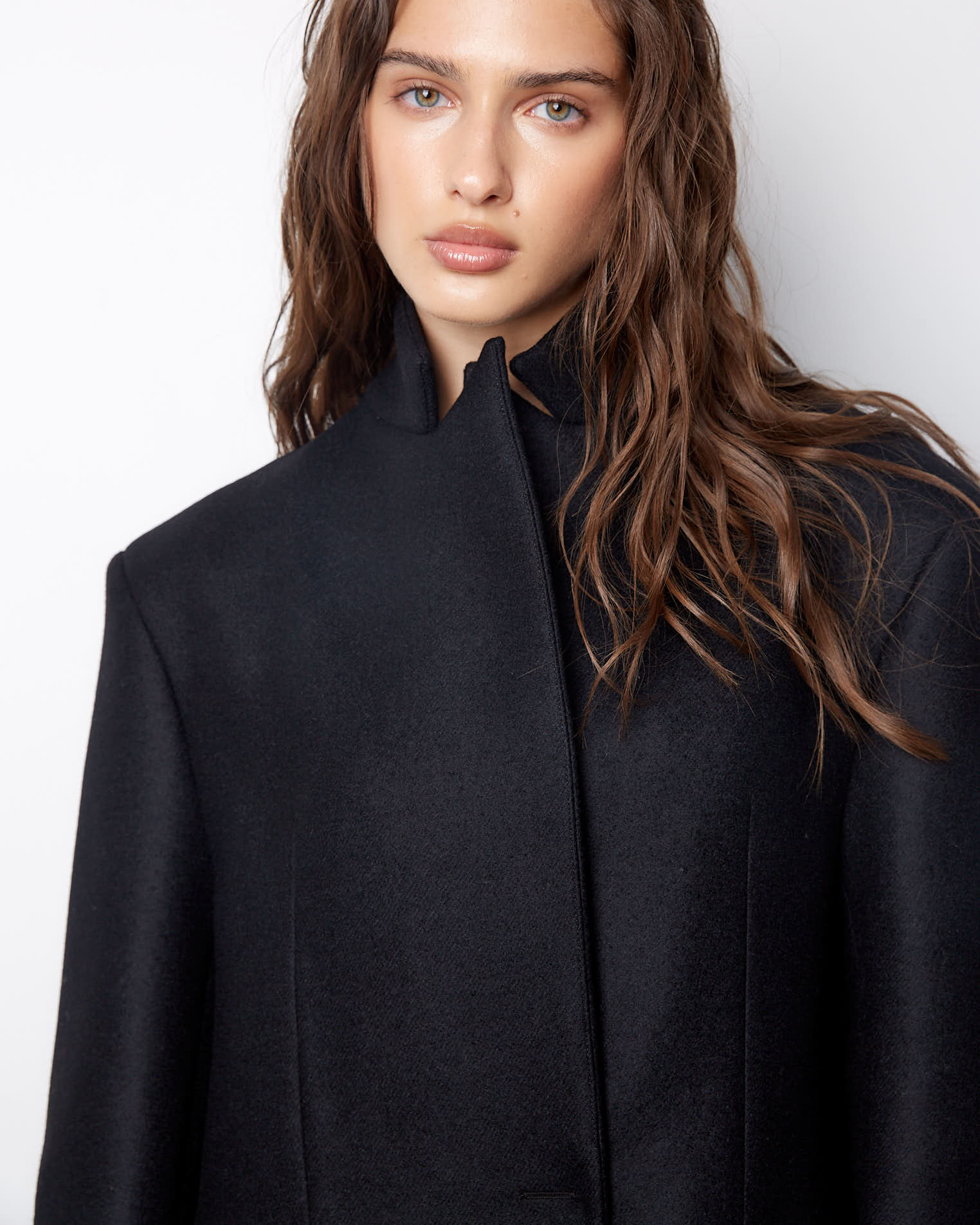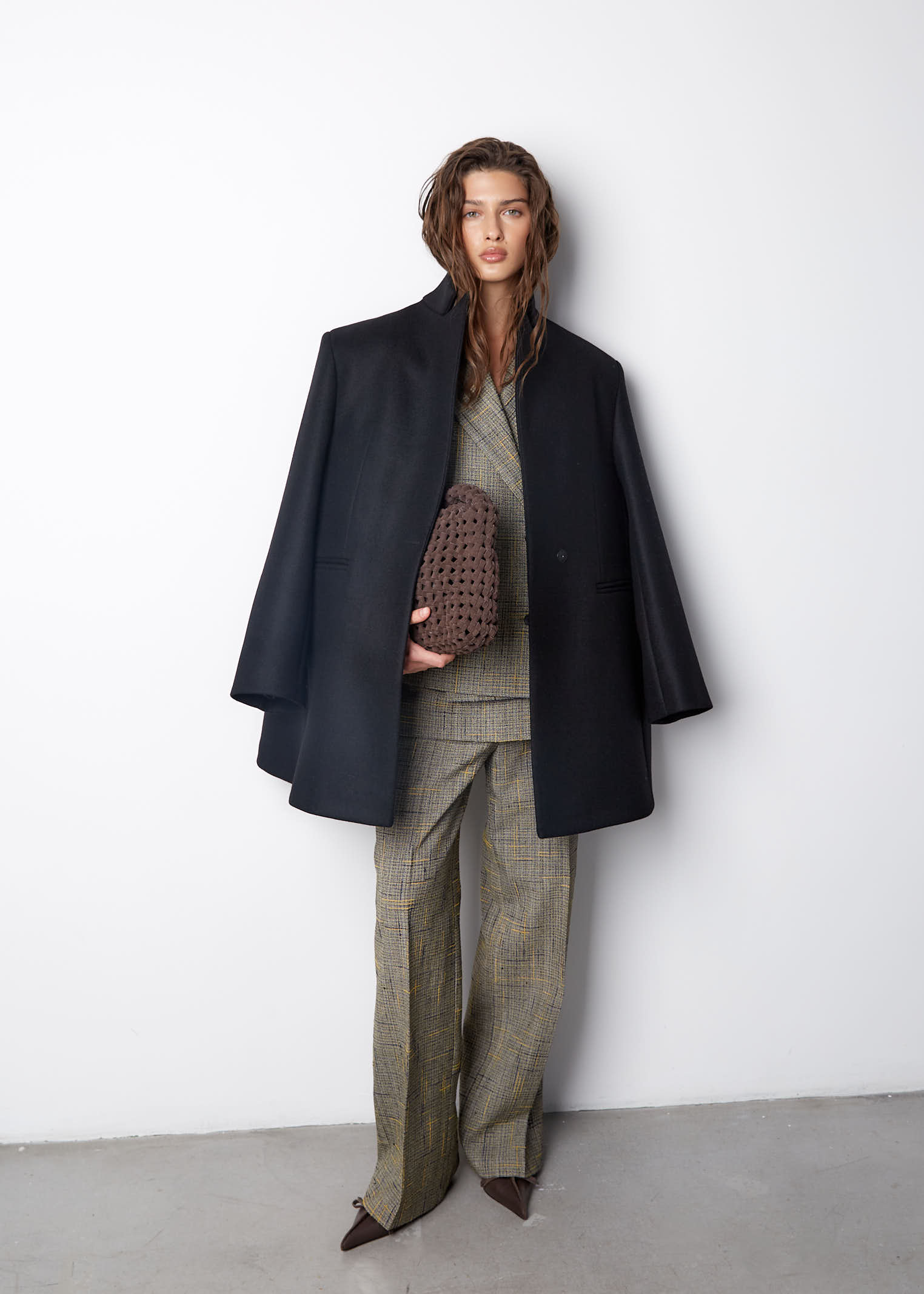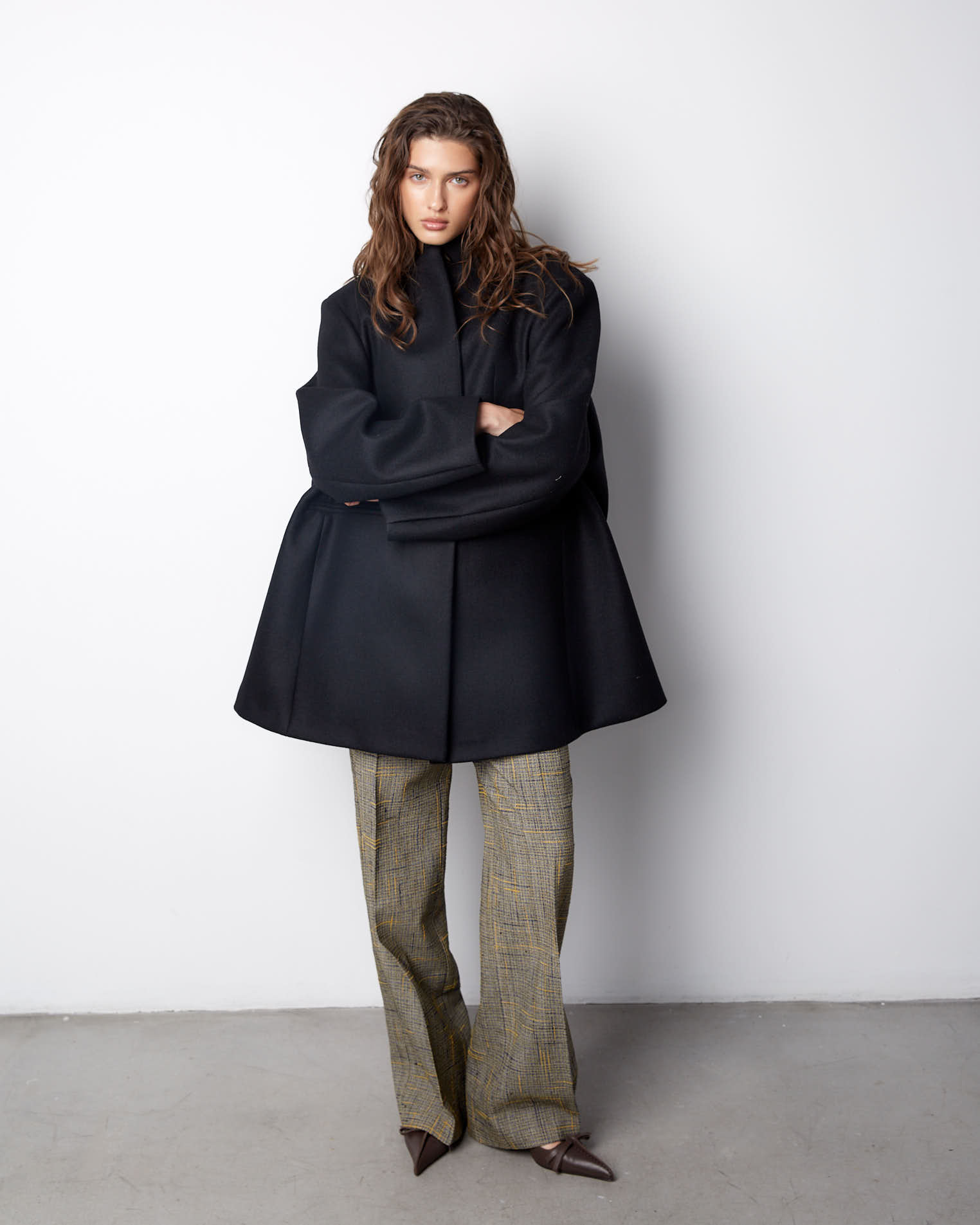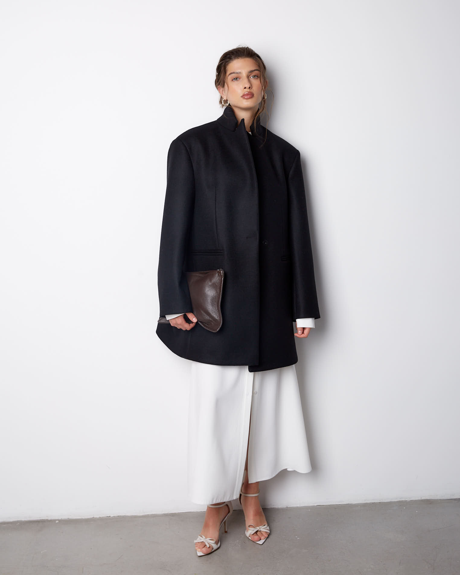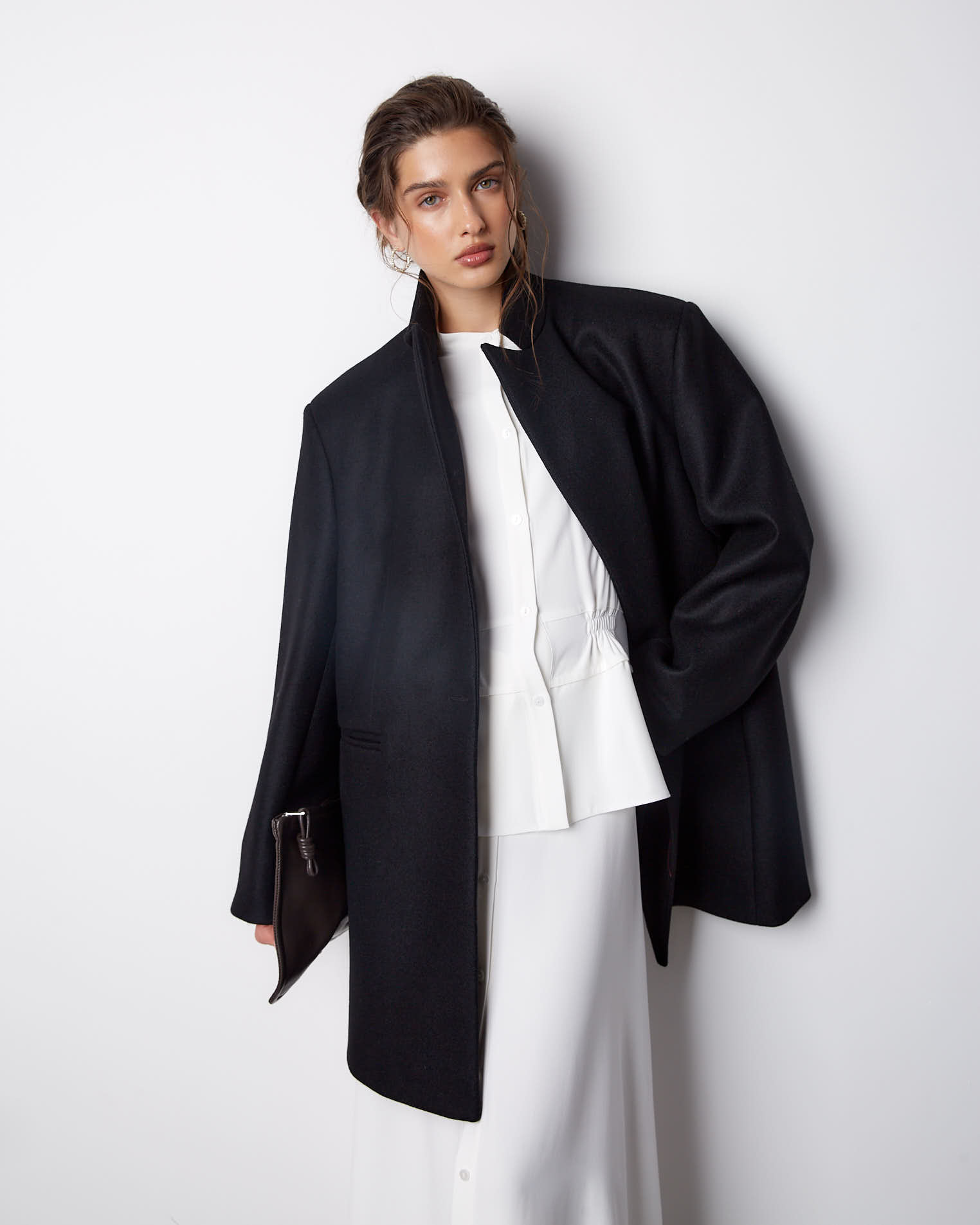 Модель с фигурным низом, передняя часть длиннее спинки на 10 см. Полочки созданы по принципу классического жакета, а спинка имеет большое расширение и закладывается фалдами. Рукав двухшовный, воротник-стойка, застежка на одну пришивную кнопку. Выметанная петля на передней полочке создает имитацию застежки.