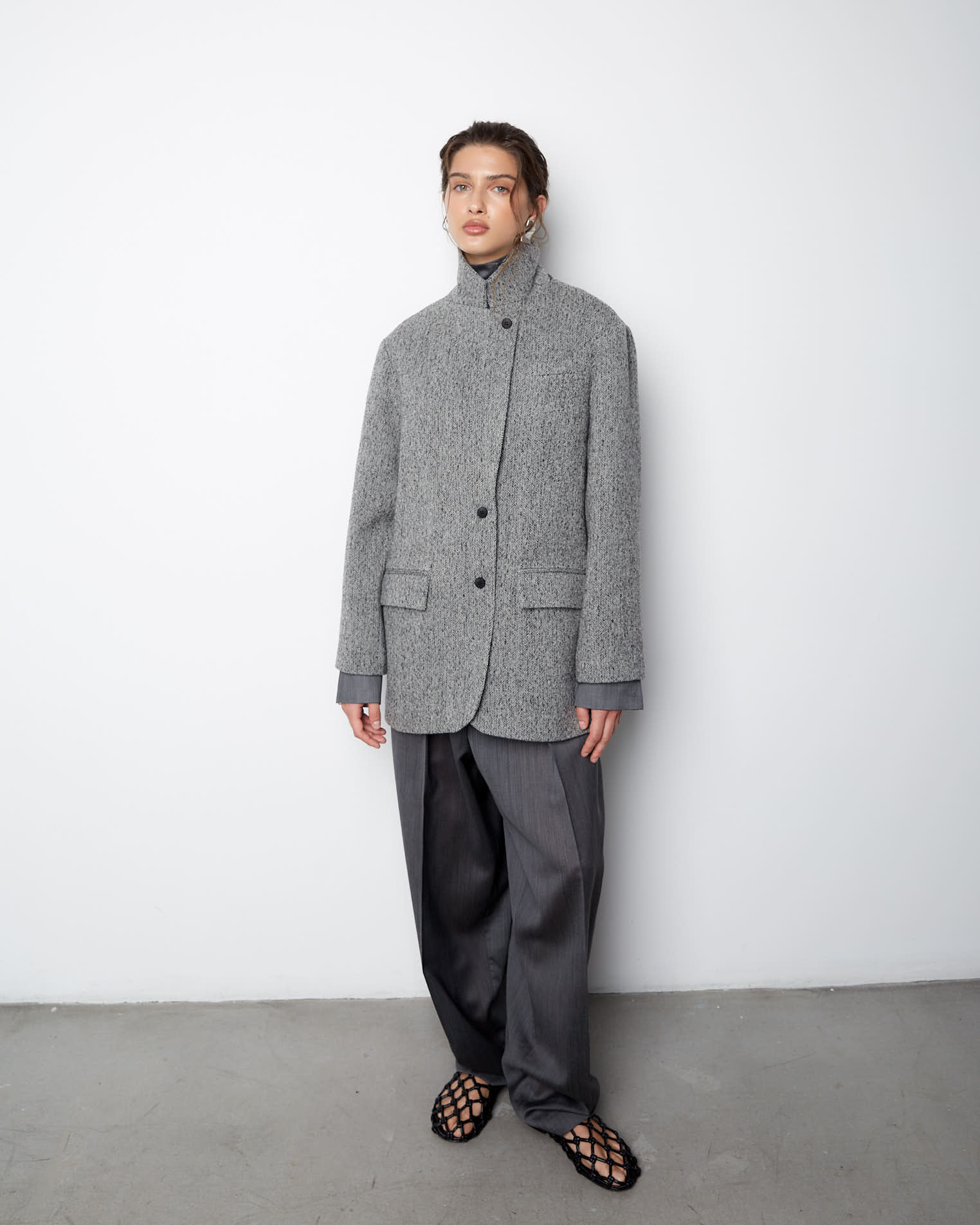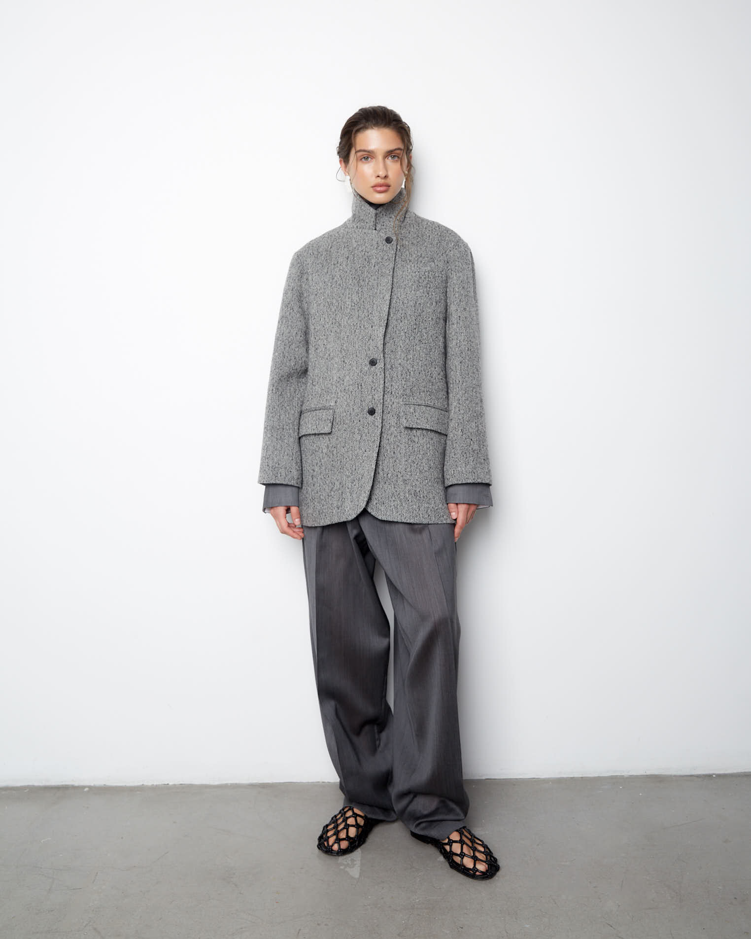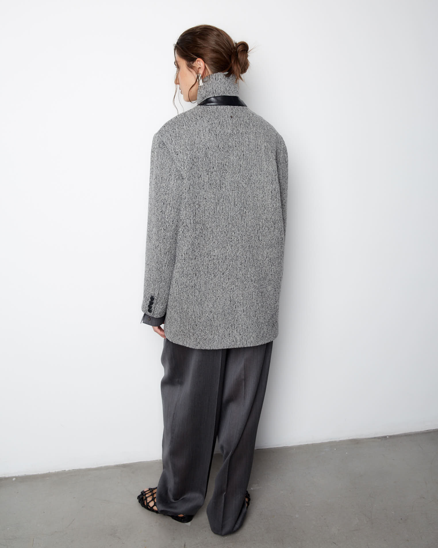 Пальто-жакет из нашей новой коллекции по праву можно назвать базовой моделью пиджака. Изделие прямого силуэта выполнено в классическом стиле, карманы-клапаны, округлые края борта, английский воротник, двухшовный рукав. Застежка на две пуговицы, на рукавах же предусмотрено по четыре пуговицы. Особенностью модели является кожаная стойка на воротнике сзади.