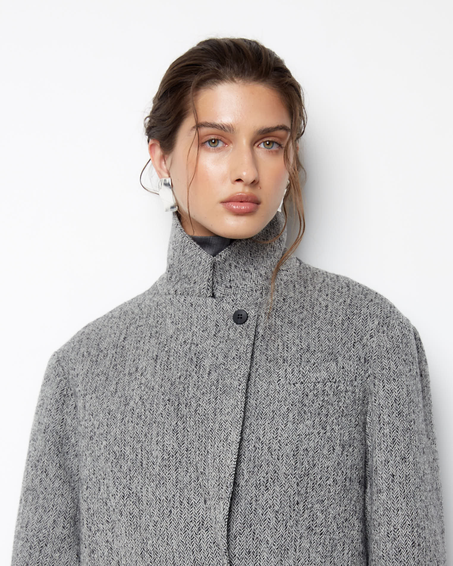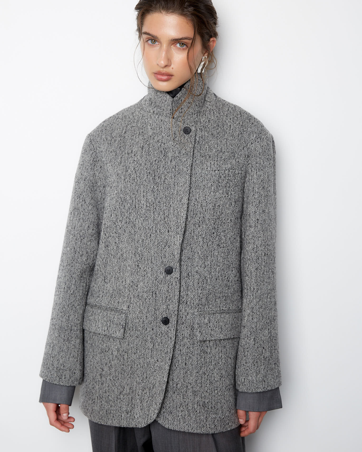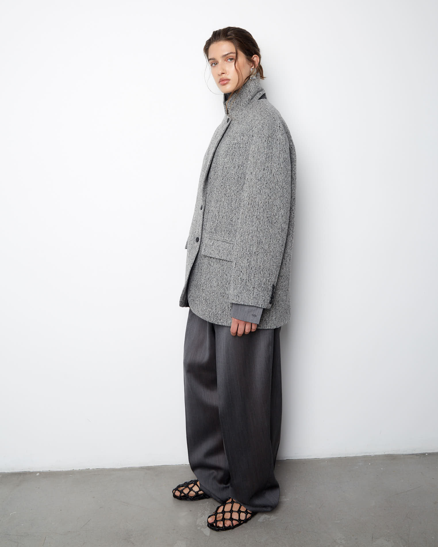 Пальто-жакет из нашей новой коллекции по праву можно назвать базовой моделью пиджака. Изделие прямого силуэта выполнено в классическом стиле, карманы-клапаны, округлые края борта, английский воротник, двухшовный рукав. Застежка на две пуговицы, на рукавах же предусмотрено по четыре пуговицы. Особенностью модели является кожаная стойка на воротнике сзади.