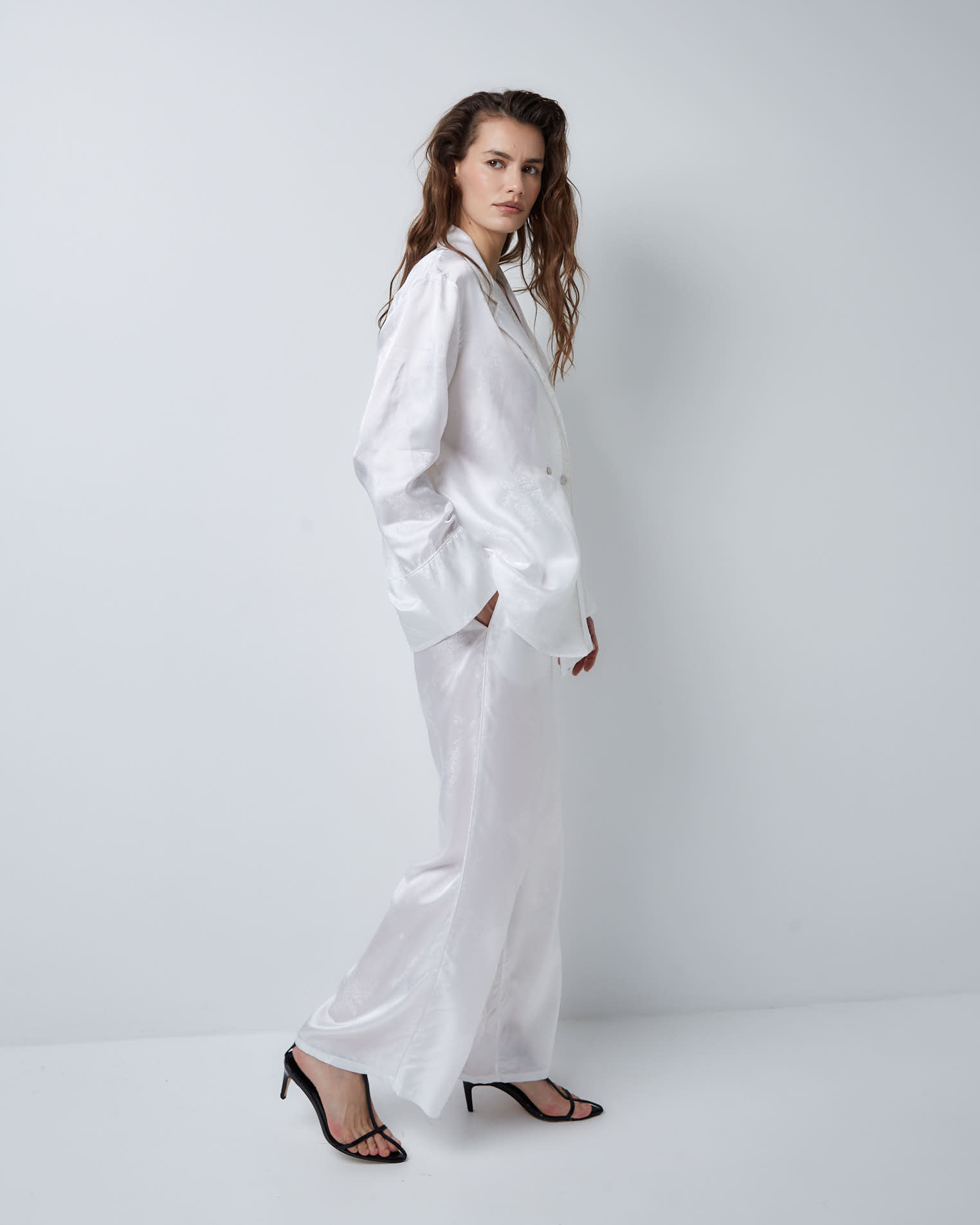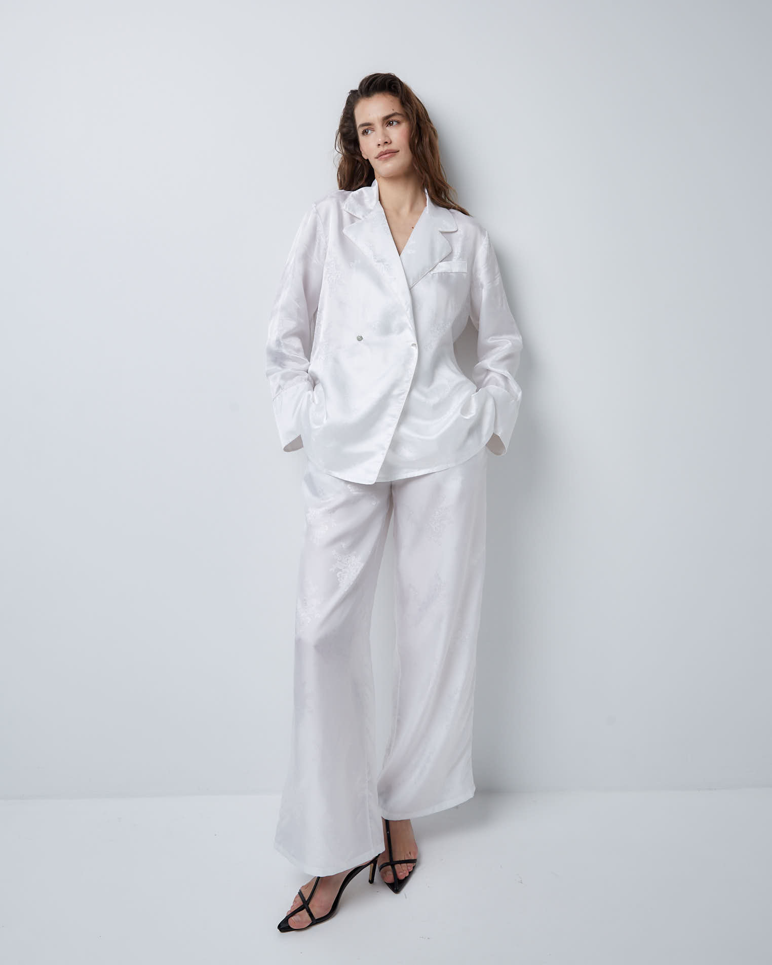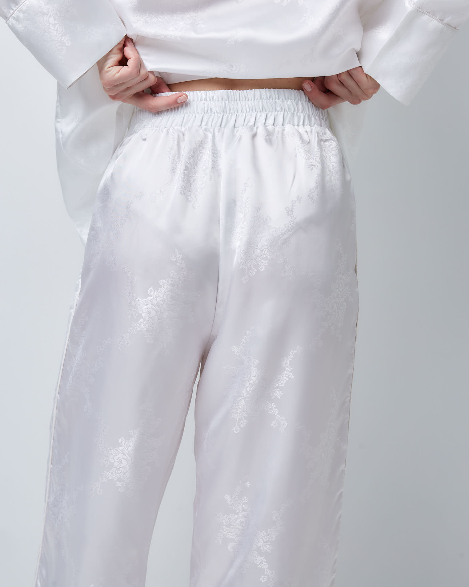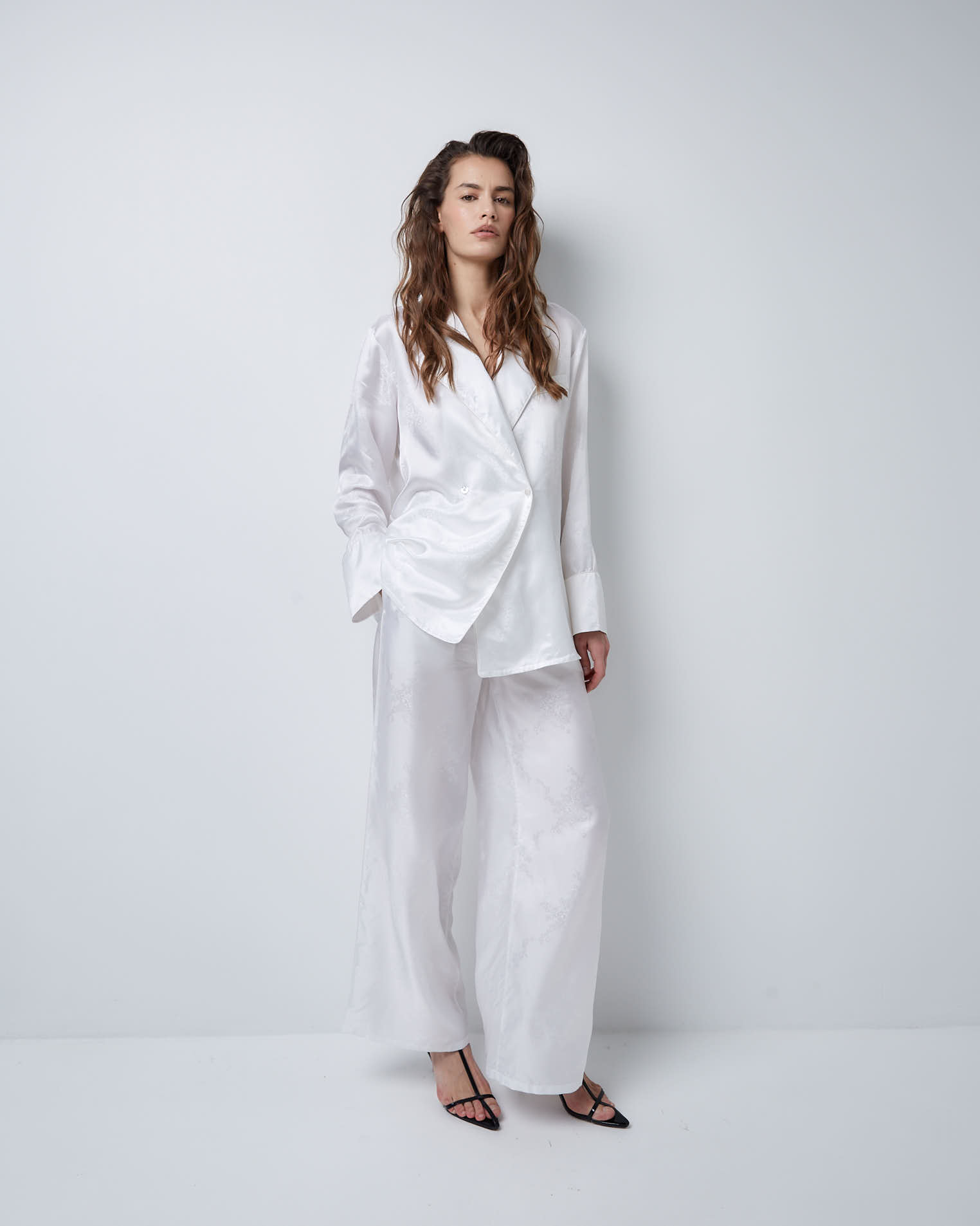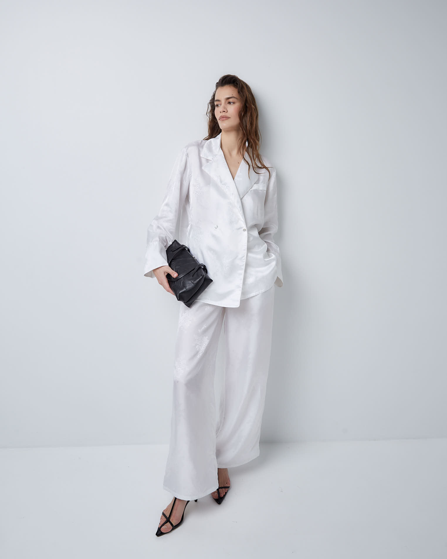 В комплекте классического белого оттенка прочитываются оригинальность и самодостаточность, а за удобство отвечают прямой и свободный крой. Модель понравится тем девушкам, которые ценят не только функциональность и комфорт, но и необычность дизайна. Акцентом изделия послужит узор в виде цветов.