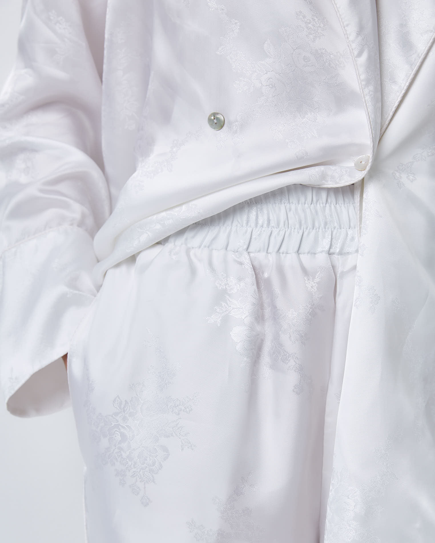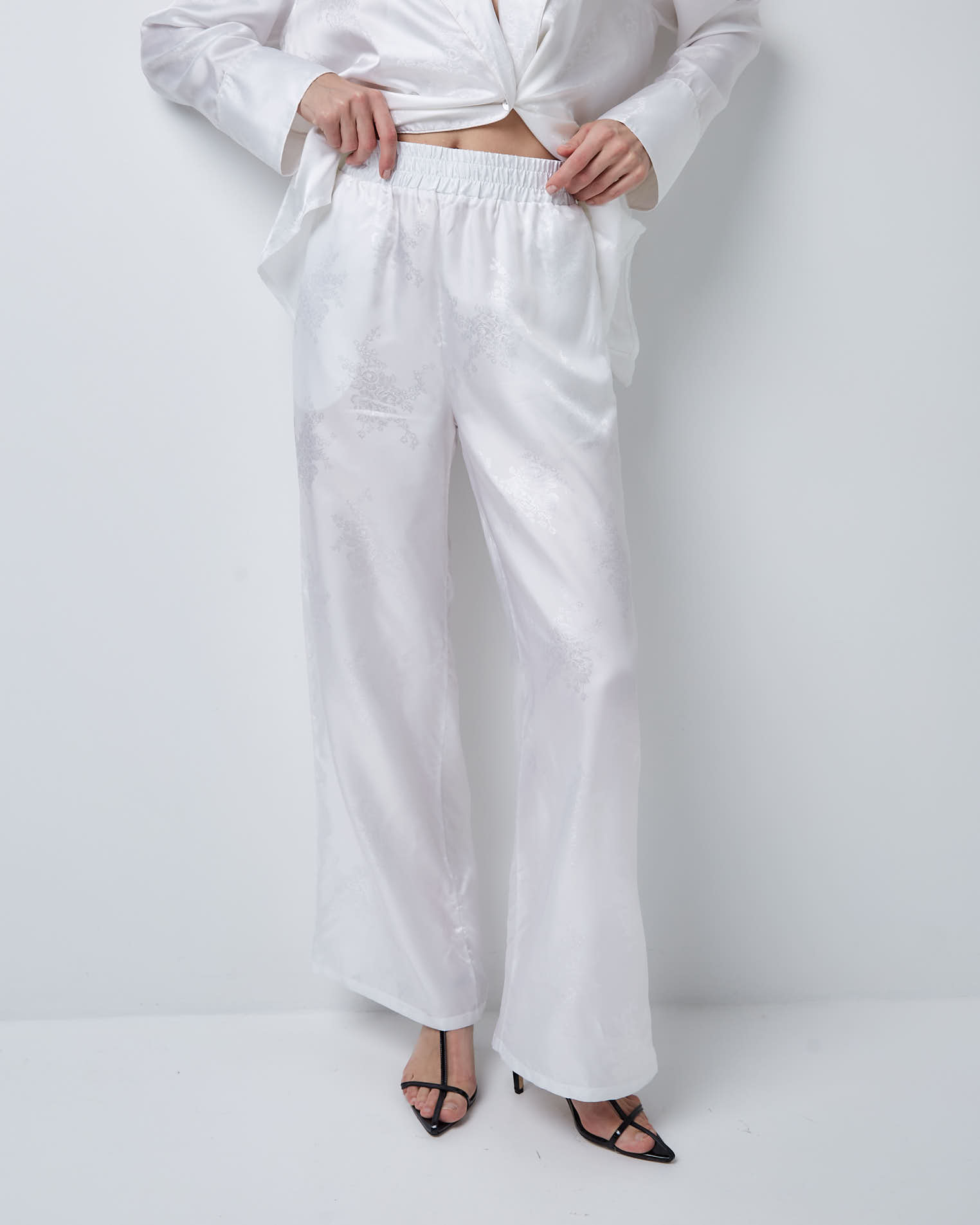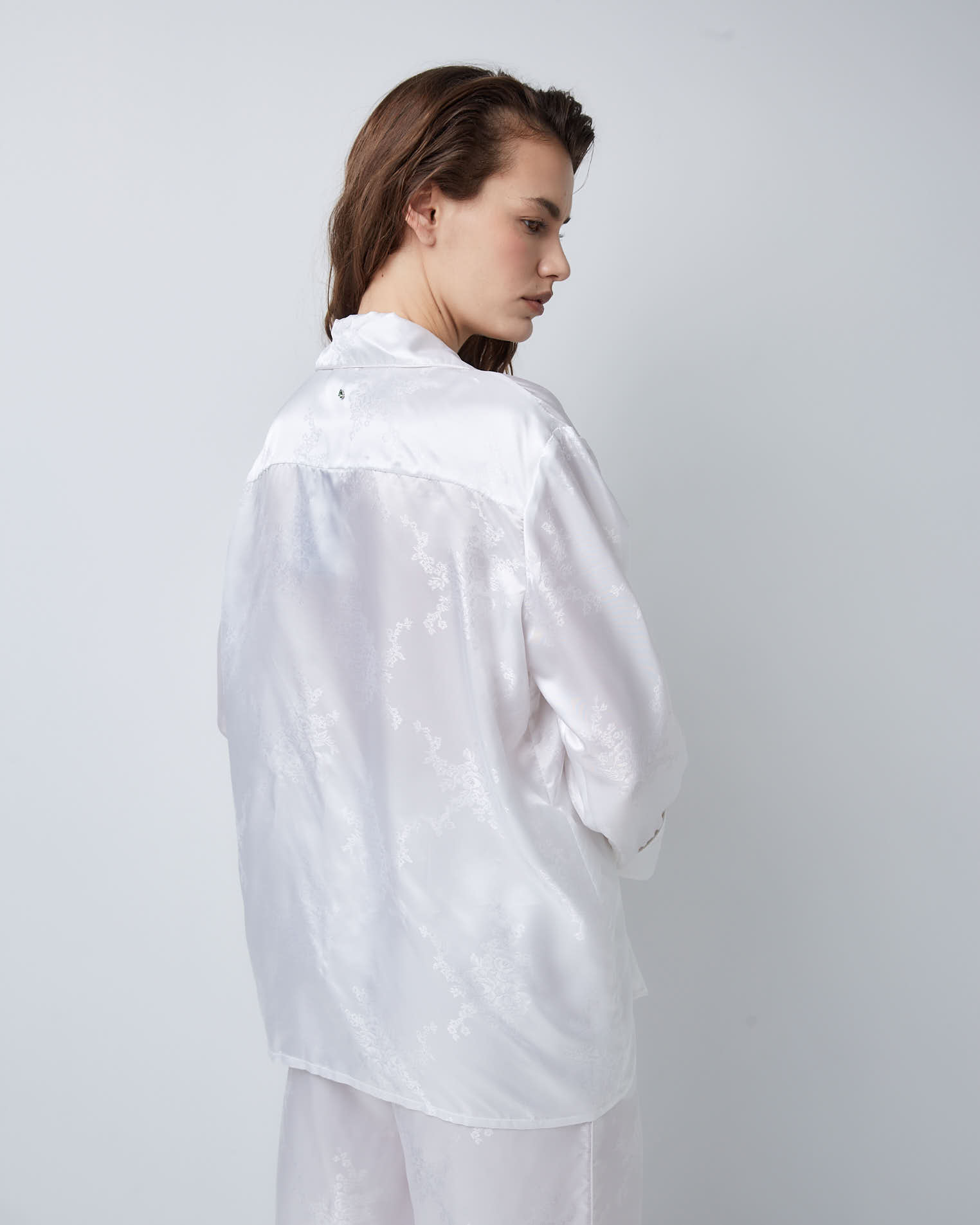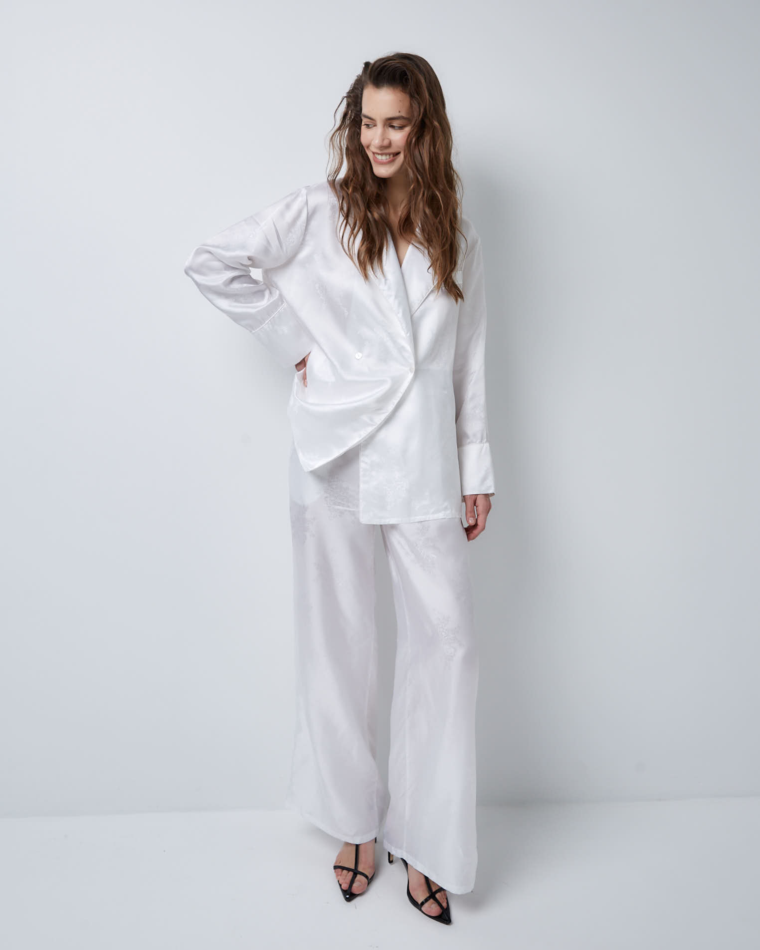 В комплекте классического белого оттенка прочитываются оригинальность и самодостаточность, а за удобство отвечают прямой и свободный крой. Модель понравится тем девушкам, которые ценят не только функциональность и комфорт, но и необычность дизайна. Акцентом изделия послужит узор в виде цветов.