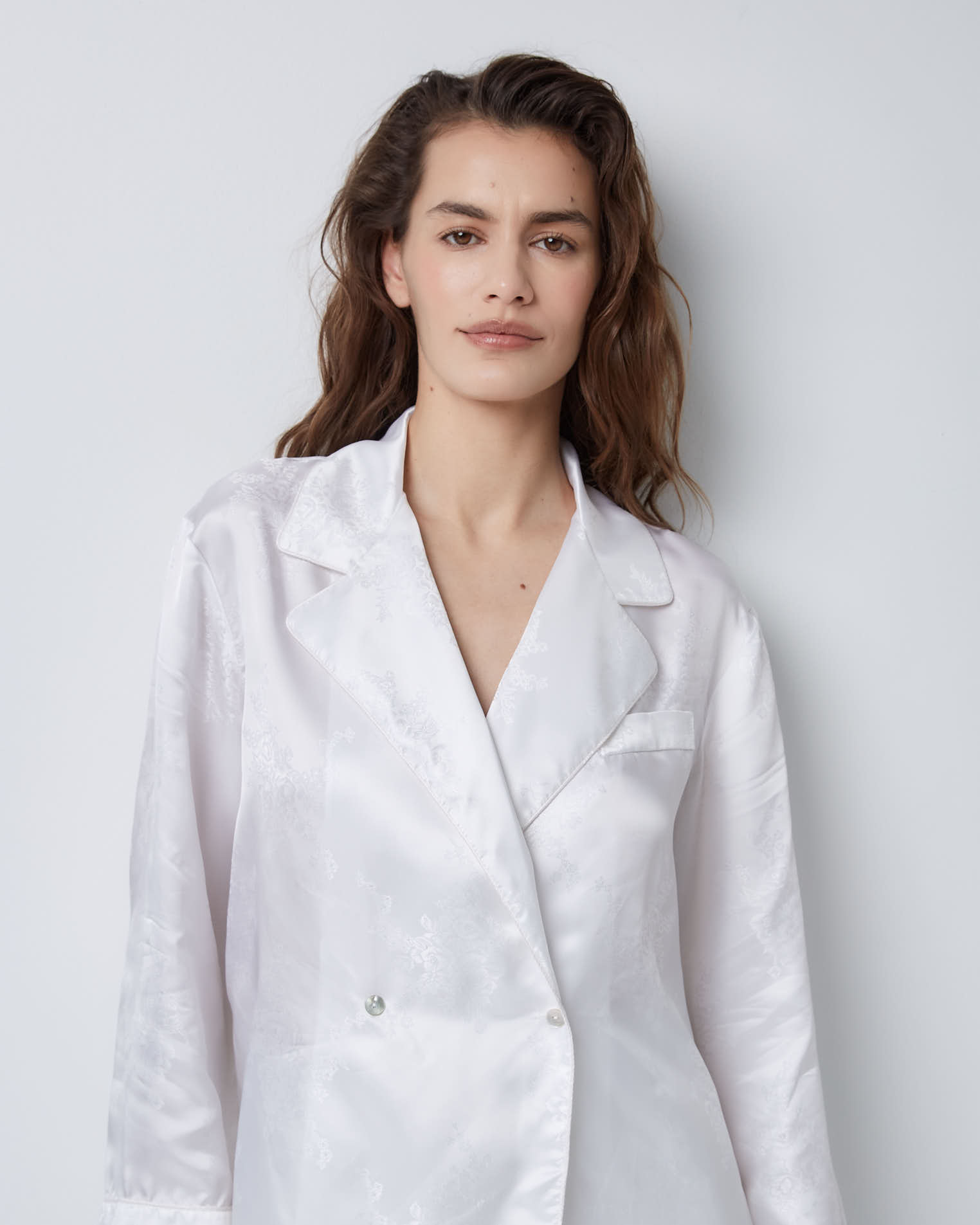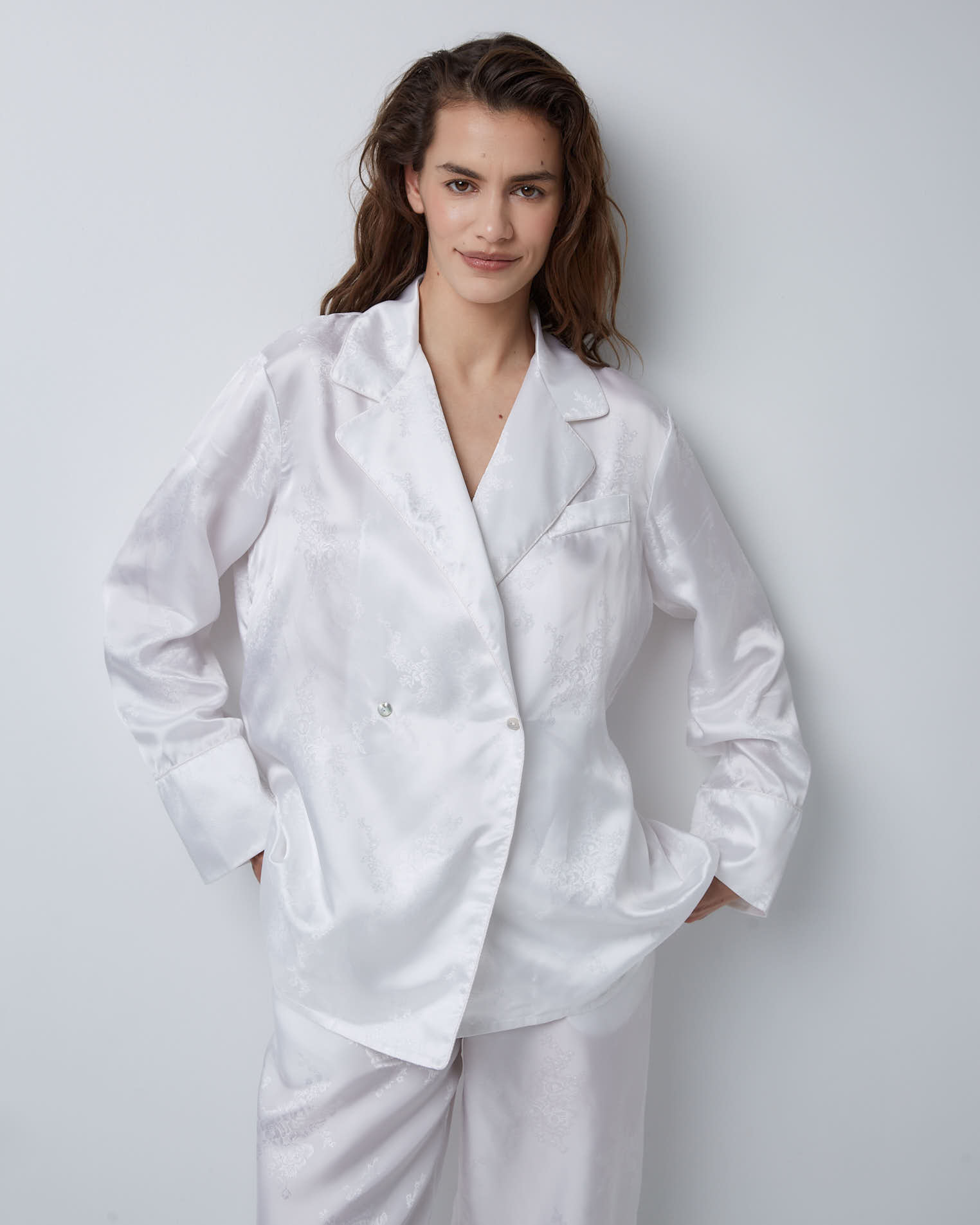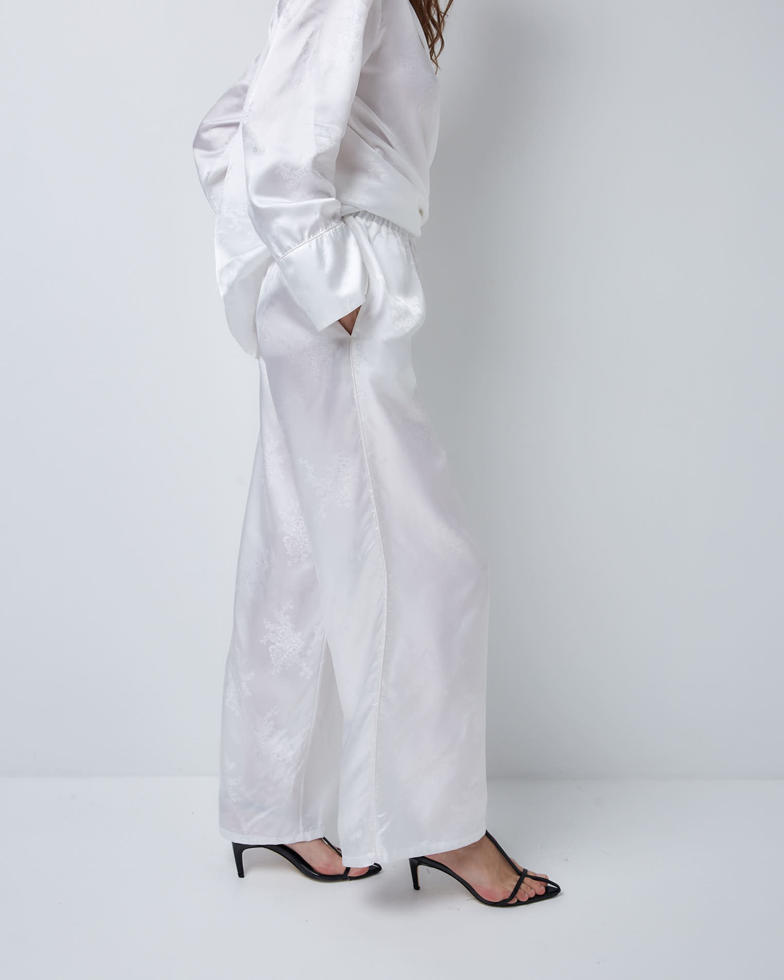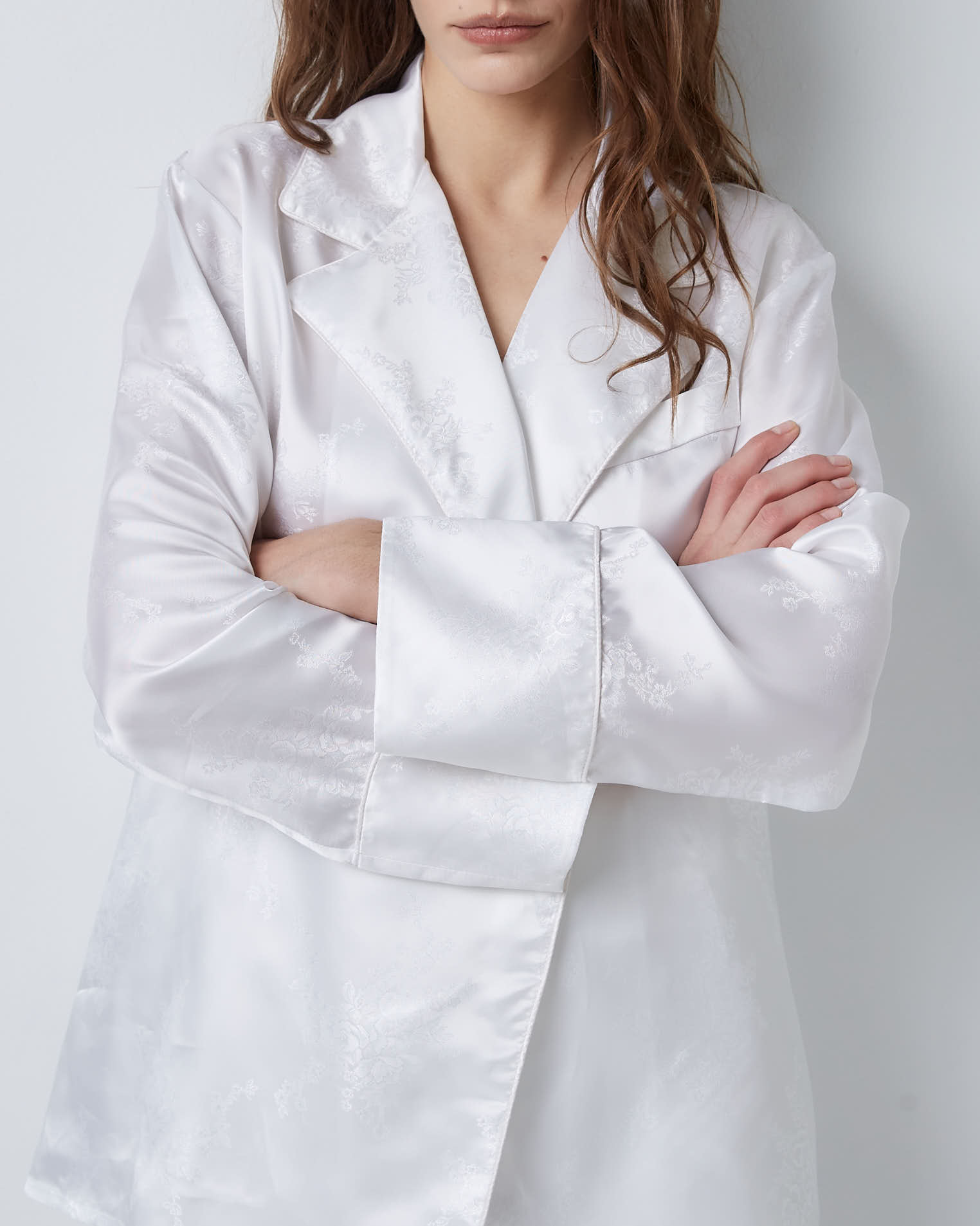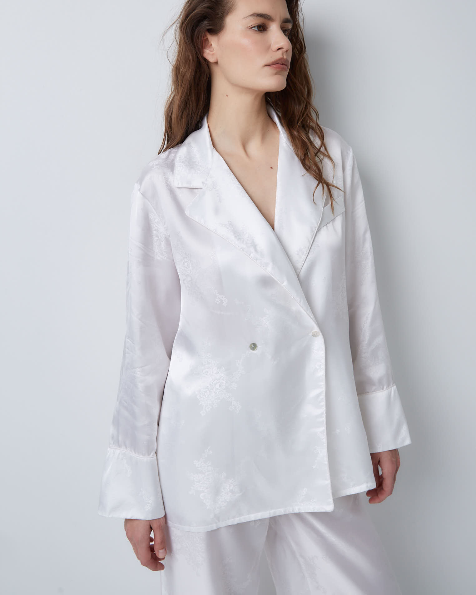В комплекте классического белого оттенка прочитываются оригинальность и самодостаточность, а за удобство отвечают прямой и свободный крой. Модель понравится тем девушкам, которые ценят не только функциональность и комфорт, но и необычность дизайна. Акцентом изделия послужит узор в виде цветов.