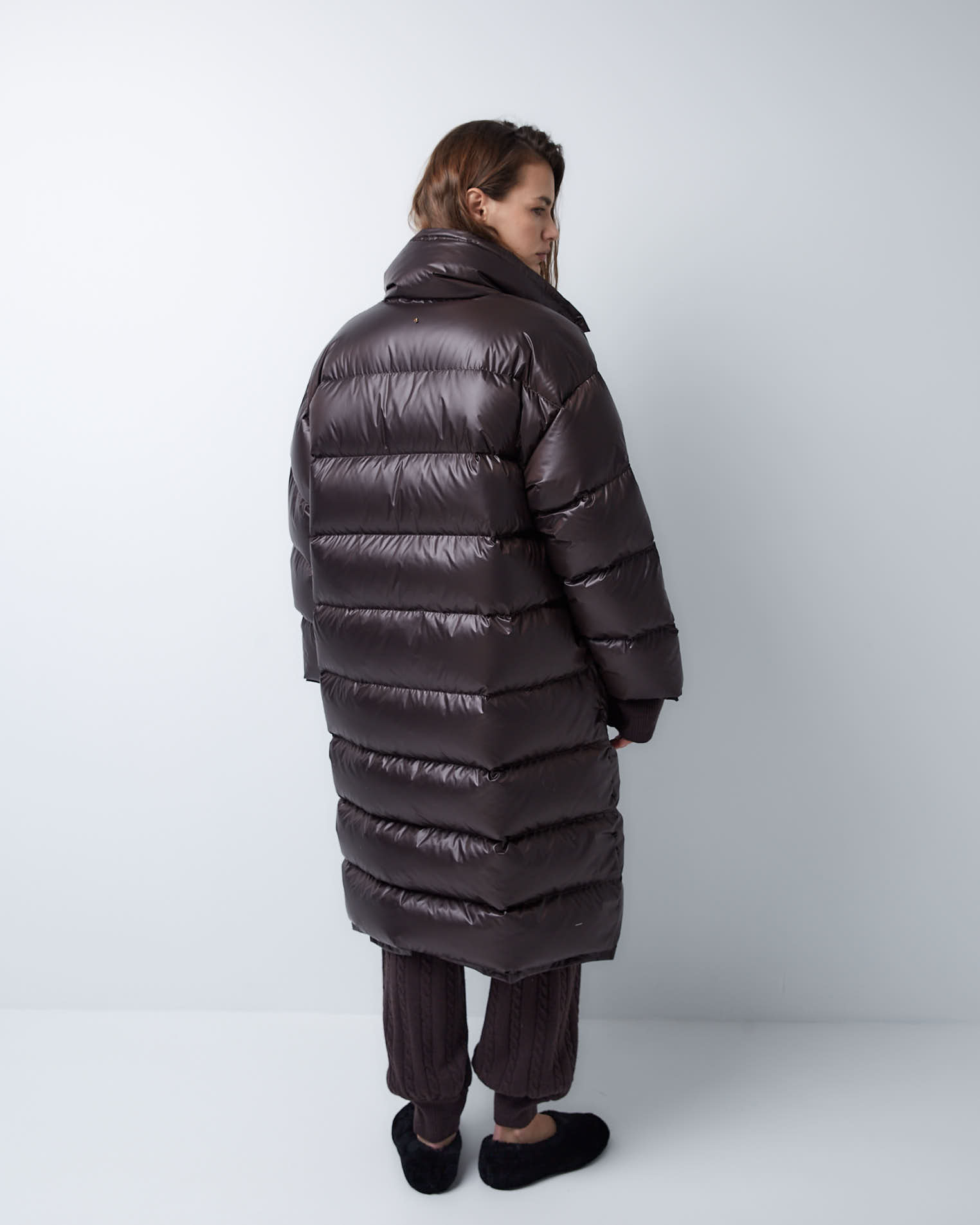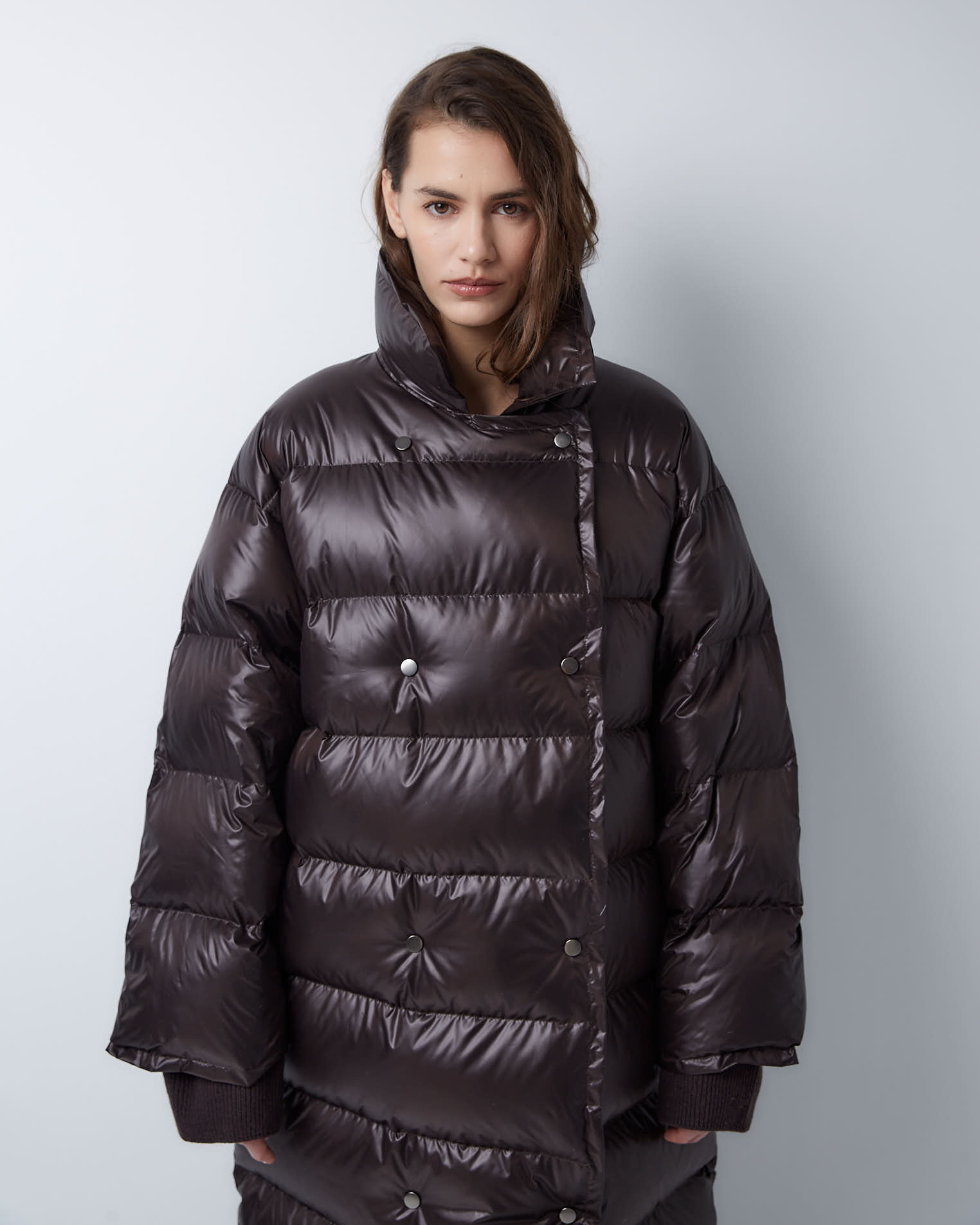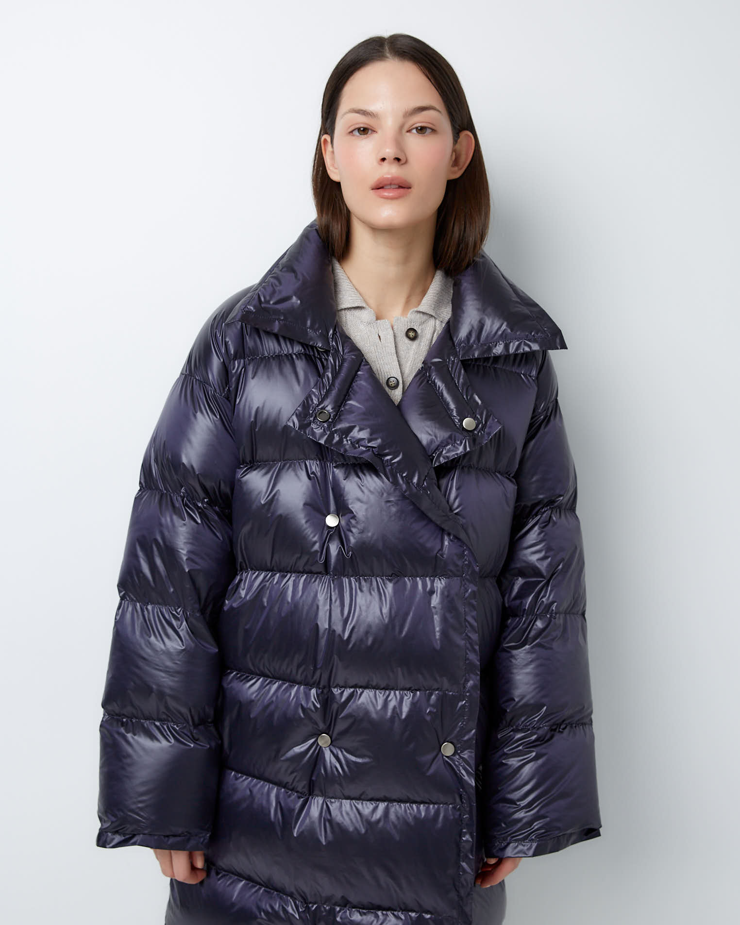 Изделие прямого силуэта, спущенный рукав, воротник с универсальной горловиной - пуховик можно носить отогнув края бортов и получить пиджачный тип, а можно наглухо закрыть горловину и поднять воротник. Застёжка на кнопки, карманы в боковых швах.