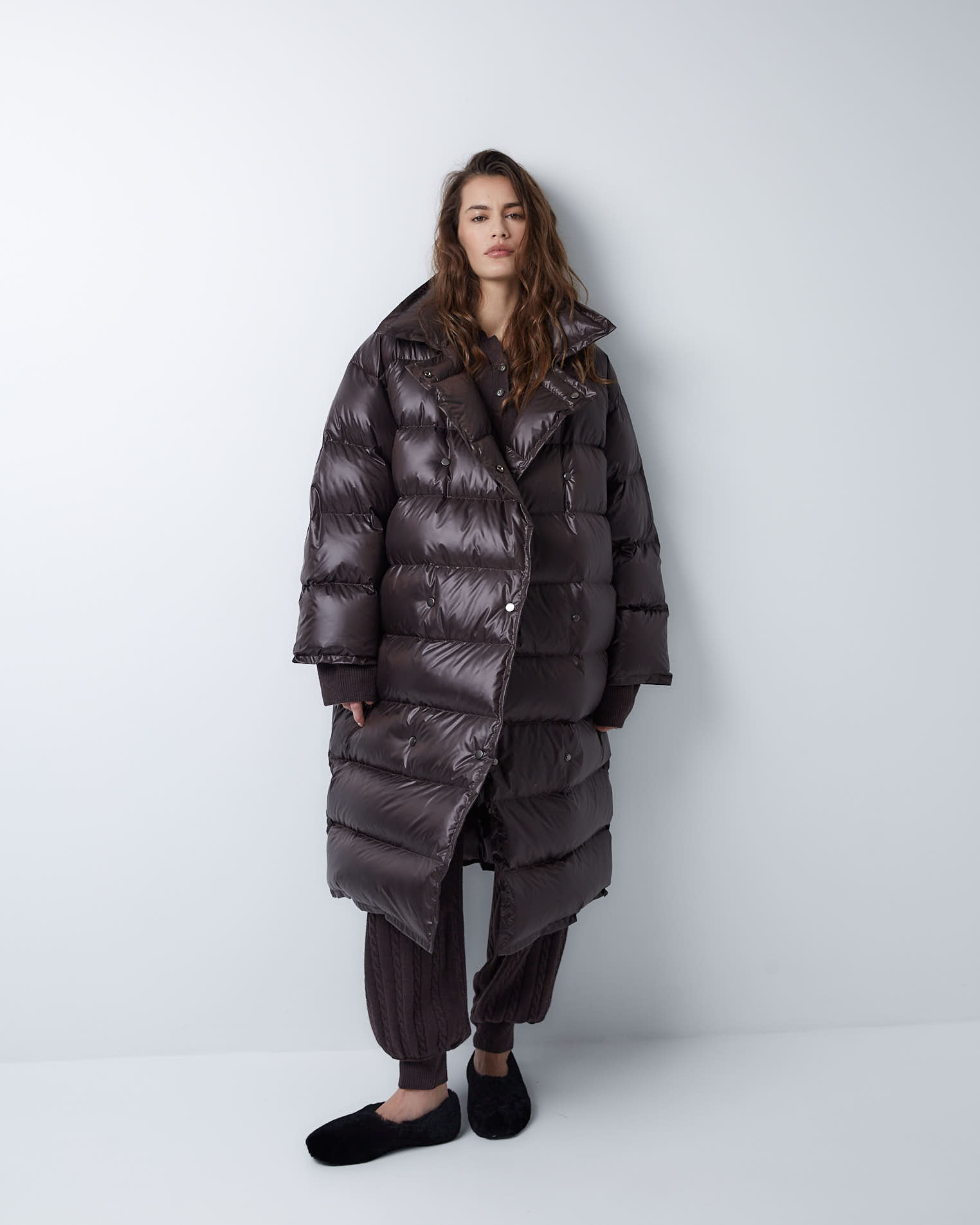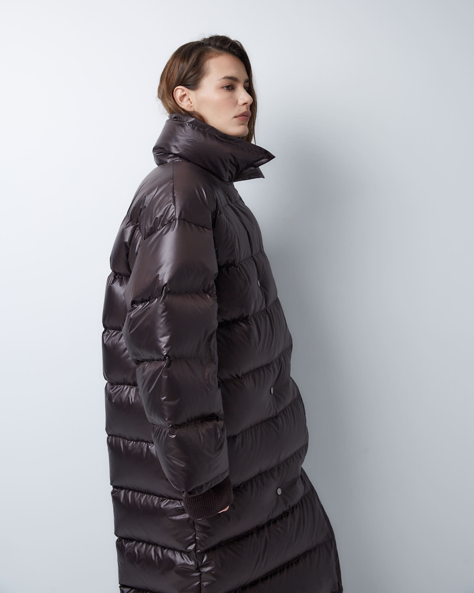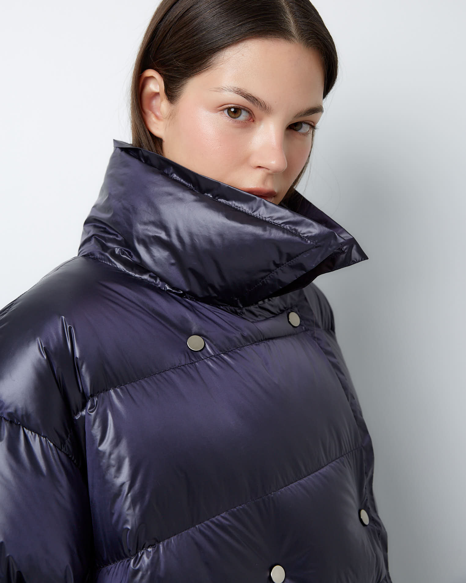 Изделие прямого силуэта, спущенный рукав, воротник с универсальной горловиной - пуховик можно носить отогнув края бортов и получить пиджачный тип, а можно наглухо закрыть горловину и поднять воротник. Застёжка на кнопки, карманы в боковых швах.