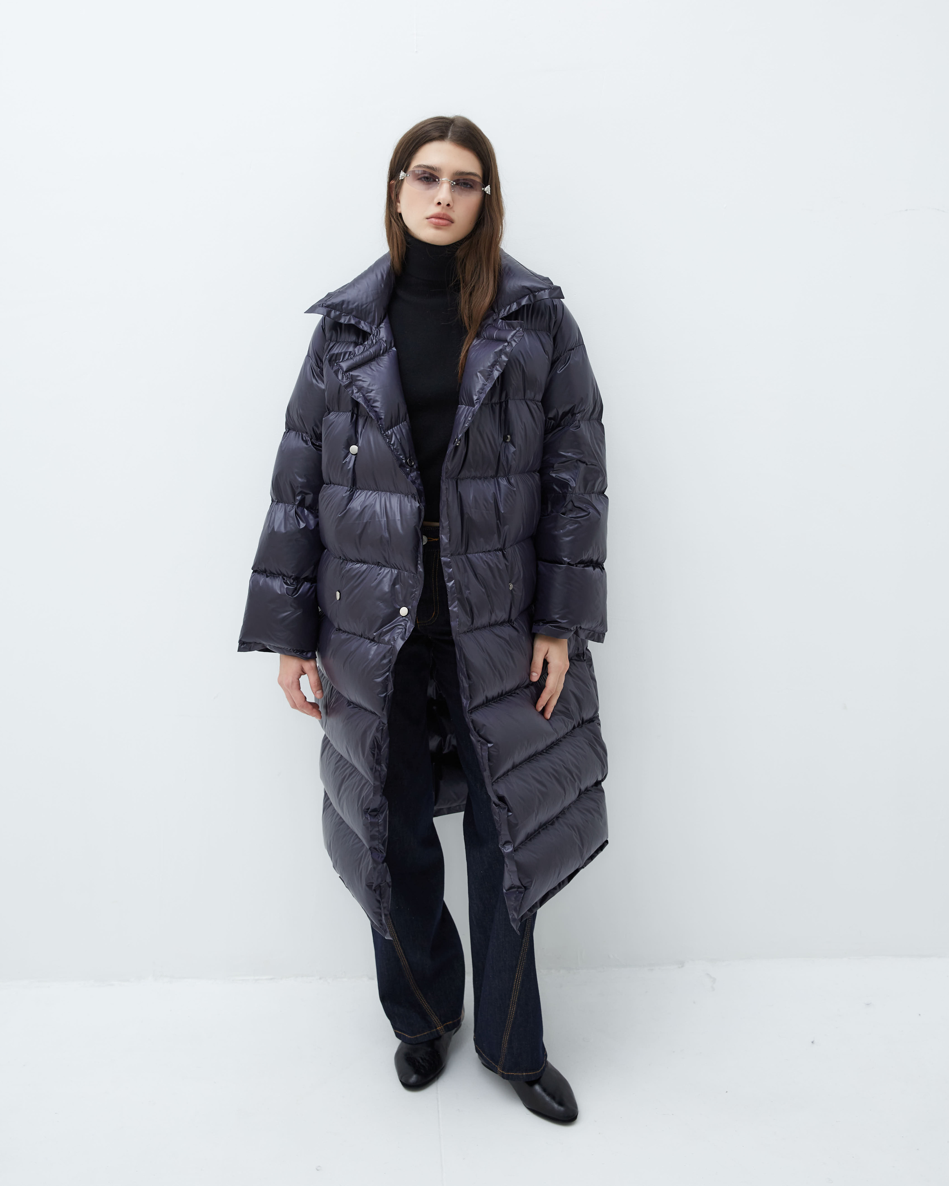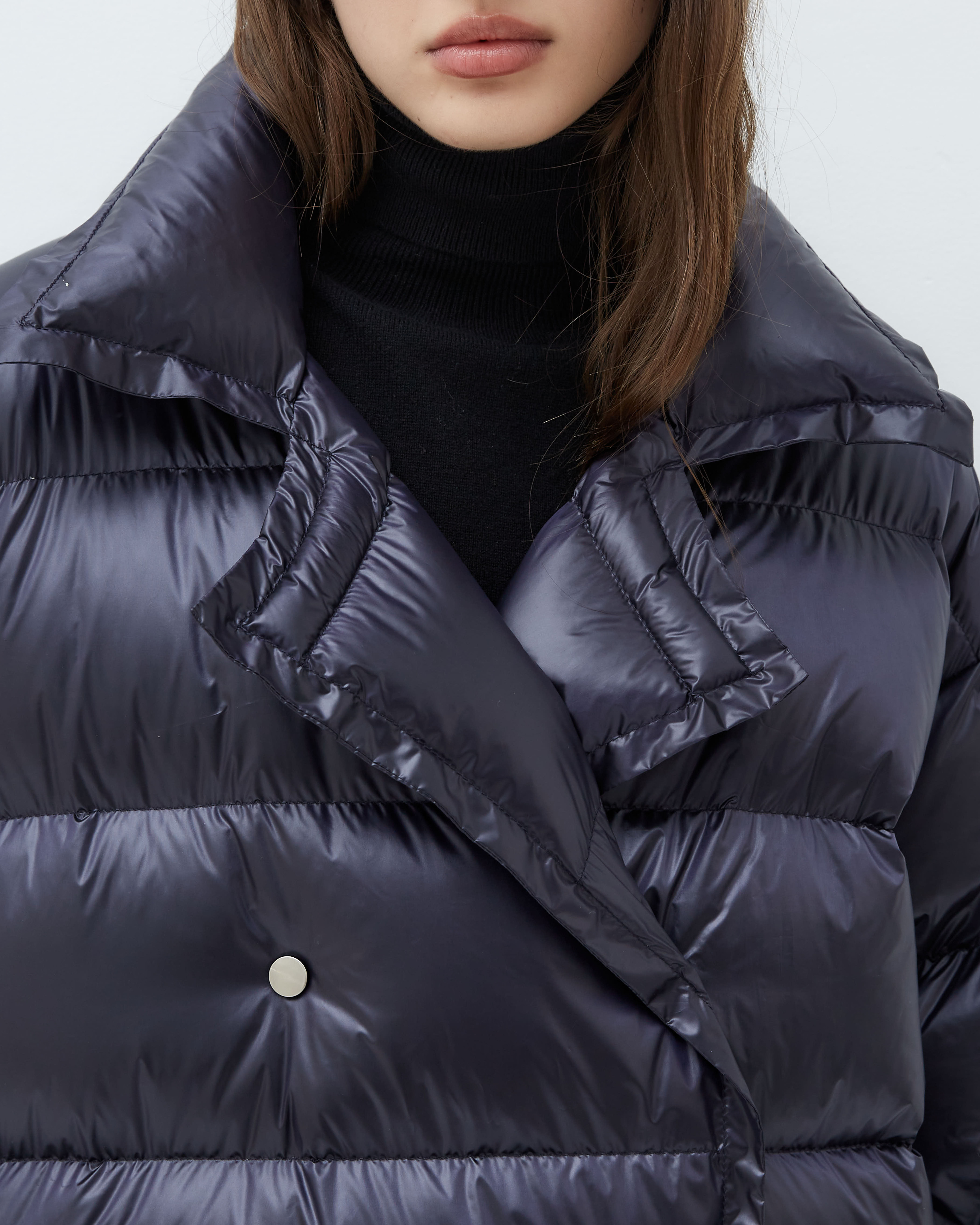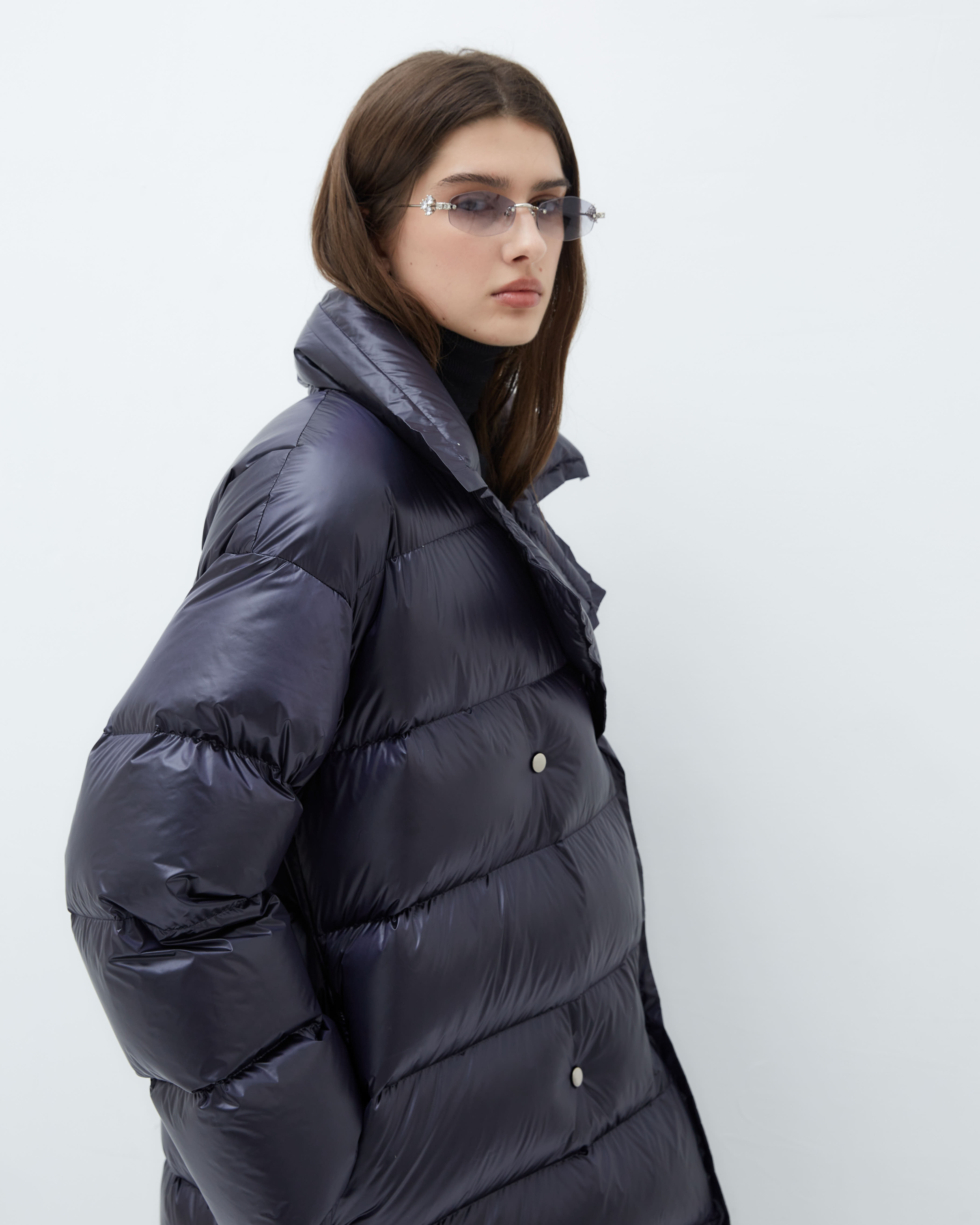 Изделие прямого силуэта, спущенный рукав, воротник с универсальной горловиной - пуховик можно носить отогнув края бортов и получить пиджачный тип, а можно наглухо закрыть горловину и поднять воротник. Застёжка на кнопки, карманы в боковых швах.