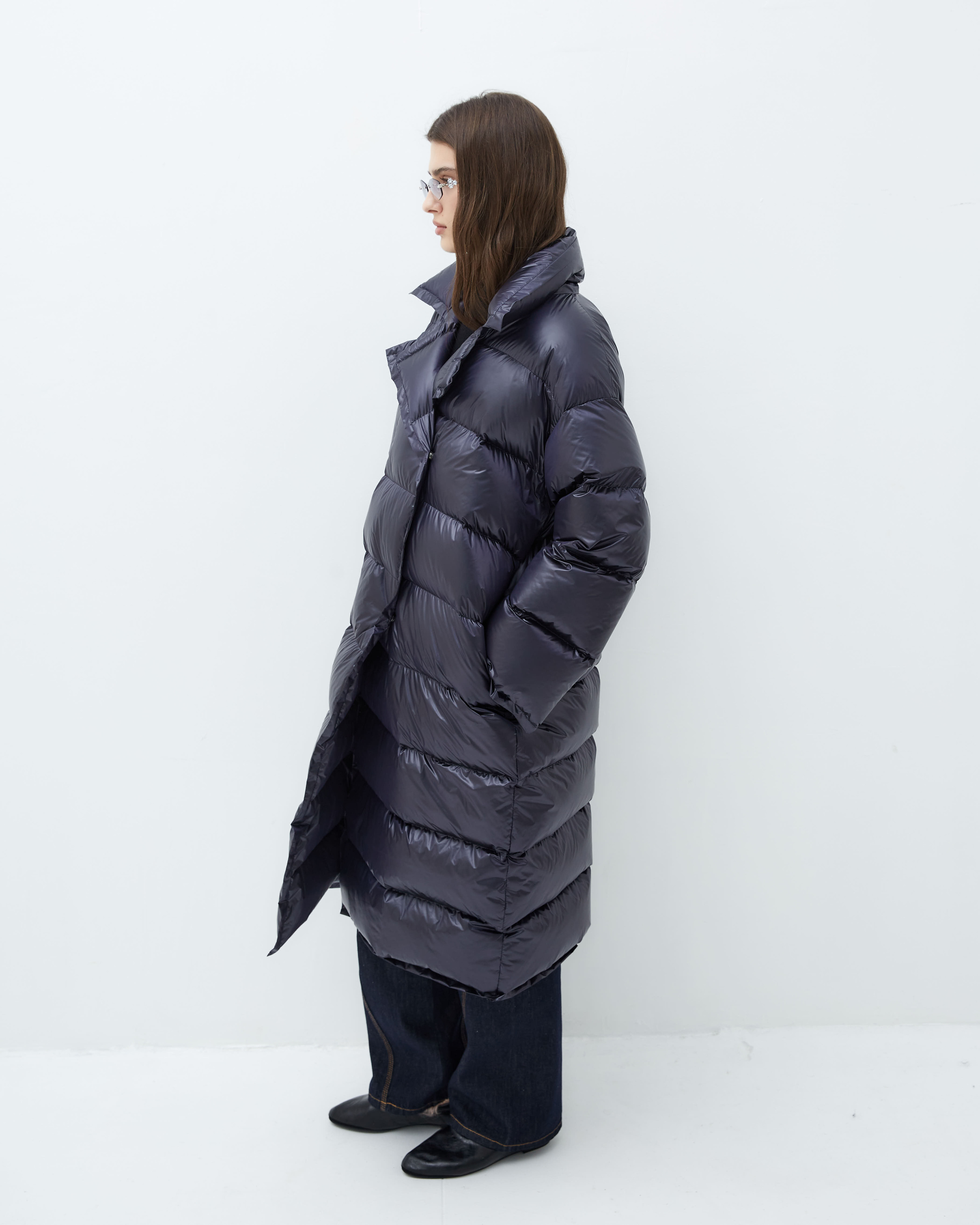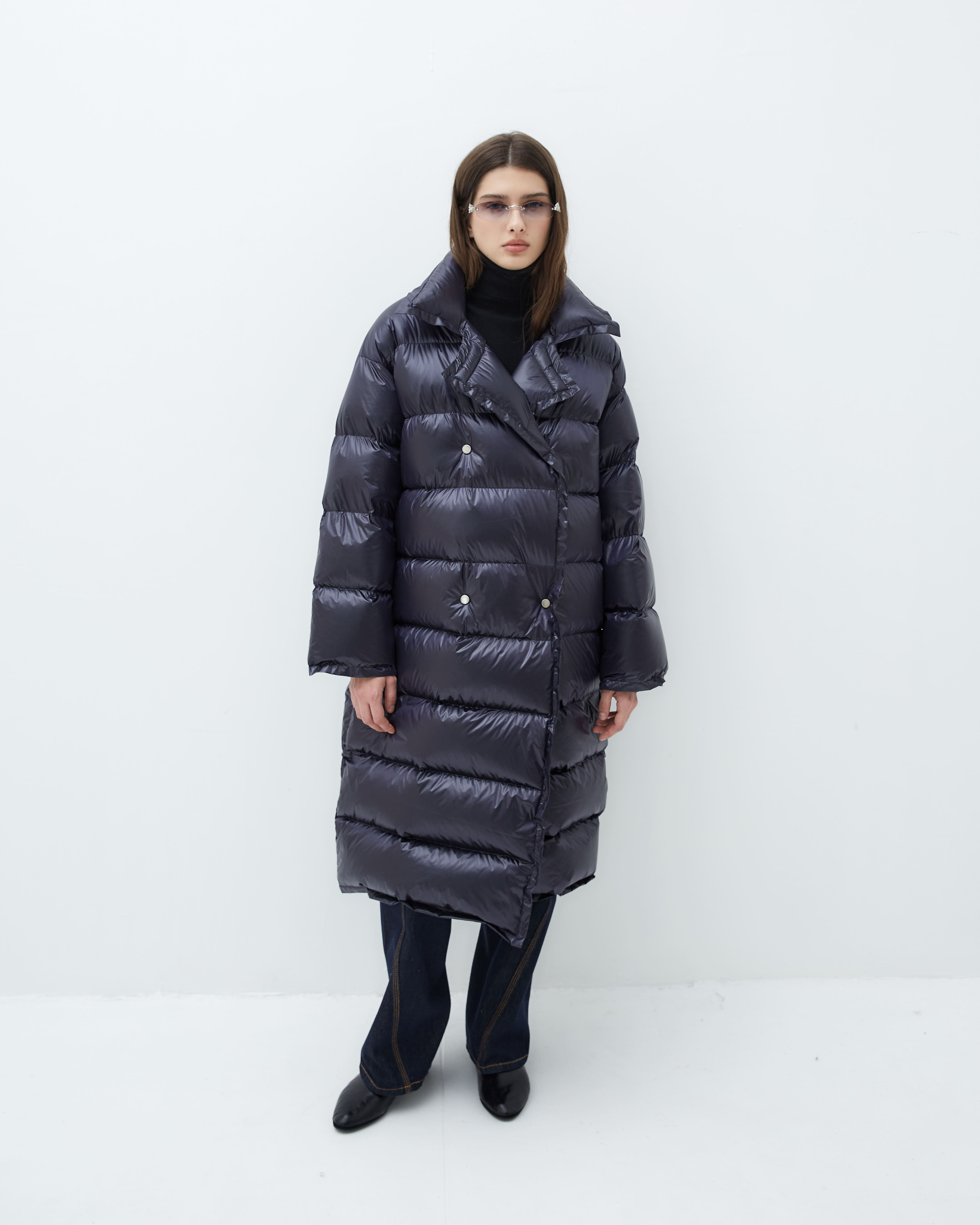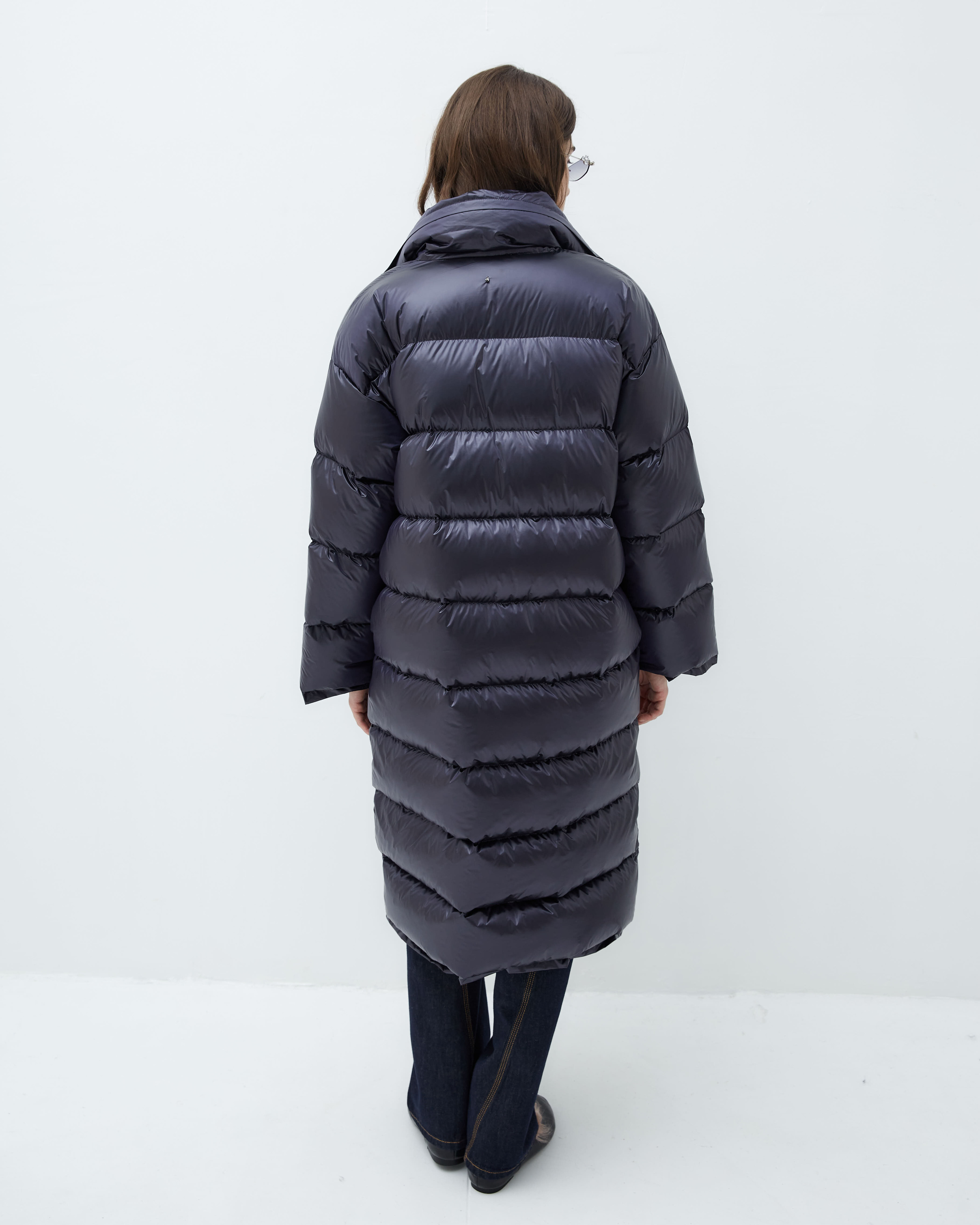 Изделие прямого силуэта, спущенный рукав, воротник с универсальной горловиной - пуховик можно носить отогнув края бортов и получить пиджачный тип, а можно наглухо закрыть горловину и поднять воротник. Застёжка на кнопки, карманы в боковых швах.