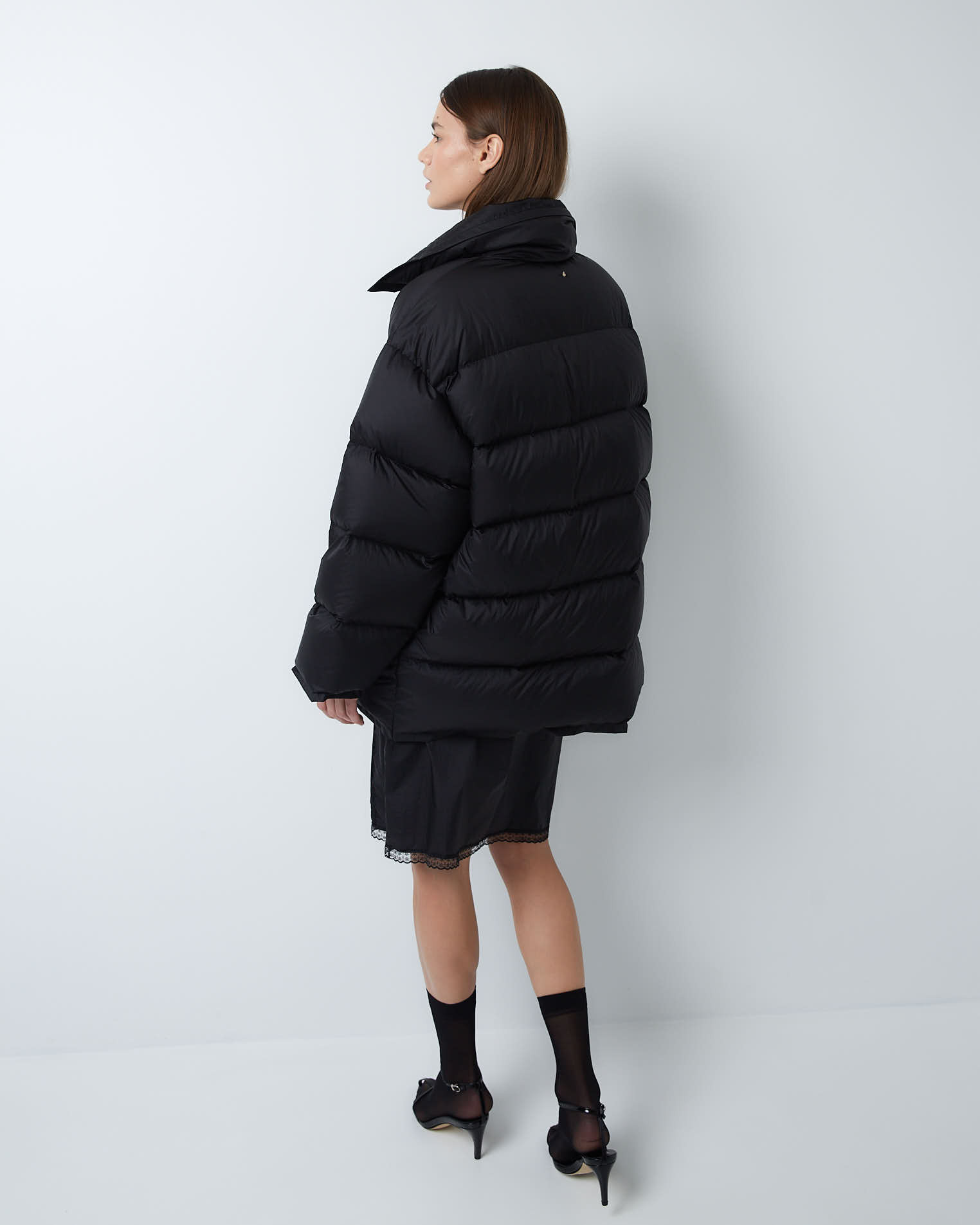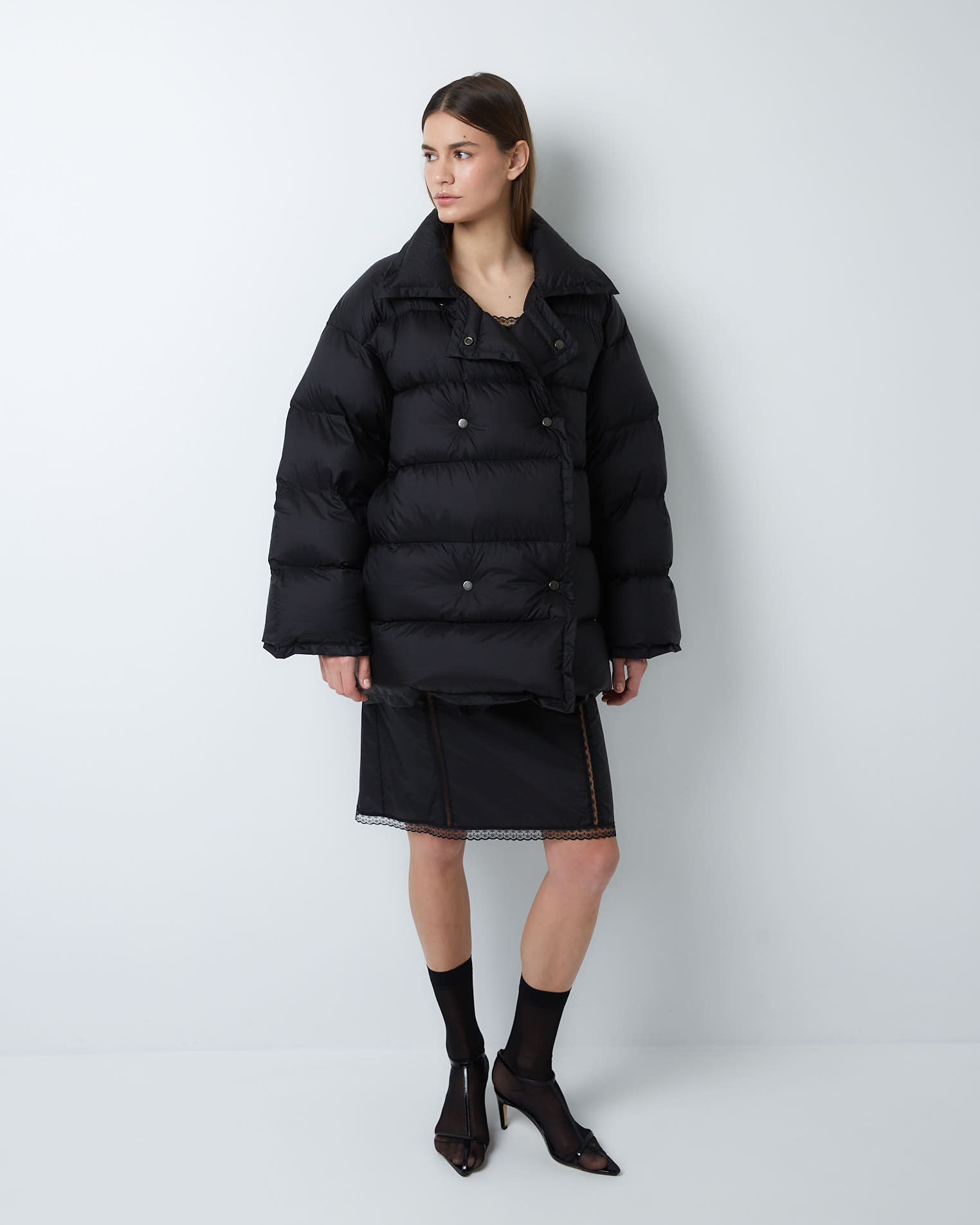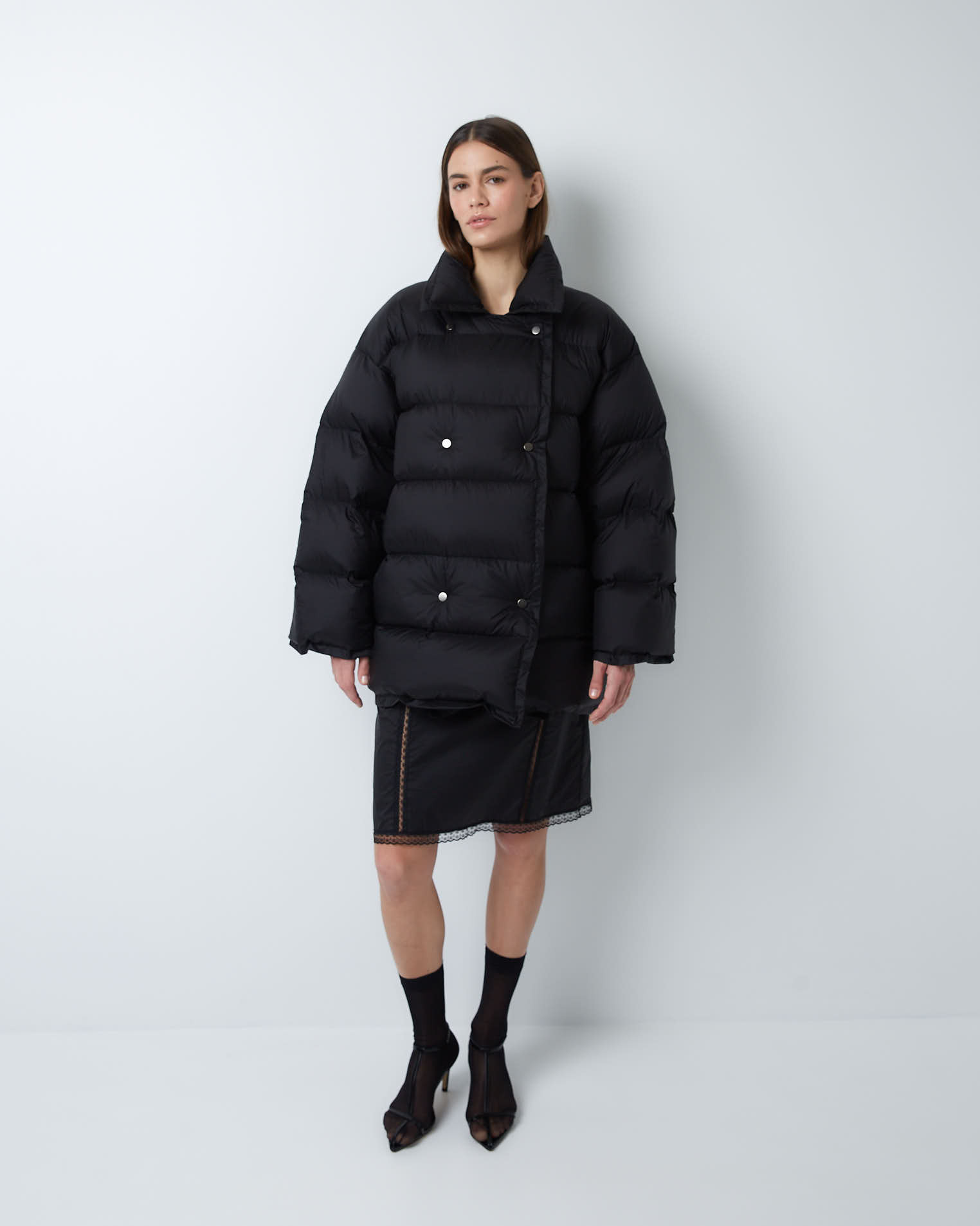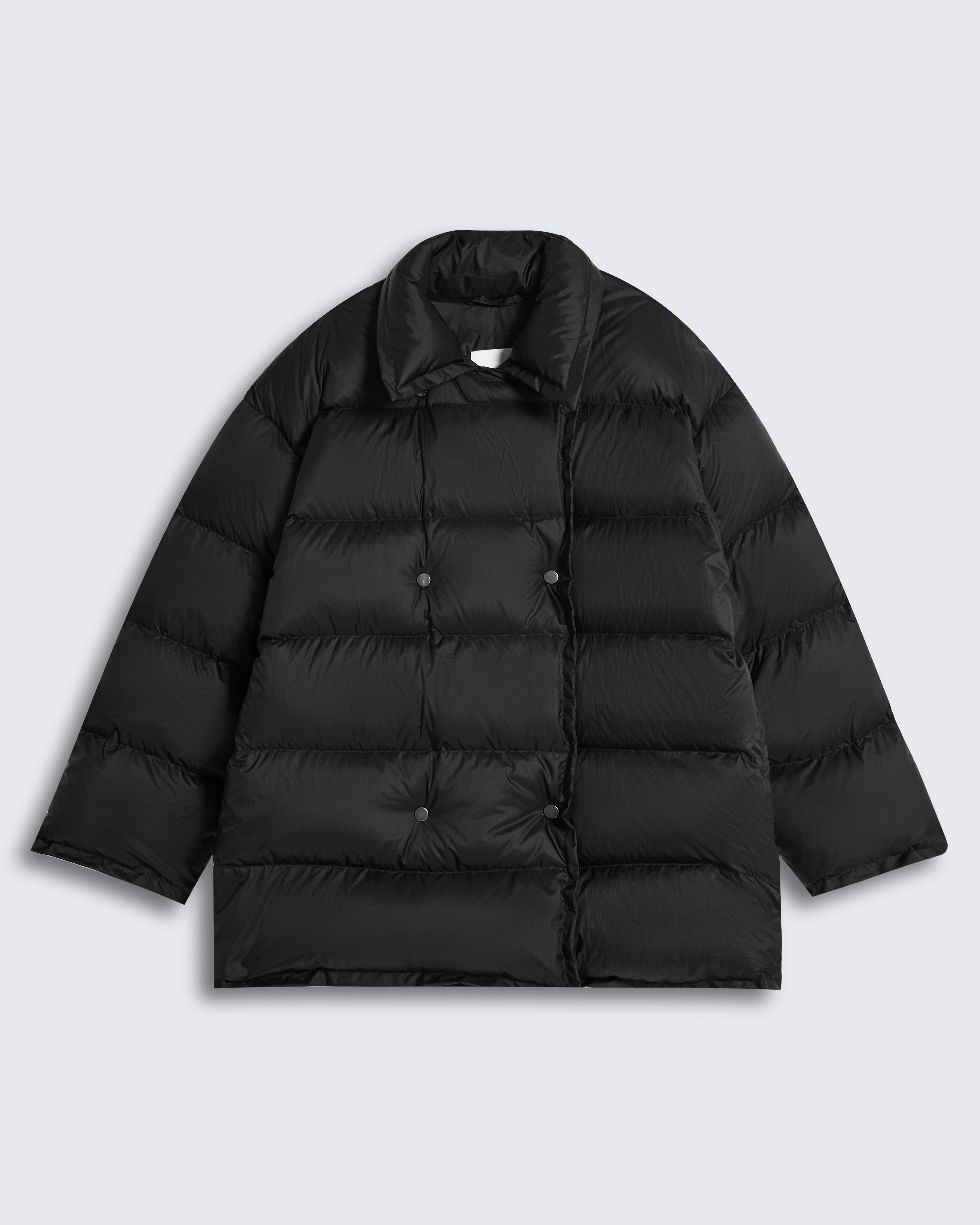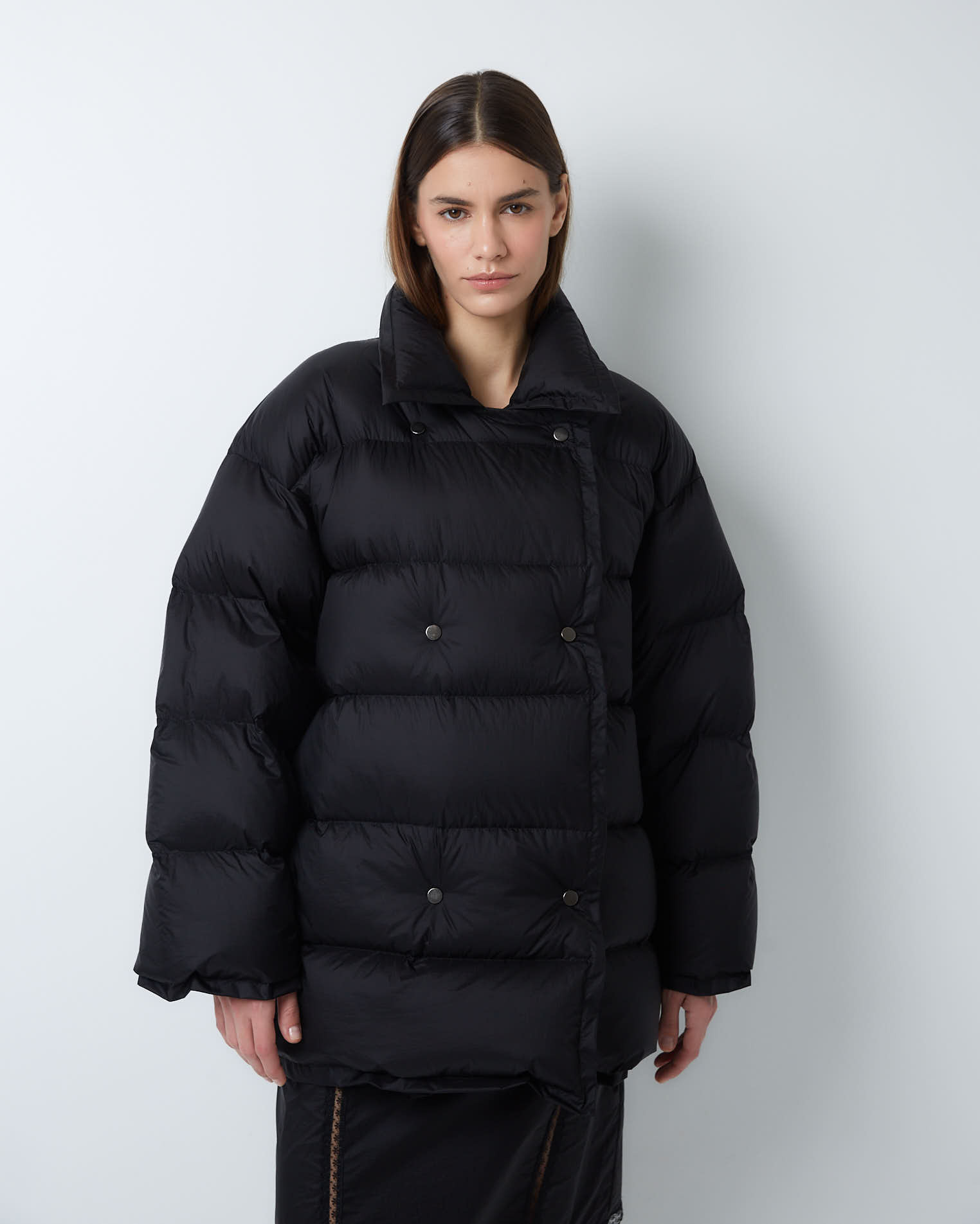 Пуховик двубортный укороченный из итальянского нейлона в черном цвете
