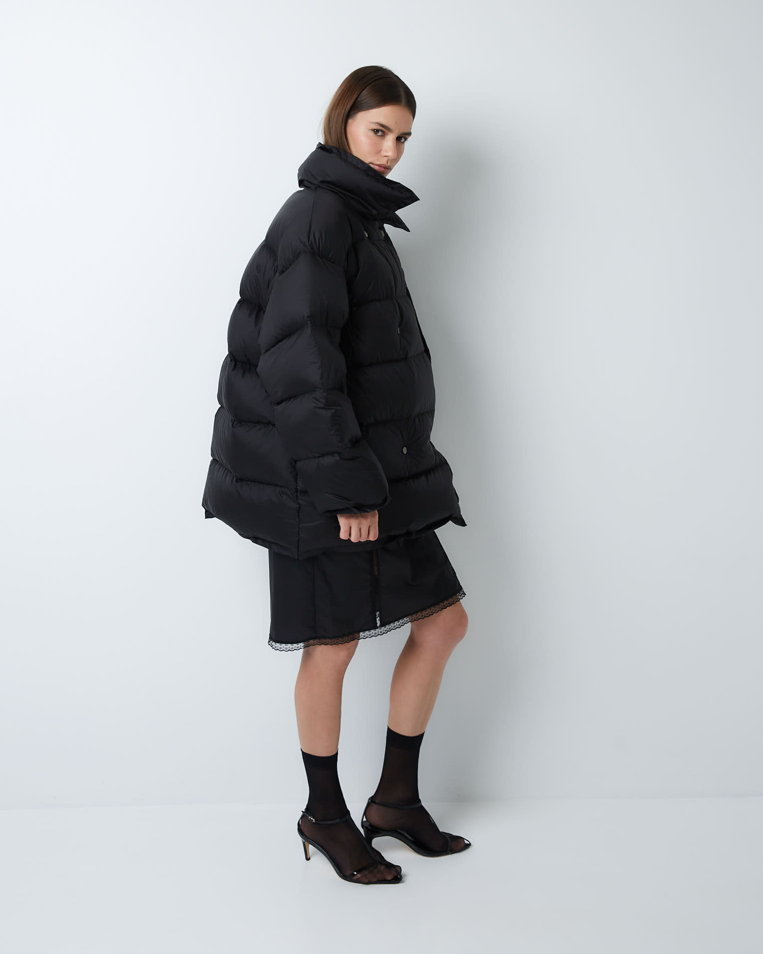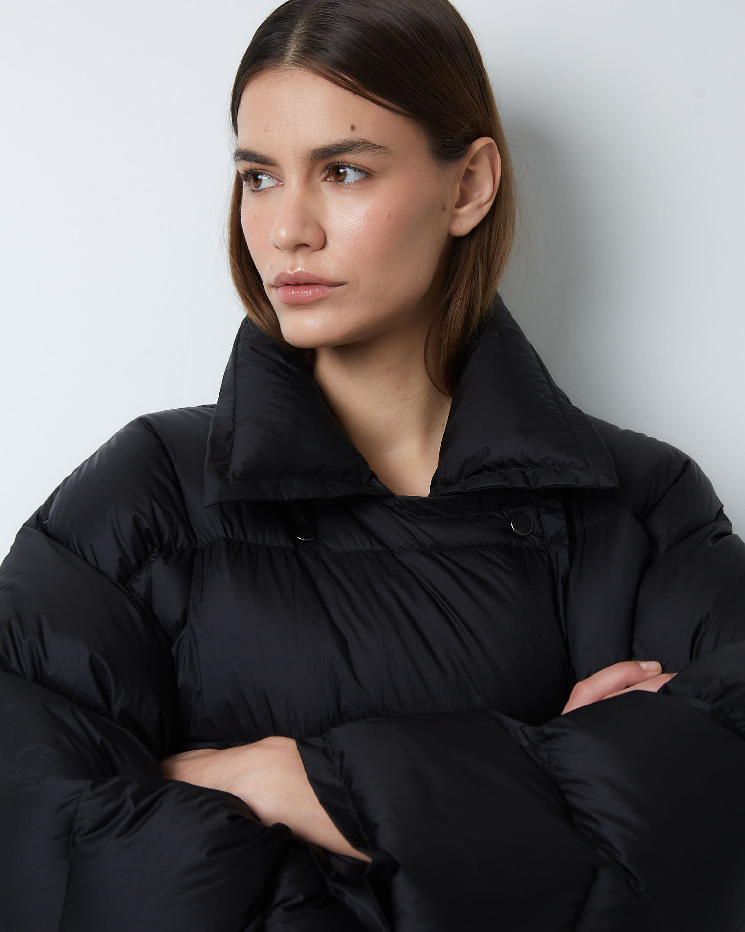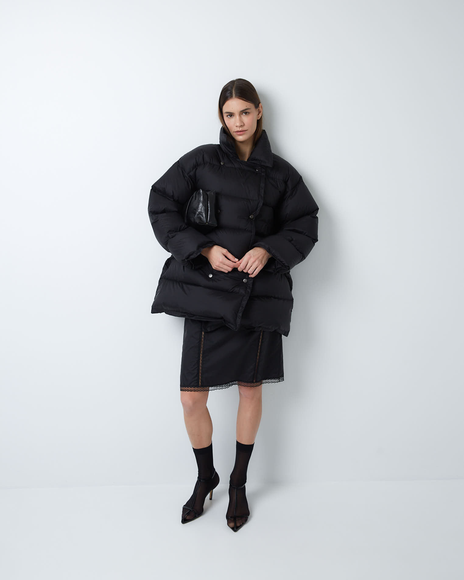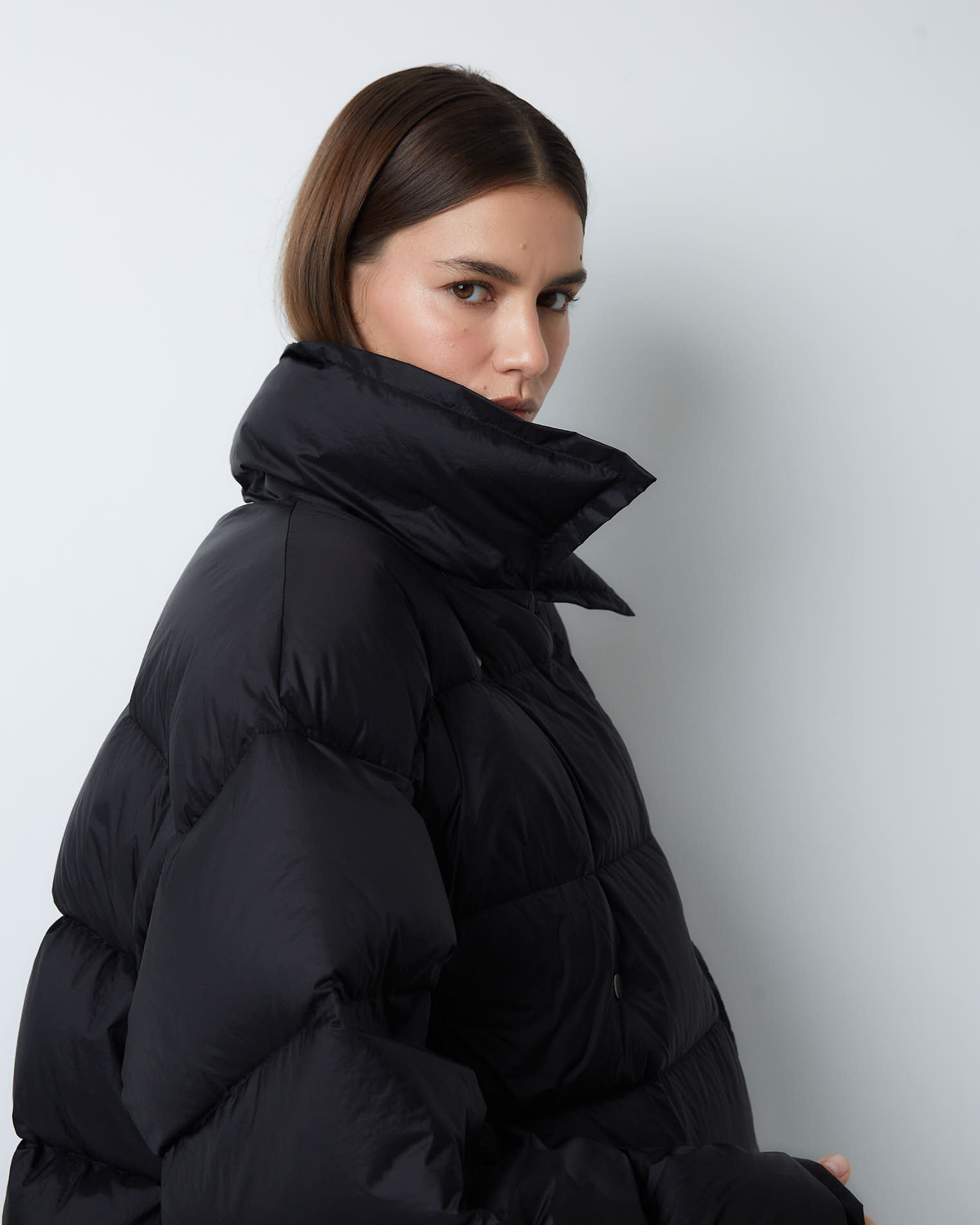 Изделие прямого силуэта, спущенный рукав, воротник с универсальной горловиной - пуховик можно носить отогнув края бортов и получить пиджачный тип, а можно наглухо закрыть горловину и поднять воротник. Застёжка на кнопки, карманы в боковых швах.