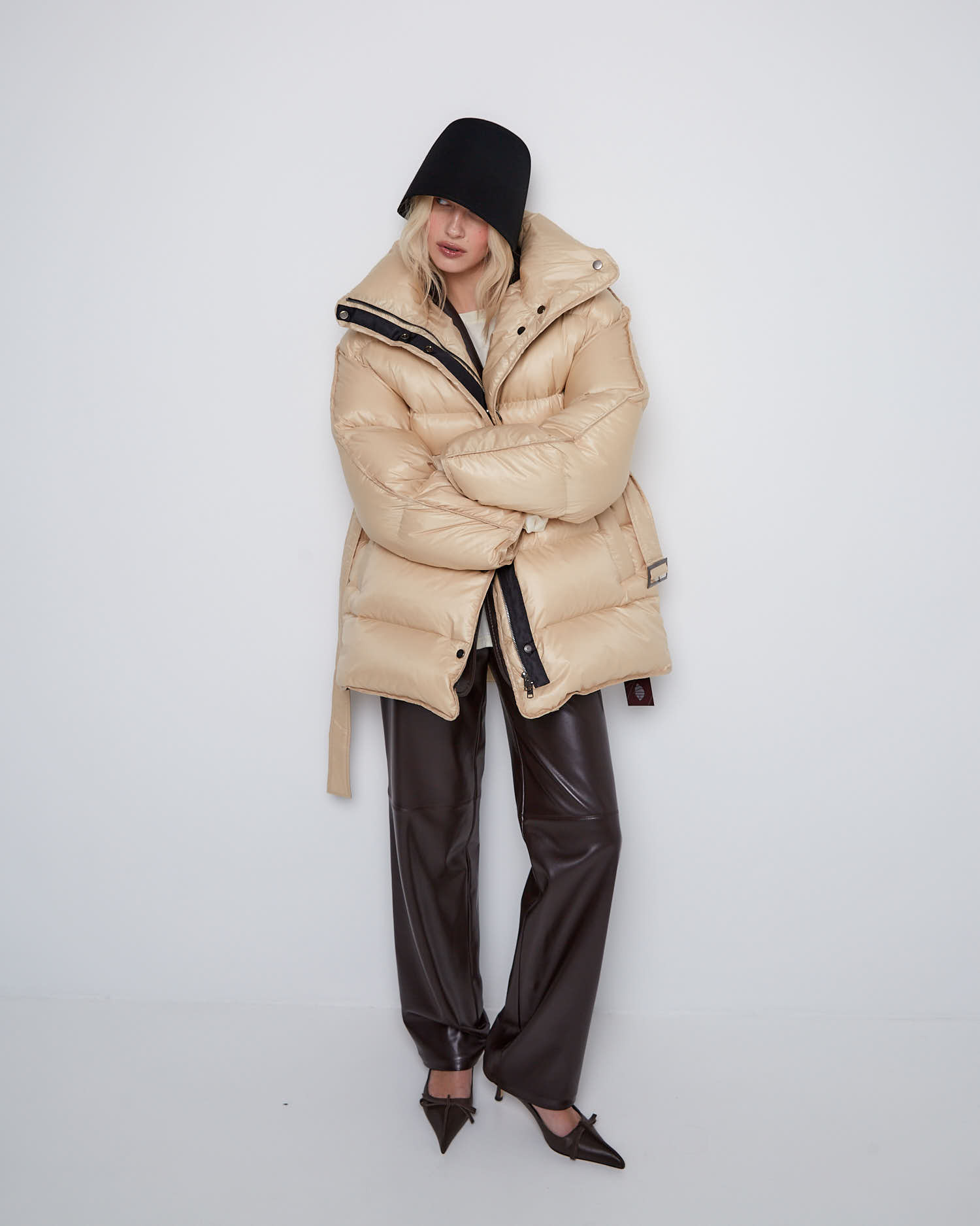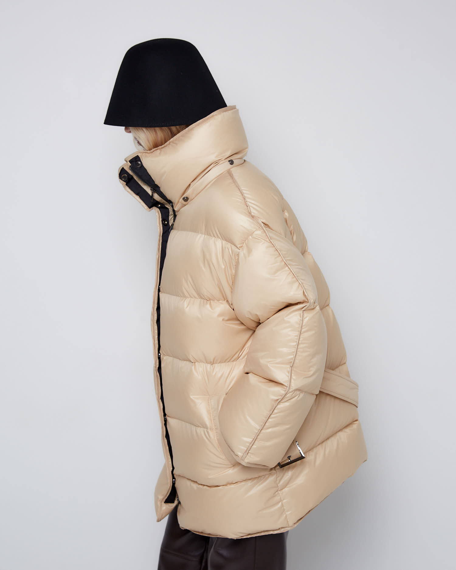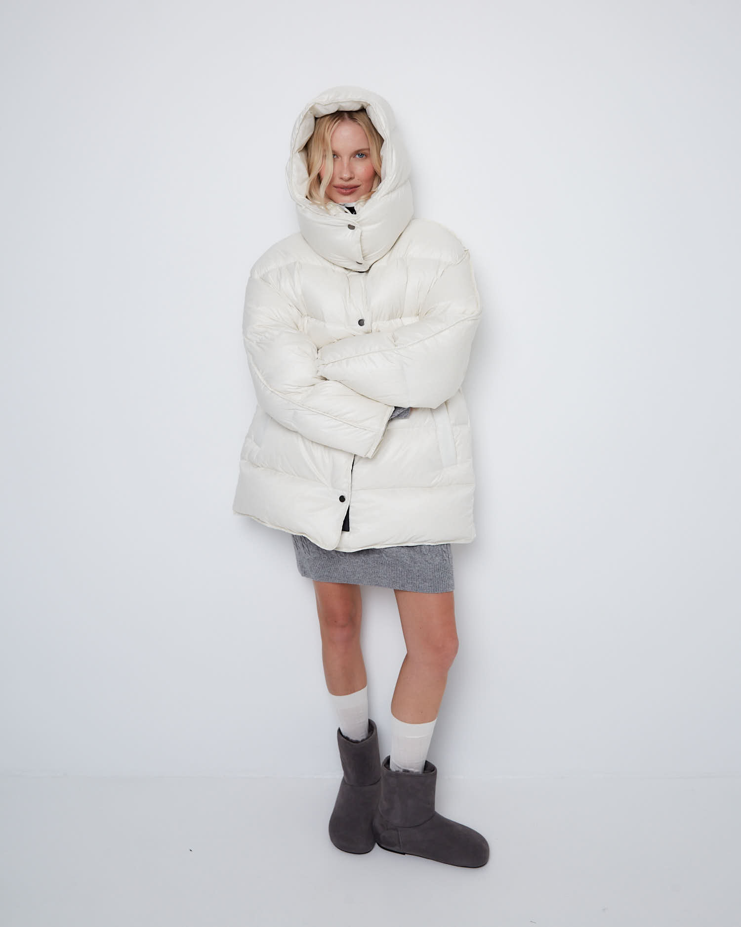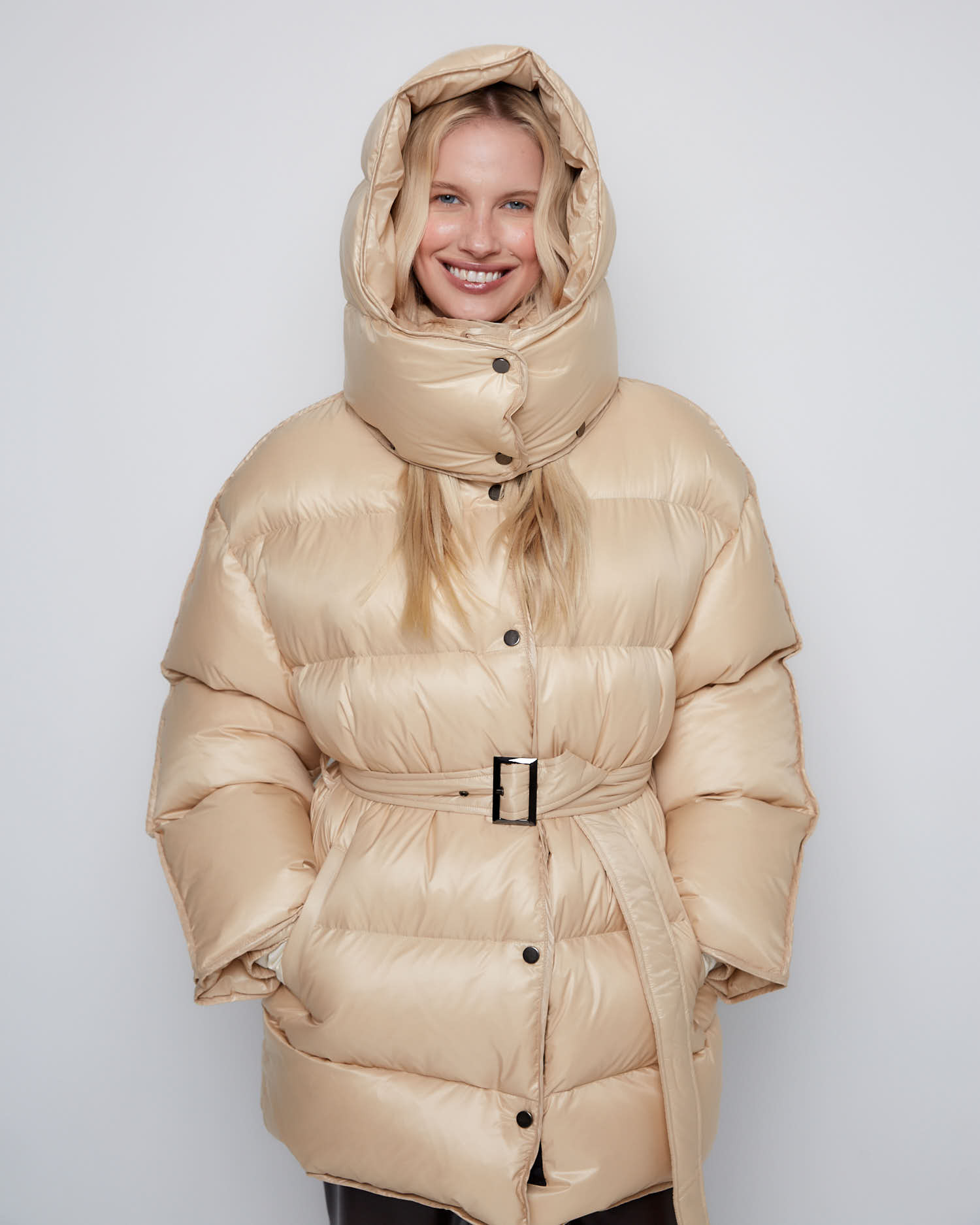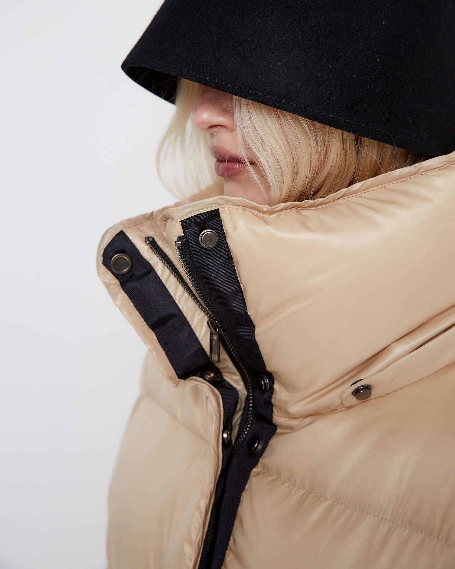 Наши пуховики выполнены из премиальных пуховых пакетов, в состав которого входит натуральный гусиный пух. Объёмный воротник полностью закрывает шею и спасает от ветра.