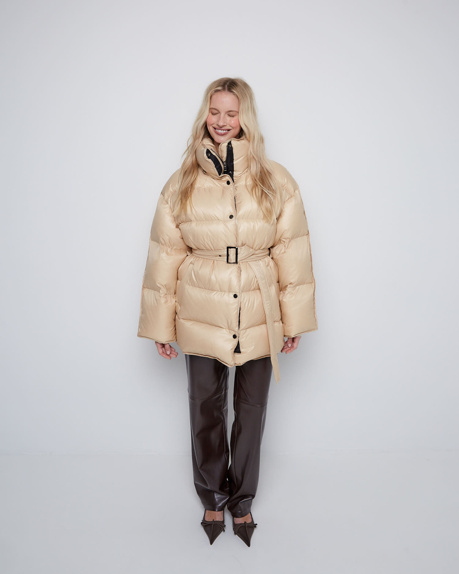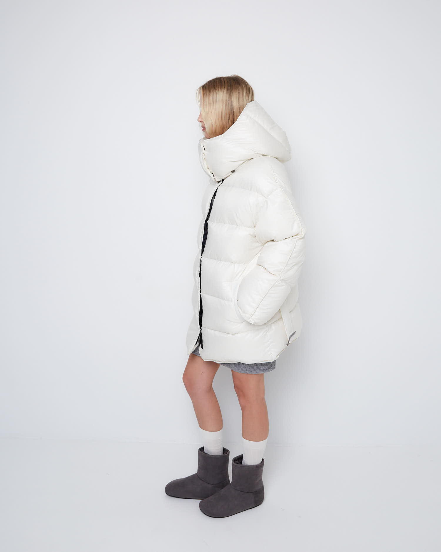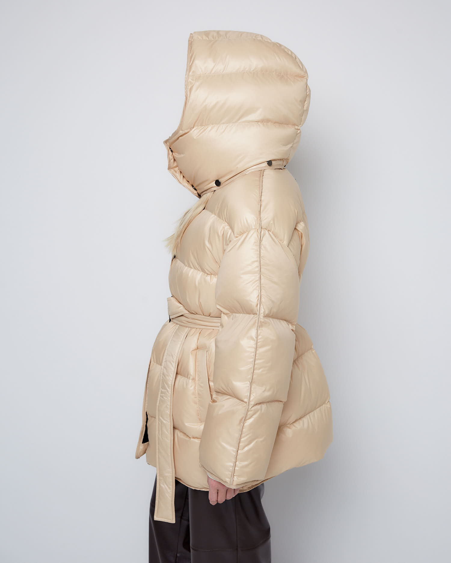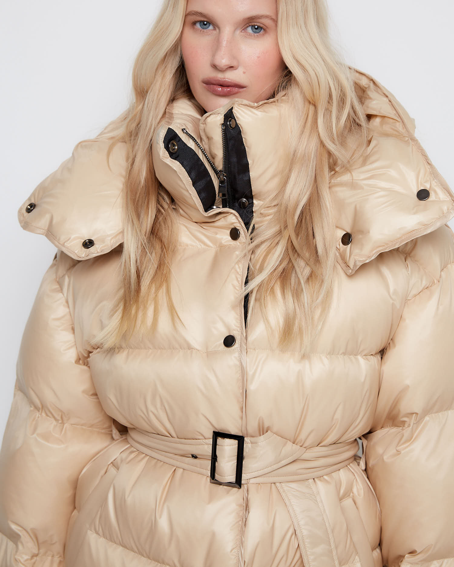 Наши пуховики выполнены из премиальных пуховых пакетов, в состав которого входит натуральный гусиный пух. Объёмный воротник полностью закрывает шею и спасает от ветра.