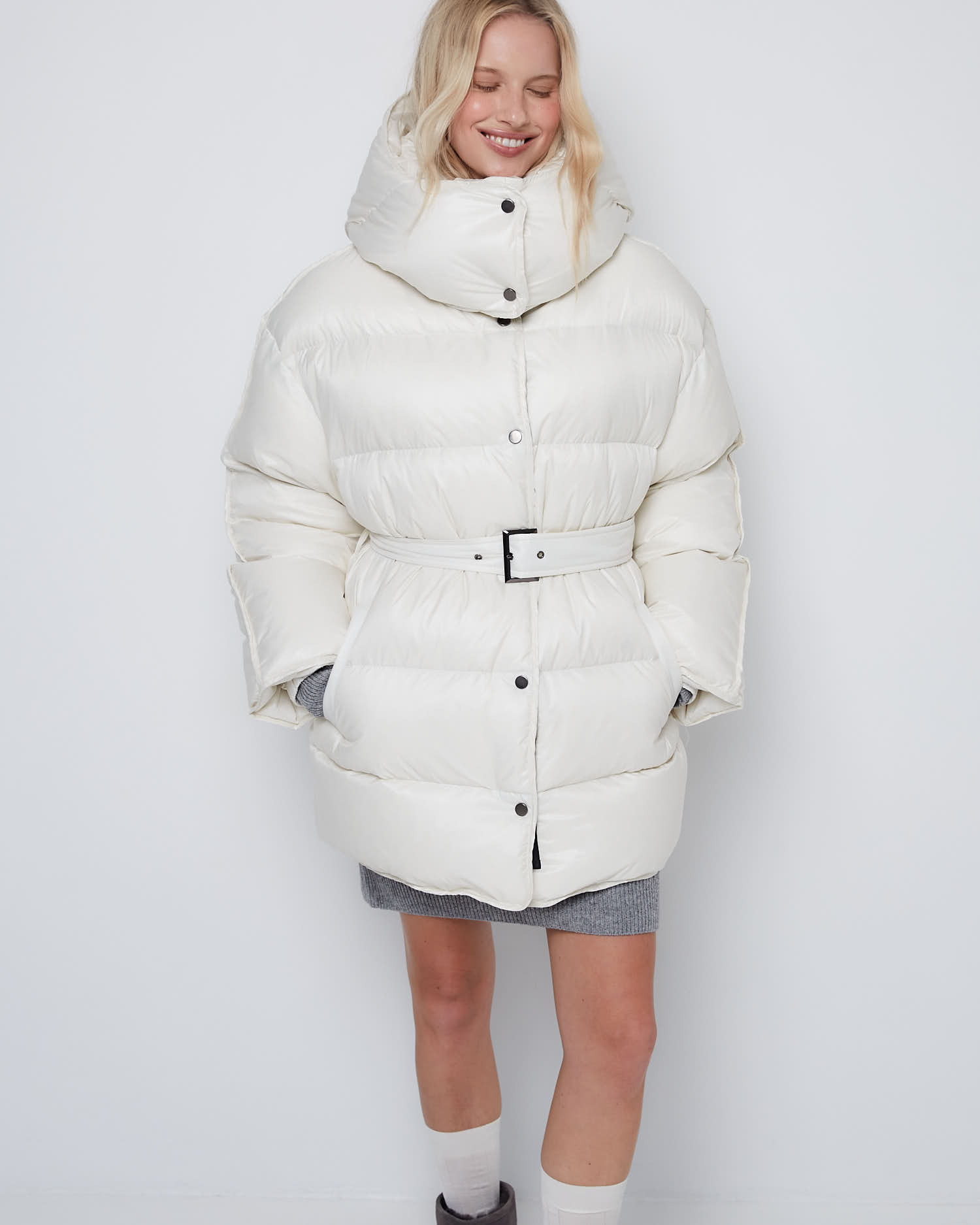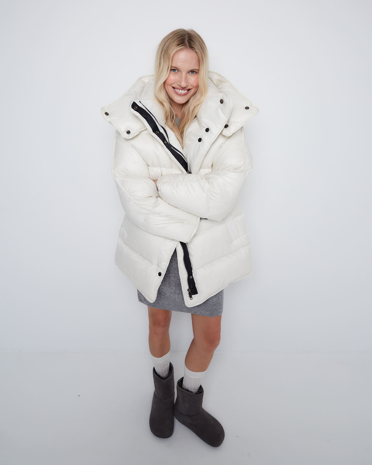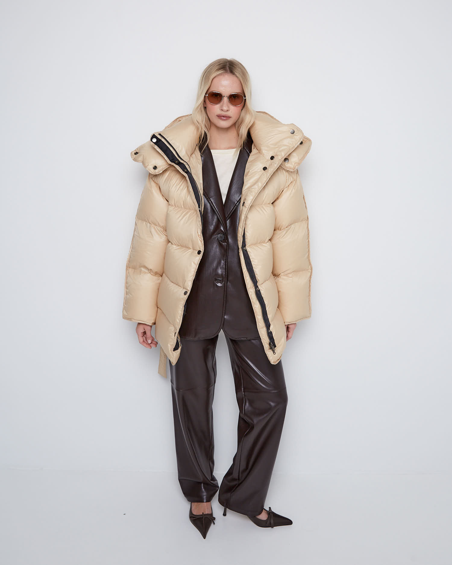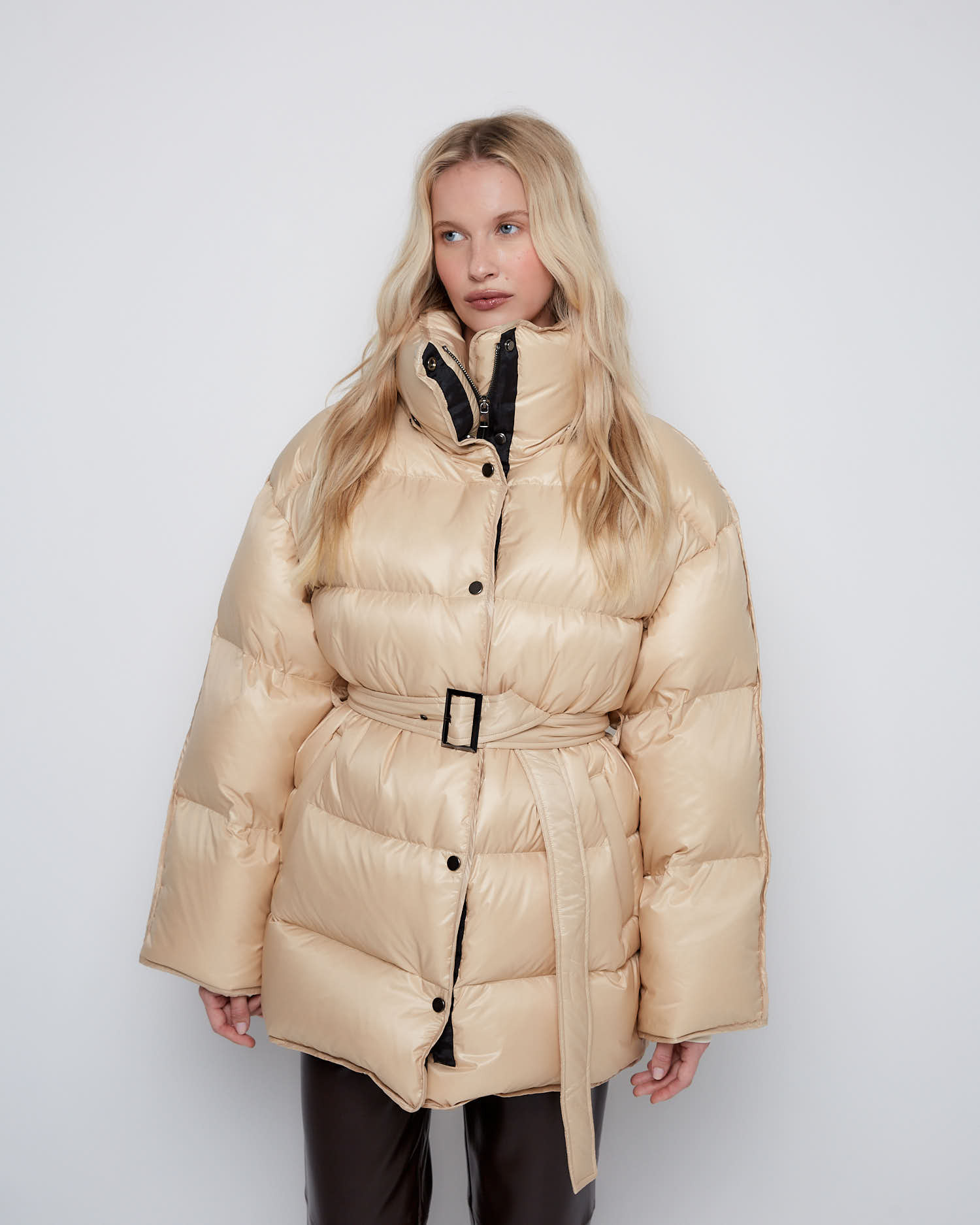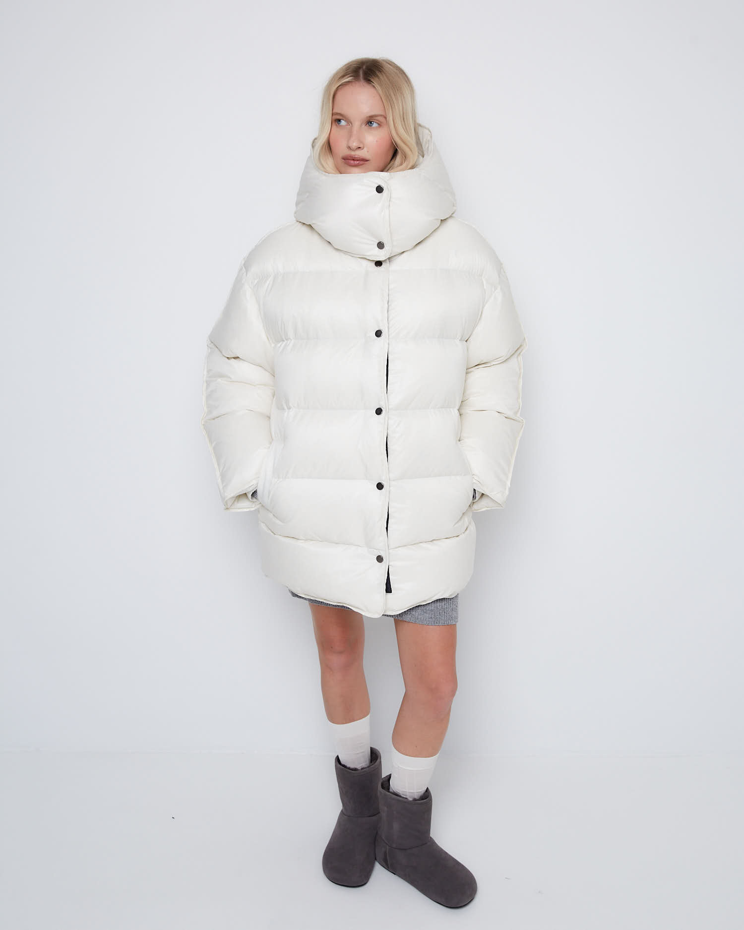 Наши пуховики выполнены из премиальных пуховых пакетов, в состав которого входит натуральный гусиный пух. Объёмный воротник полностью закрывает шею и спасает от ветра.