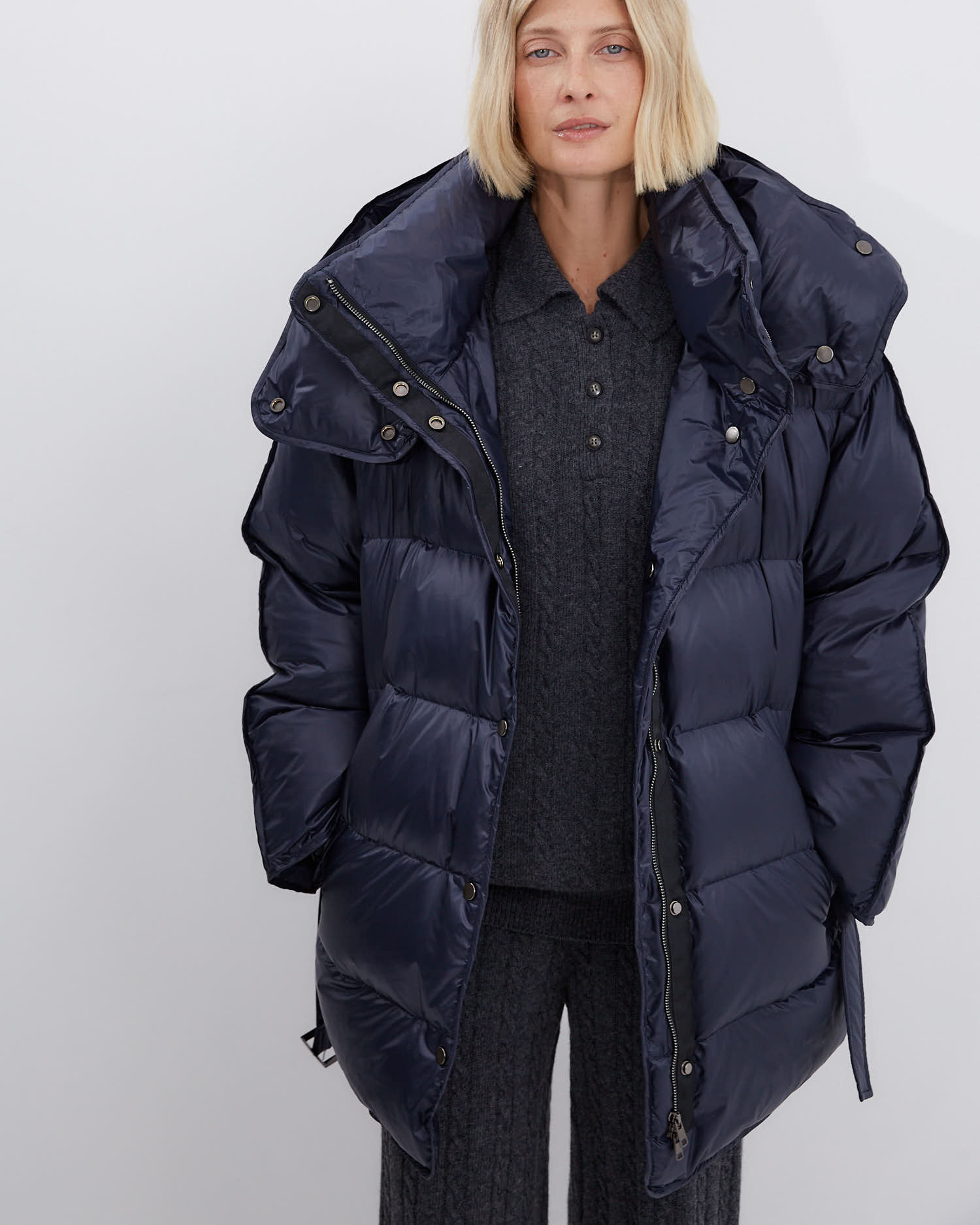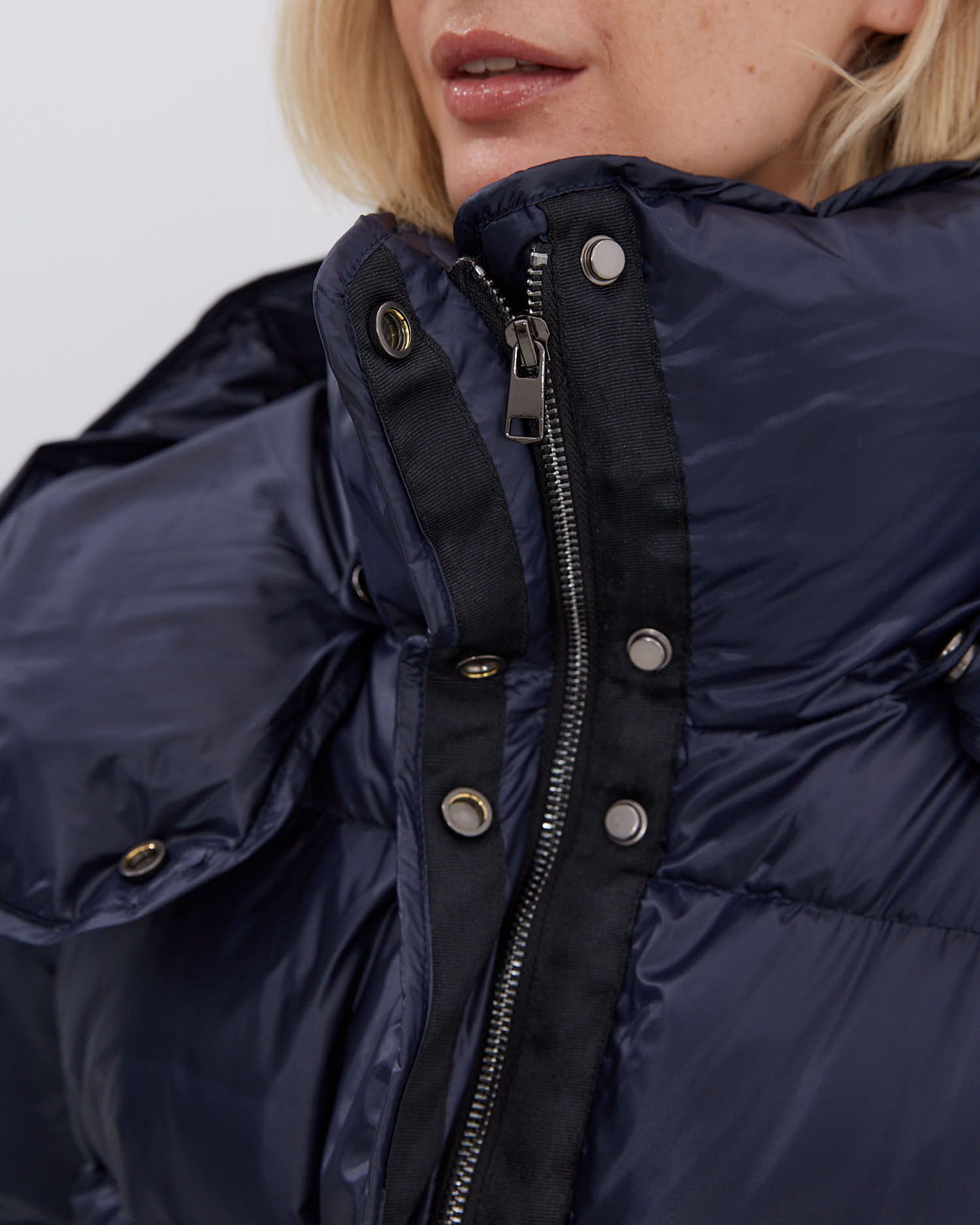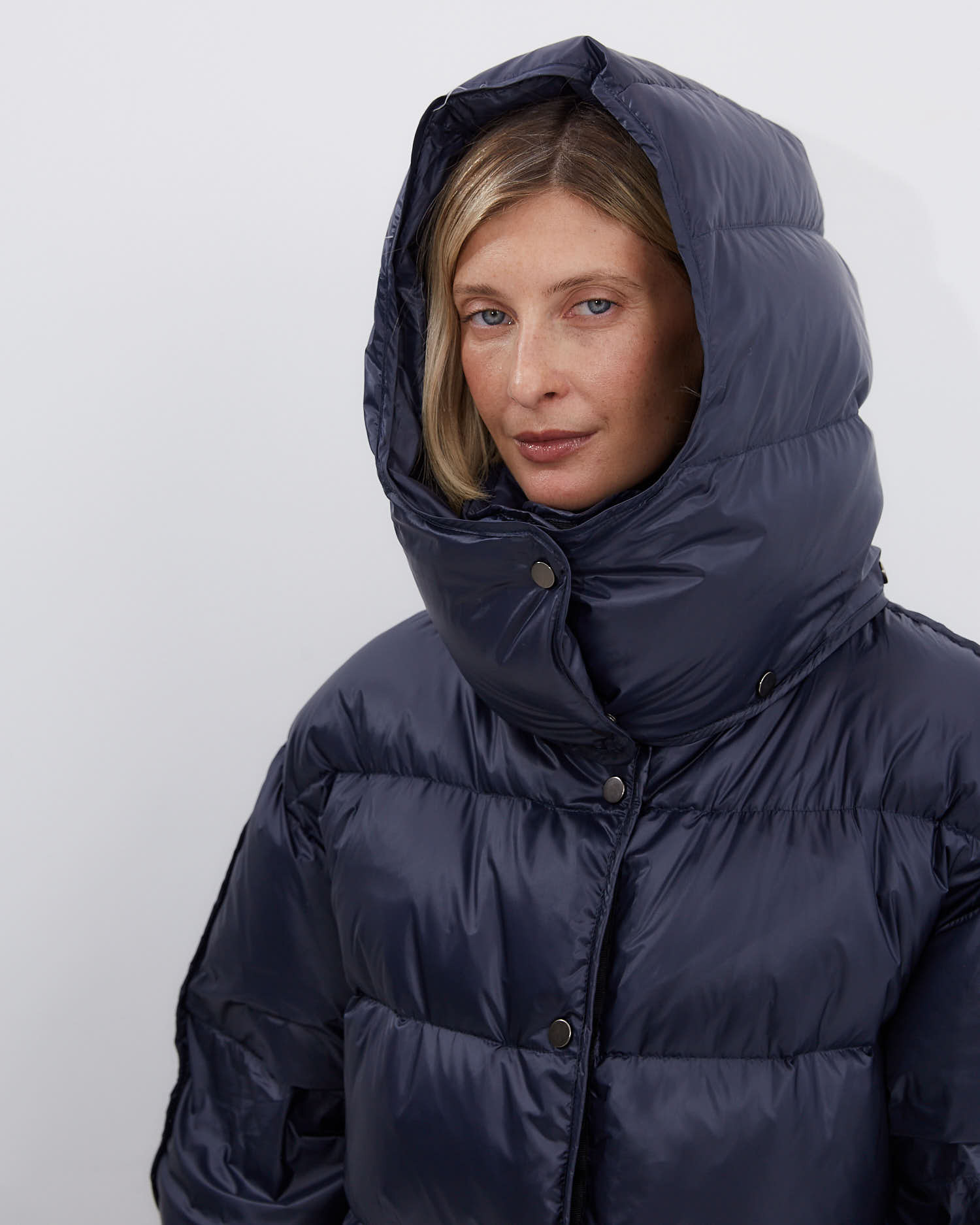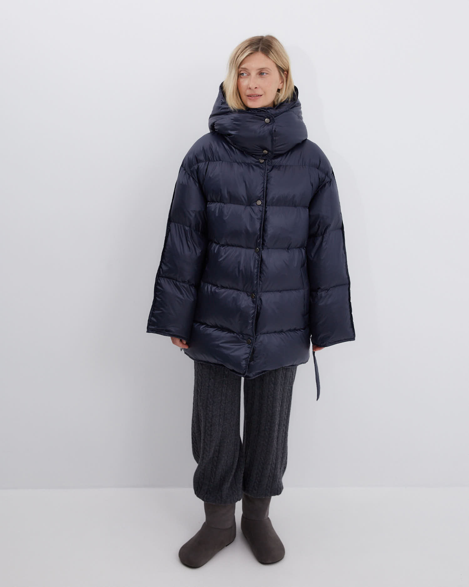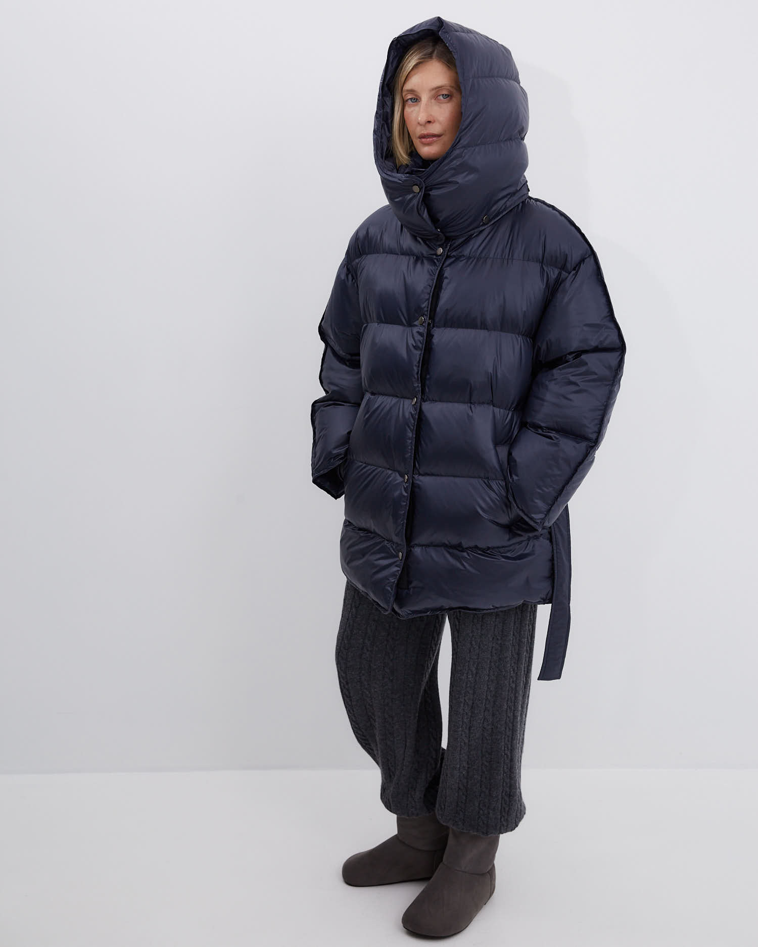 Наши пуховики выполнены из премиальных пуховых пакетов в составе которого входит натуральный гусиный пух. Объёмный воротник полностью закрывает шею и спасает от ветра. Внутри и снаружи мы предусмотрели кулису, чтобы изделие плотно прилегало к телу и внутрь не проникал холод.