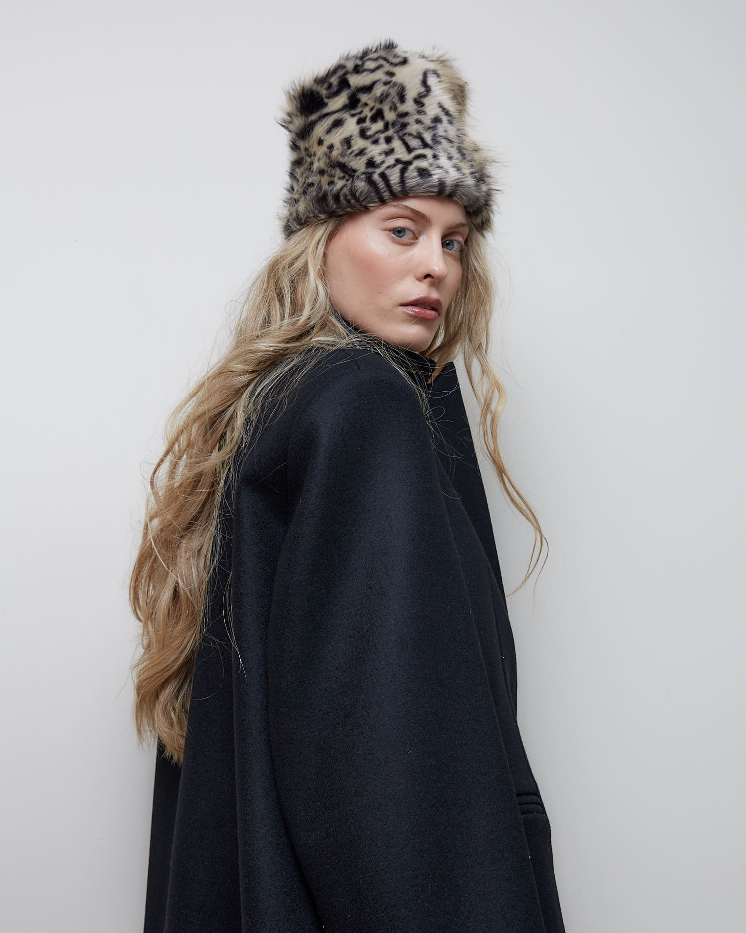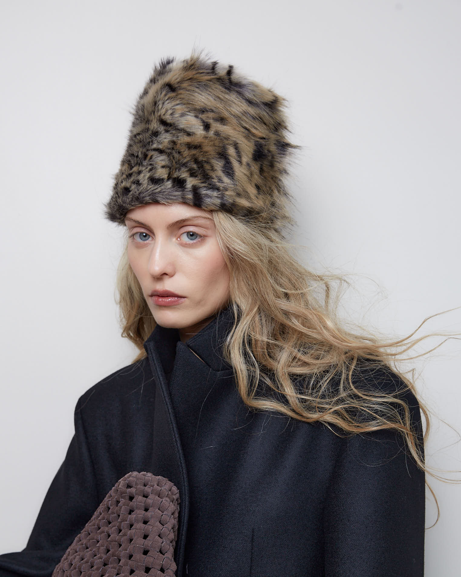 Шапка-цилиндр из искусственного меха от Стеллы Маккартни с принтом рысь