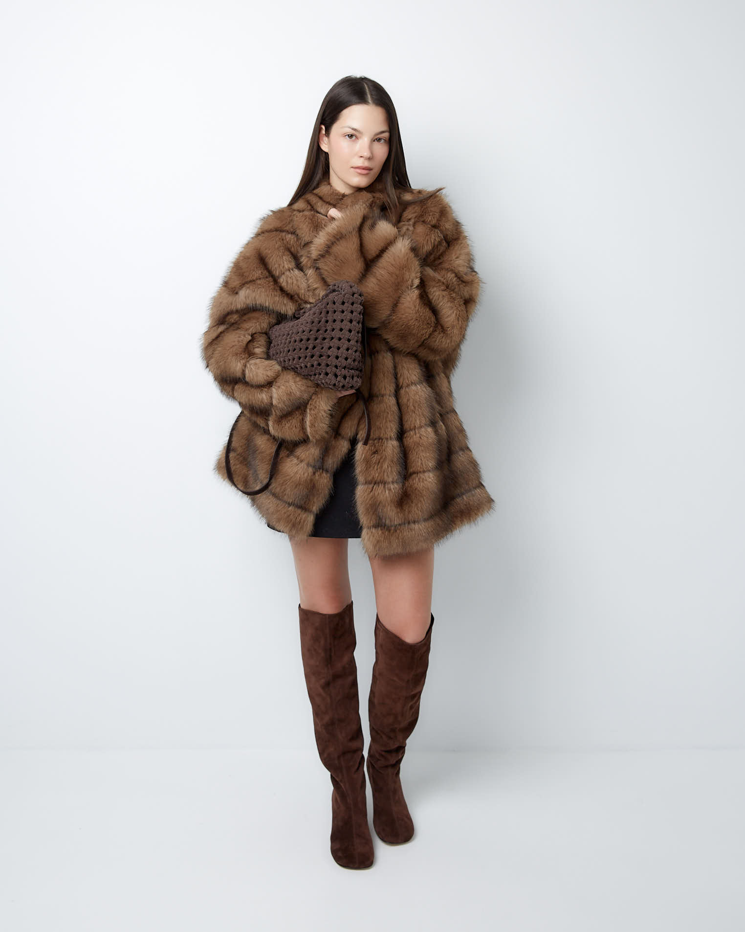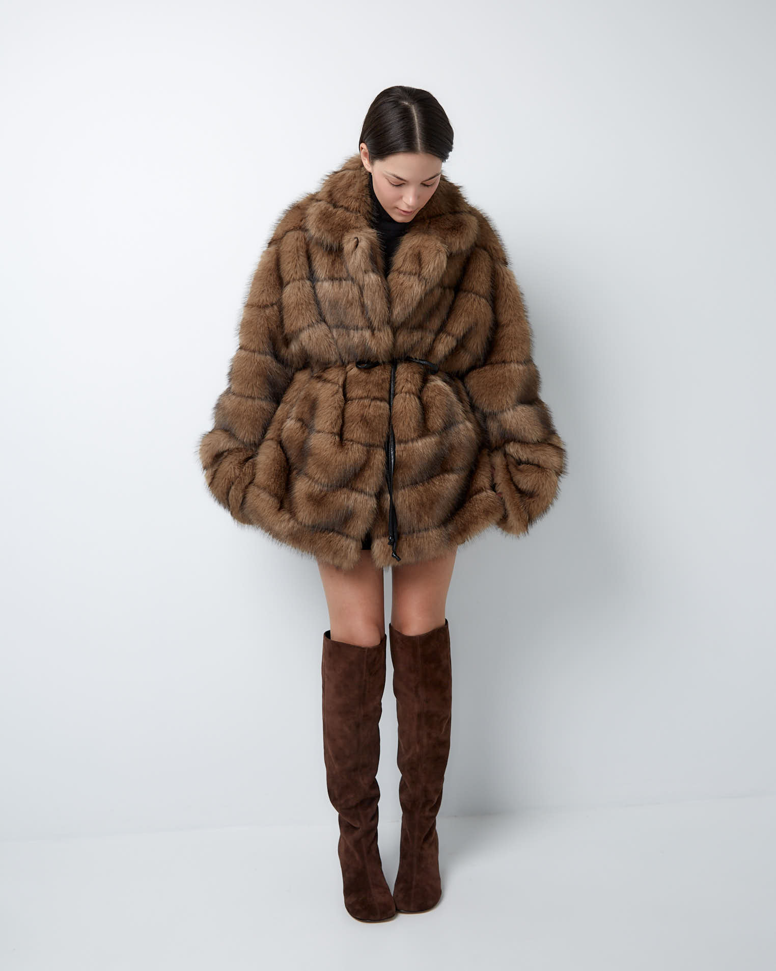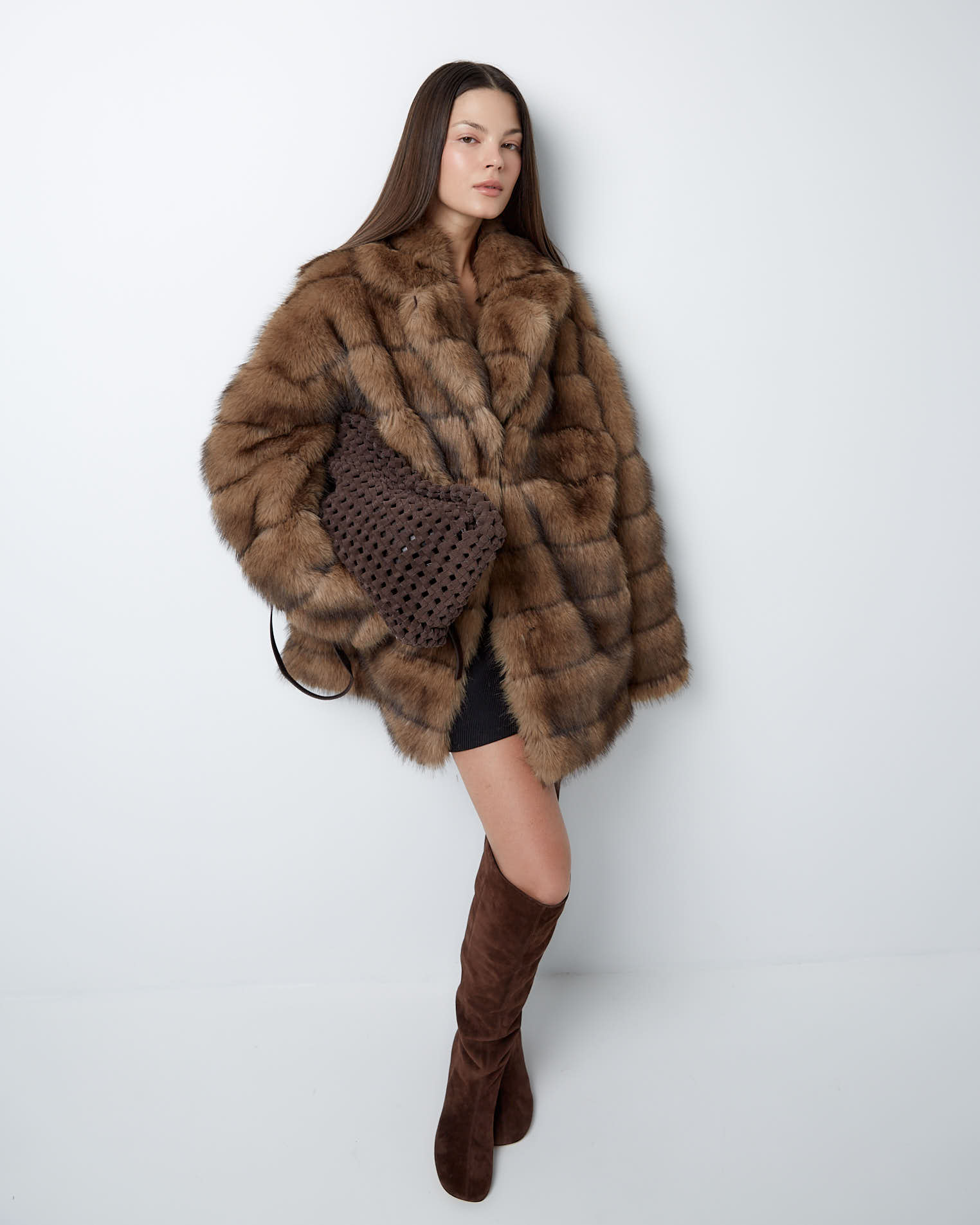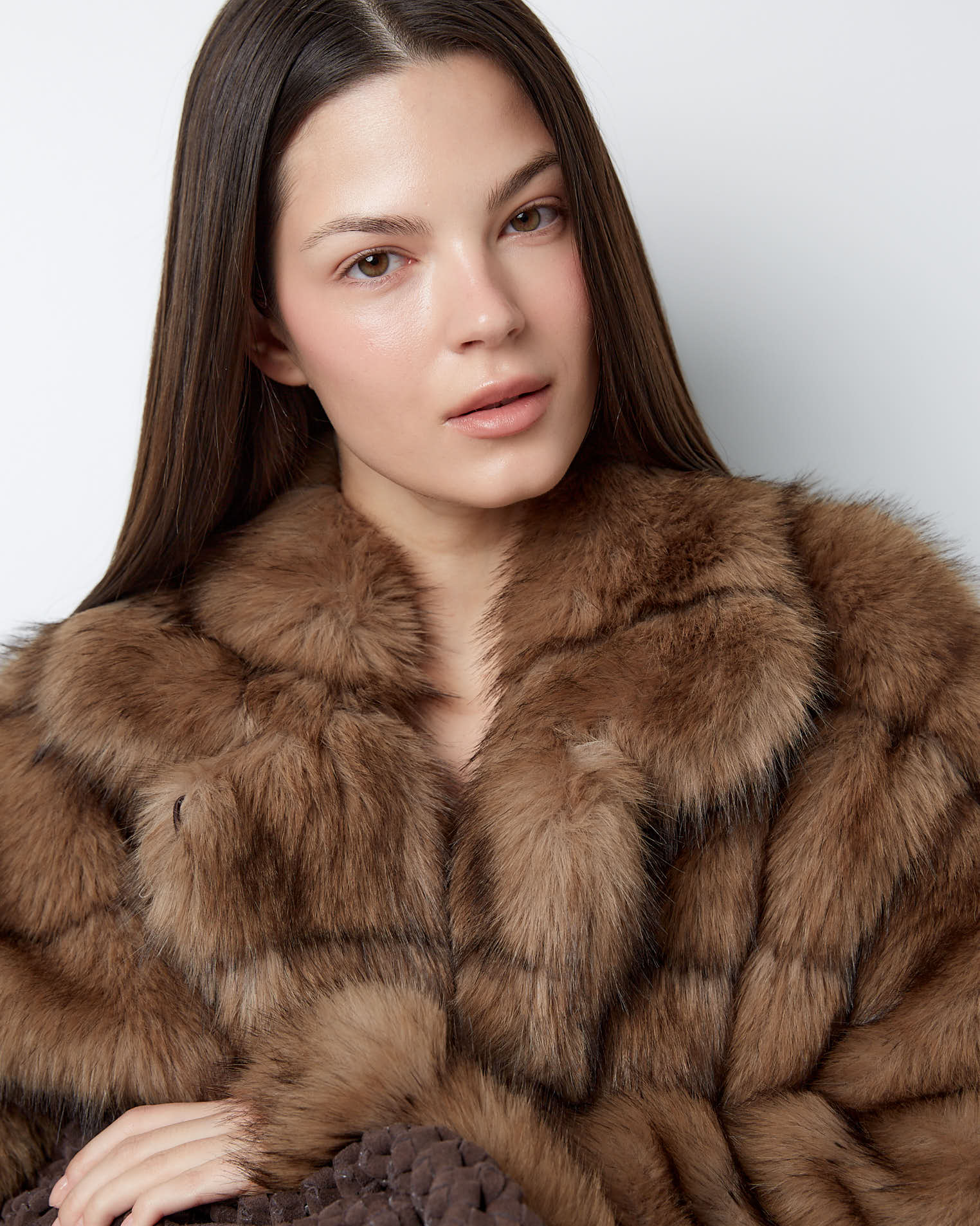 Шуба укороченная из искусственного меха соболя в ореховом цвете