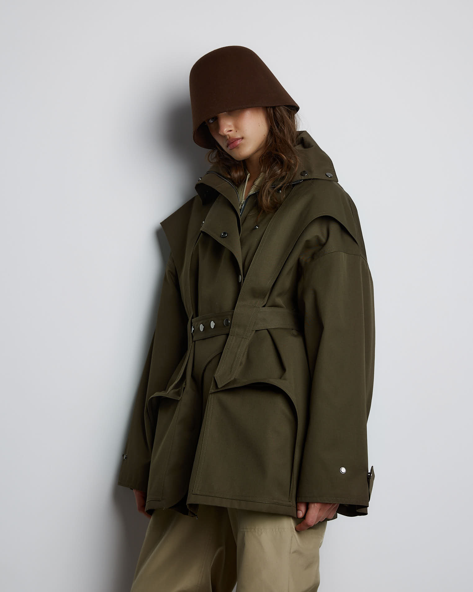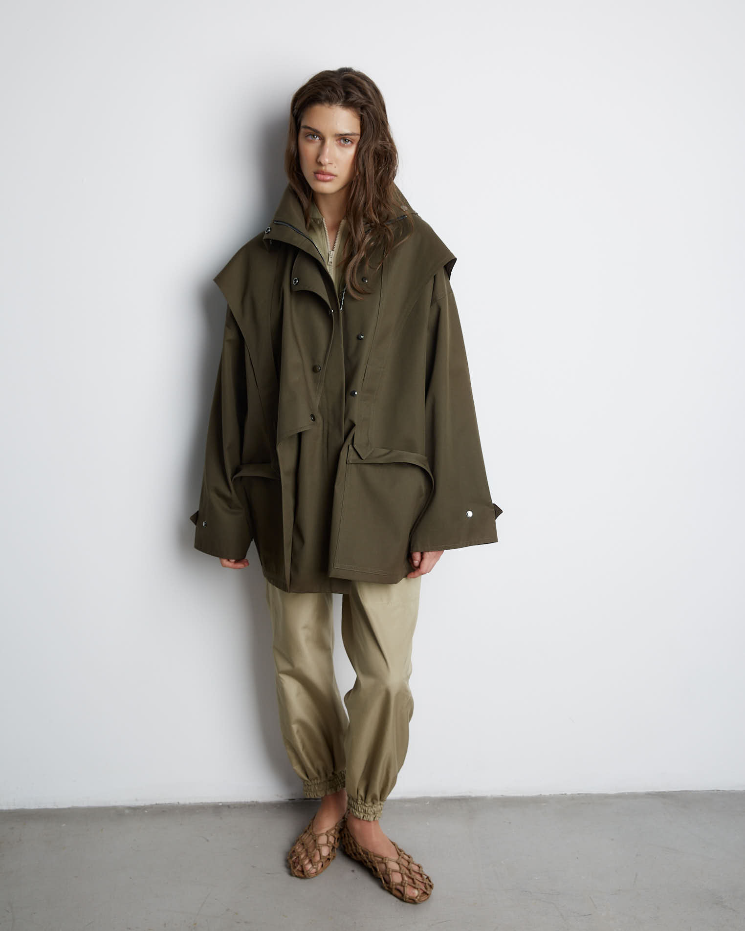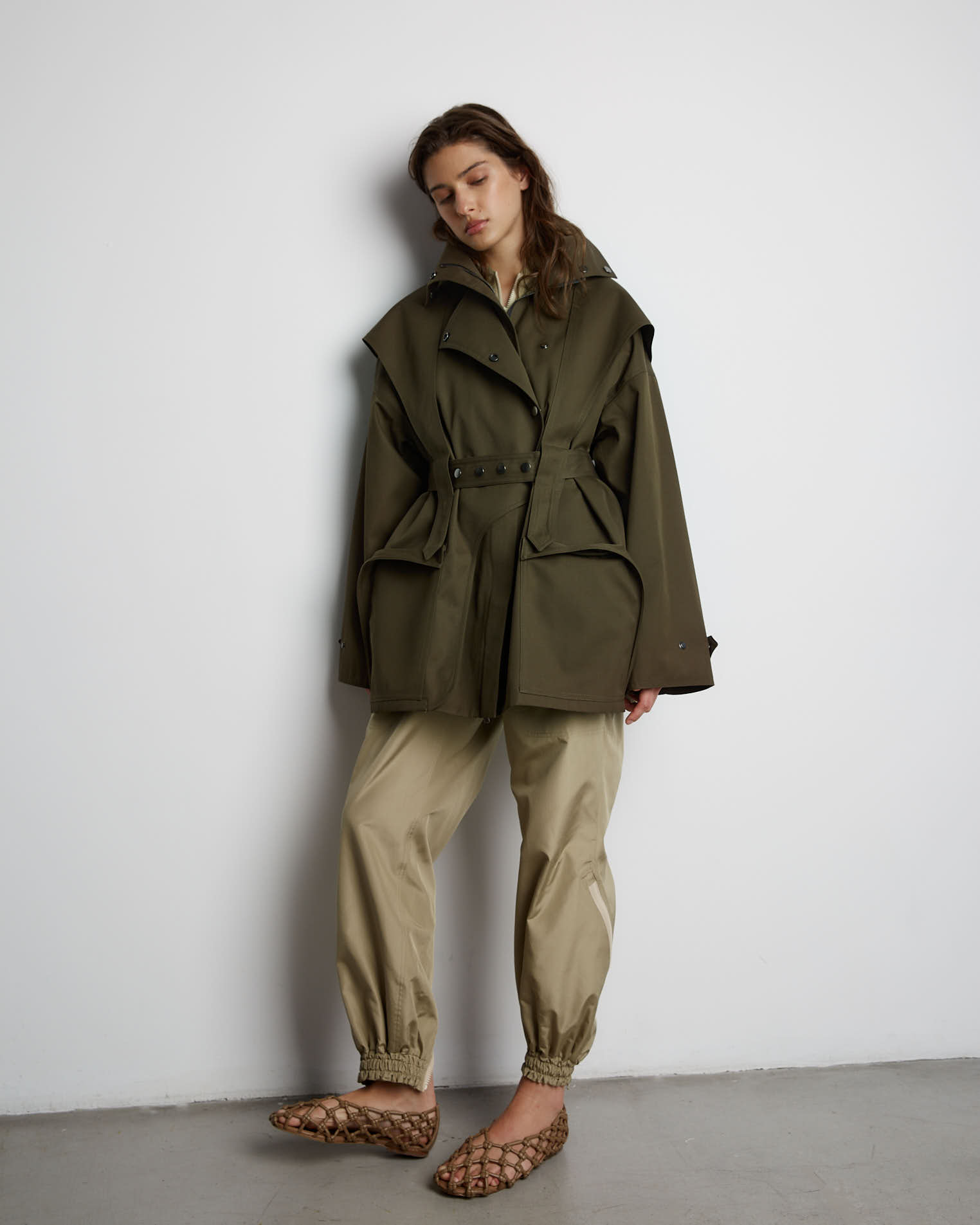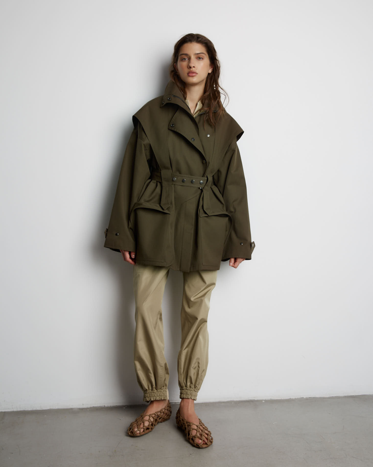 Куртка свободного кроя, застежка-молния, сборка на спине за счет приталенного силуэта. Фигурные элементы, выходящие из плечевого шва, фиксируются на талии поясом. Высокая стойка фиксируется кнопками, на рукавах широкий фигурный хлястик, который регулирует ширину рукава, карманы накладные.