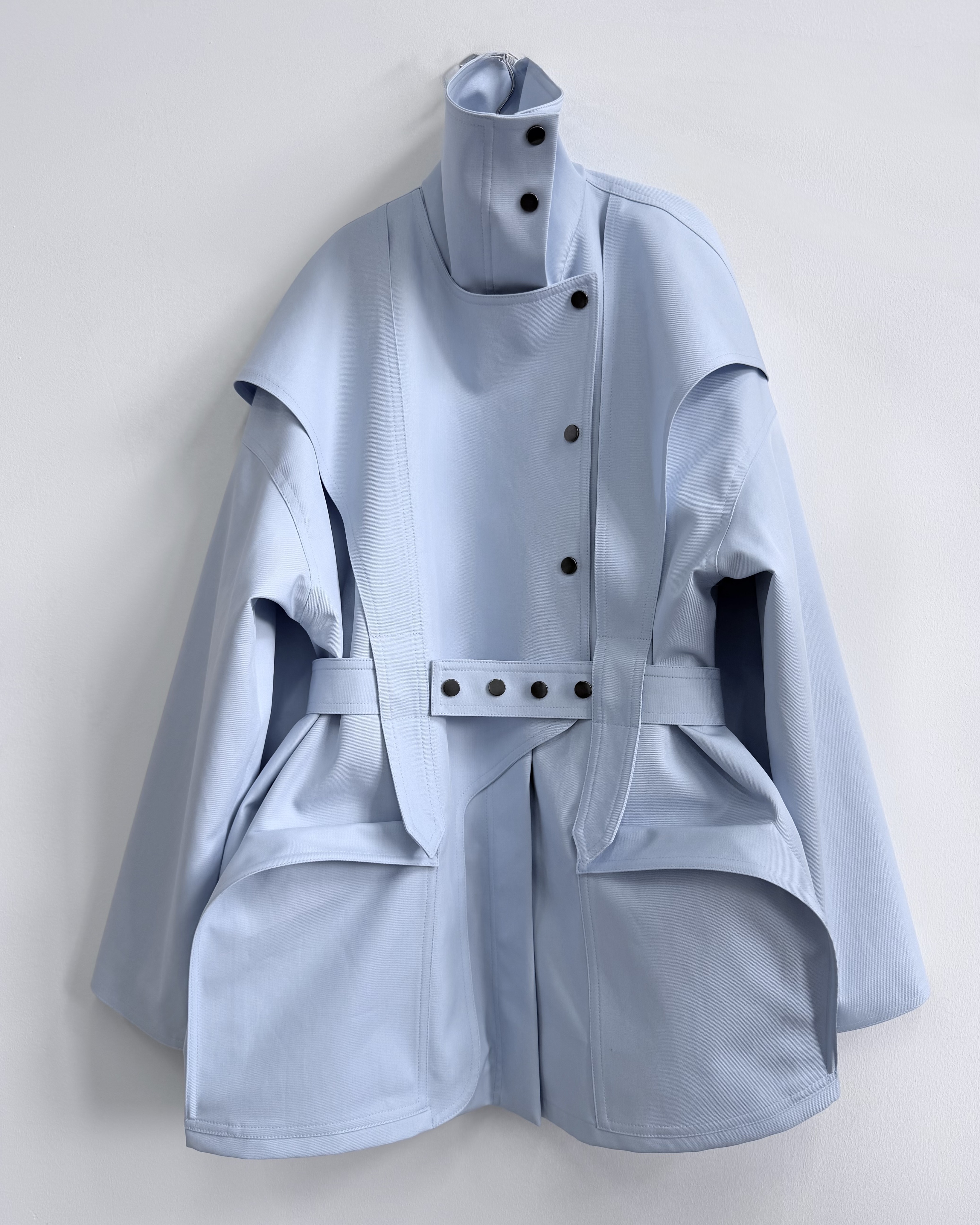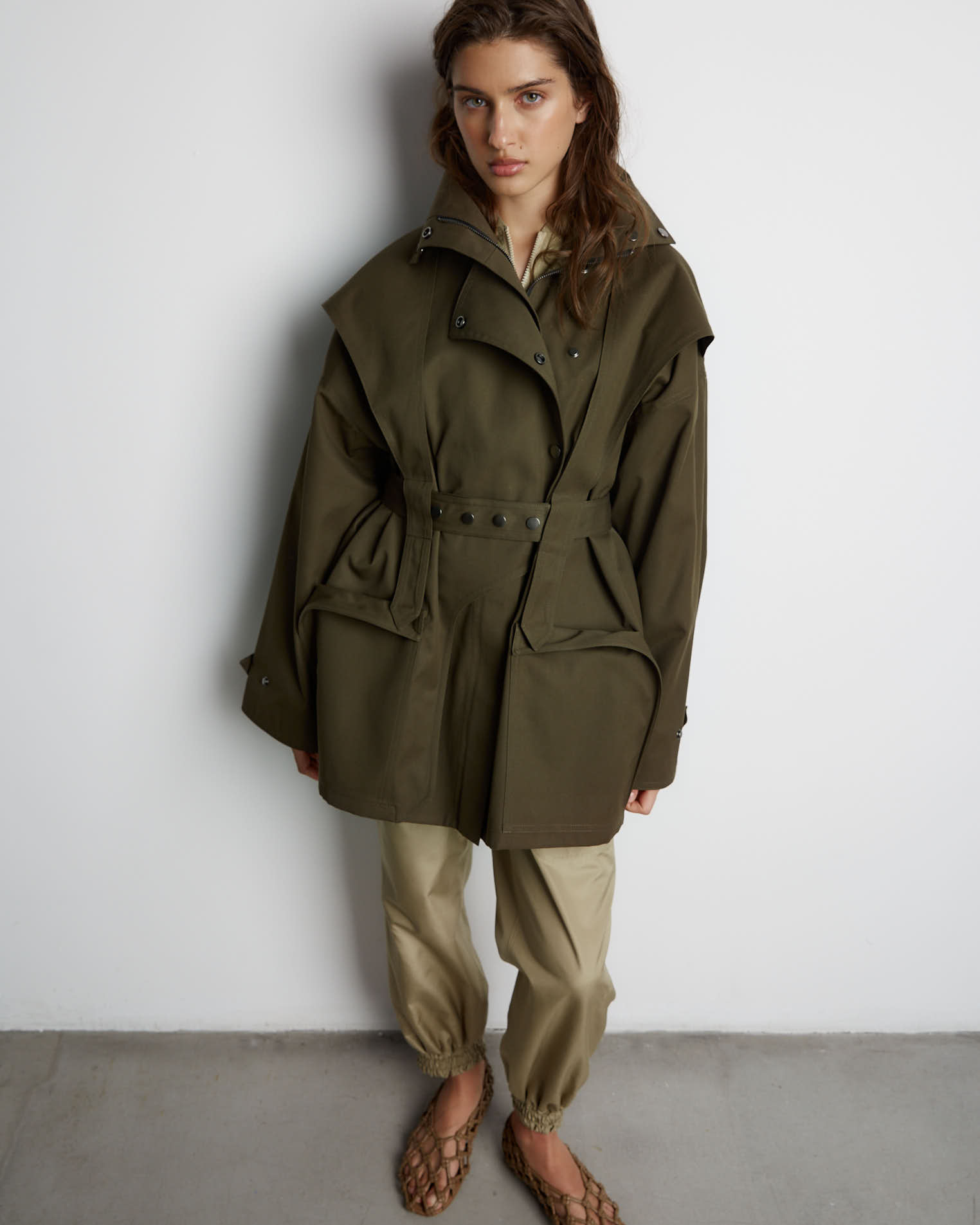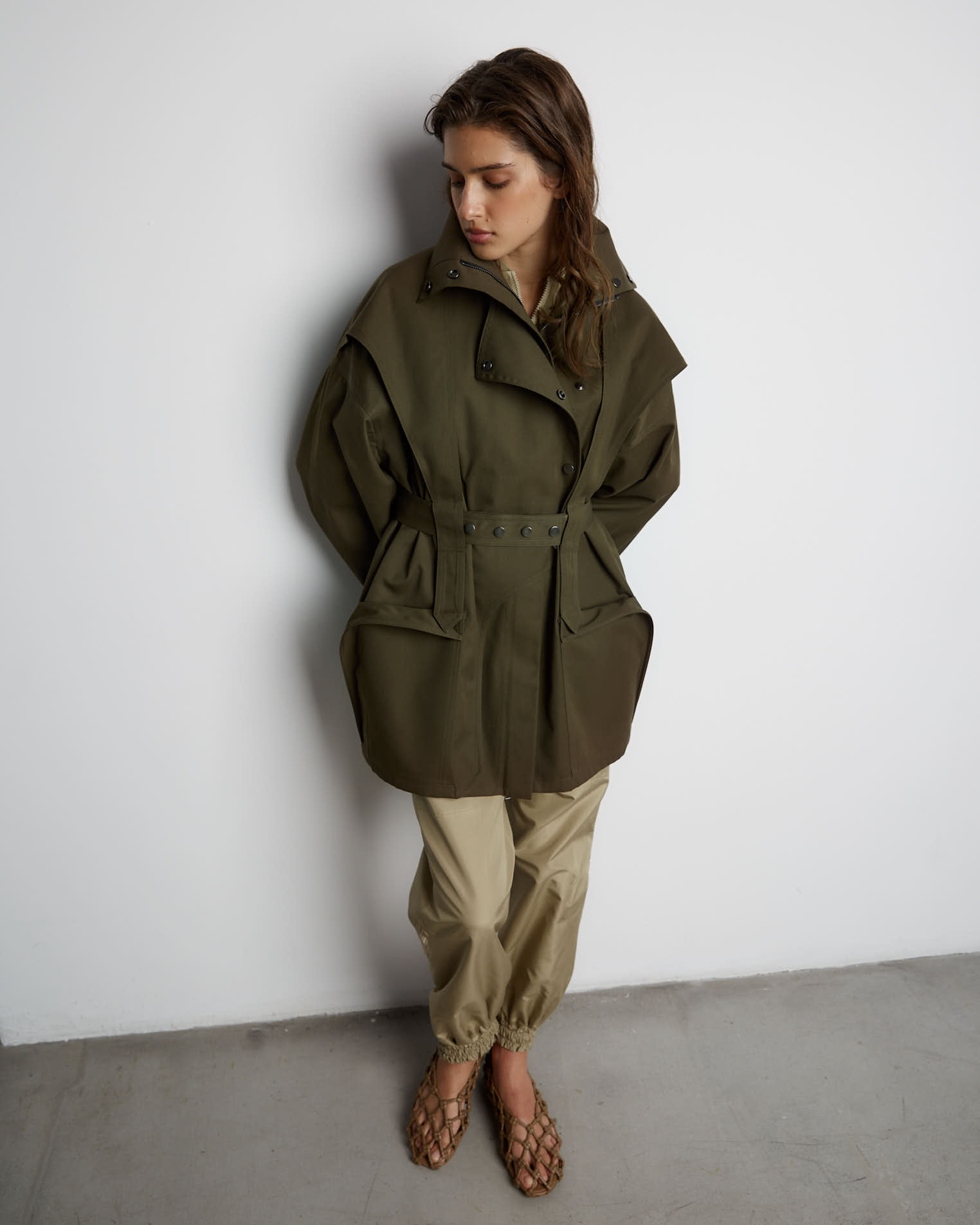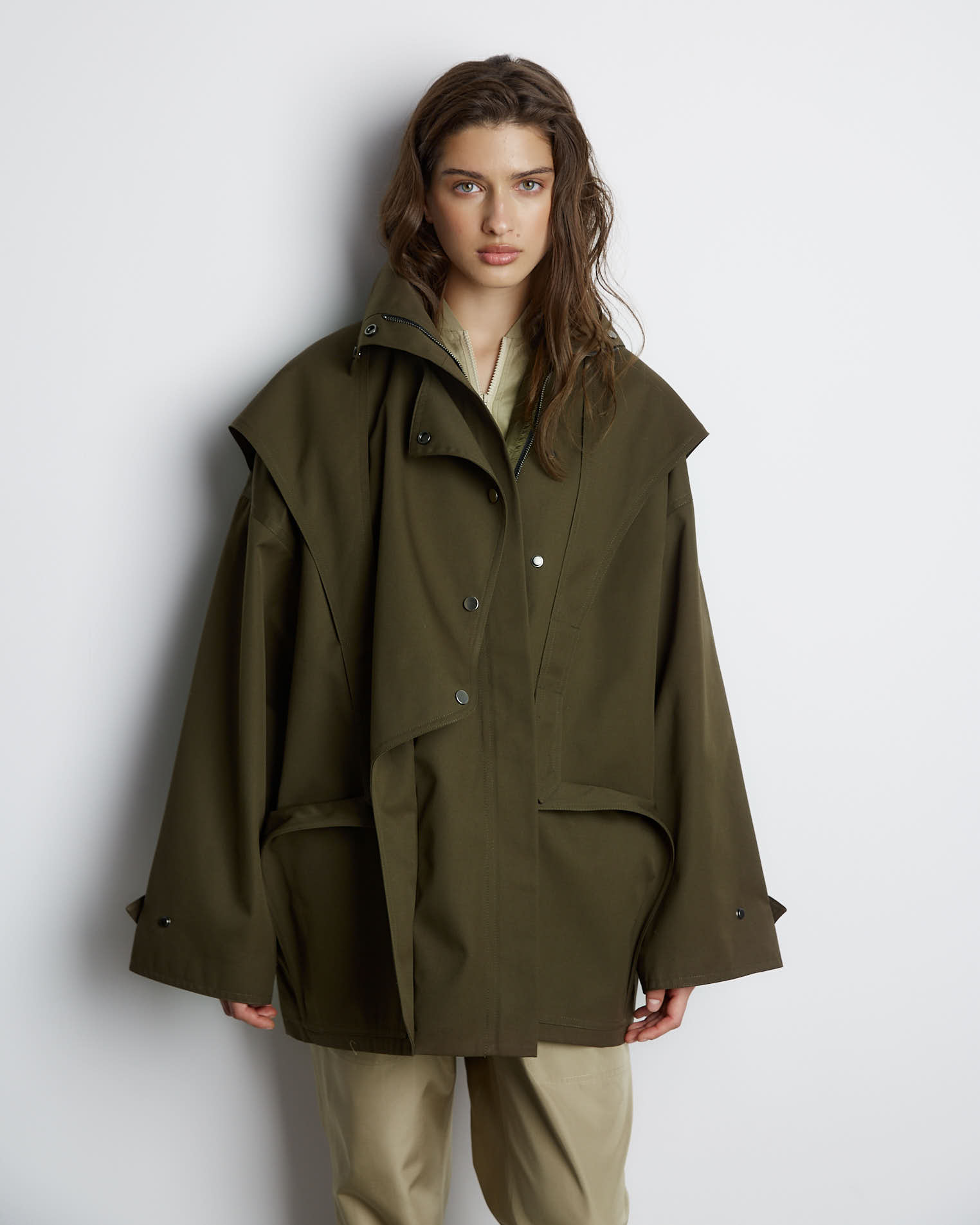 Куртка свободного кроя, застежка-молния, сборка на спине за счет приталенного силуэта. Фигурные элементы, выходящие из плечевого шва, фиксируются на талии поясом. Высокая стойка фиксируется кнопками, на рукавах широкий фигурный хлястик, который регулирует ширину рукава, карманы накладные.