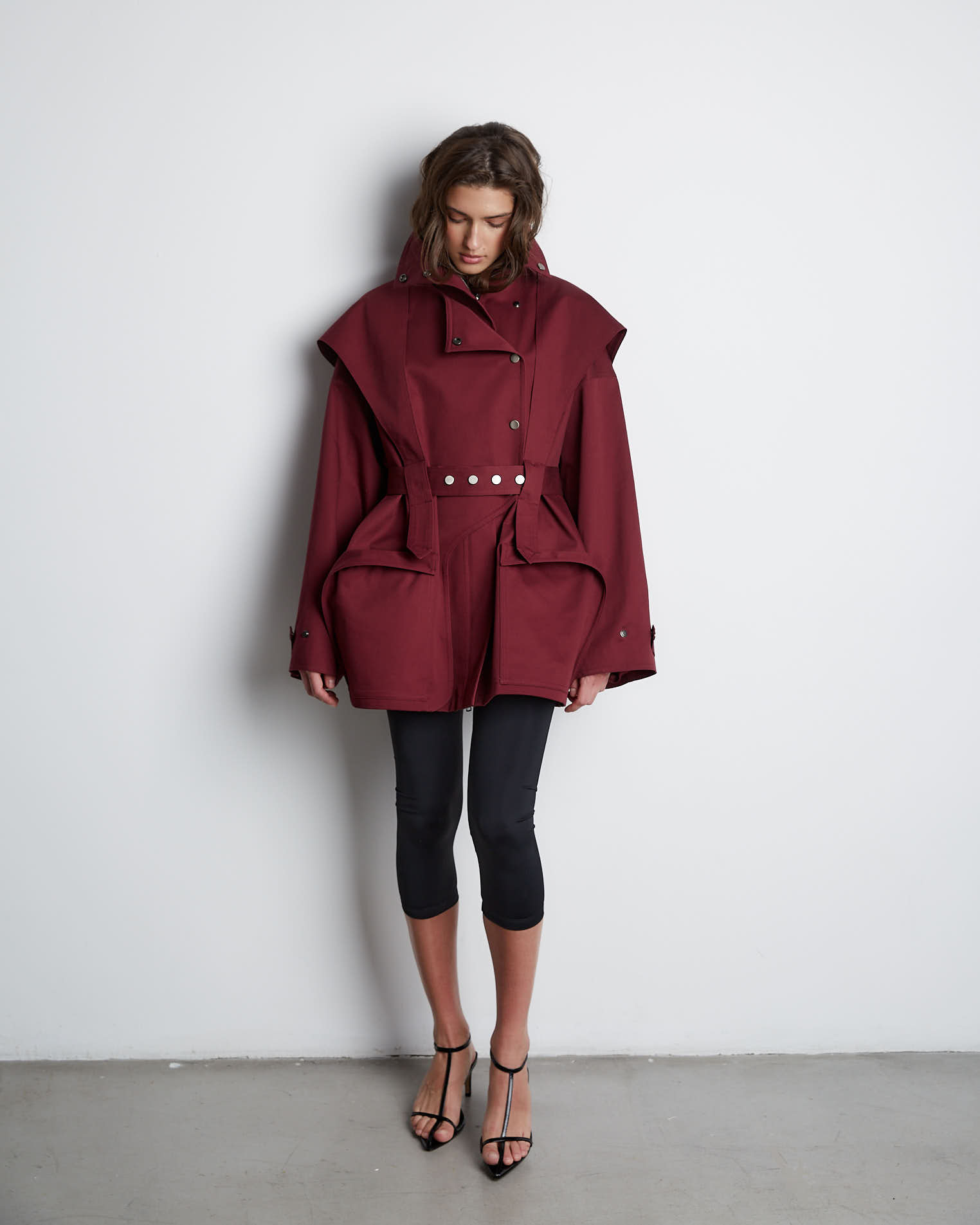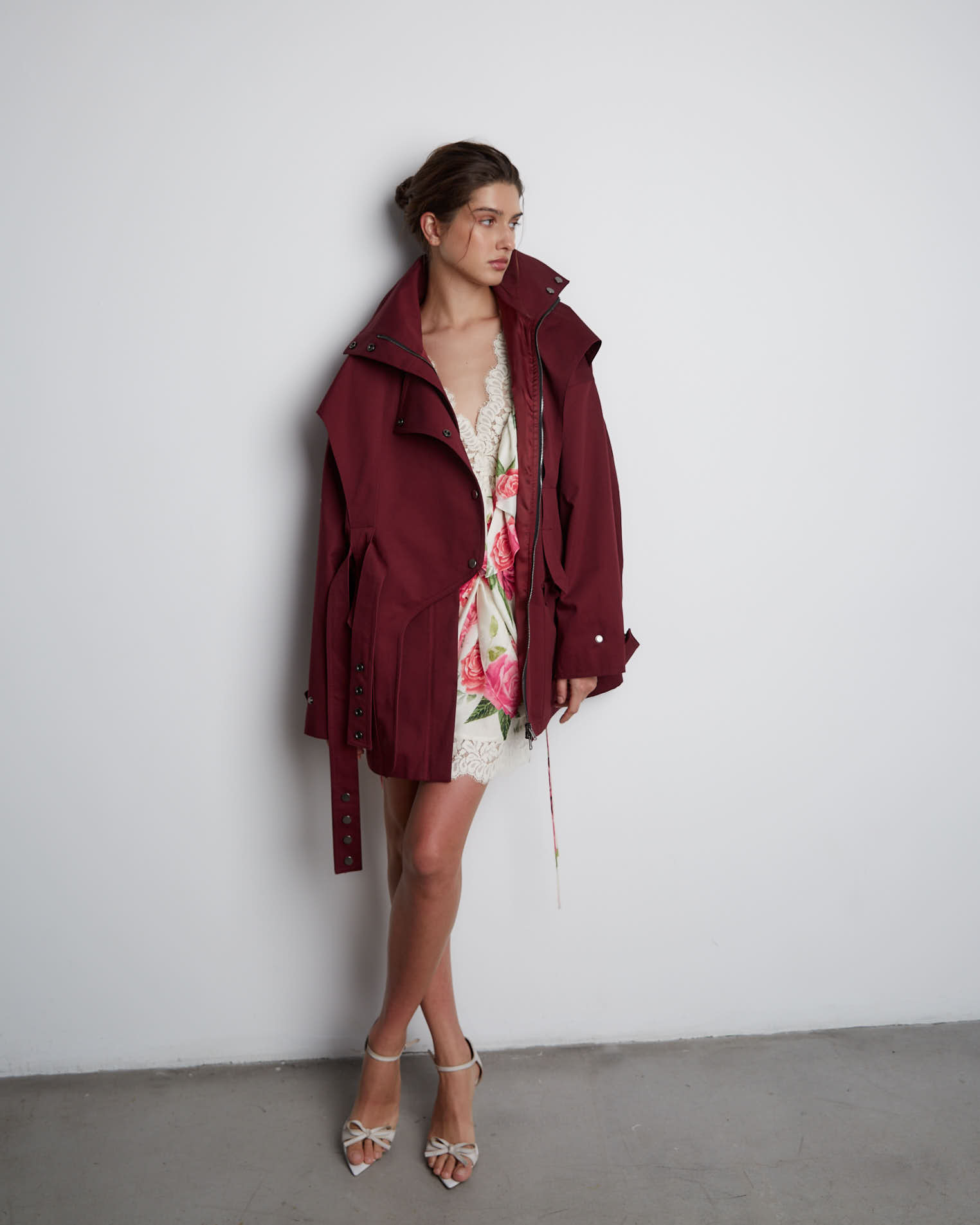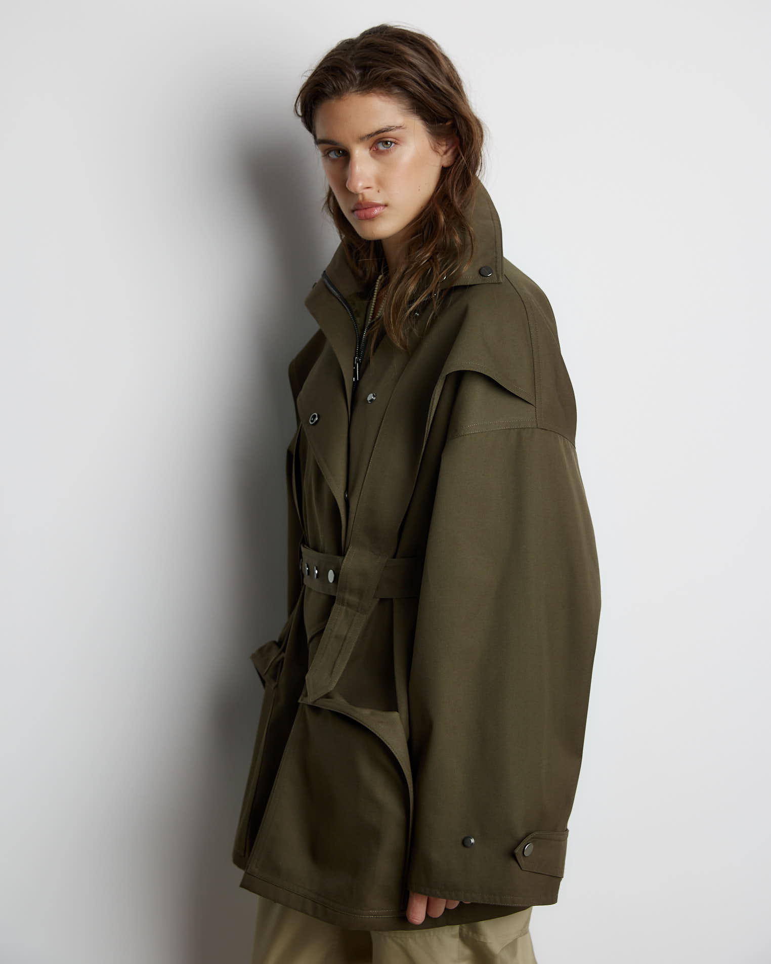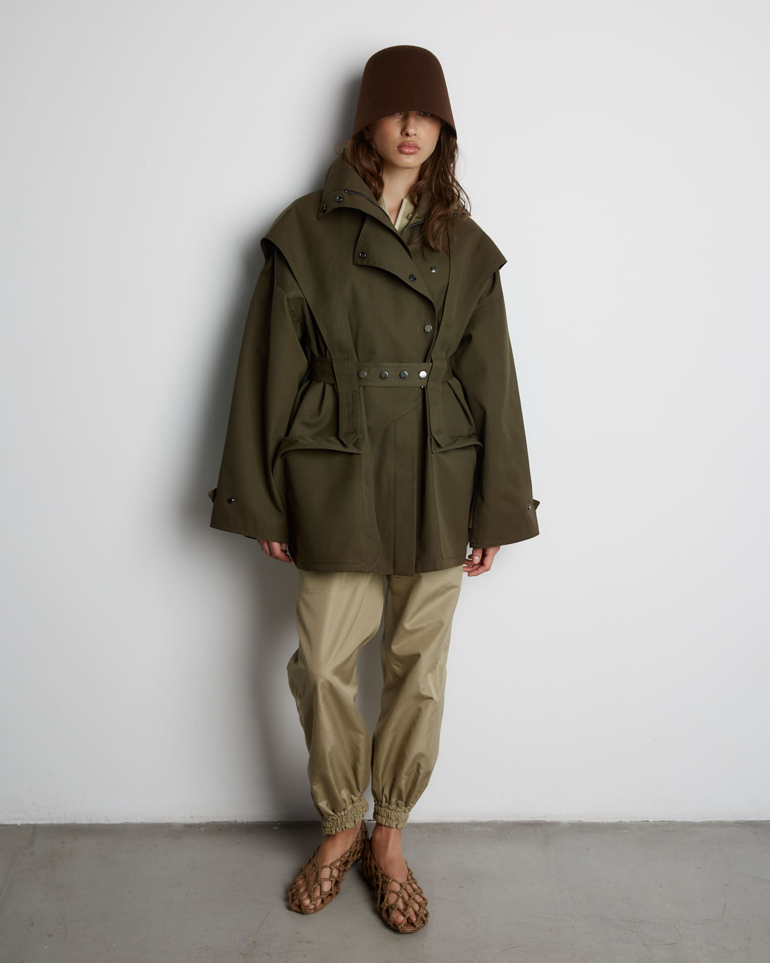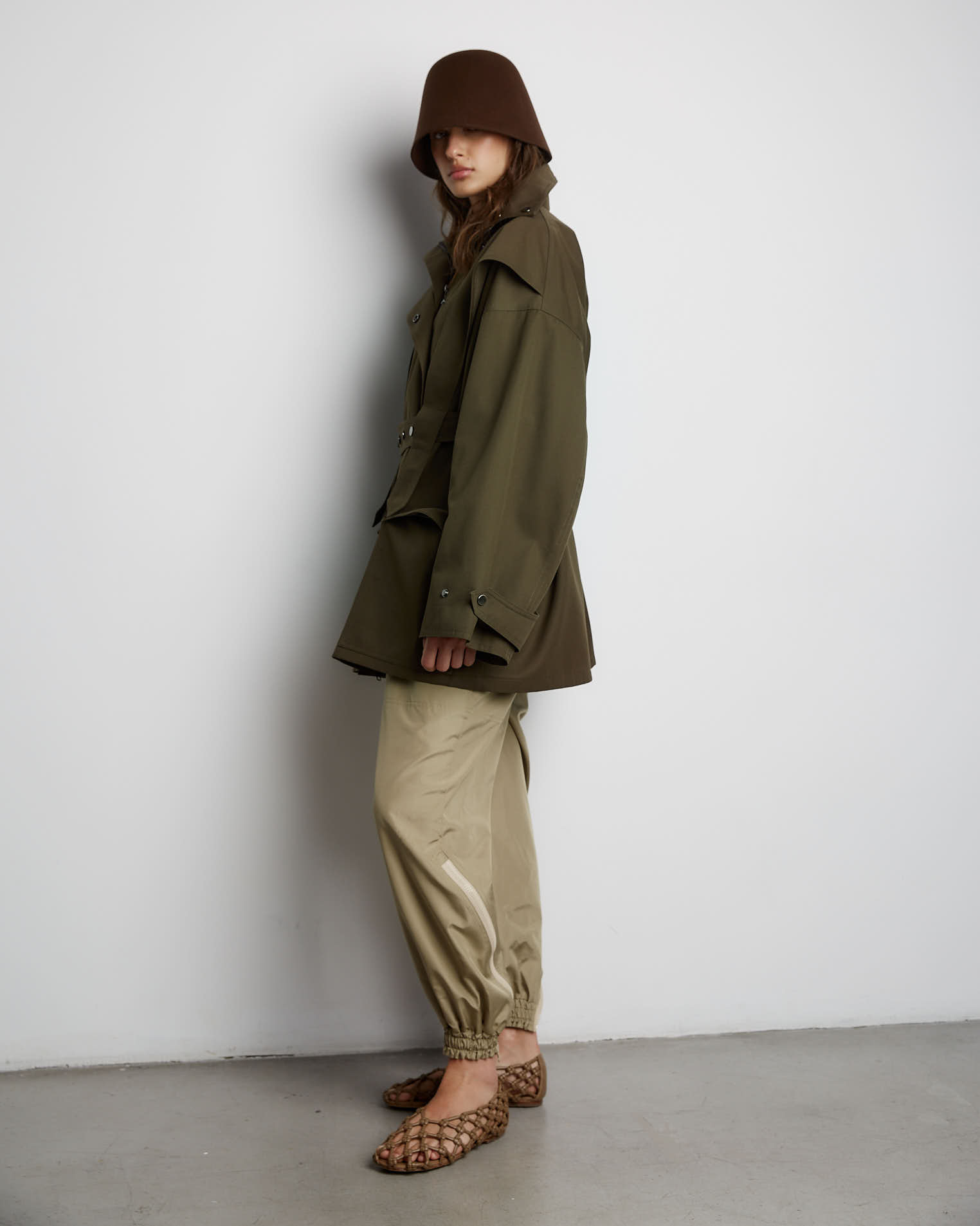 Куртка свободного кроя, застежка-молния, сборка на спине за счет приталенного силуэта. Фигурные элементы, выходящие из плечевого шва, фиксируются на талии поясом. Высокая стойка фиксируется кнопками, на рукавах широкий фигурный хлястик, который регулирует ширину рукава, карманы накладные.