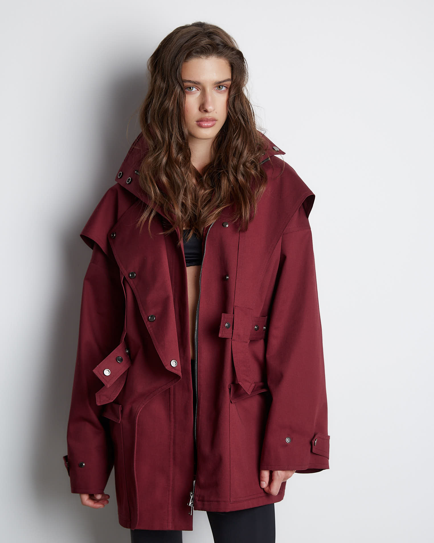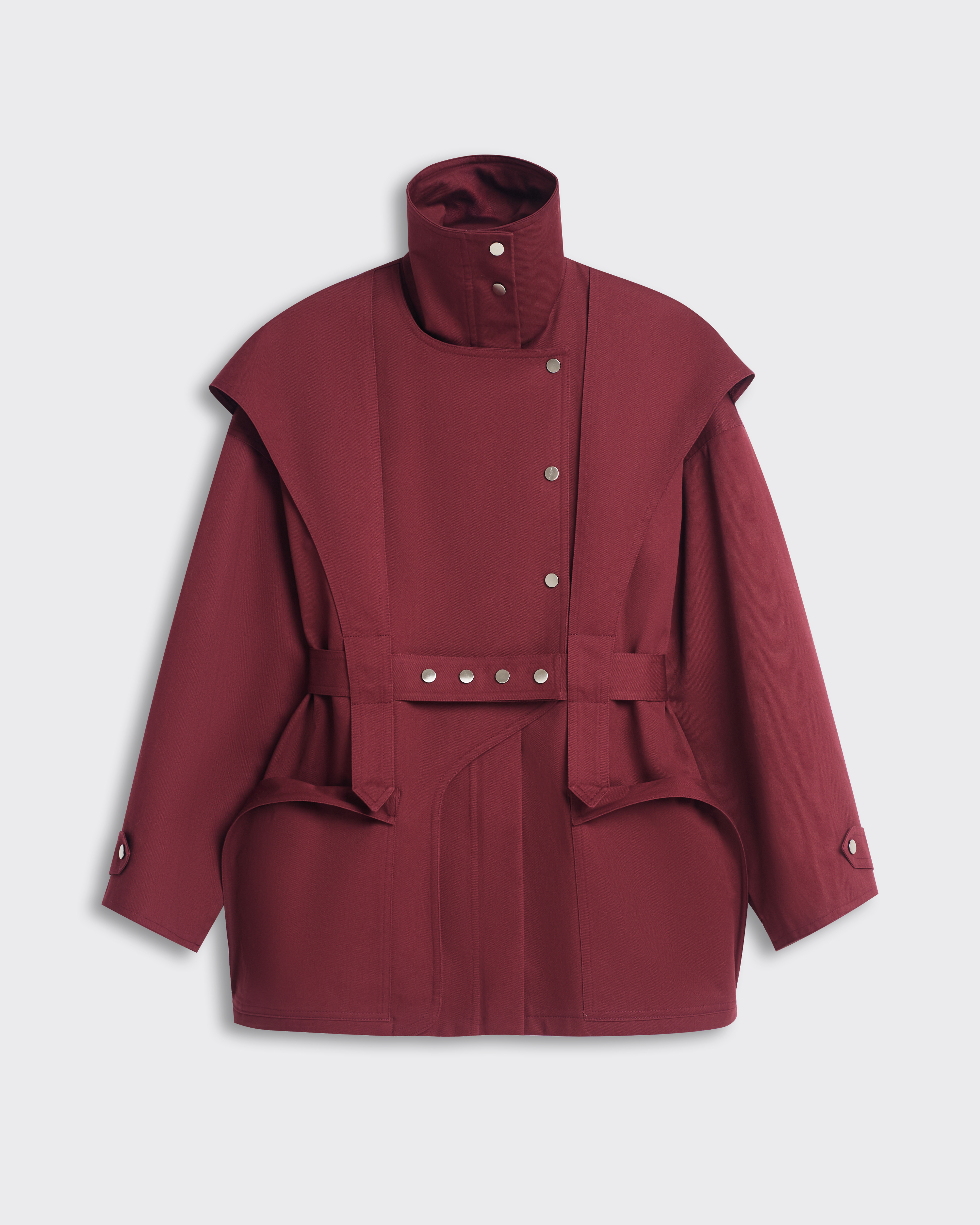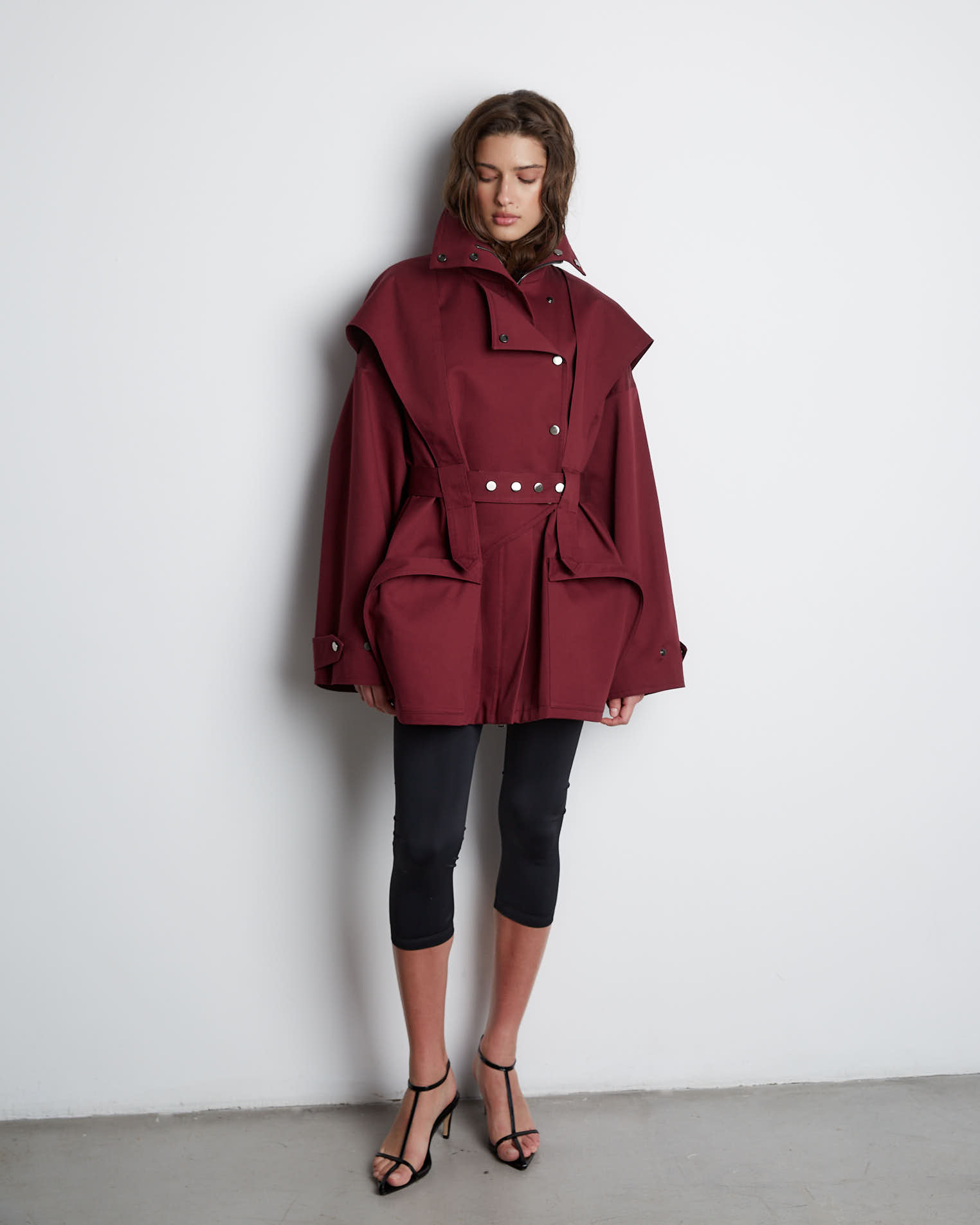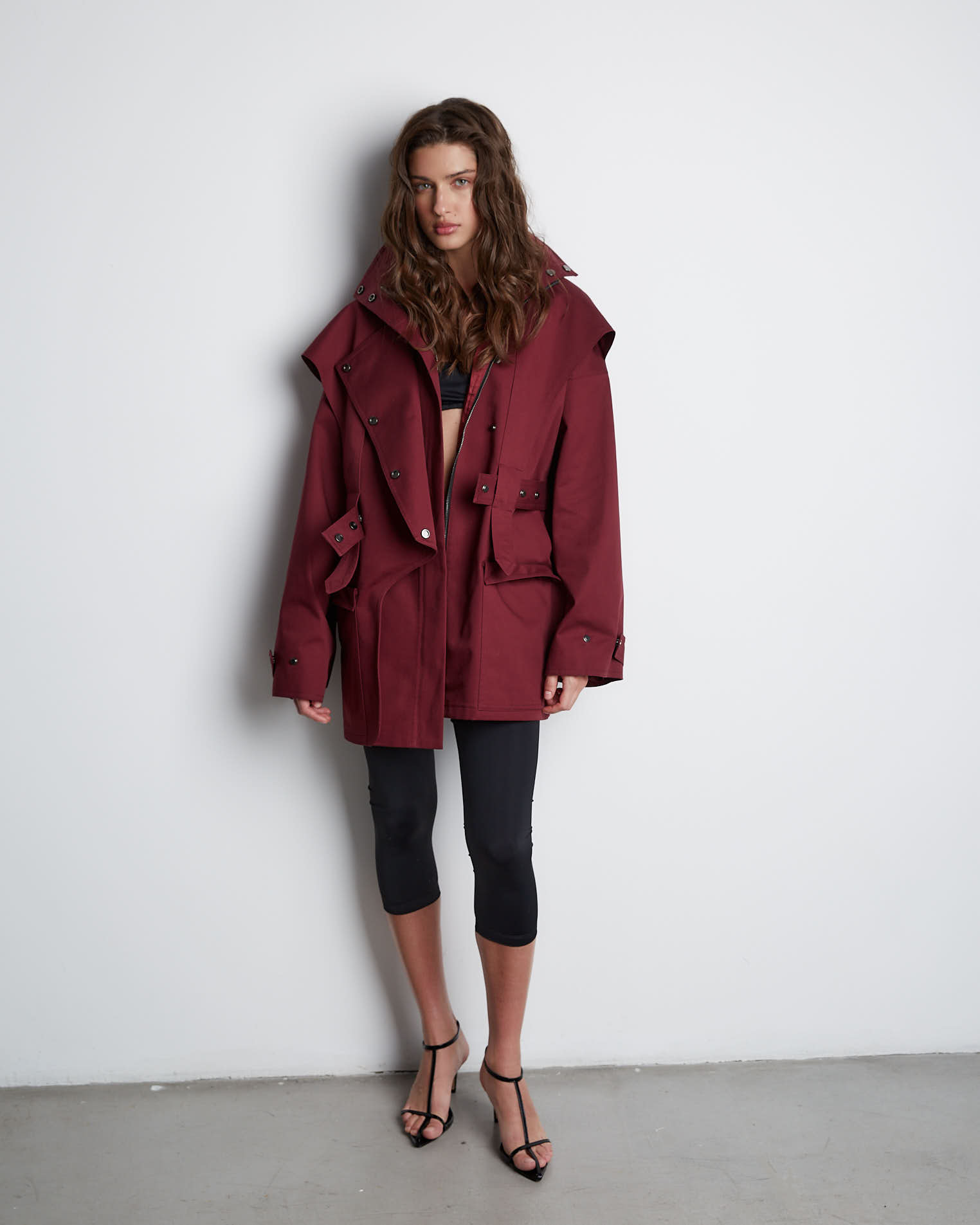 Куртка свободного кроя, застежка-молния, сборка на спине за счет приталенного силуэта. Фигурные элементы, выходящие из плечевого шва, фиксируются на талии поясом. Высокая стойка фиксируется кнопками, на рукавах широкий фигурный хлястик, который регулирует ширину рукава, карманы накладные.
