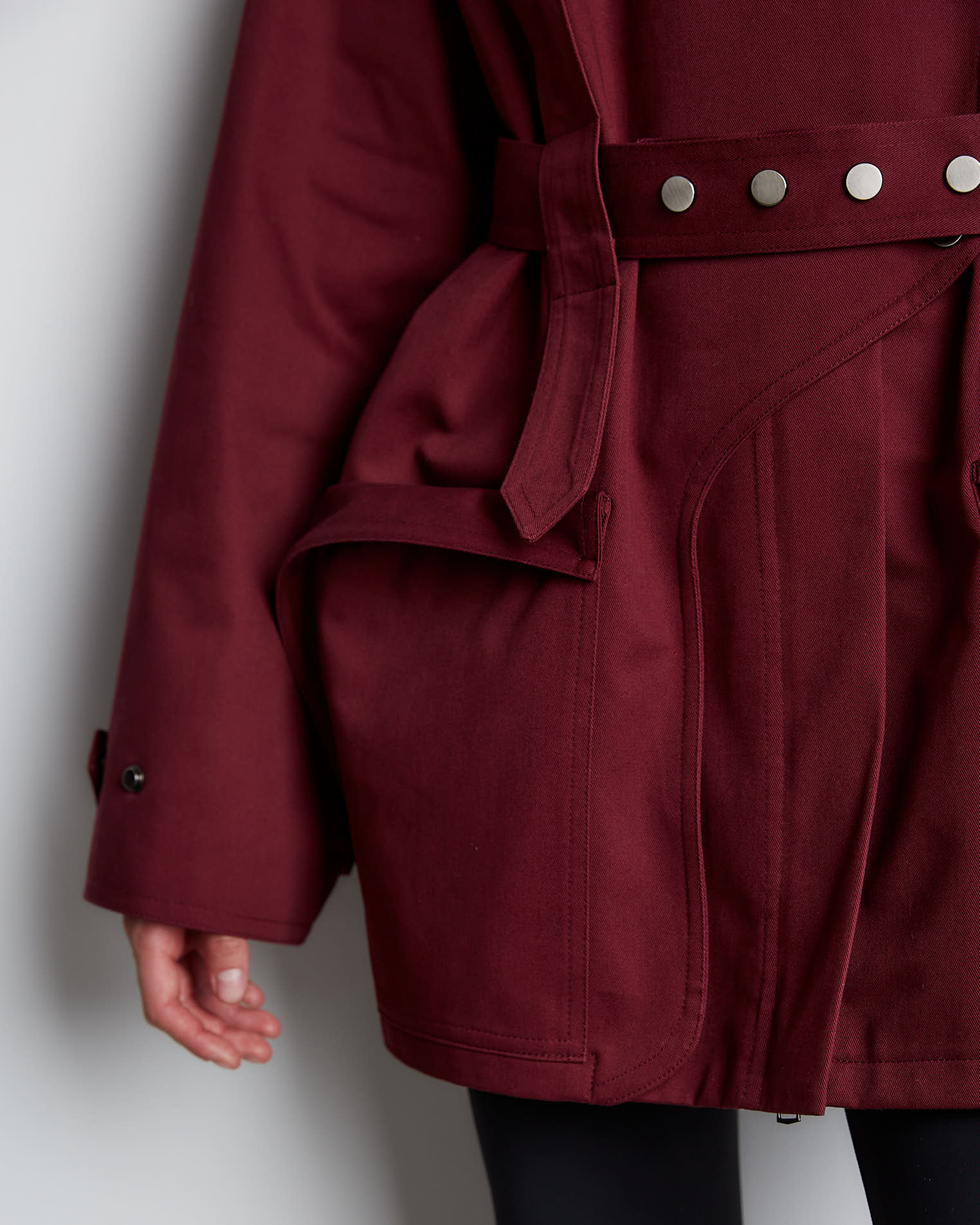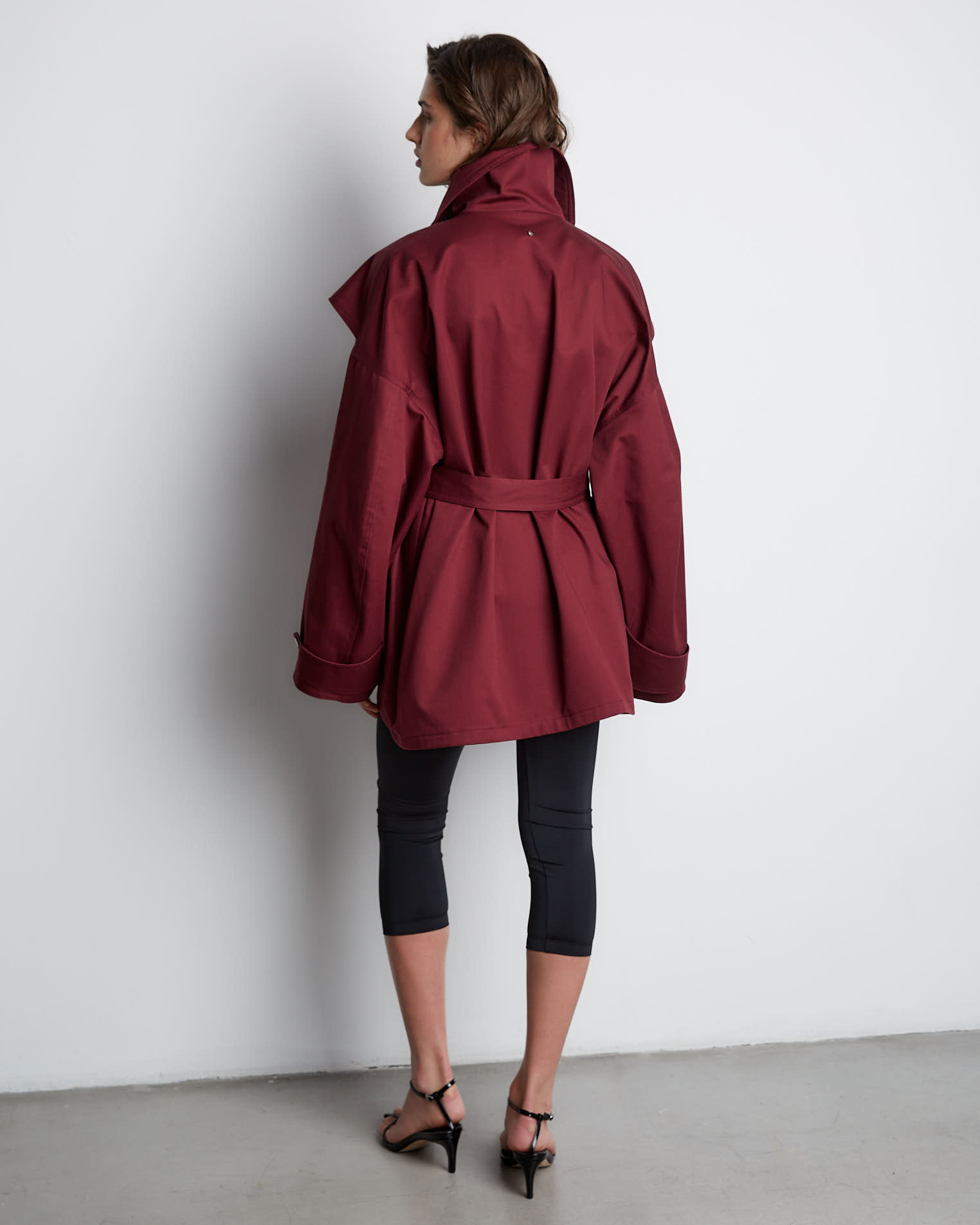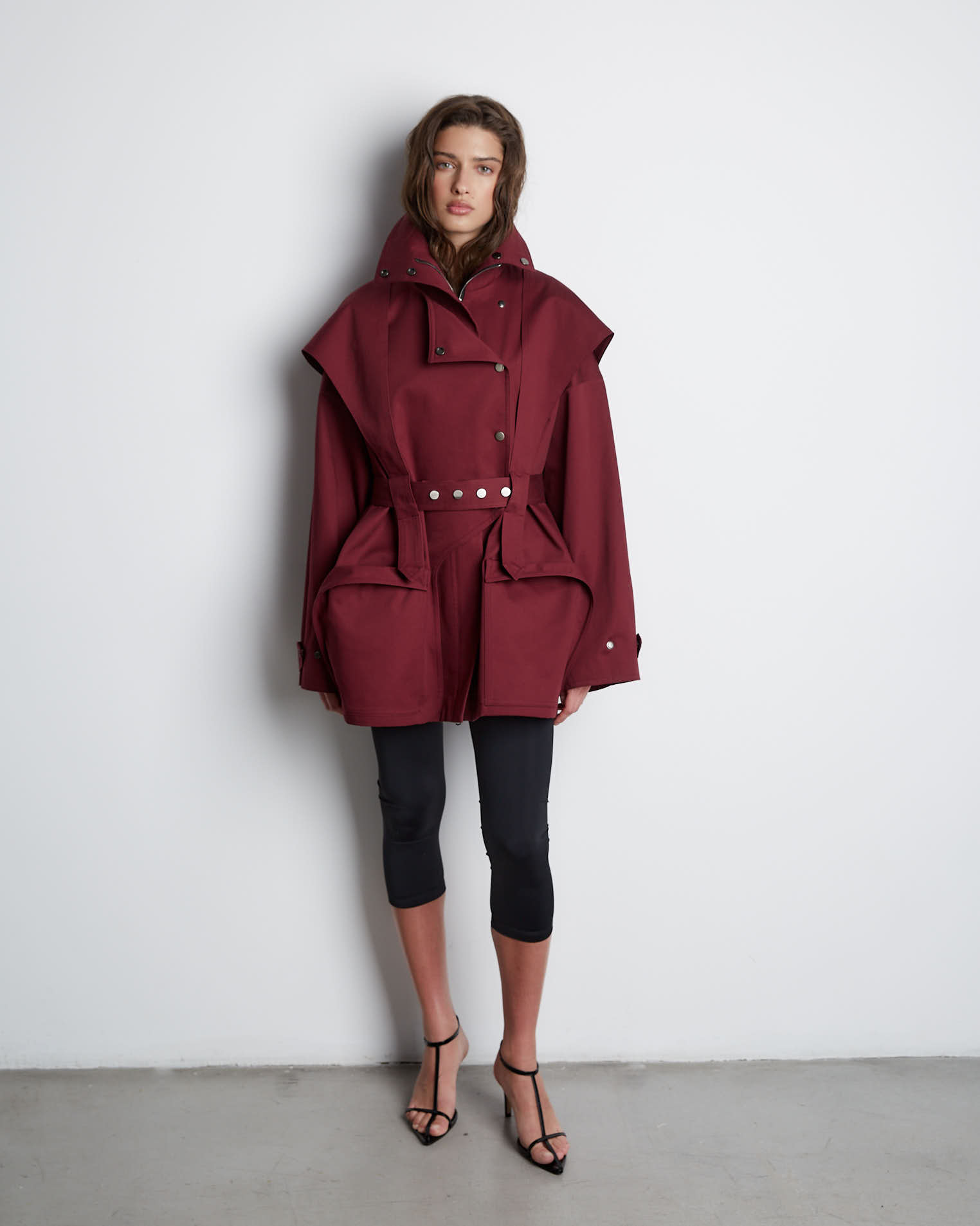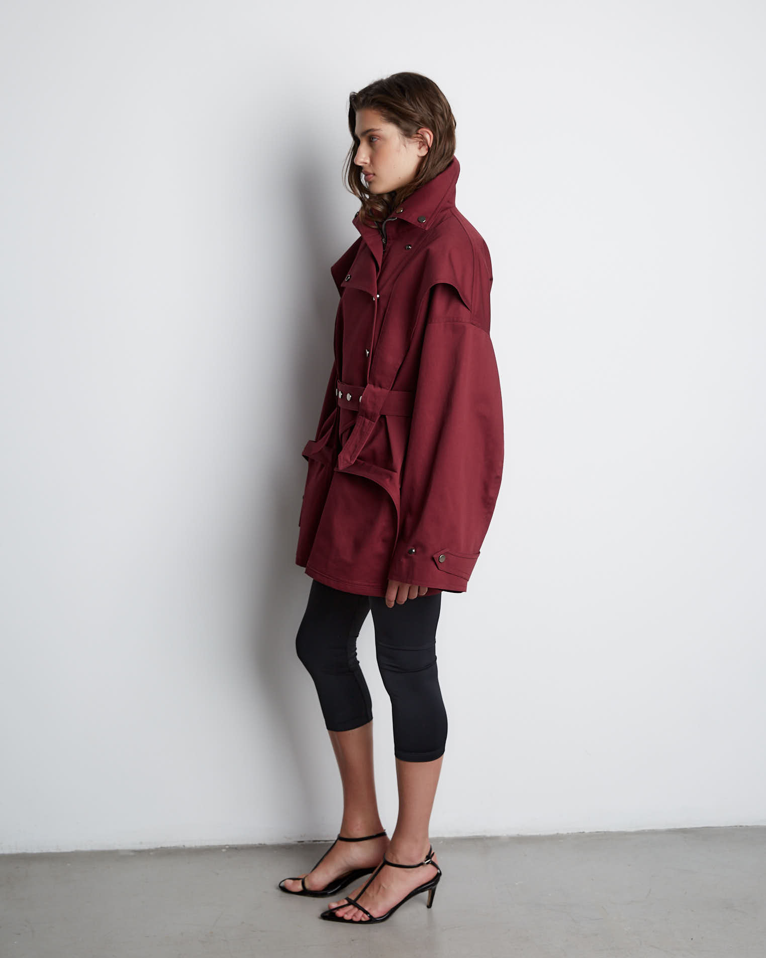 Куртка свободного кроя, застежка-молния, сборка на спине за счет приталенного силуэта. Фигурные элементы, выходящие из плечевого шва, фиксируются на талии поясом. Высокая стойка фиксируется кнопками, на рукавах широкий фигурный хлястик, который регулирует ширину рукава, карманы накладные.