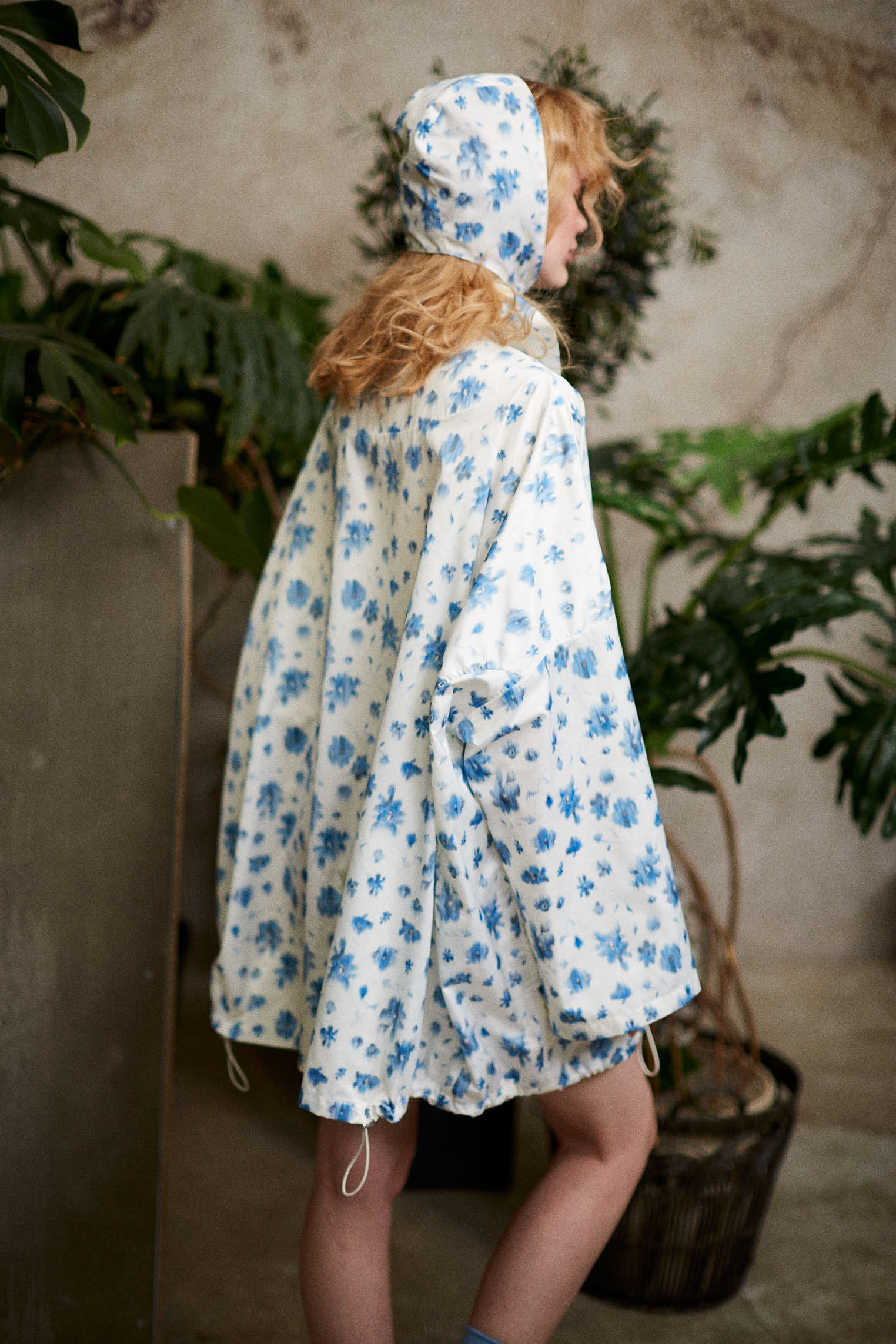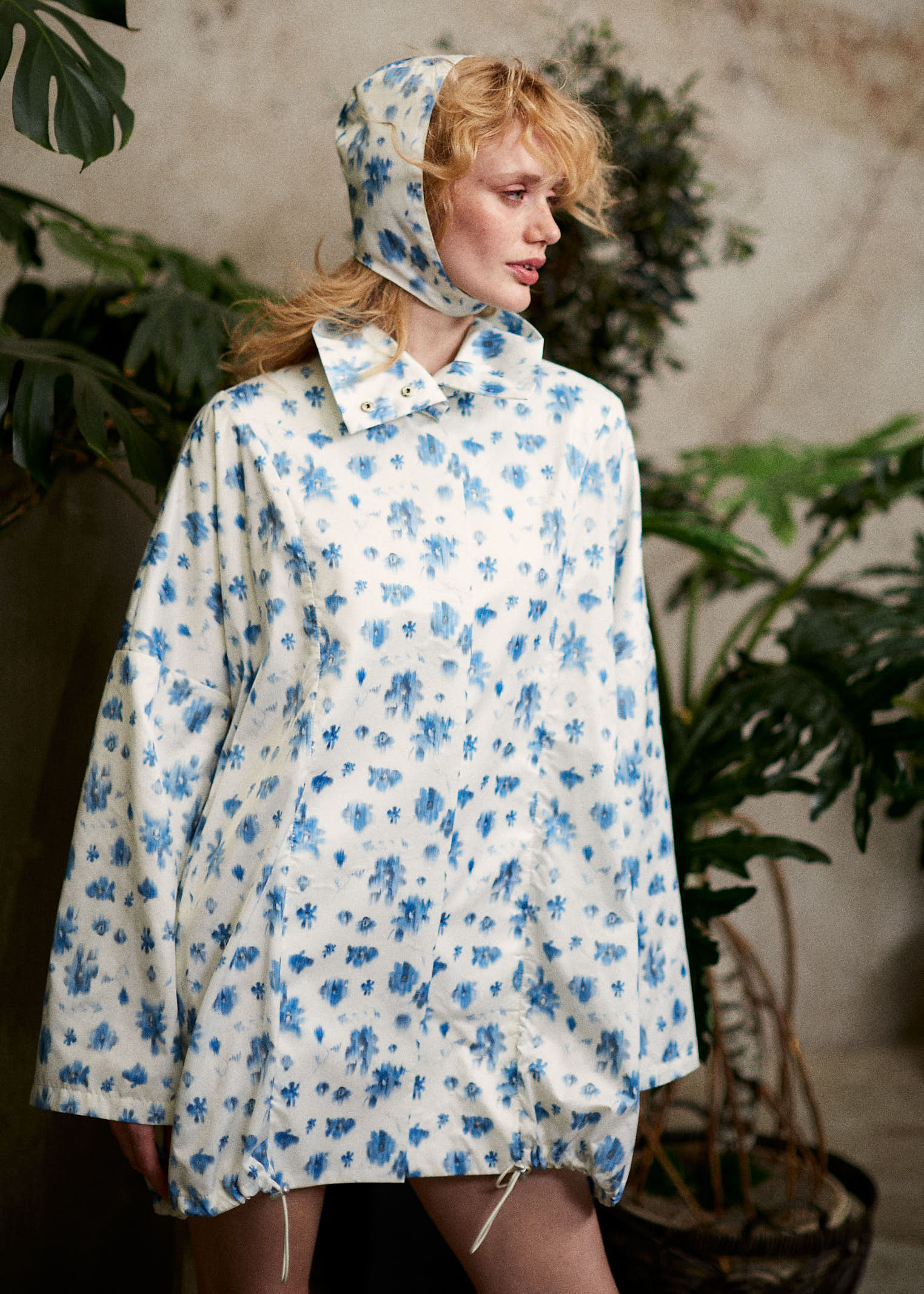 Непромокаемая ветровка в молочном цвете с голубыми цветами станет идеальным выбором для весеннего гардероба.
