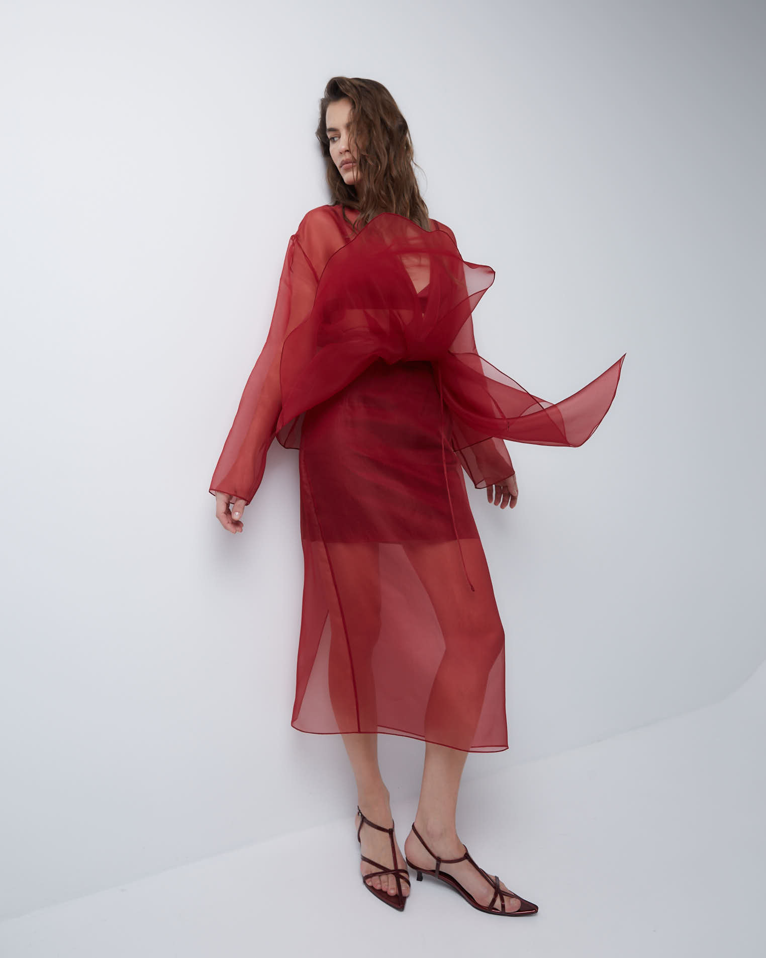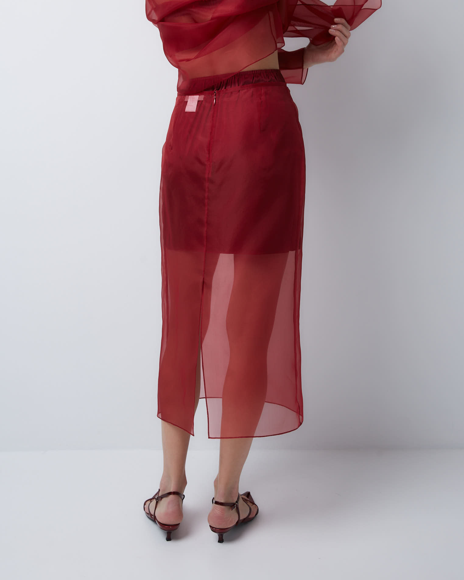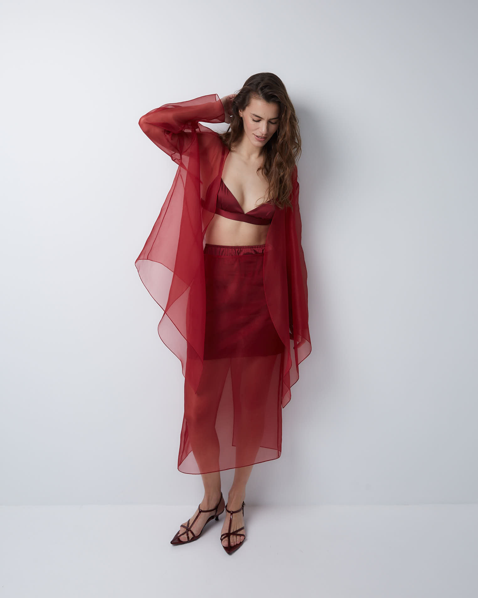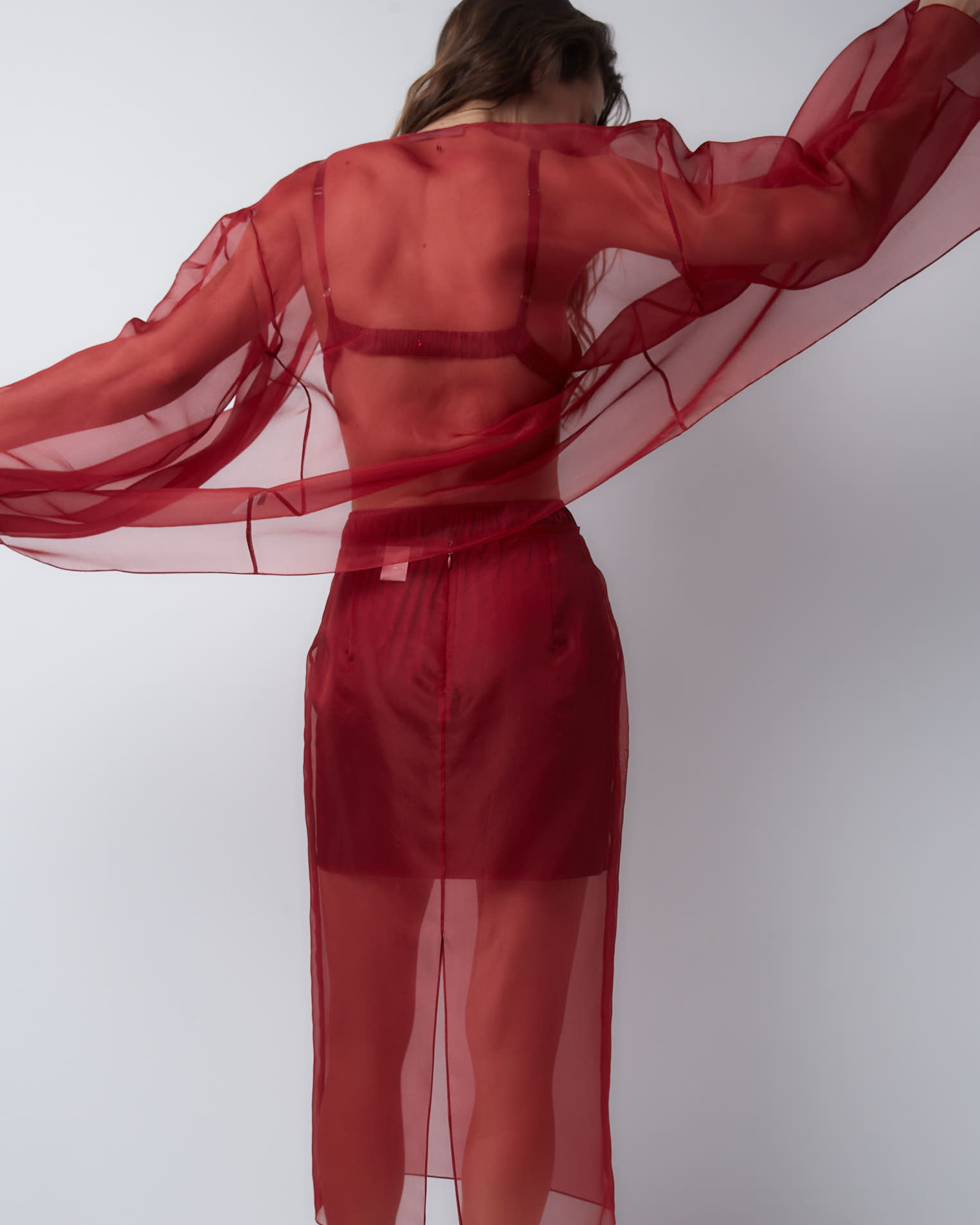 Модель прямого кроя из полупрозрачной органзы может стать оригинальным аналогом классической юбки, под низ рекомендуем надеть боди или комбинацию.
