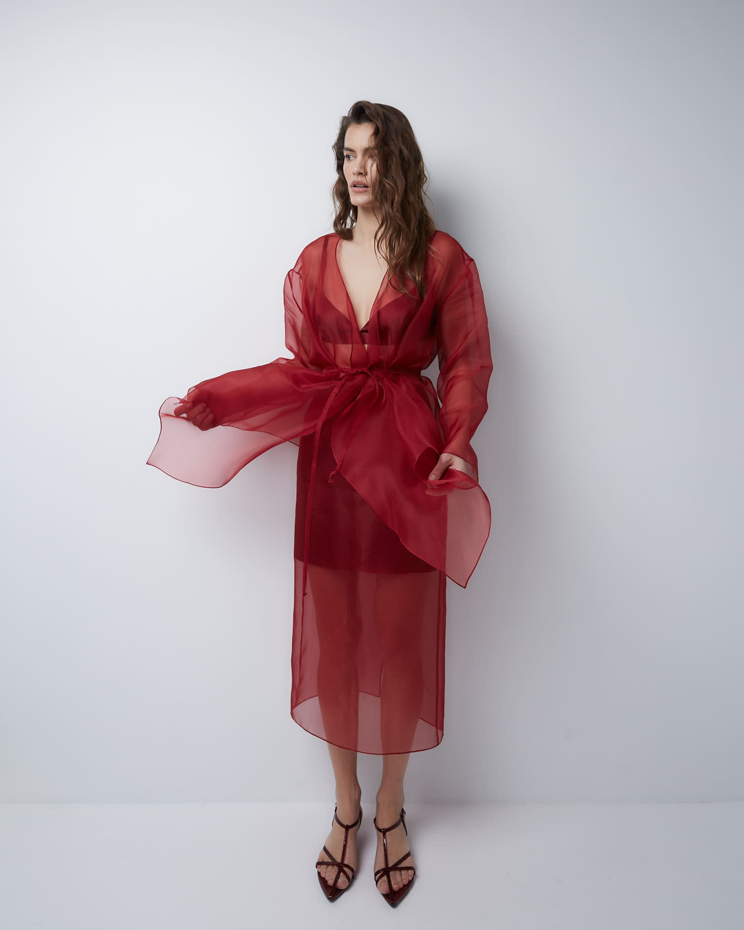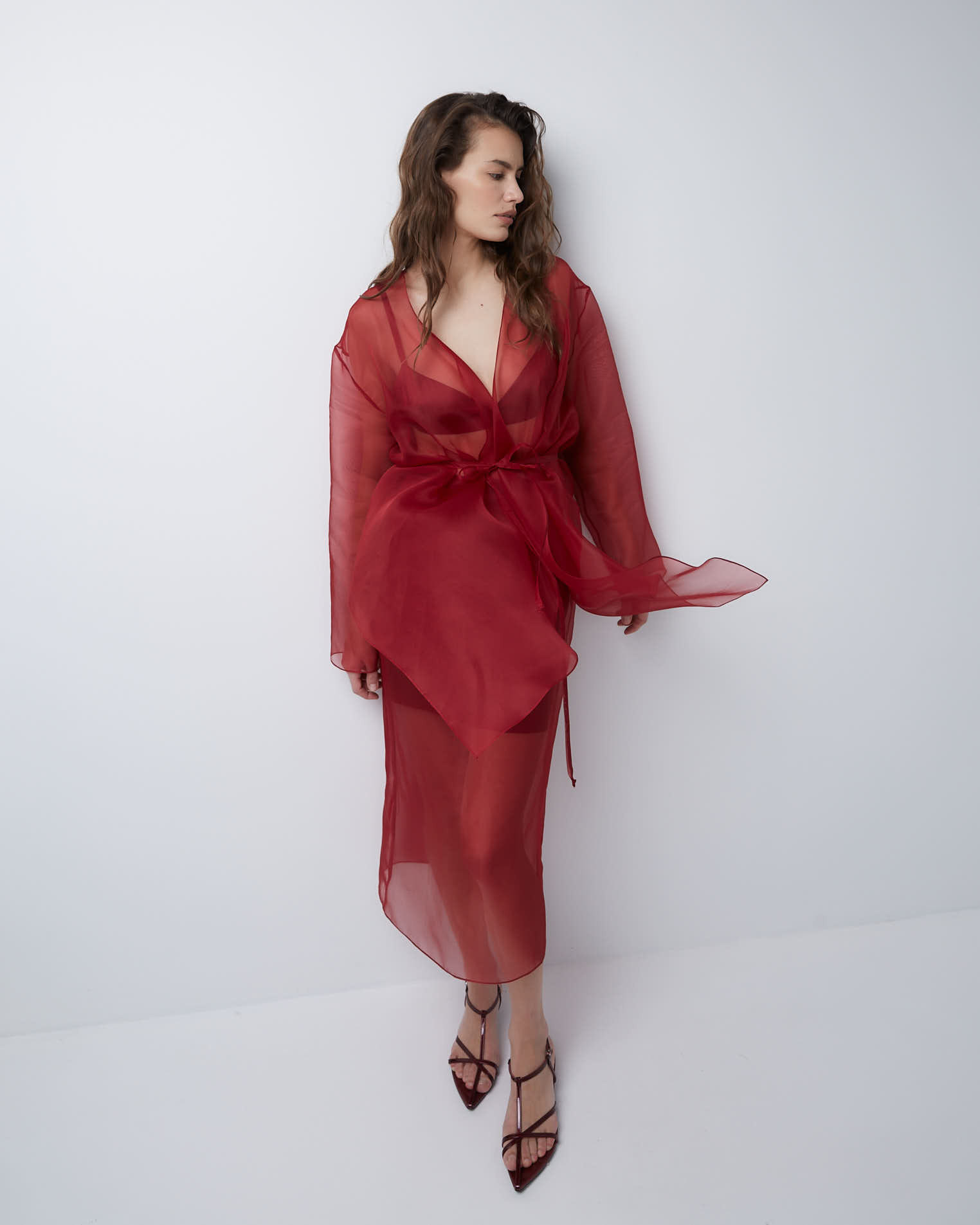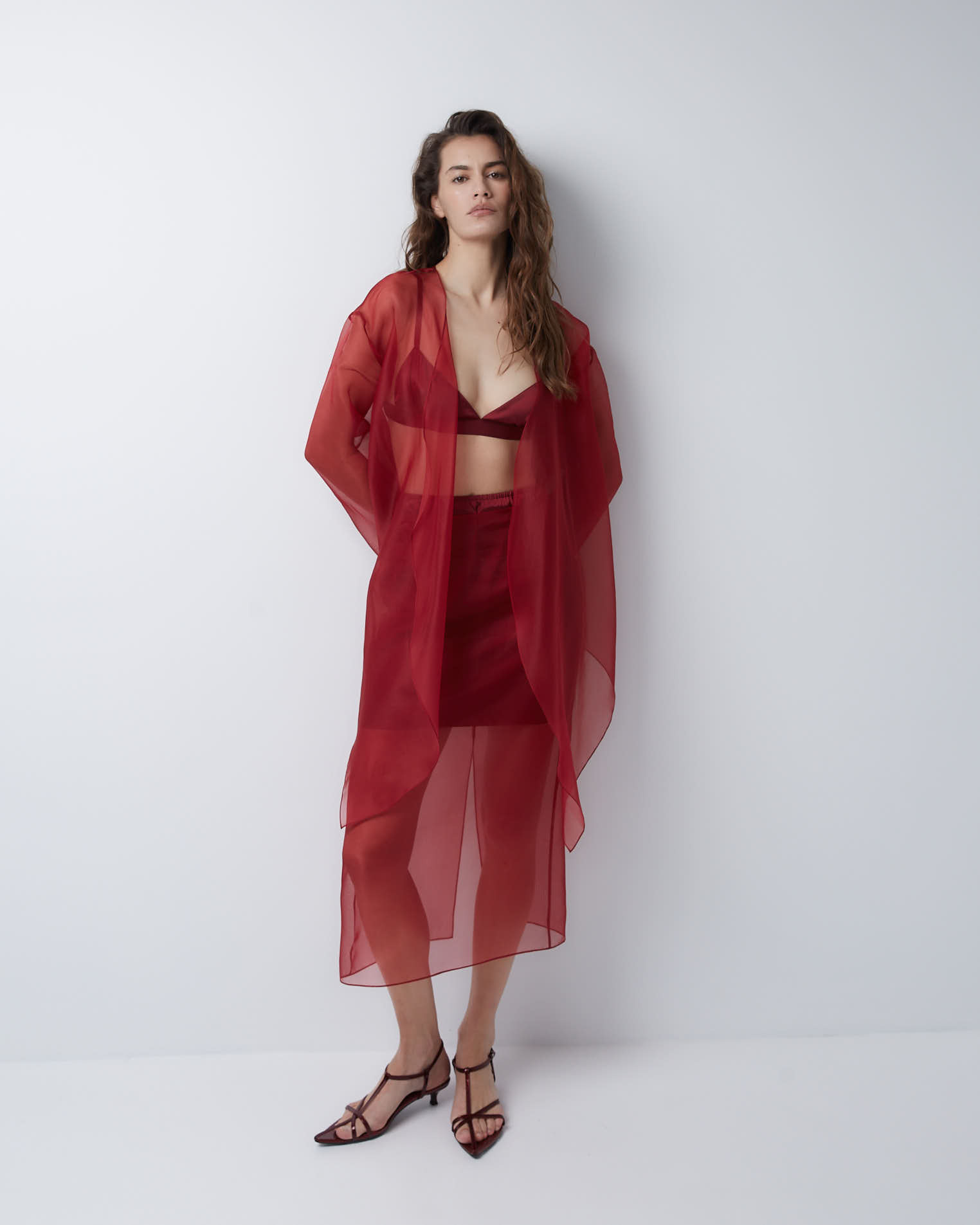 Модель прямого кроя из полупрозрачной органзы может стать оригинальным аналогом классической юбки, под низ рекомендуем надеть боди или комбинацию.