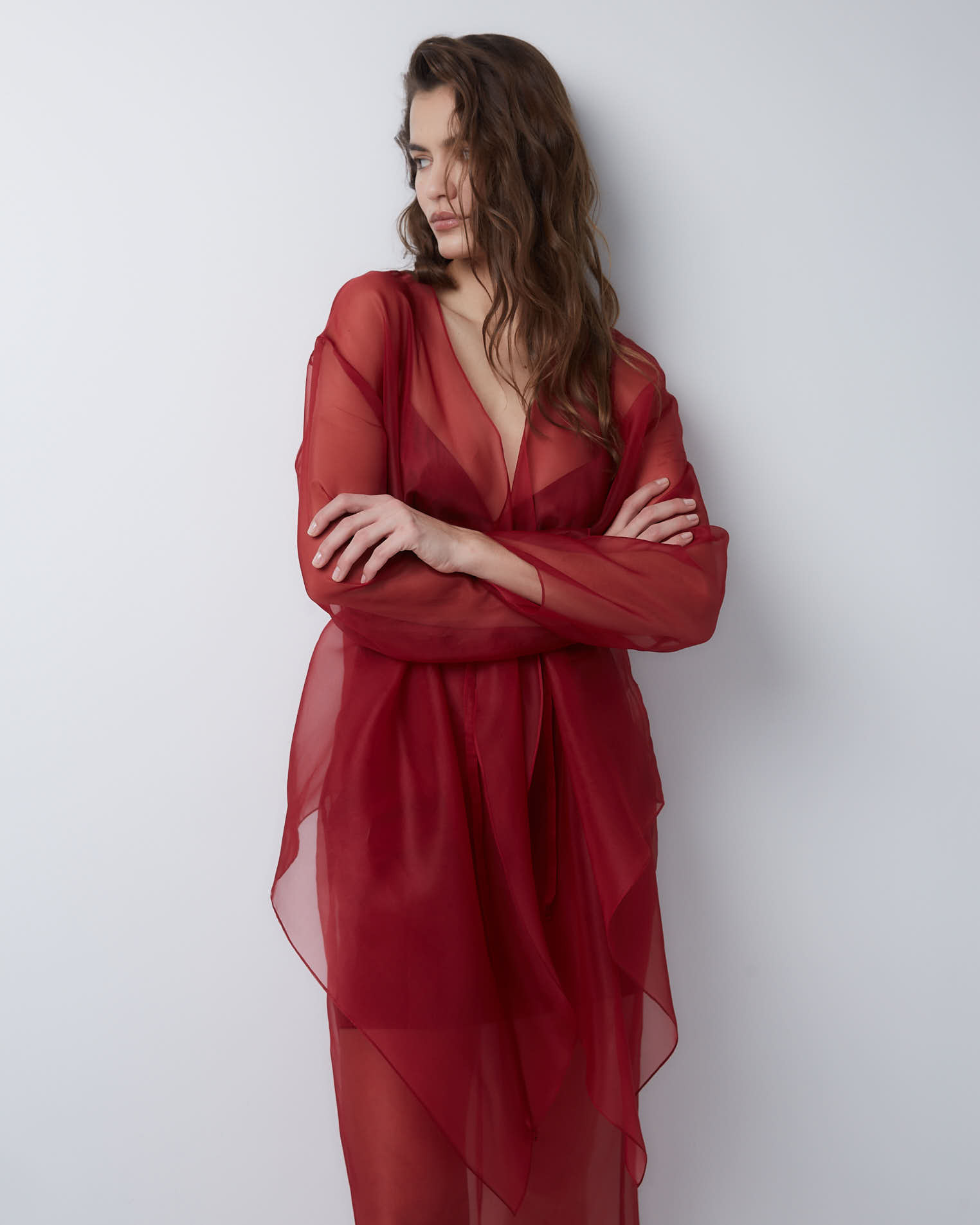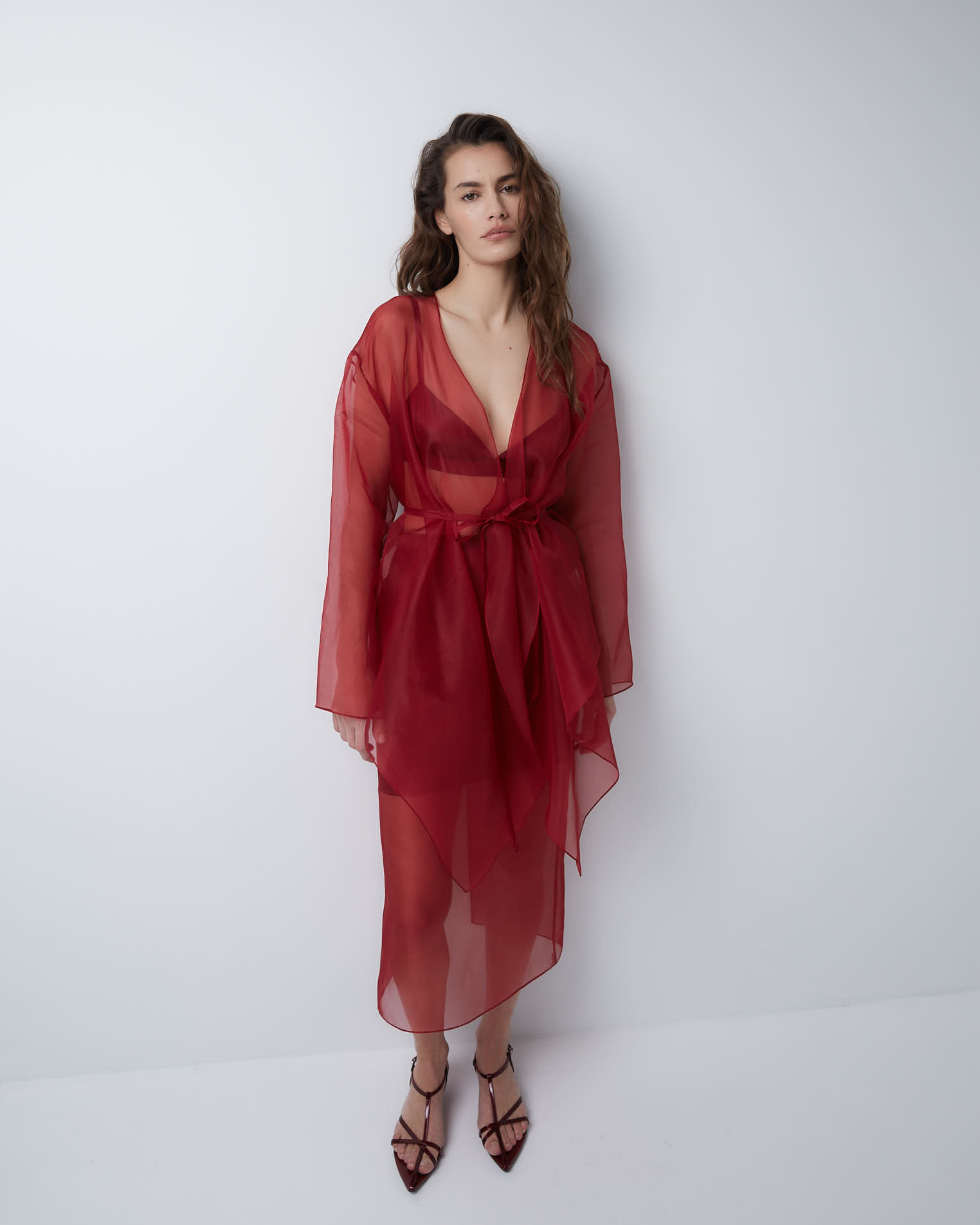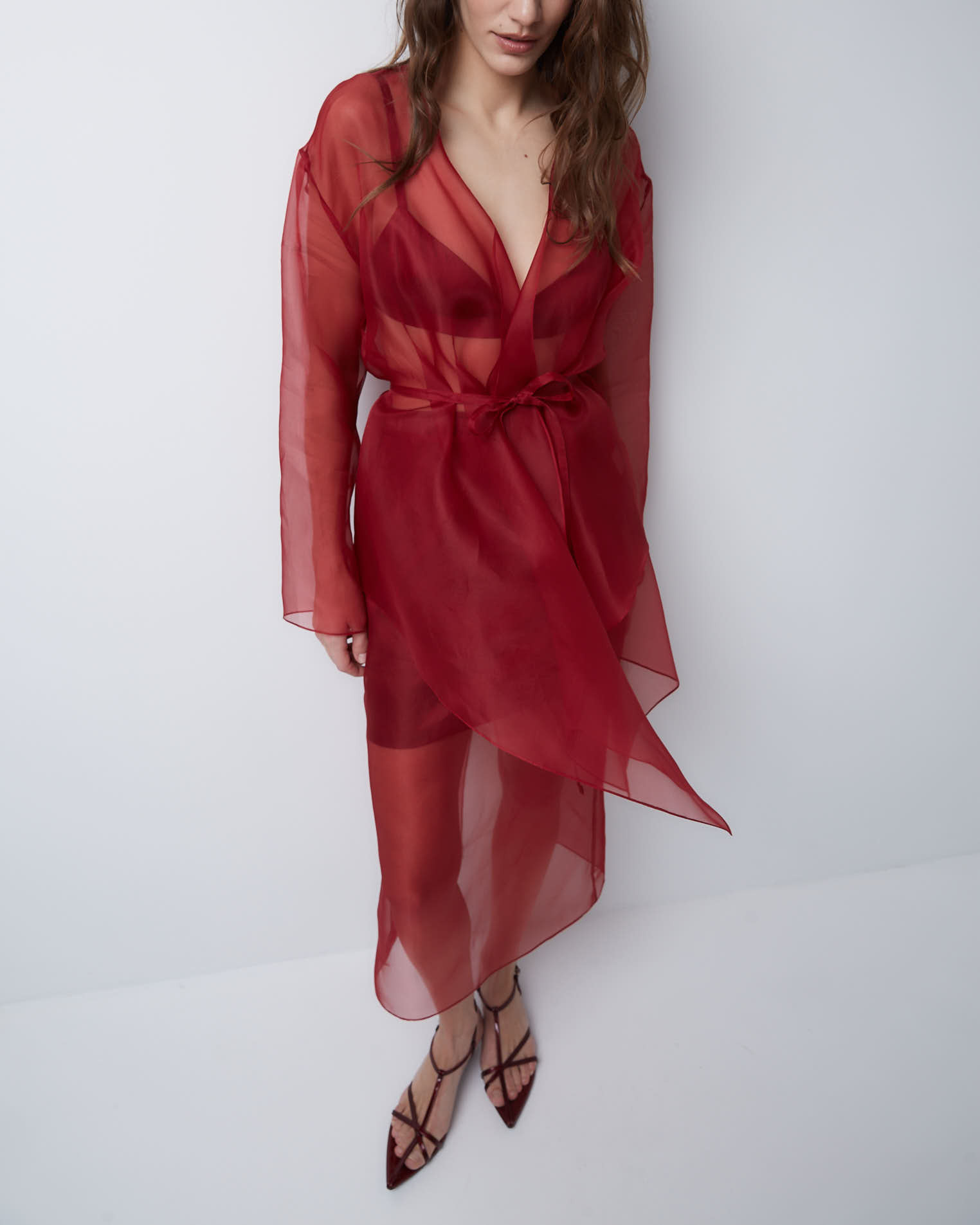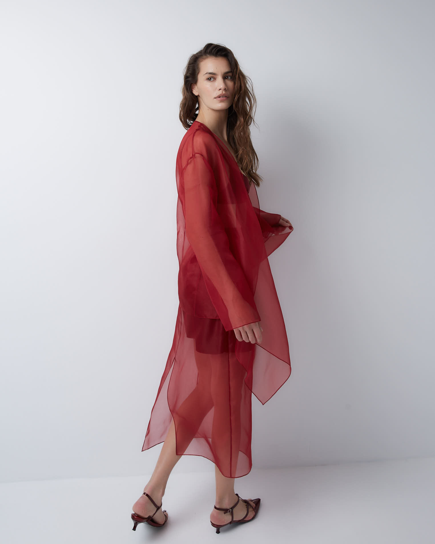 Модель прямого кроя из полупрозрачной органзы может стать оригинальным аналогом классической юбки, под низ рекомендуем надеть боди или комбинацию.
