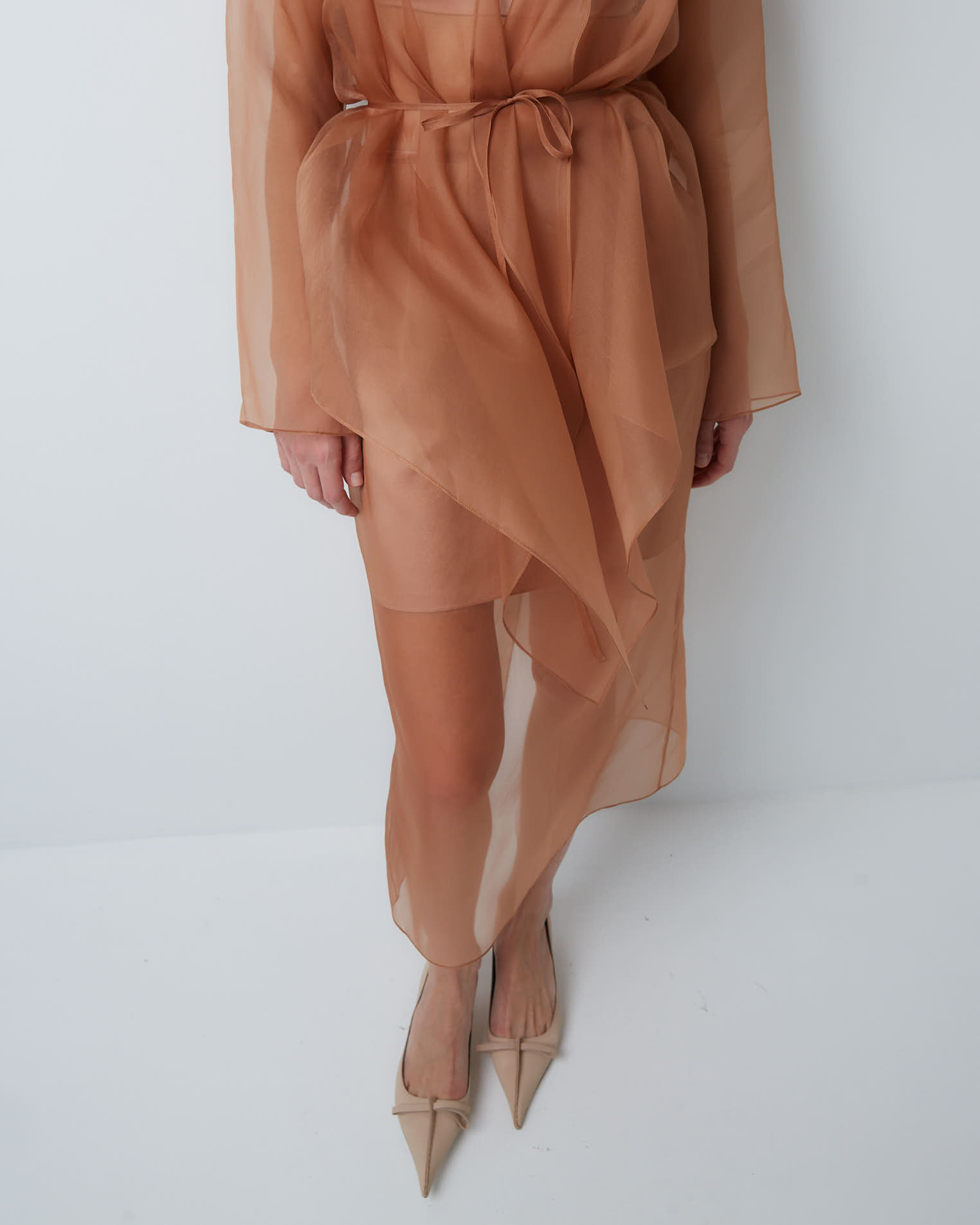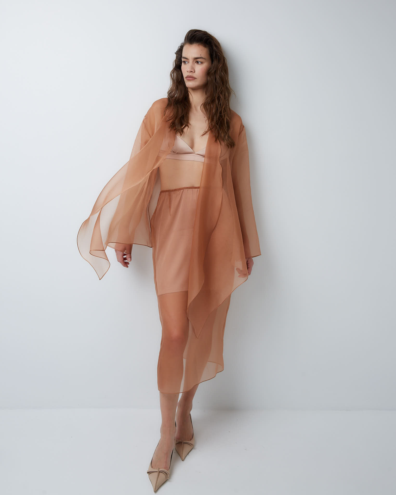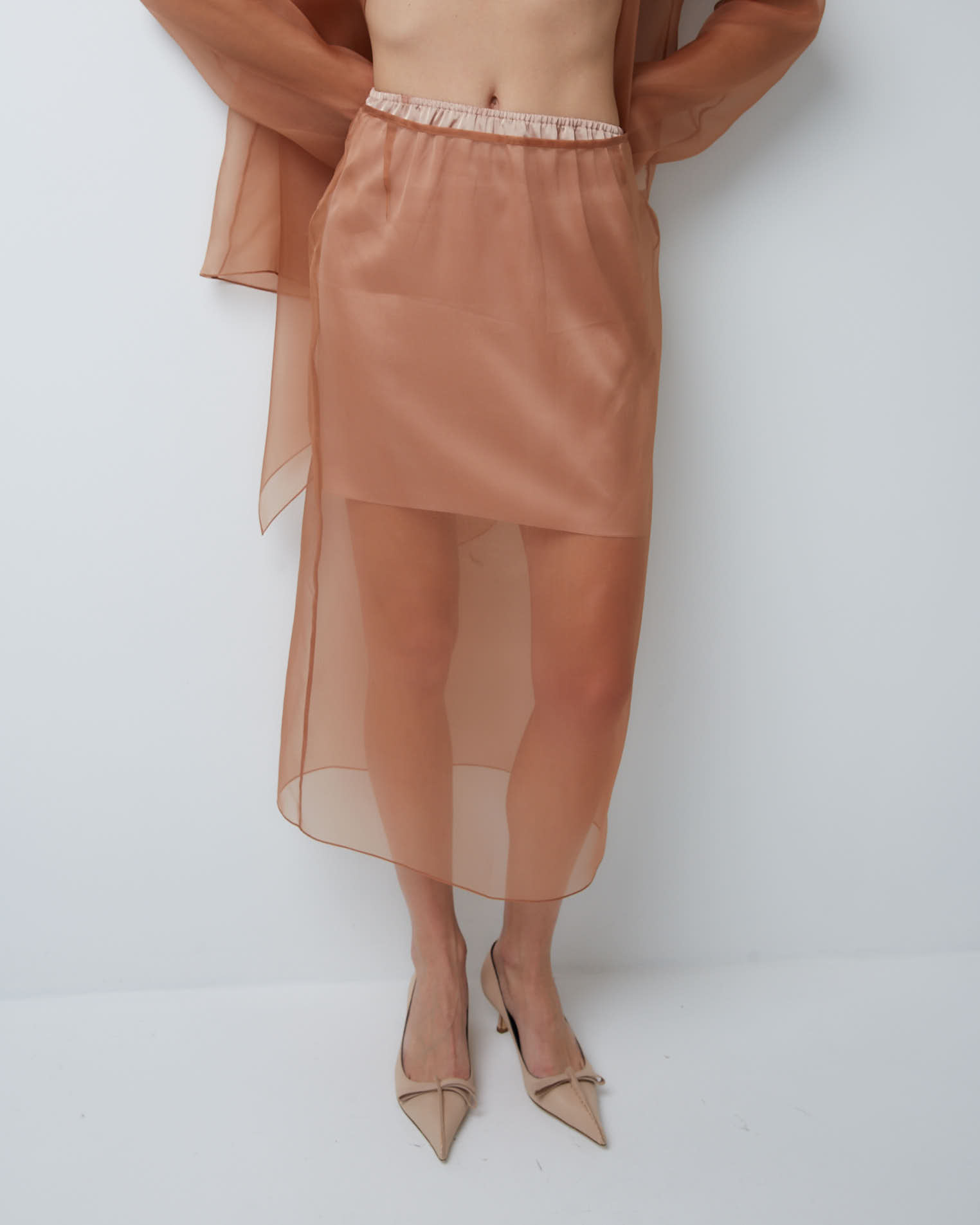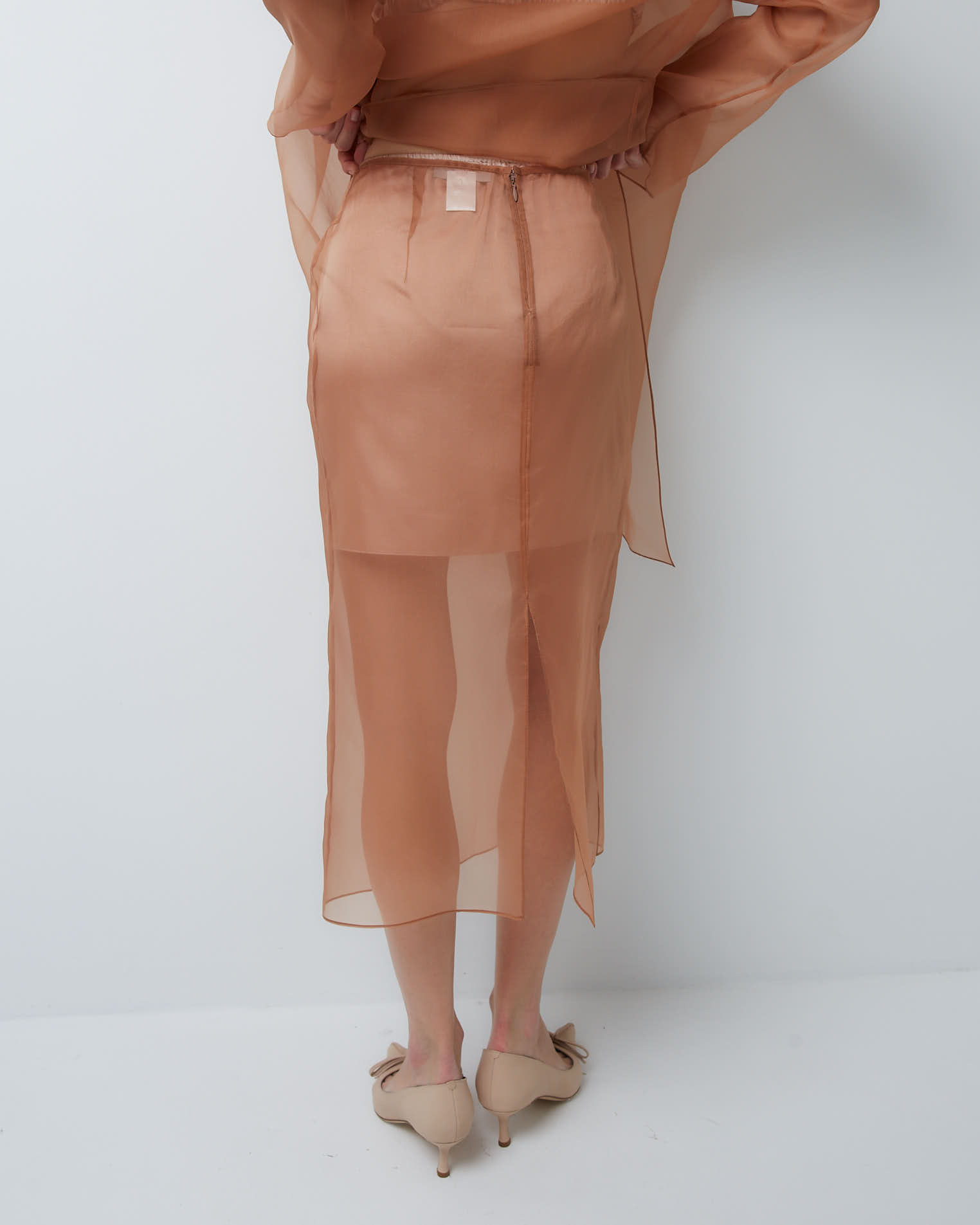 Модель прямого кроя из полупрозрачной органзы может стать оригинальным аналогом классической юбки, под низ рекомендуем надеть боди или комбинацию.