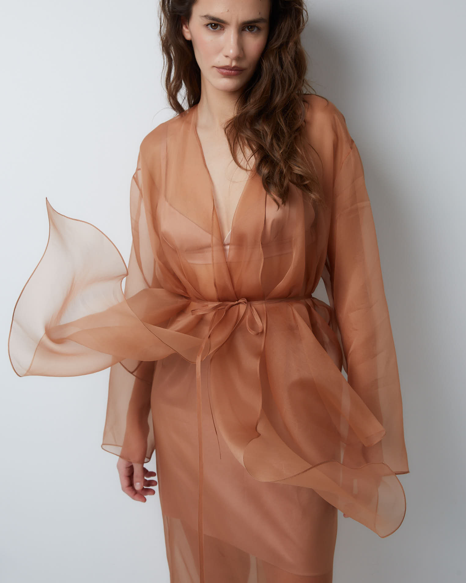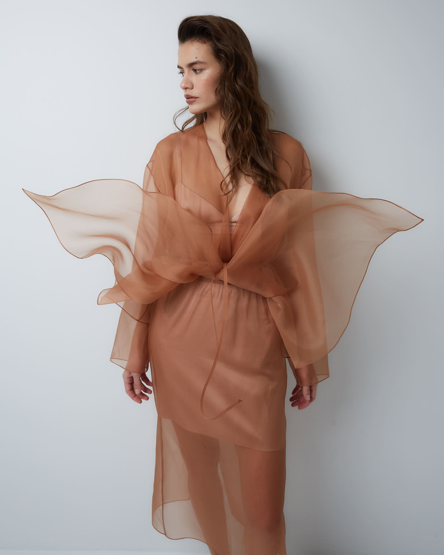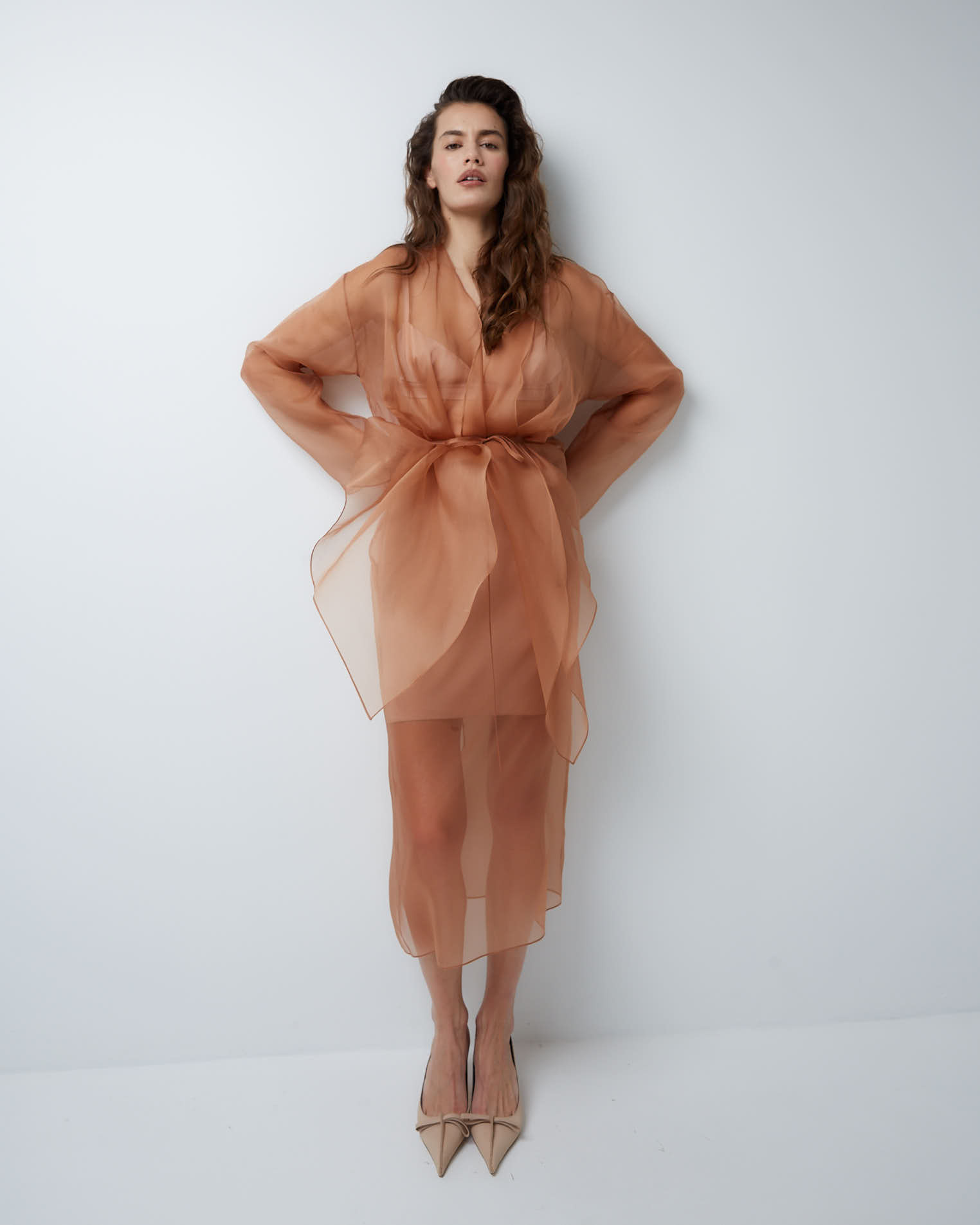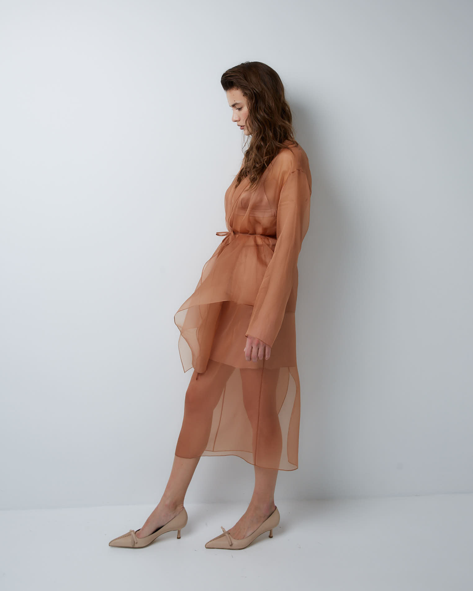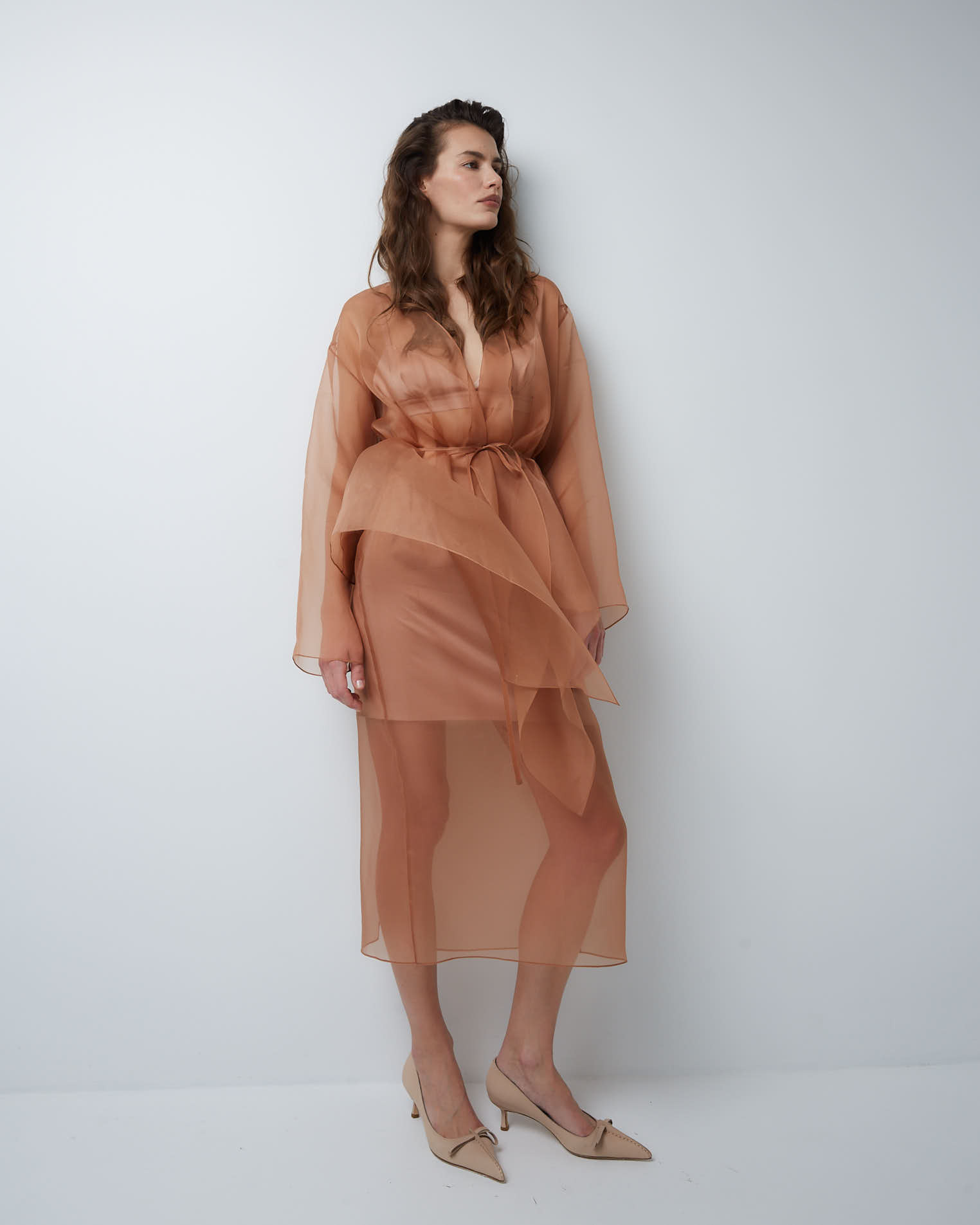 Модель прямого кроя из полупрозрачной органзы может стать оригинальным аналогом классической юбки, под низ рекомендуем надеть боди или комбинацию.