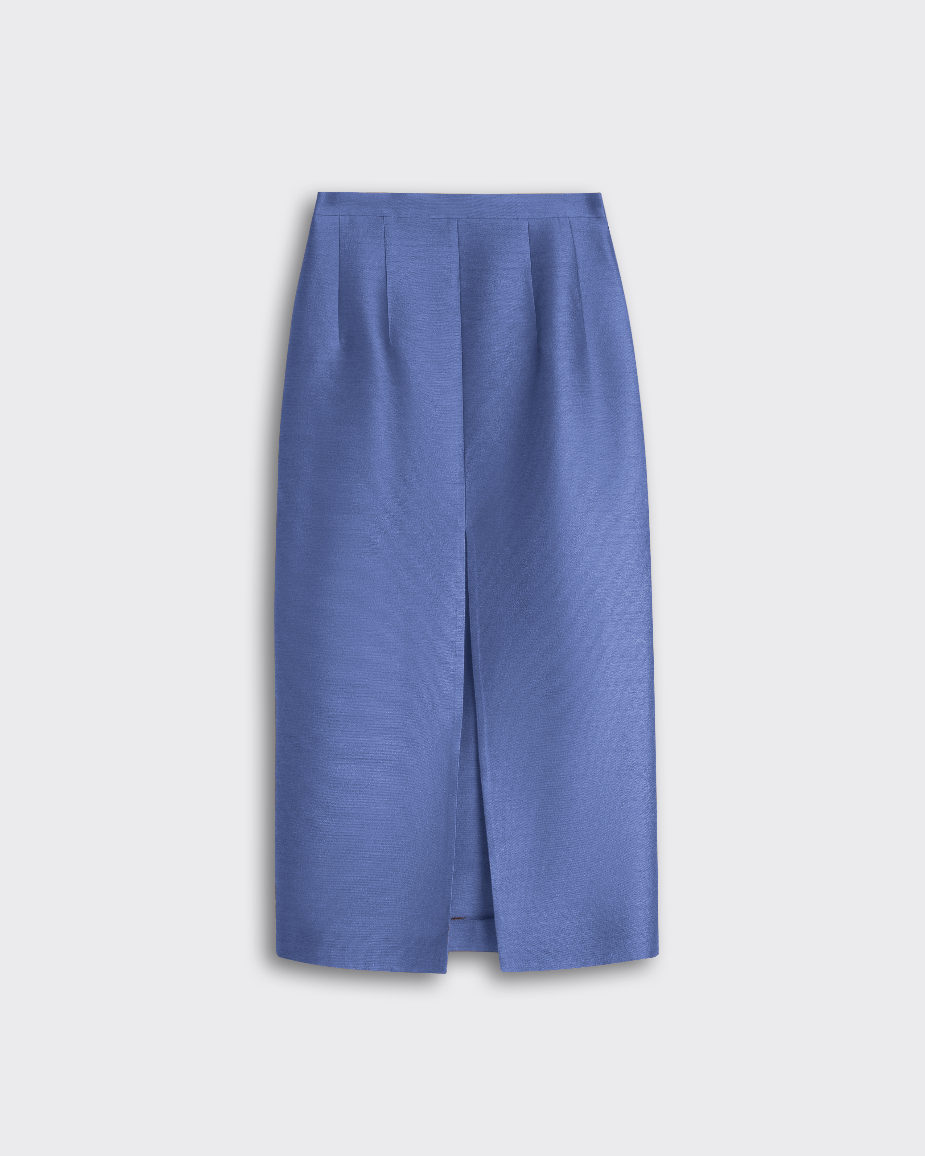 Модель длины миди, спереди расположен шов, заканчивающийся разрезом, застежка на молнию сбоку. Изделие выполнено на подкладе.