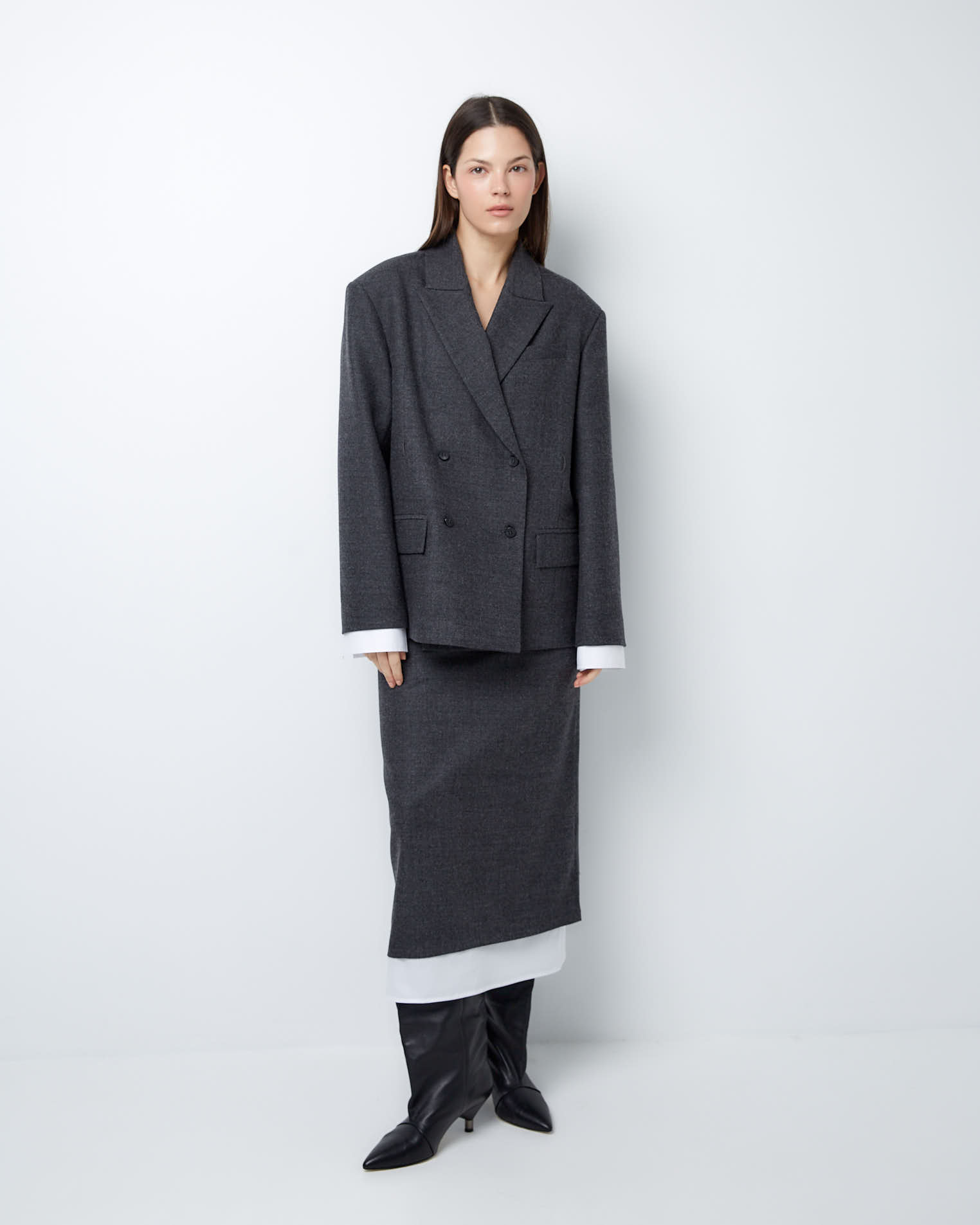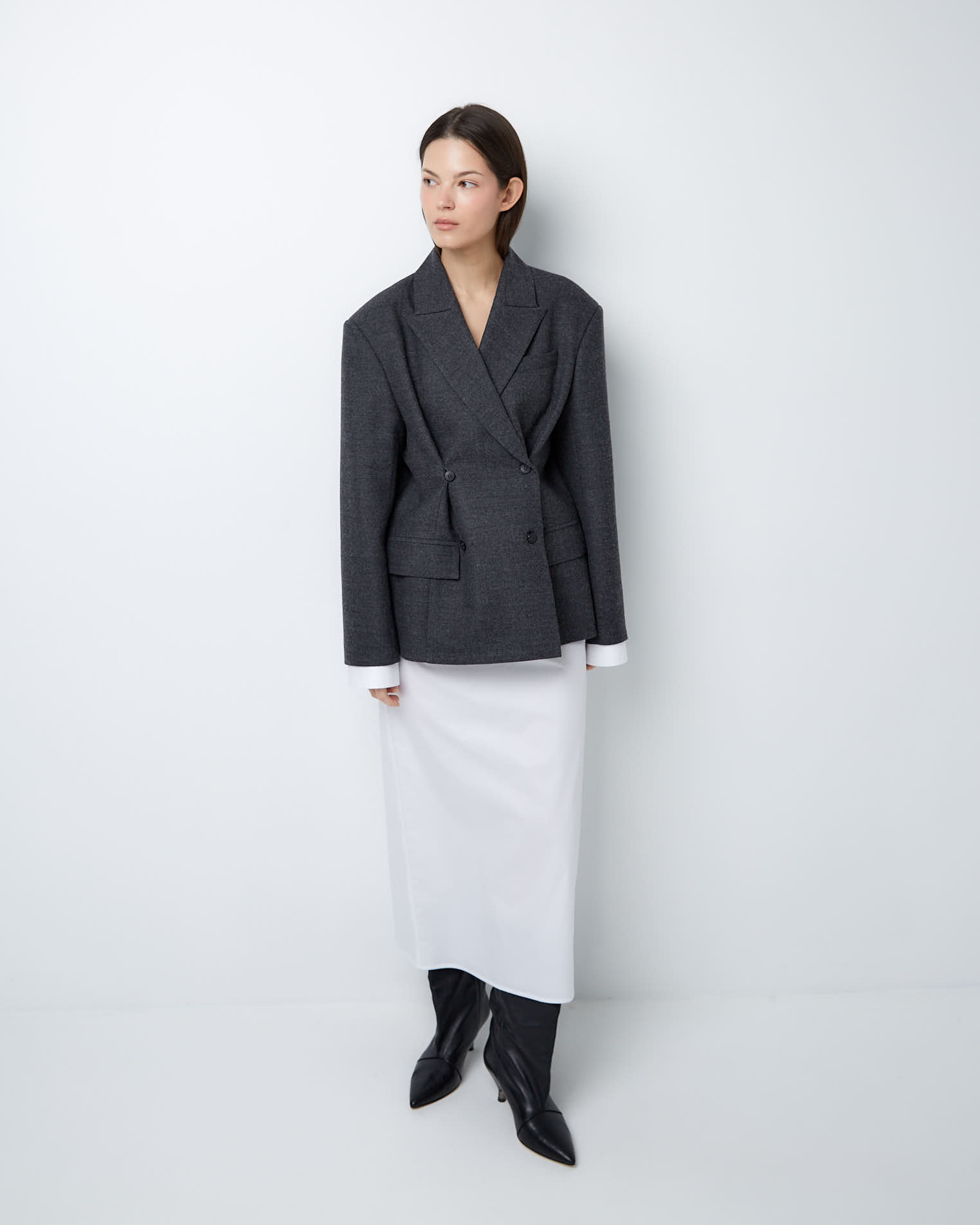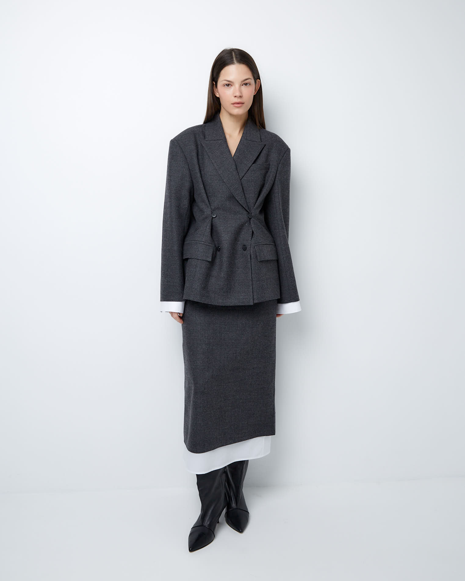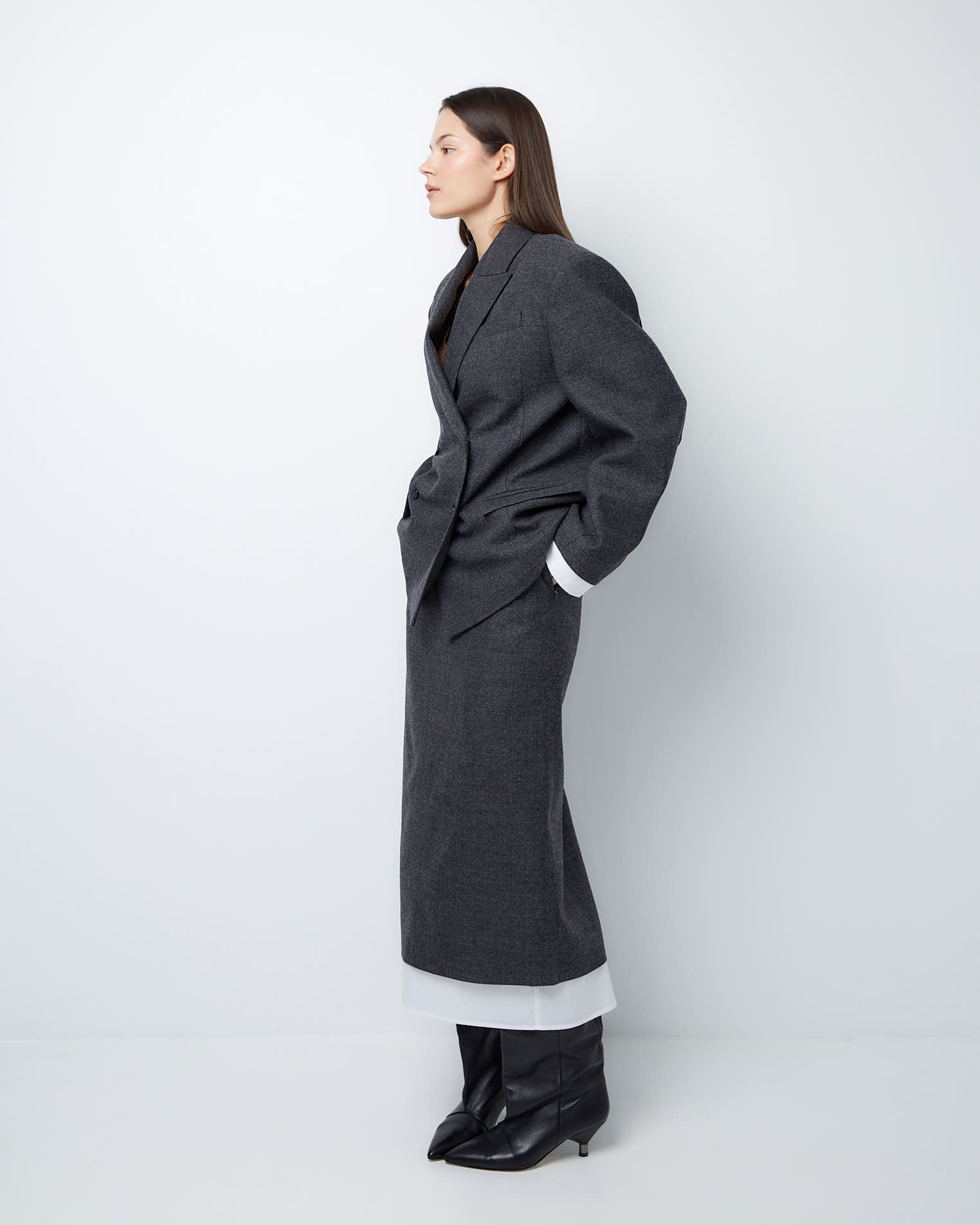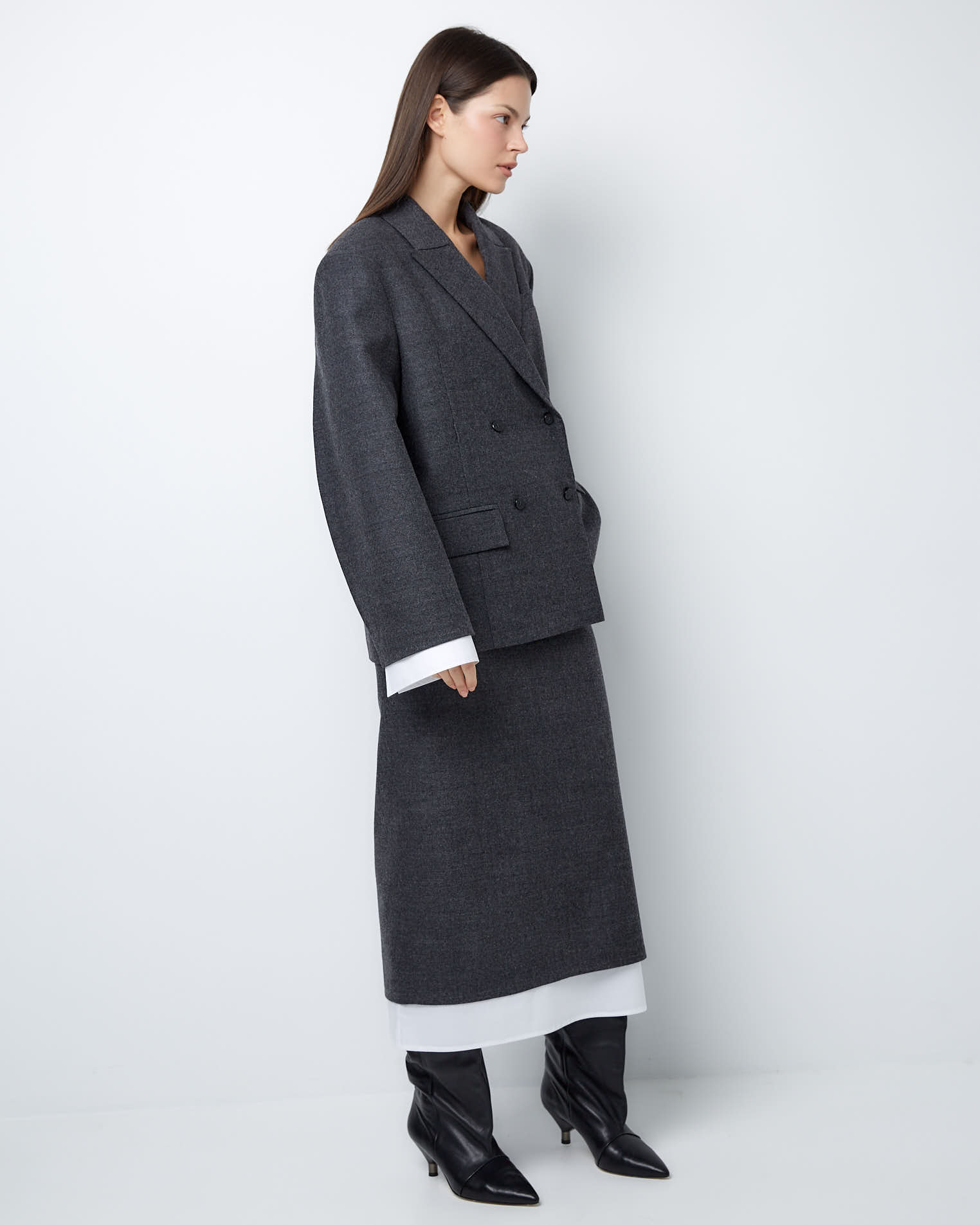 Для создания модели мы выбрали тонкую нежную шерсть, которая славится своей гигроскопичностью и практичностью. Этот материал хорошо держит заданную форму и поддерживает чувство комфорта весь день.
