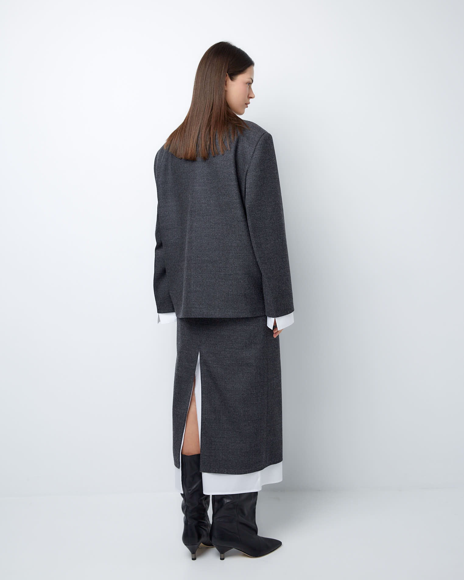 К жакету идеально подойдет серая юбка из аналогичного материала с хлопковой юбкой в комплекте.
