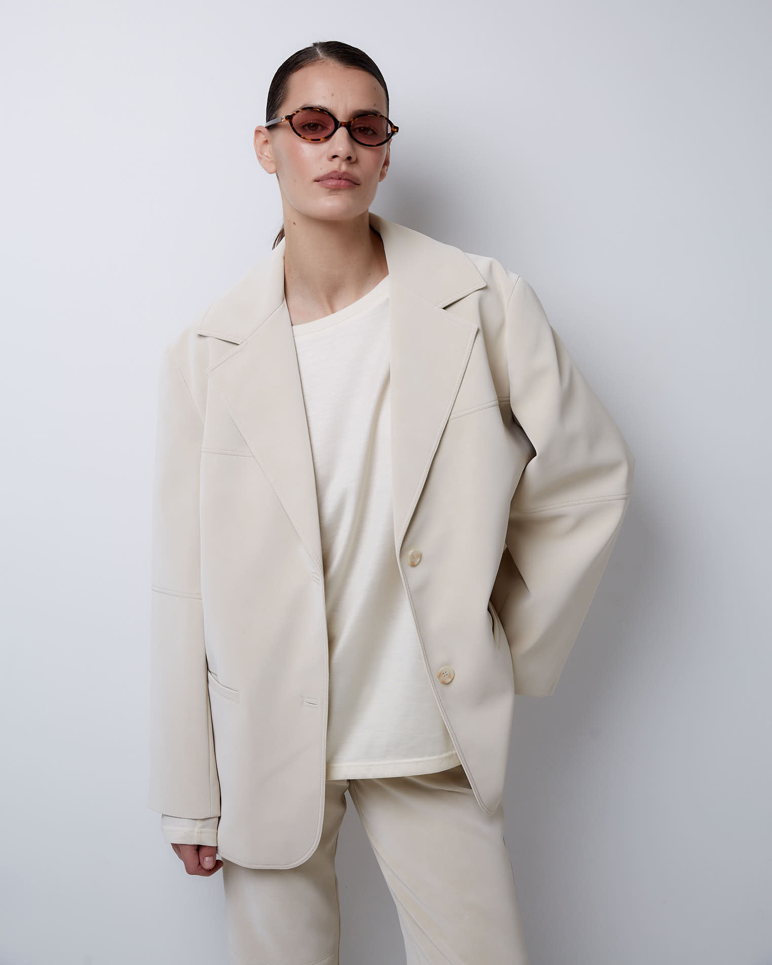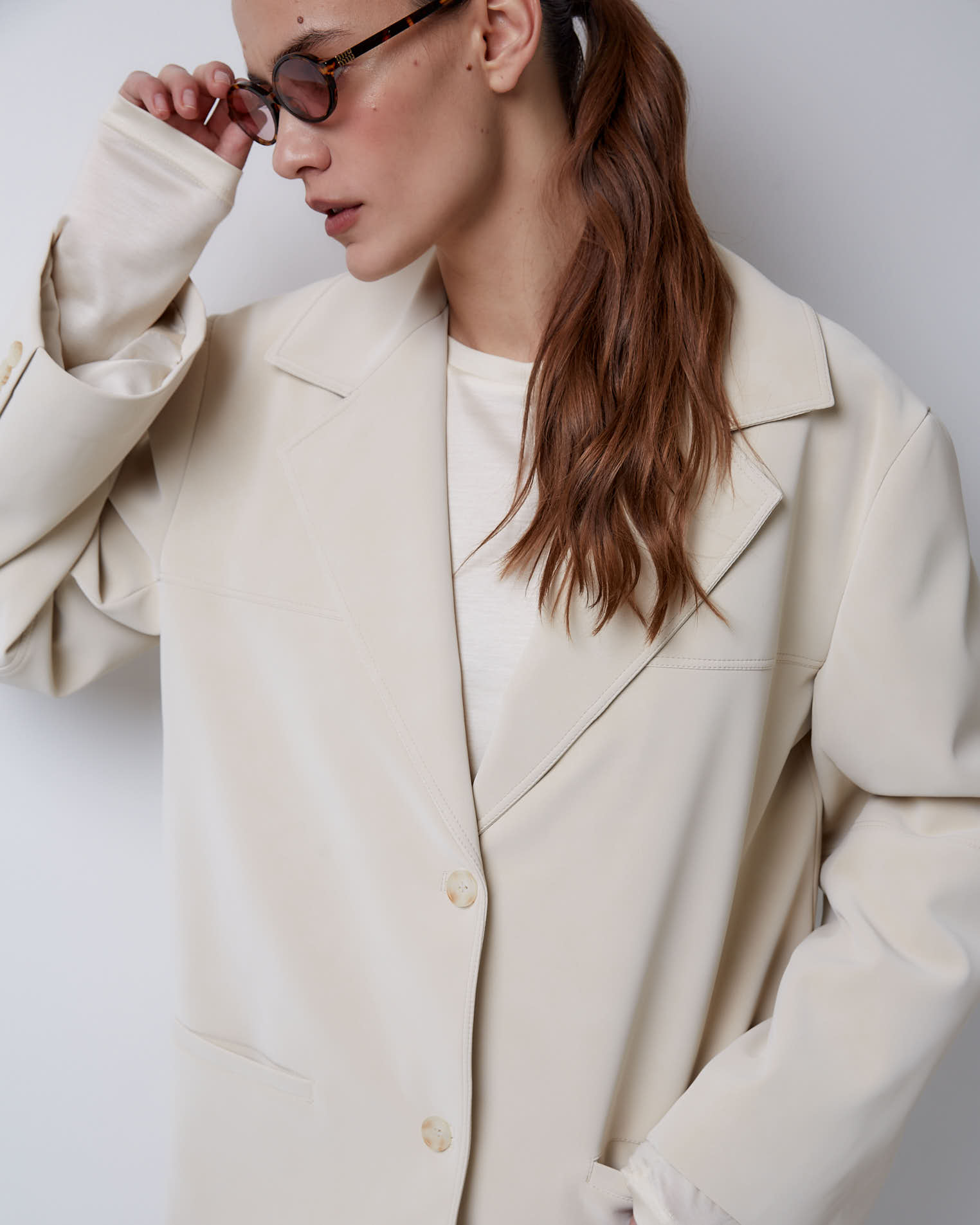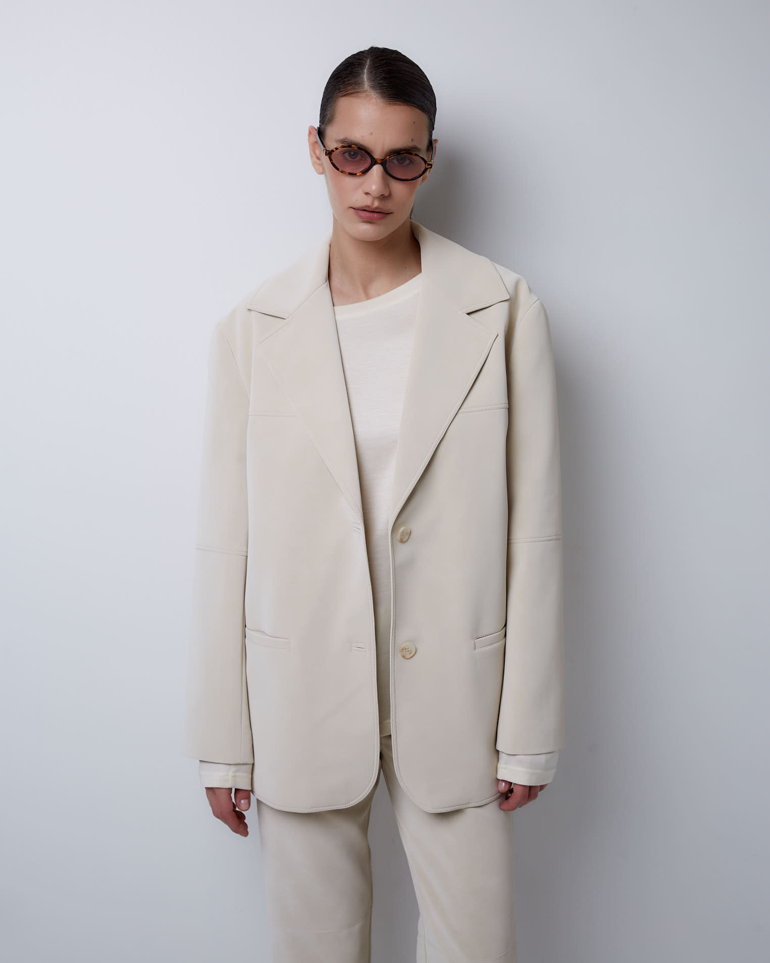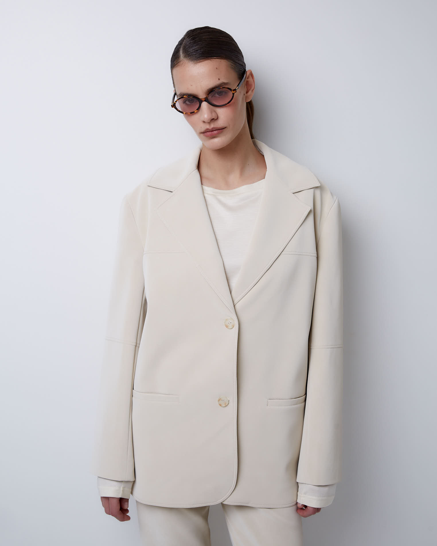 Жакет свободного кроя, втачной рукав, средний шов на спине, кокетка на полочке, однобортная застежка на две пуговицы, край полочки закруглен, английский воротник, узкие карманы, все швы отстрочены.