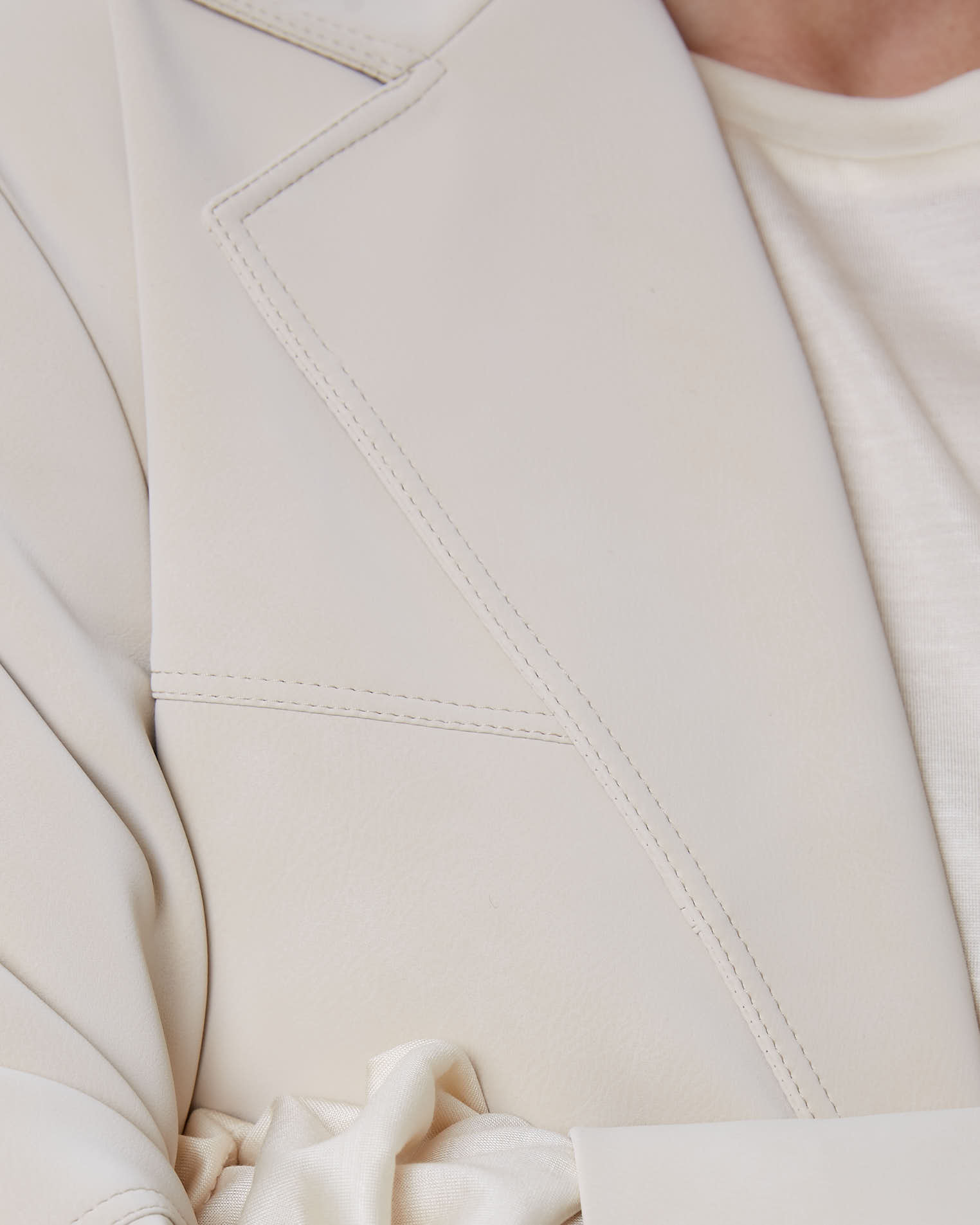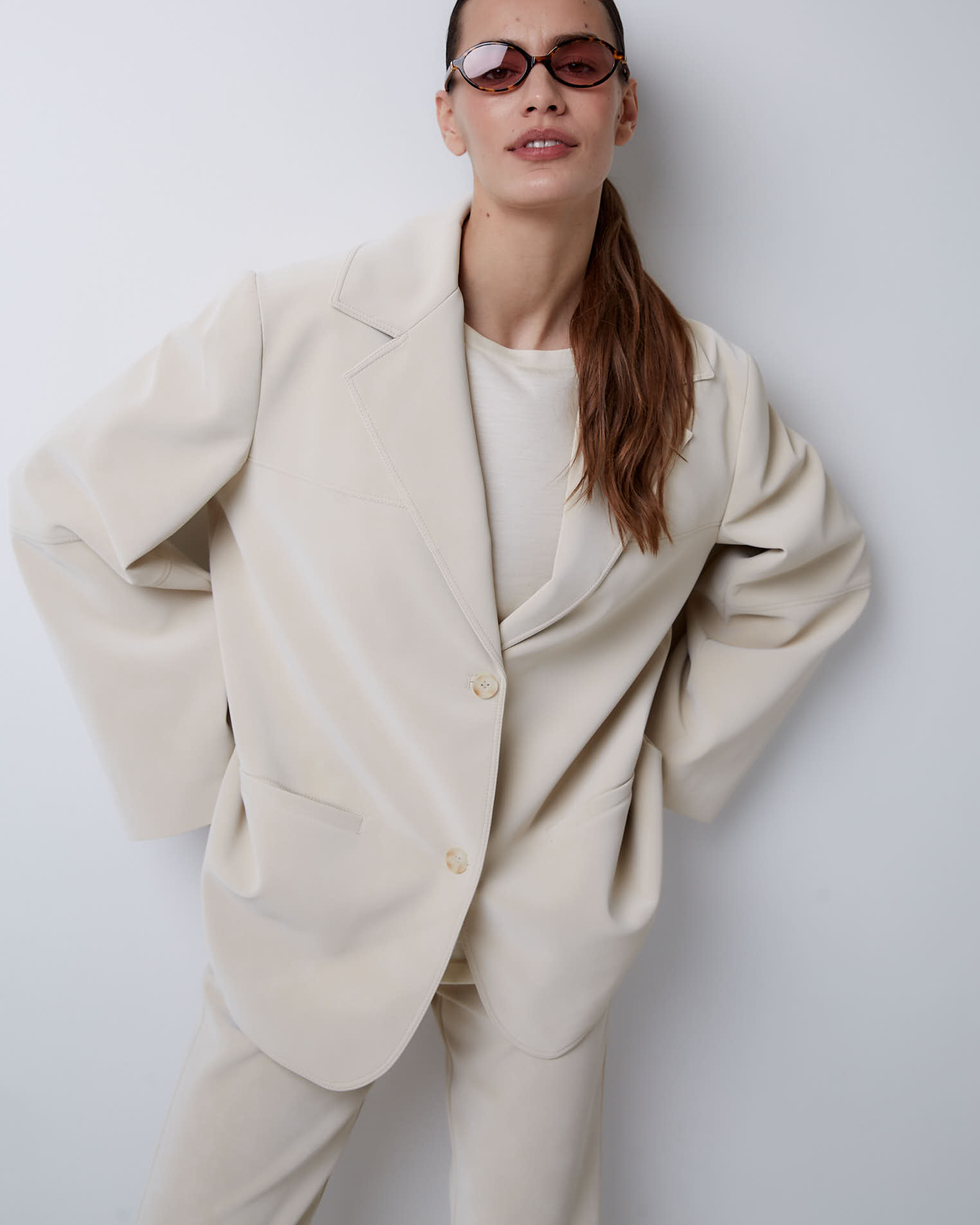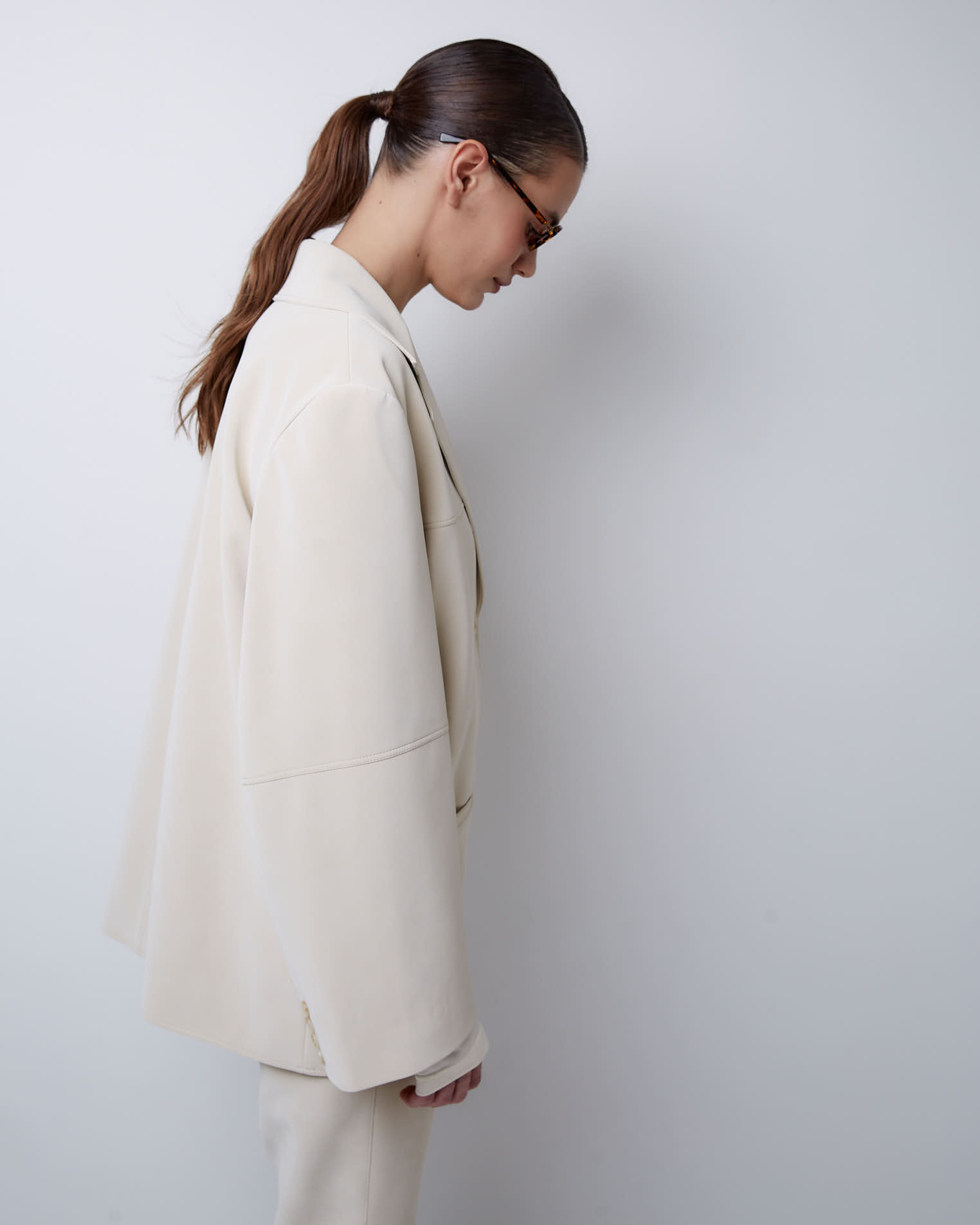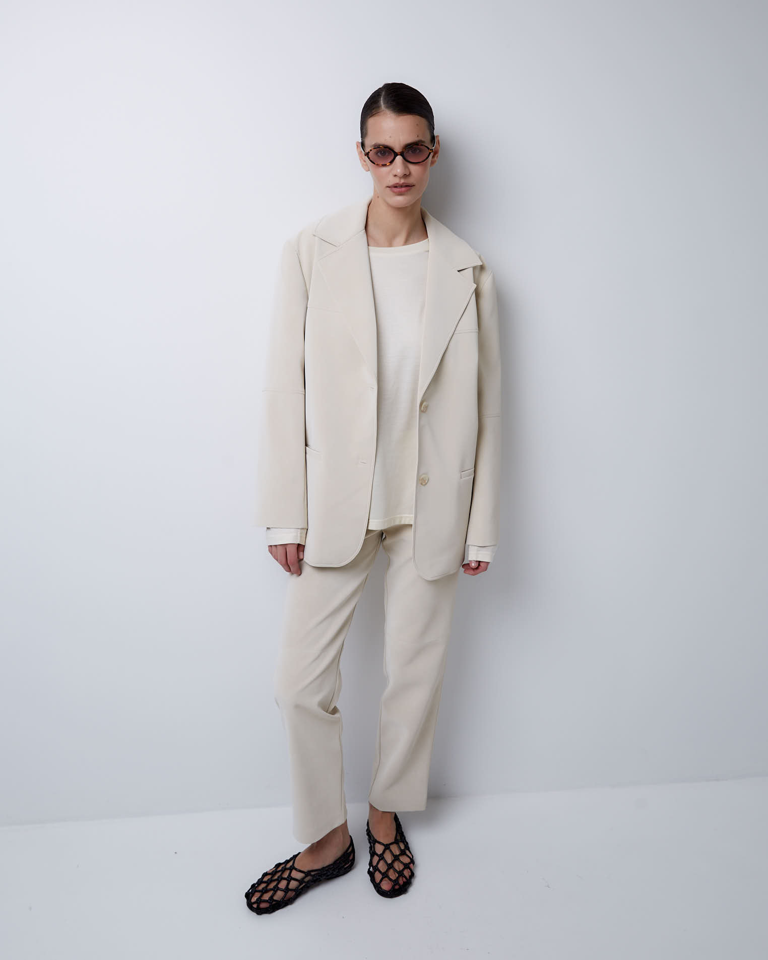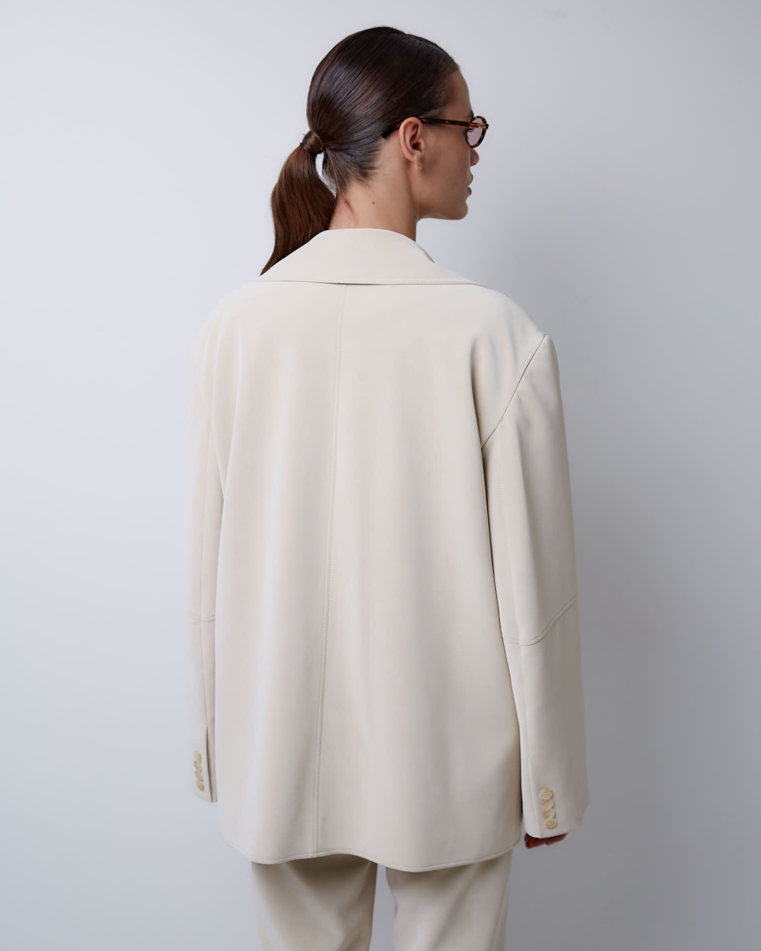 Жакет свободного кроя, втачной рукав, средний шов на спине, кокетка на полочке, однобортная застежка на две пуговицы, край полочки закруглен, английский воротник, узкие карманы, все швы отстрочены.