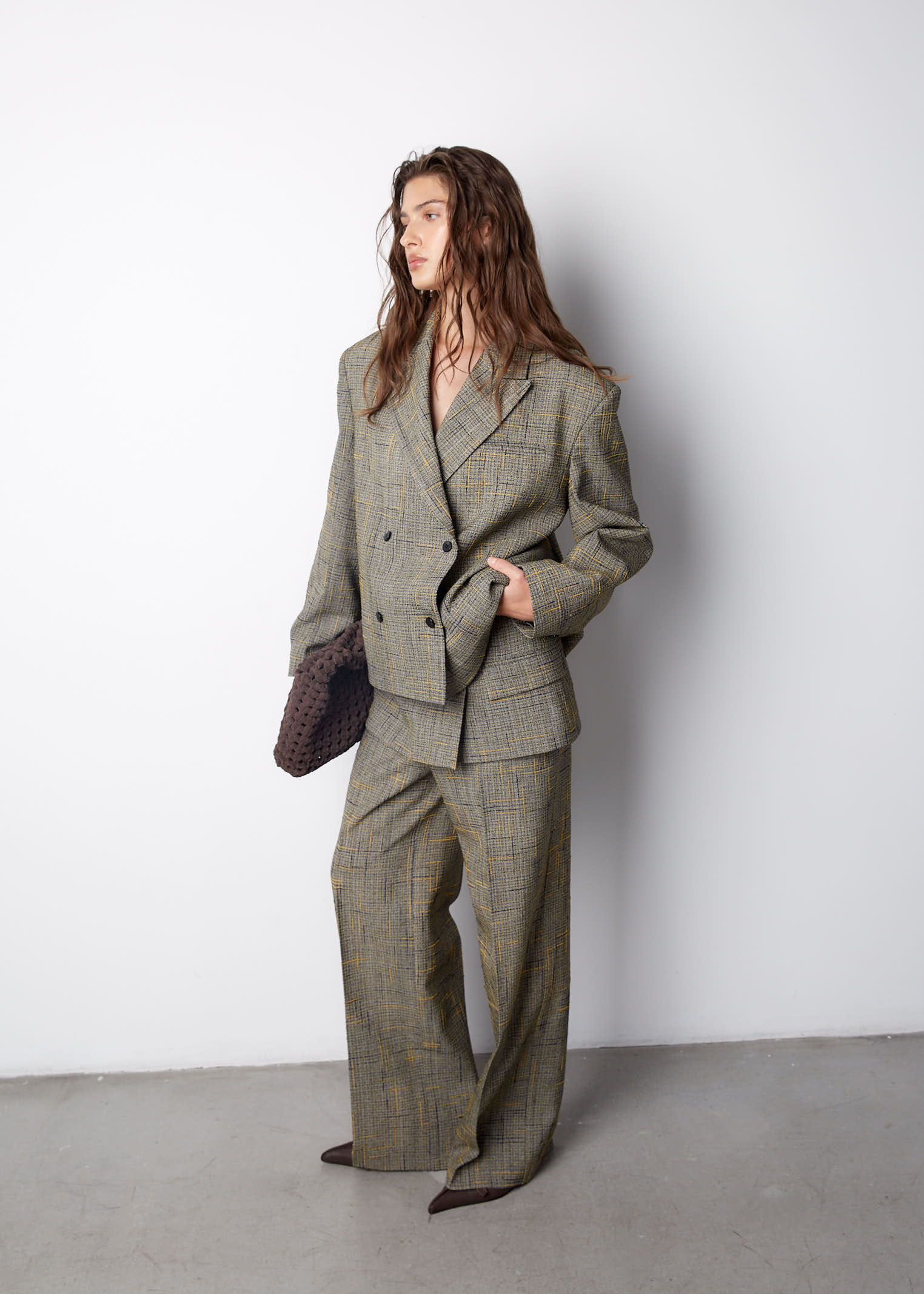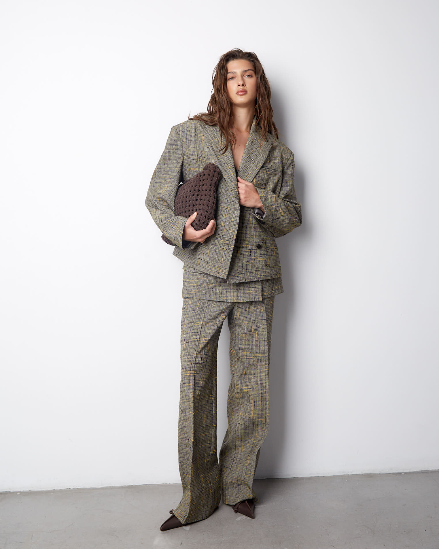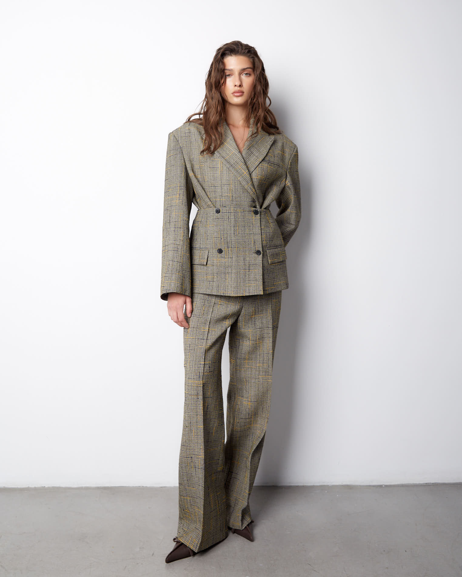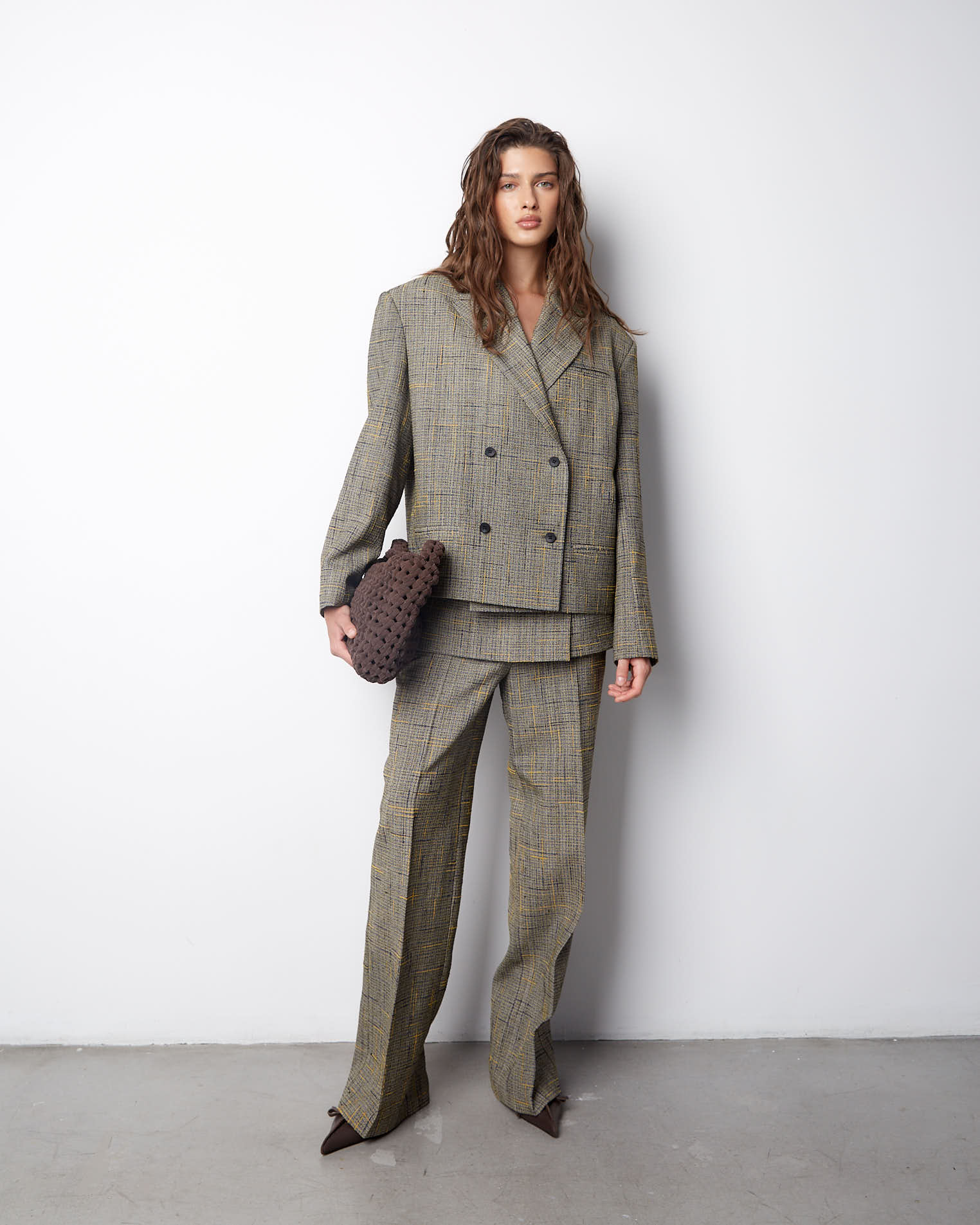 К жакету идеально подойдут брюки из аналогичного материала.